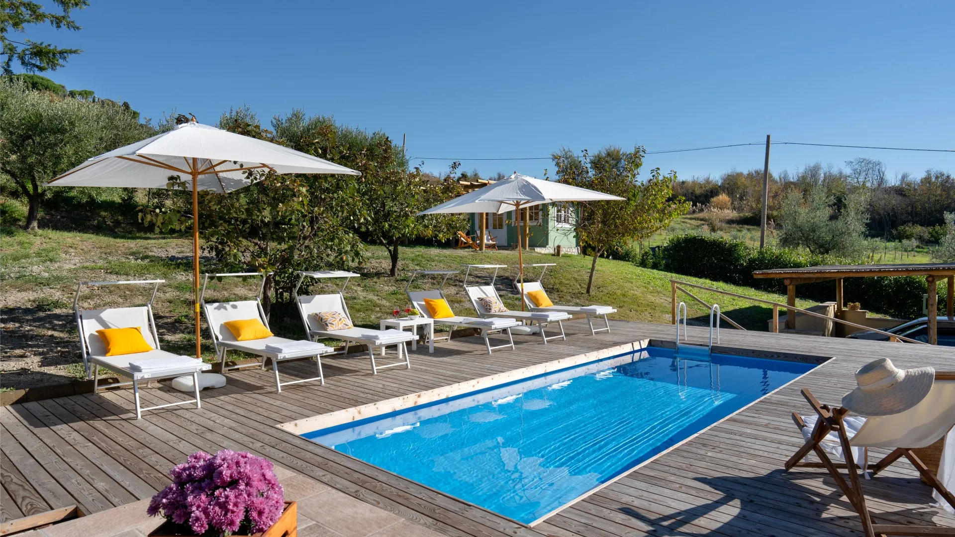 The pool, with a panoramic view of the Val di Cecina, is located about 10 metres from the villa, in a slightly elevated position and accessible via six steps carved into the ground. Rectangular and measuring 6 x 3 m with a constant depth of 1.20 m, it is lined in PVC and has a chlorine purification system and a metal ladder for access. Surrounding the pool is a natural wood solarium terrace of about 70 sq m, equipped with sunbeds, umbrellas and a cold-water shower. Open from the last Saturday in April to the first Saturday in October.
