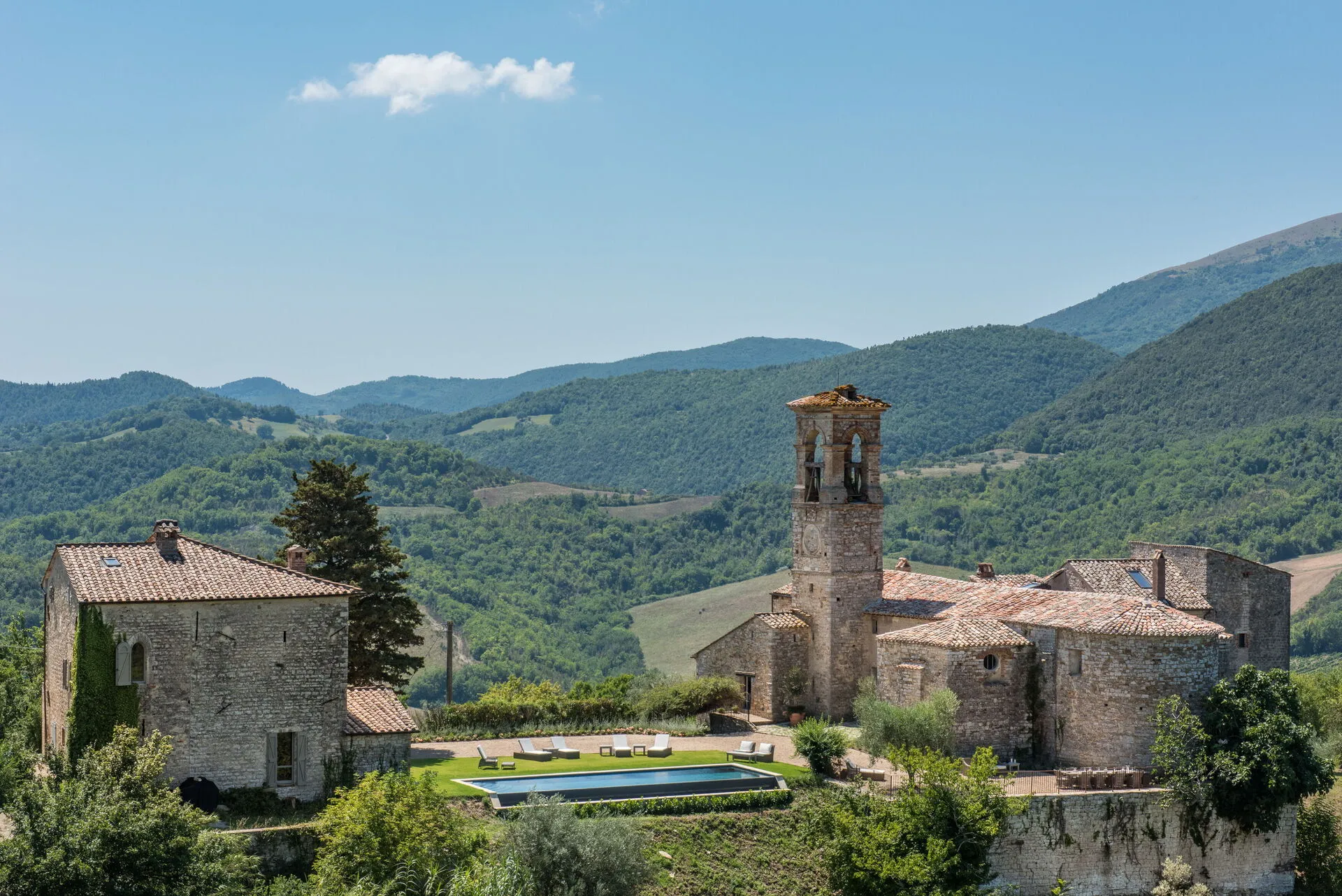 Positioned on top of a hill, this ancient castle with a church dating back to the 11th century offers a breathtaking panoramic view of the Tiber valley. A skilful renovation has transformed this place into a wonderful villa with a private infinity pool that blends harmoniously with its surroundings.