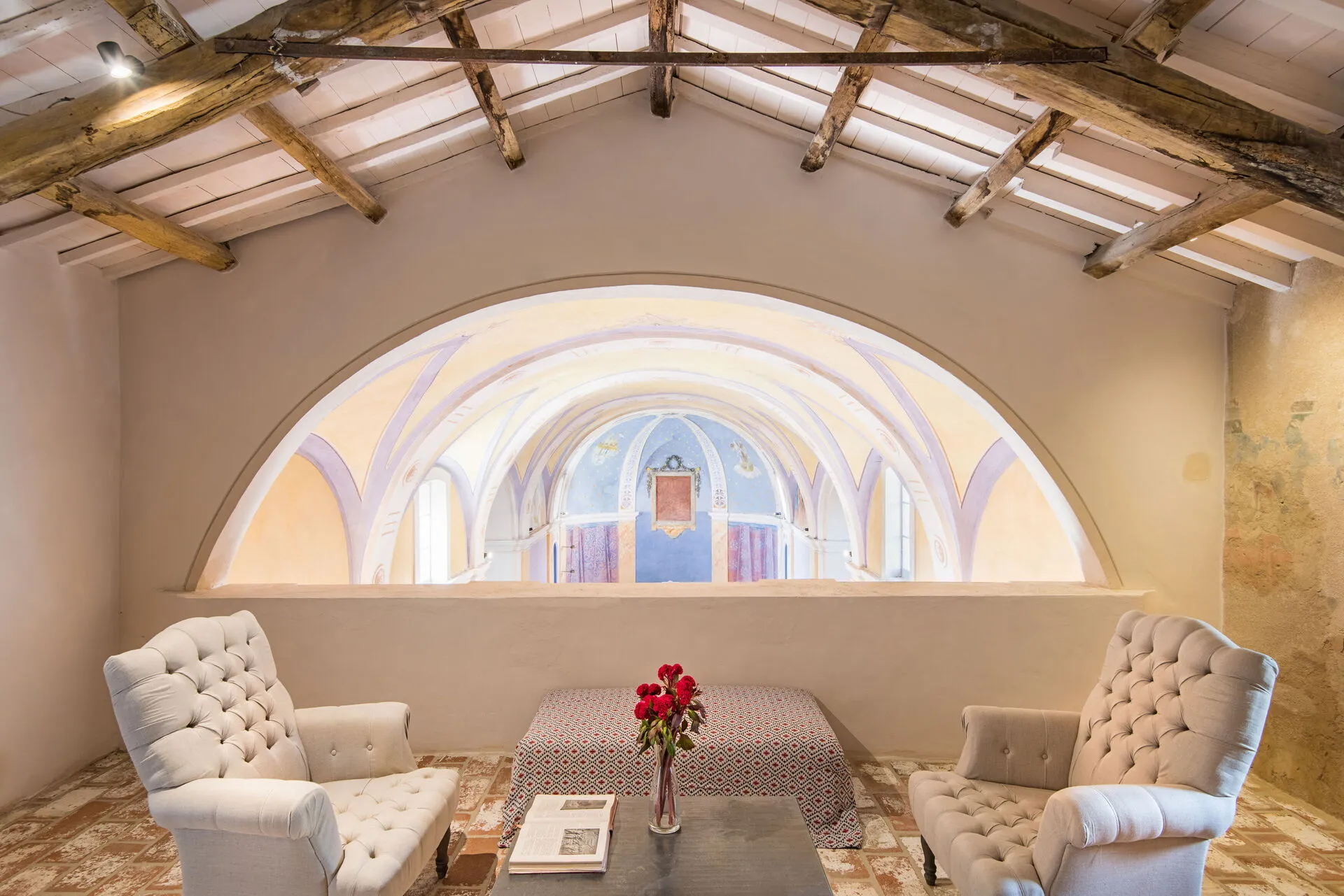 The panoramic terrace next to the annexe is also equipped with a set of outdoor sofas, the ideal place to enjoy some privacy and tranquillity. For those wishing to spend some time outdoors, the patio behind the church offers a set of outdoor sofas for relaxing and socialising.