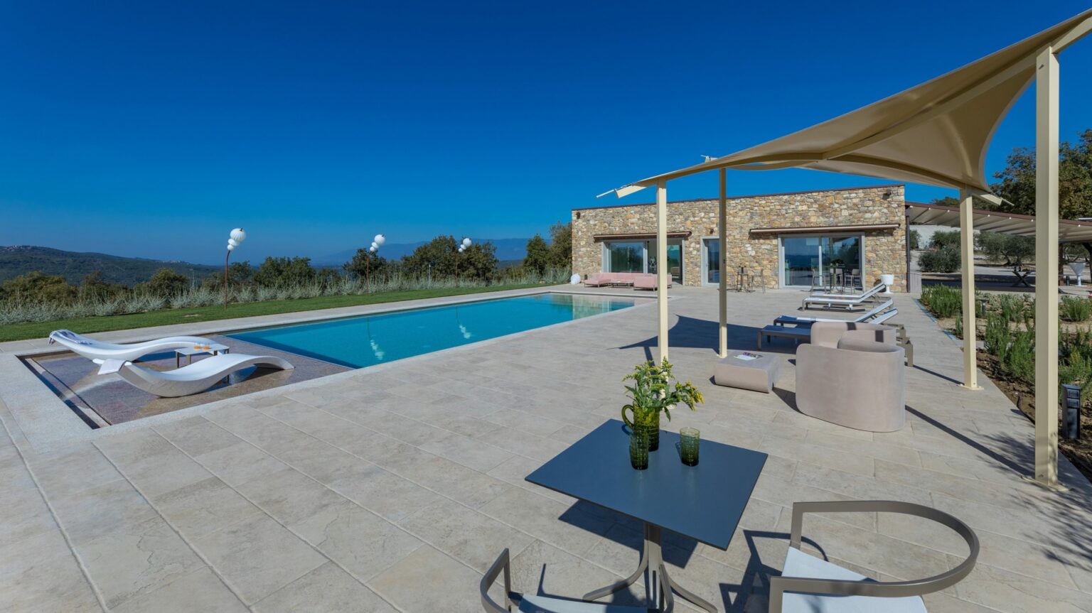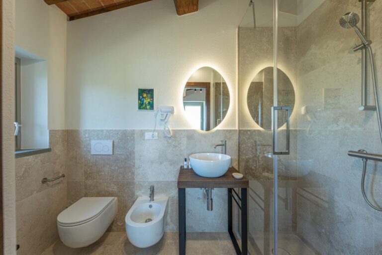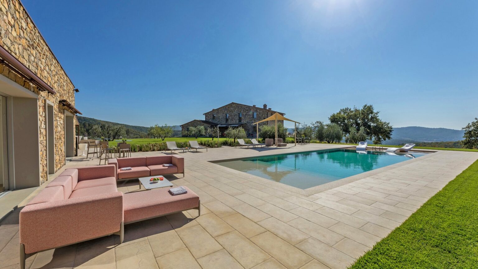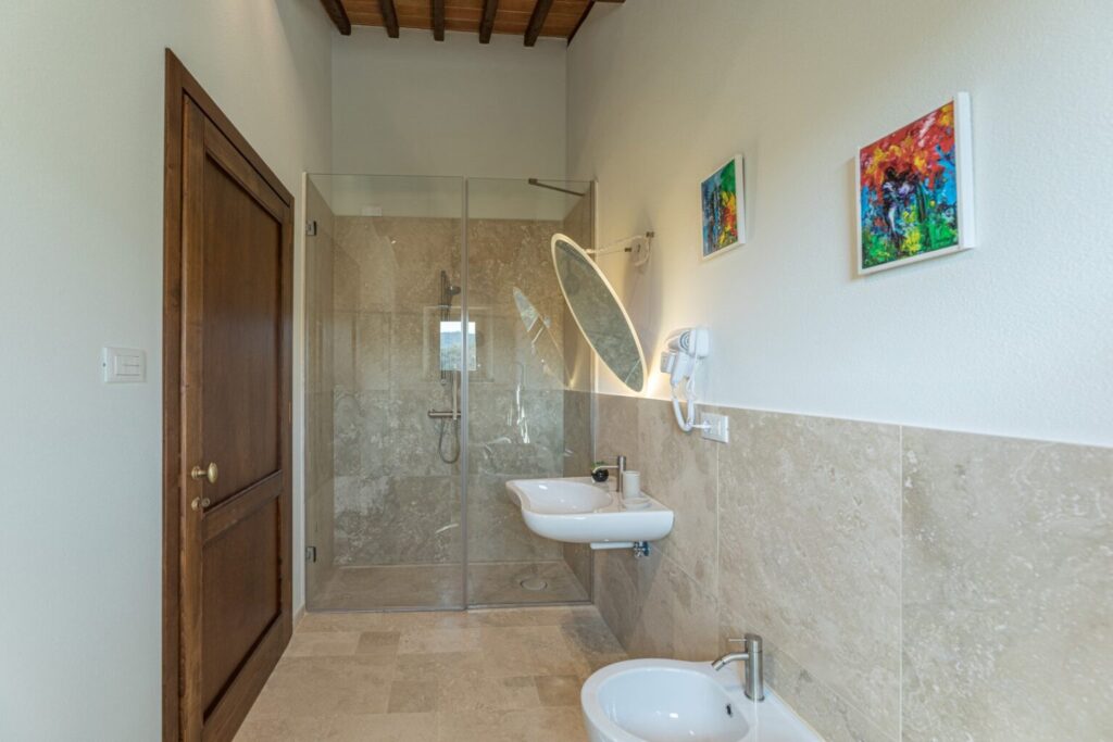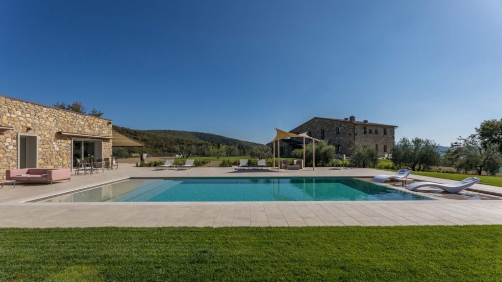 About 40 m from the property, along the garden paths, is the beautiful sunbathing area surrounding the pool: a natural scenic terrace, surrounded by the olive trees of the property , which stretches as far as the eye can see to the green Tuscan hills. In the centre is the wonderful swimming pool lined in PVC with a tile-covered edge and a border entirely covered with slabs of travertine. The pool, measuring 7 x 12 m with a depth varying from 0.50 to 1.40 m, is salt-purified and has submerged steps for access to the water. The pool can be heated thanks to solar panels or with a heat pump and equipped with a thermal covering shutter. Always exposed to the sun during the day, it is illuminated by internal spotlights at night and is fitted with a hot and cold-water shower. The cosy, modern seating in the lounge area is protected by a shade sail, rendering the area elegant and modern. The pool house is equipped with automatically opening awnings that provide shade and cool for relaxing in the open air. Furthermore, the annex includes a fitness and yoga room with a panoramic view of the pool that will remain always available.