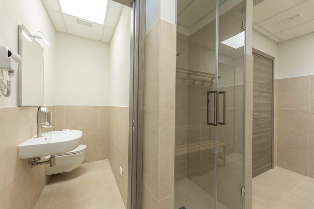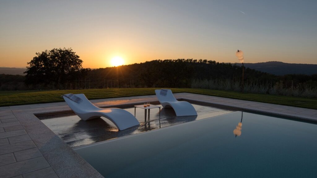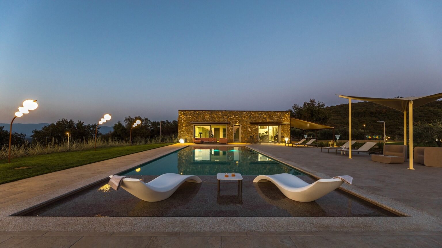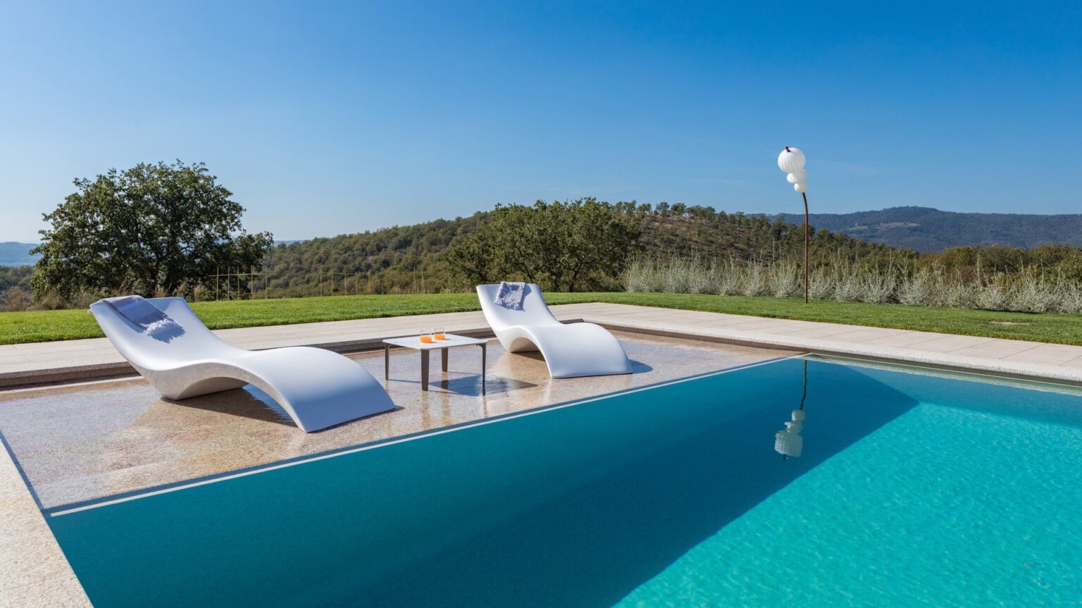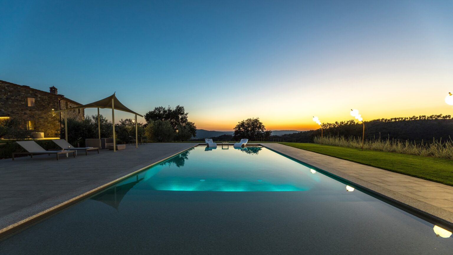 About 40 m from the property, along the garden paths, is the beautiful sunbathing area surrounding the pool: a natural scenic terrace, surrounded by the olive trees of the property , which stretches as far as the eye can see to the green Tuscan hills. In the centre is the wonderful swimming pool lined in PVC with a tile-covered edge and a border entirely covered with slabs of travertine. The pool, measuring 7 x 12 m with a depth varying from 0.50 to 1.40 m, is salt-purified and has submerged steps for access to the water. The pool can be heated thanks to solar panels or with a heat pump and equipped with a thermal covering shutter. Always exposed to the sun during the day, it is illuminated by internal spotlights at night and is fitted with a hot and cold-water shower. The cosy, modern seating in the lounge area is protected by a shade sail, rendering the area elegant and modern. The pool house is equipped with automatically opening awnings that provide shade and cool for relaxing in the open air. Furthermore, the annex includes a fitness and yoga room with a panoramic view of the pool that will remain always available.