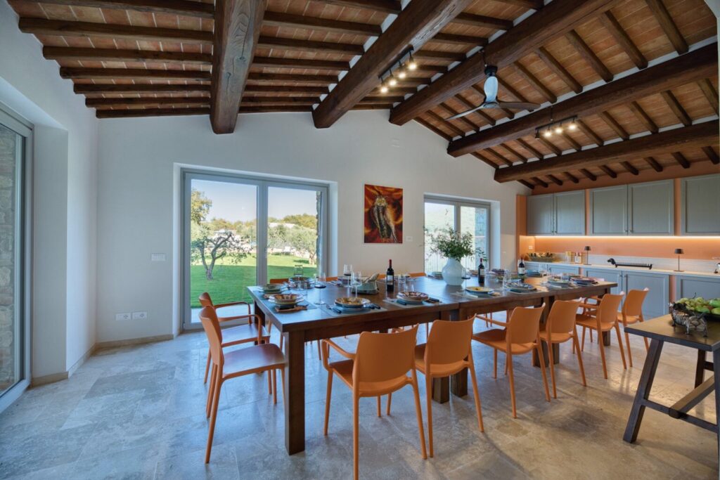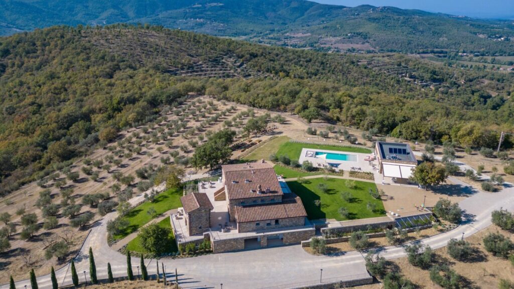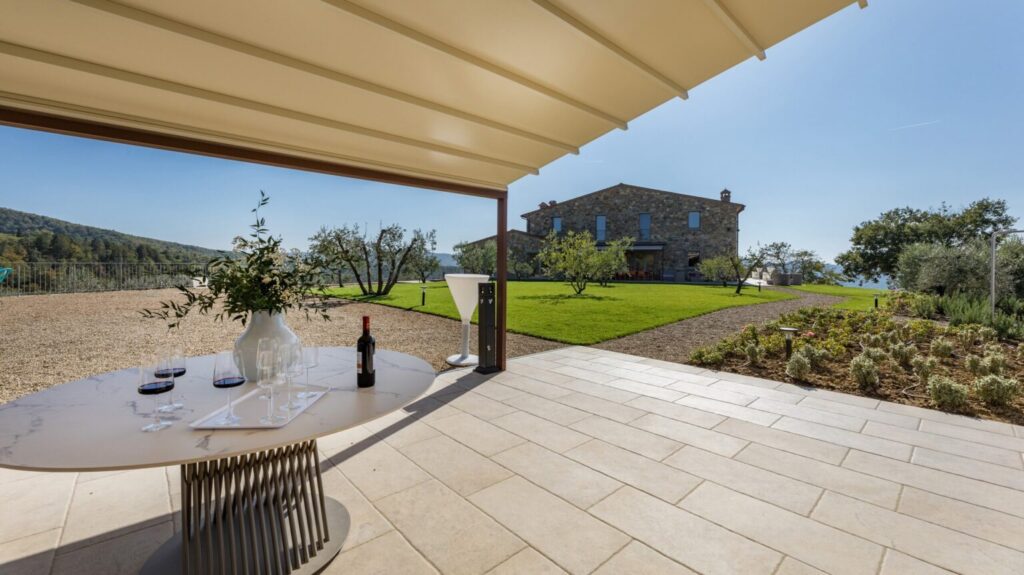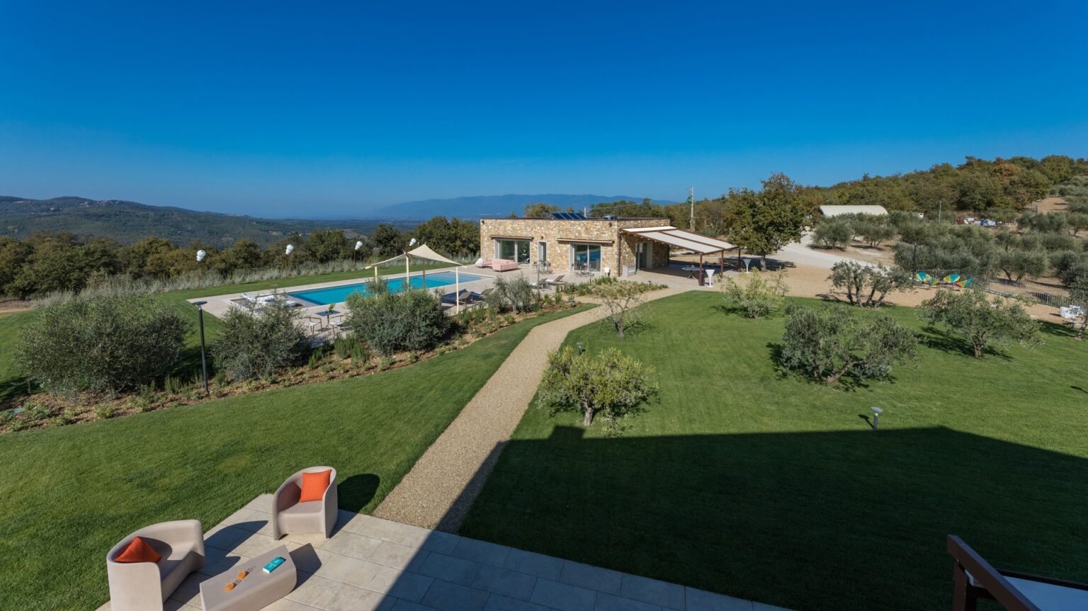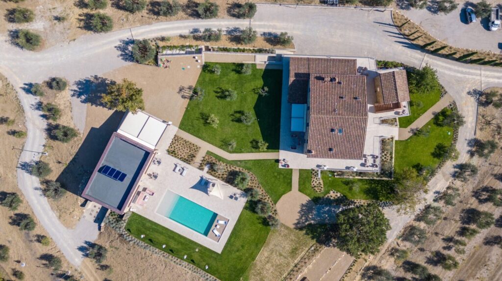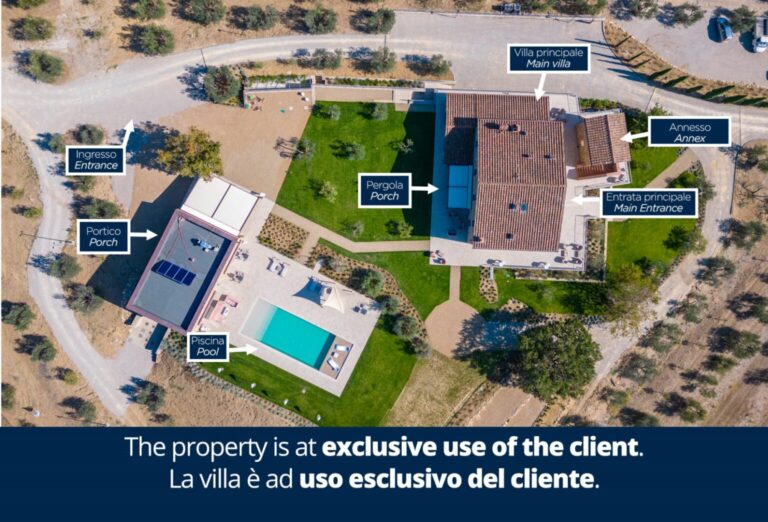 Eight hectares of fenced land delimit the spaces of this young farm estate, where expanses of olive trees for the production of extra virgin olive oil alternate. All around the farmhouse is a splendid lawned park, with bushes of aromatic plants and roses as well as a vegetable garden whose products can be consumed by guests. Multiple paths allow you to appreciate every corner of the property while the outdoor areas offer guests wonderful moments for relaxation and fun, with the complicity of fascinating panoramic views that can be seen from every side of the park. The two pergolas, in a panoramic position, allow you to enjoy the furnished shaded areas. The first pergola is adjacent to the house and is perfect for convivial breakfasts and lunches. The pergola adjacent to the pool annex is suitable for enjoying aperitifs by the pool. The automatic access gate is located at the end of the private dirt road of approximately 3 km within the property. The large parking area is located on the internal drive, a few steps from the main entrance reachable up a flight of steps or from a gravel path. A charging column for electric cars is available in the parking area. A garage 100 m away is available only to the caretaker for the maintenance of the areas surrounding the villa.Please notice that photos are taken in spring, therefore flower blossoming, and the colours of the gardens’ grass could be different at the moment of your arrival at the villa.
