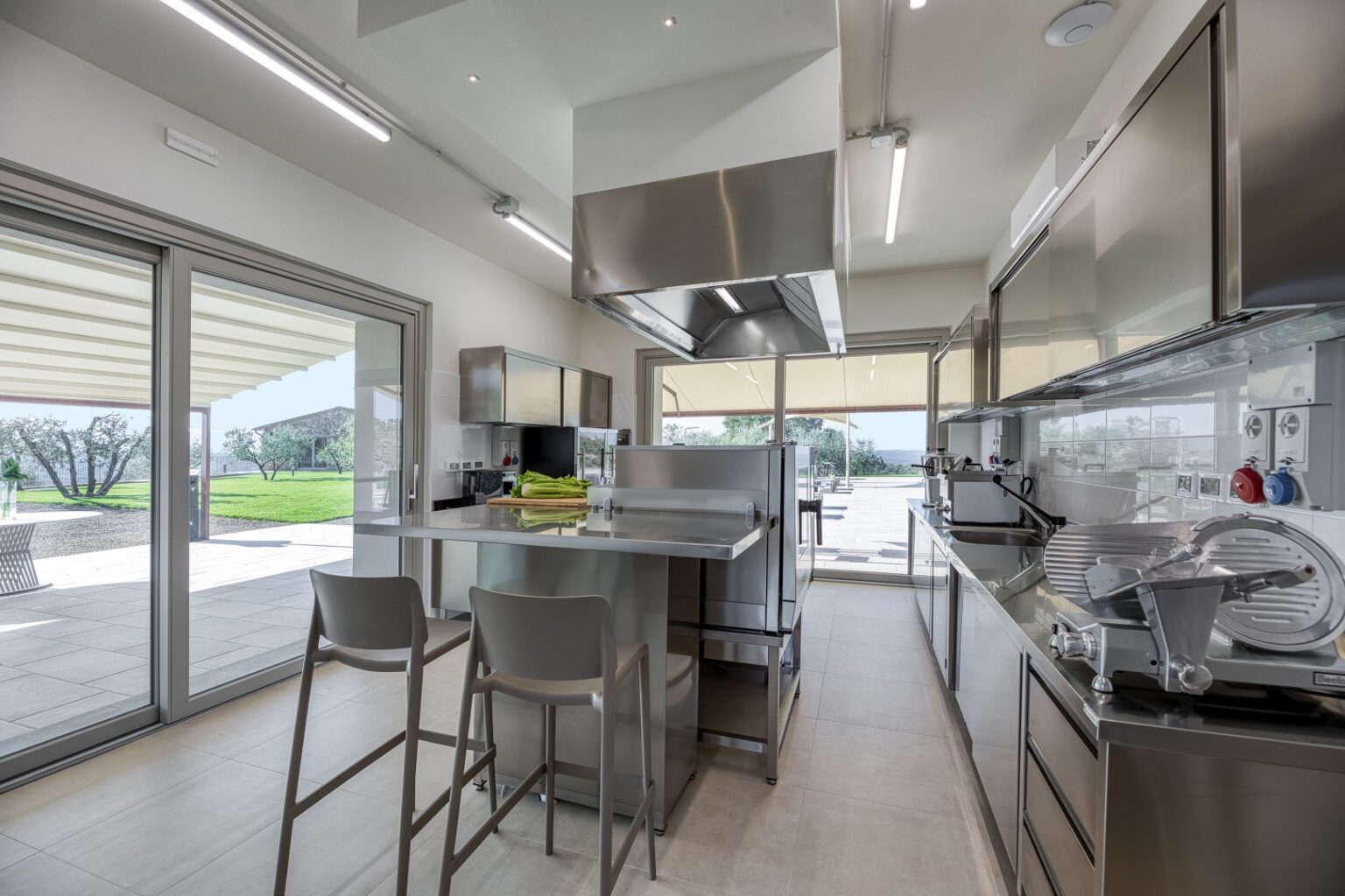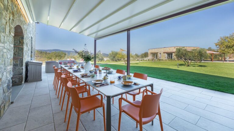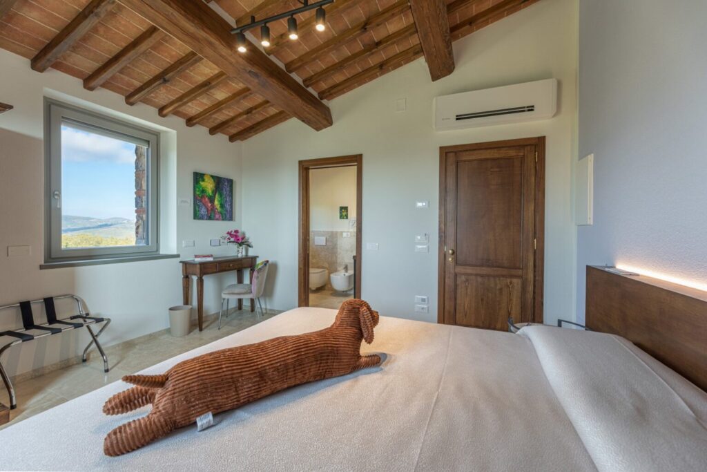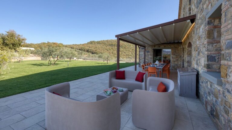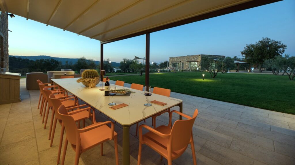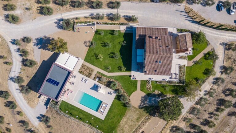 Eight hectares of fenced land delimit the spaces of this young farm estate, where expanses of olive trees for the production of extra virgin olive oil alternate. All around the farmhouse is a splendid lawned park, with bushes of aromatic plants and roses as well as a vegetable garden whose products can be consumed by guests. Multiple paths allow you to appreciate every corner of the property while the outdoor areas offer guests wonderful moments for relaxation and fun, with the complicity of fascinating panoramic views that can be seen from every side of the park. The two pergolas, in a panoramic position, allow you to enjoy the furnished shaded areas. The first pergola is adjacent to the house and is perfect for convivial breakfasts and lunches. The pergola adjacent to the pool annex is suitable for enjoying aperitifs by the pool. The automatic access gate is located at the end of the private dirt road of approximately 3 km within the property. The large parking area is located on the internal drive, a few steps from the main entrance reachable up a flight of steps or from a gravel path. A charging column for electric cars is available in the parking area. A garage 100 m away is available only to the caretaker for the maintenance of the areas surrounding the villa.Please notice that photos are taken in spring, therefore flower blossoming, and the colours of the gardens’ grass could be different at the moment of your arrival at the villa.