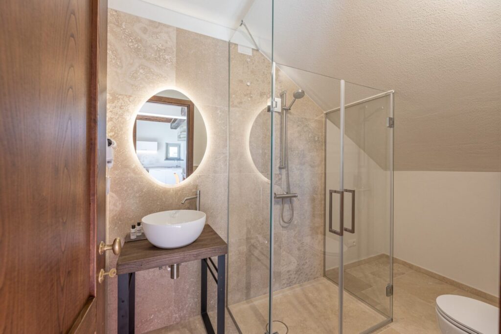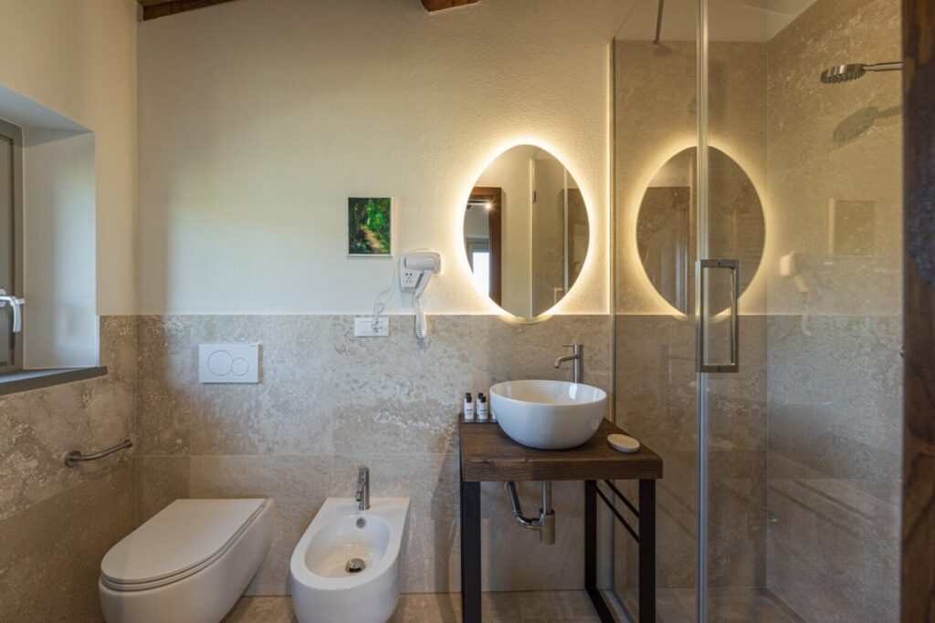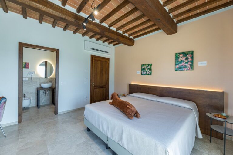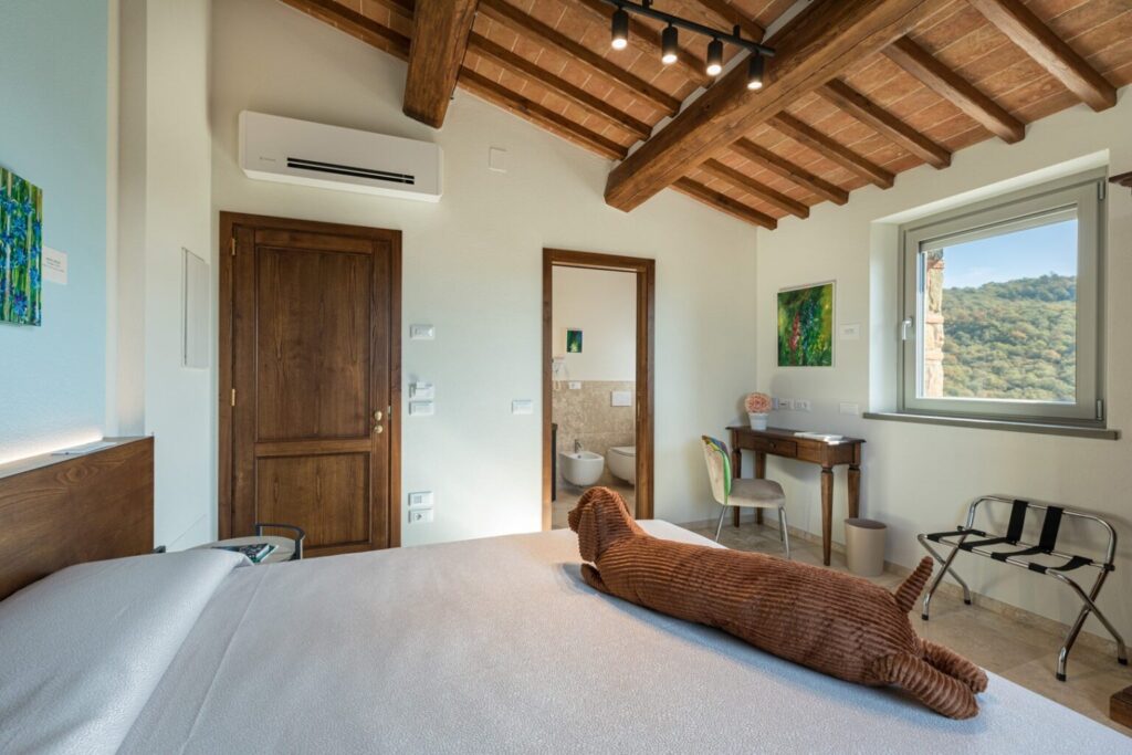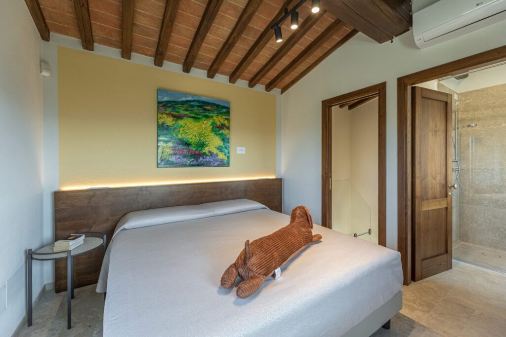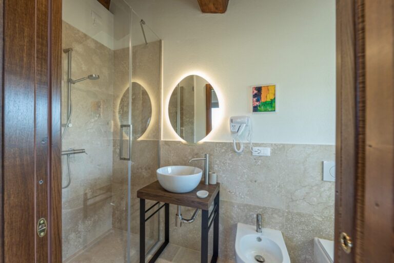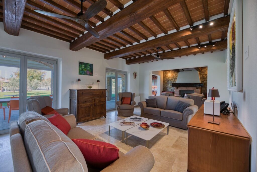 The complex consists of two residential structures, the farmhouse and the barn, plus the annex in the pool area, about 40 m away. FARMHOUSE: on two floors connected by an internal staircase. The entrance on the ground floor leads to a double guest bathroom with double basin in the anteroom, a large living area with TV and ornamental fireplace and an open-plan area with dining room and kitchen. The floor is completed by two double bedrooms with divisible bed and private bathroom with shower. The numerous French windows on the ground floor facilitate access to the outside. The first floor, consisting of the sleeping area with three double bedrooms with divisible bed and ensuite bathroom with shower, a double bedroom with private bathroom with large shower and tub and a twin bedroom (with joinable beds) with private bathroom with shower; the loggia completes the first floor. Halfway up the flight of stairs is a French window that faces outwards on a second staircase. BARN: on two floors, connected by both internal and external stairs, with a kitchenette on the ground floor and a double bedroom with divisible bed and private bathroom with shower on the first floor. ANNEX: on just one floor, it is composed of two guest bathrooms, fitness area and yoga area, massage room, women’s changing room with shower and bathroom and men’s changing room with shower and bathroom. On request, and only for exclusive use of the chef, a staff changing room with bathroom and the professional kitchen.