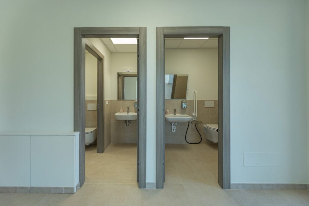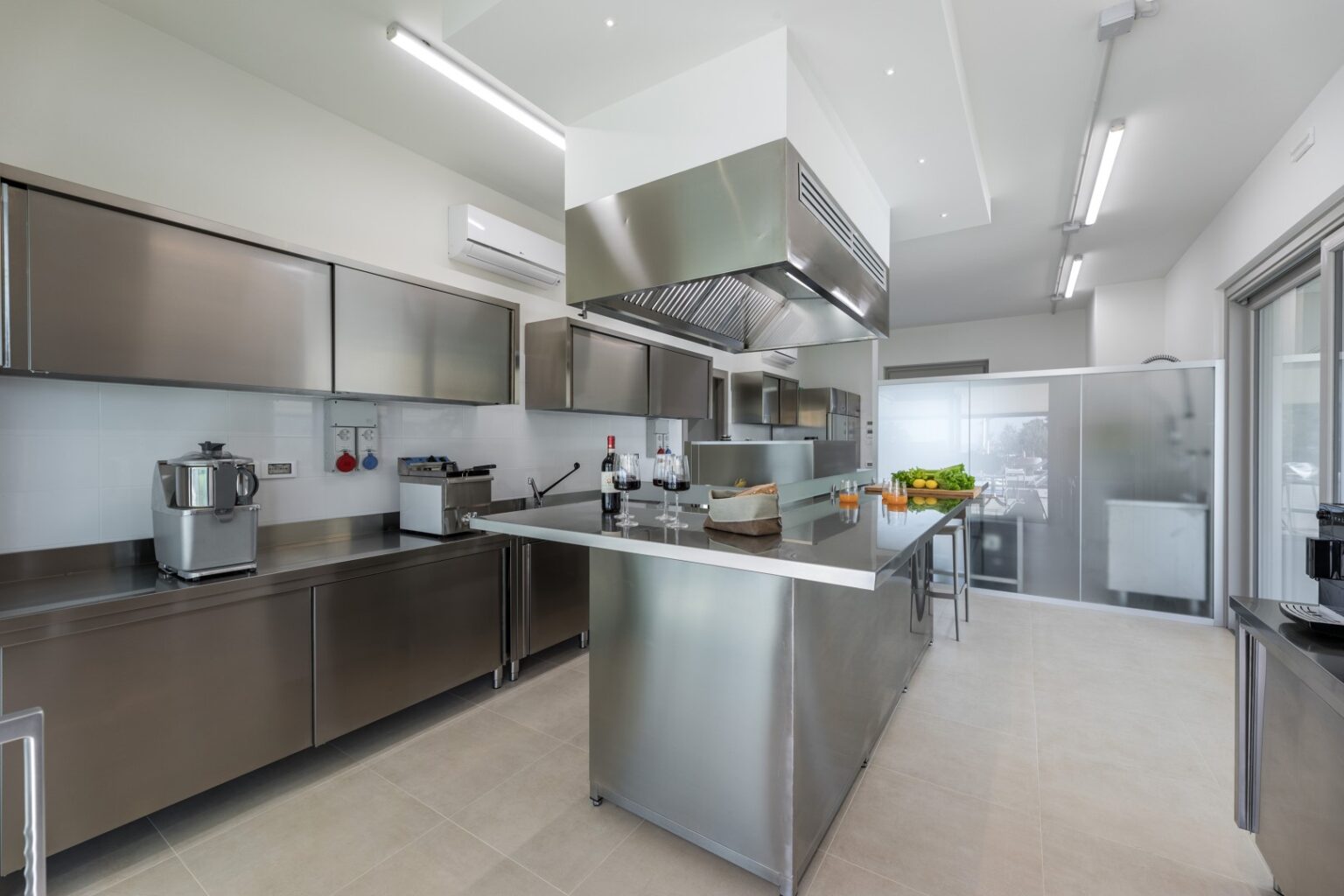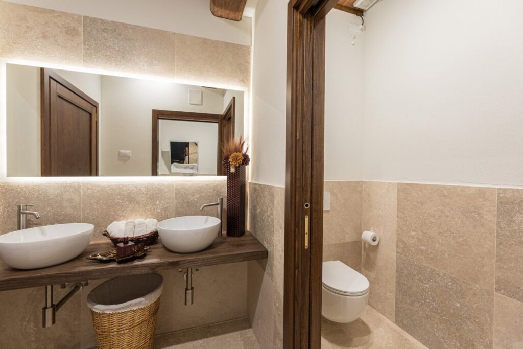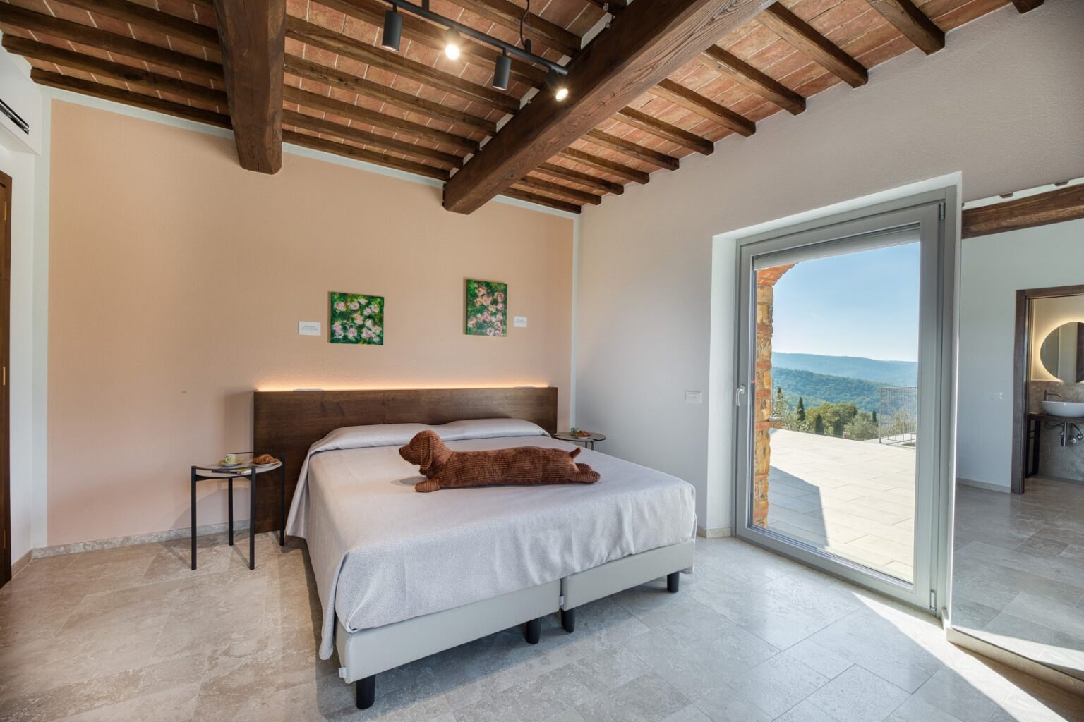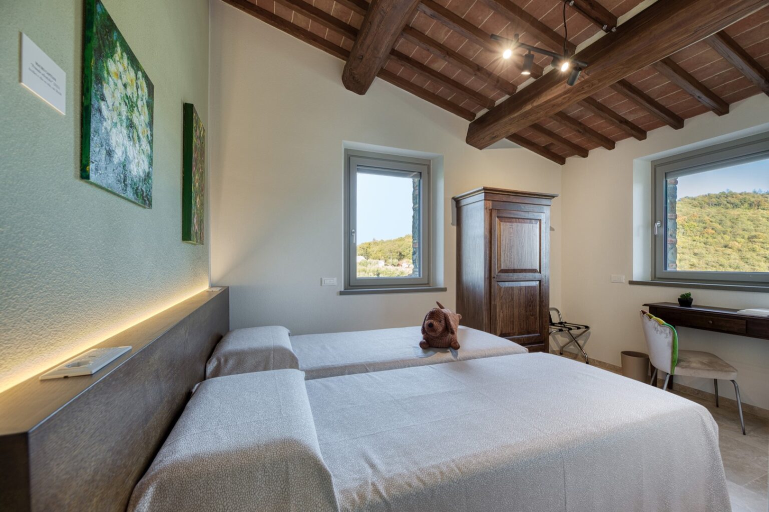 The complex consists of two residential structures, the farmhouse and the barn, plus the annex in the pool area, about 40 m away. FARMHOUSE: on two floors connected by an internal staircase. The entrance on the ground floor leads to a double guest bathroom with double basin in the anteroom, a large living area with TV and ornamental fireplace and an open-plan area with dining room and kitchen. The floor is completed by two double bedrooms with divisible bed and private bathroom with shower. The numerous French windows on the ground floor facilitate access to the outside. The first floor, consisting of the sleeping area with three double bedrooms with divisible bed and ensuite bathroom with shower, a double bedroom with private bathroom with large shower and tub and a twin bedroom (with joinable beds) with private bathroom with shower; the loggia completes the first floor. Halfway up the flight of stairs is a French window that faces outwards on a second staircase. BARN: on two floors, connected by both internal and external stairs, with a kitchenette on the ground floor and a double bedroom with divisible bed and private bathroom with shower on the first floor. ANNEX: on just one floor, it is composed of two guest bathrooms, fitness area and yoga area, massage room, women’s changing room with shower and bathroom and men’s changing room with shower and bathroom. On request, and only for exclusive use of the chef, a staff changing room with bathroom and the professional kitchen.