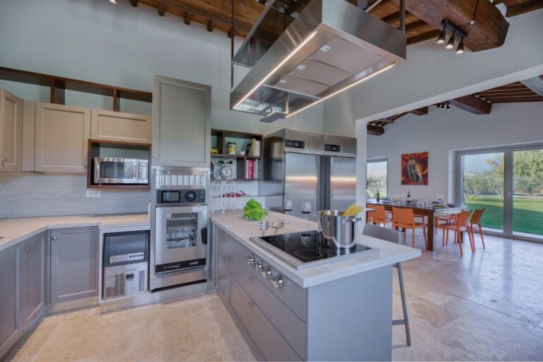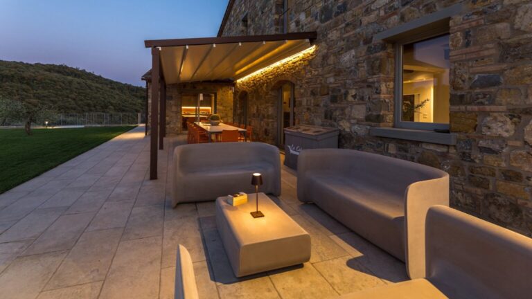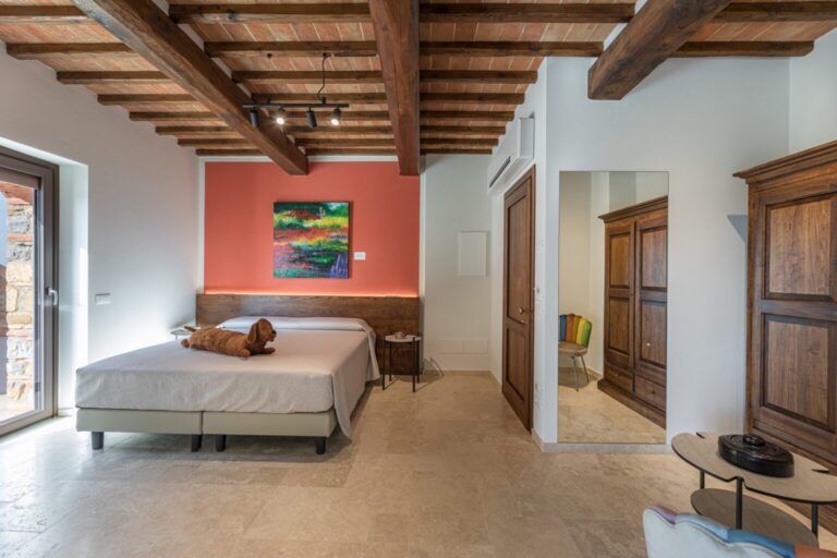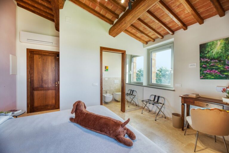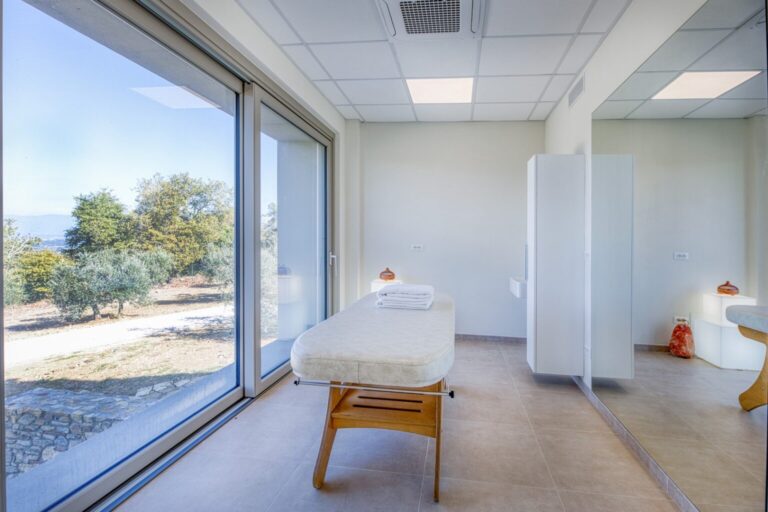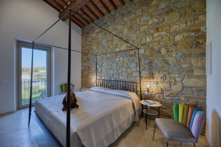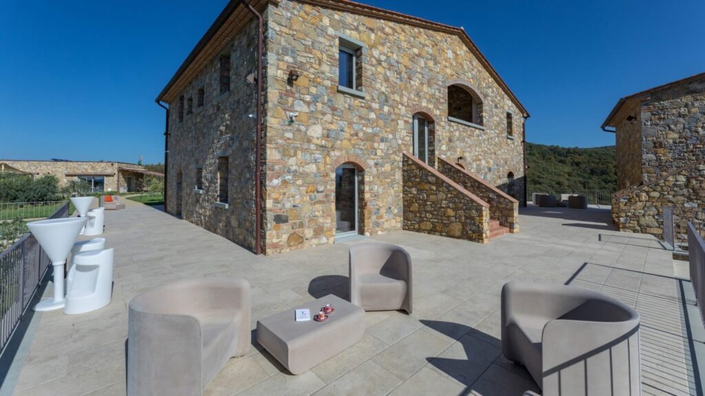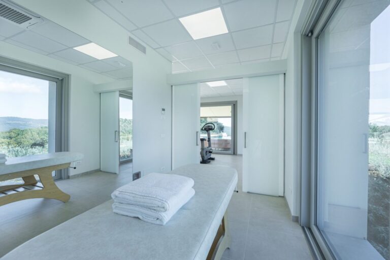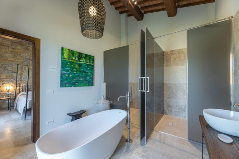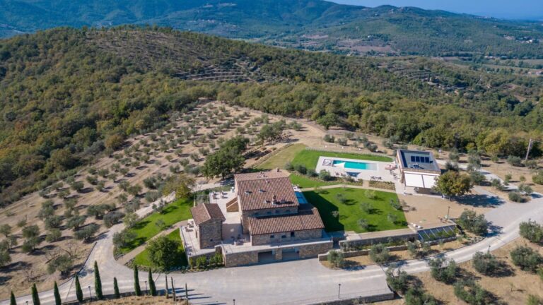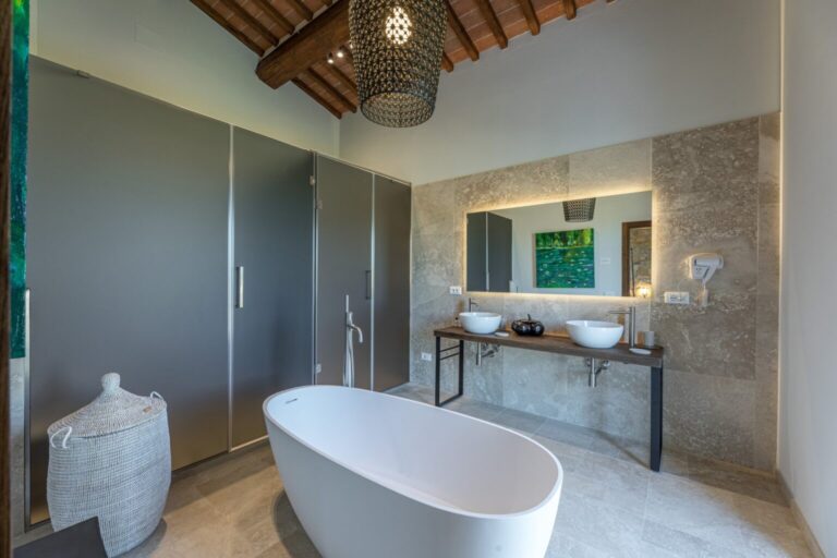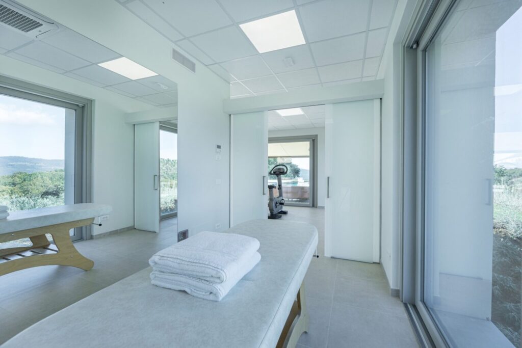 La Calcinaia is an authentic sanctuary of art, beauty and refinement in the heart of Tuscany. This sumptuous residence, entirely rebuilt in full respect of its original form, embodies the quintessence of the timeless charm of local tradition, exquisitely combined with modern comforts and a commitment to sustainability that has inspired its renovation. La Calcinaia is made up of the main building, a barn and an annex located near the swimming pool, with attention paid to the smallest detail in all the areas, from the prestigious travertine floors to the modern-style furniture and the state-of-the-art accessories to guarantee full and easy enjoyment of both the interior and exterior spaces that communicate with each other thanks to the many French windows. In the annex adjacent to the pool area is a gym and an area for practicing yoga as well as a massage room.