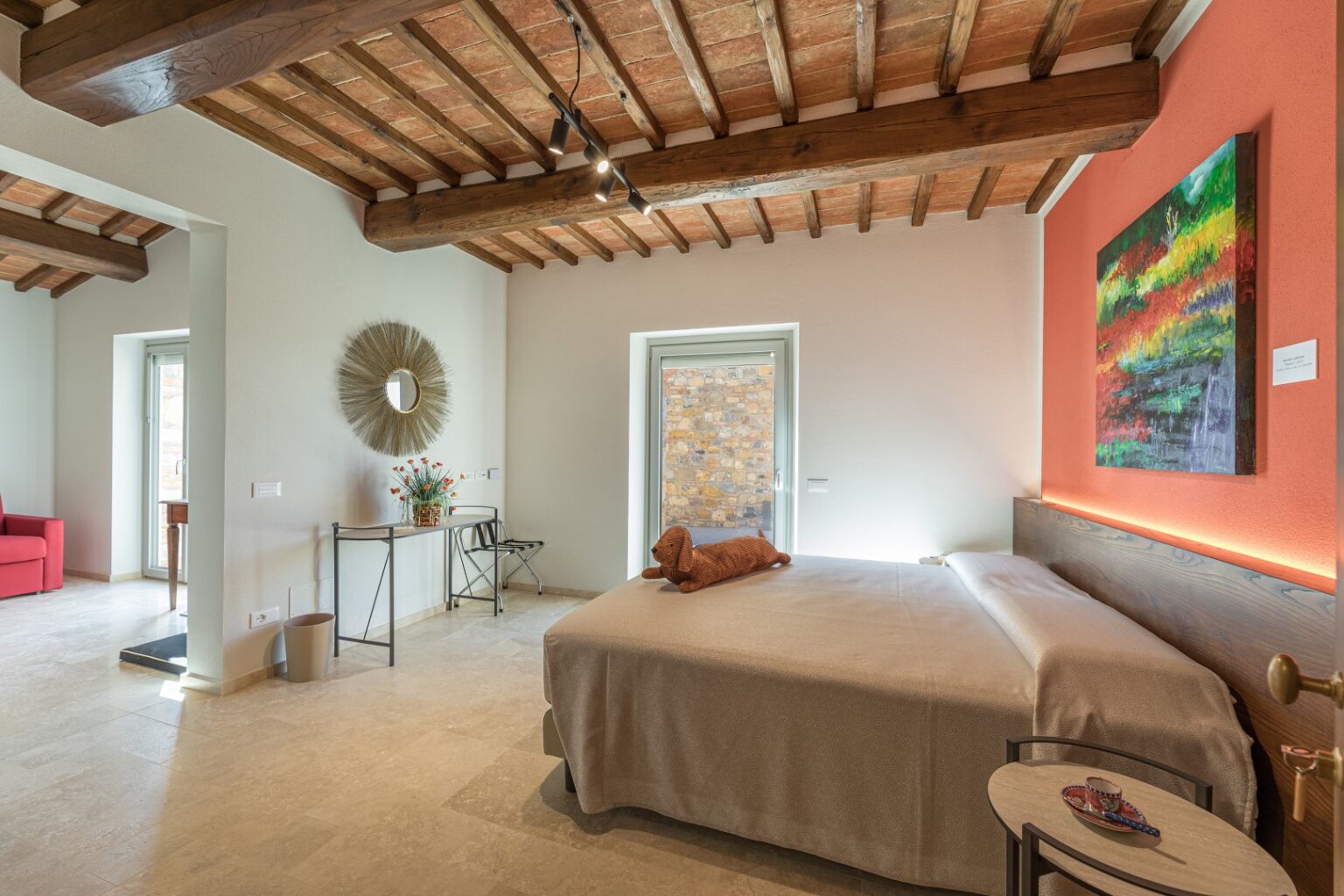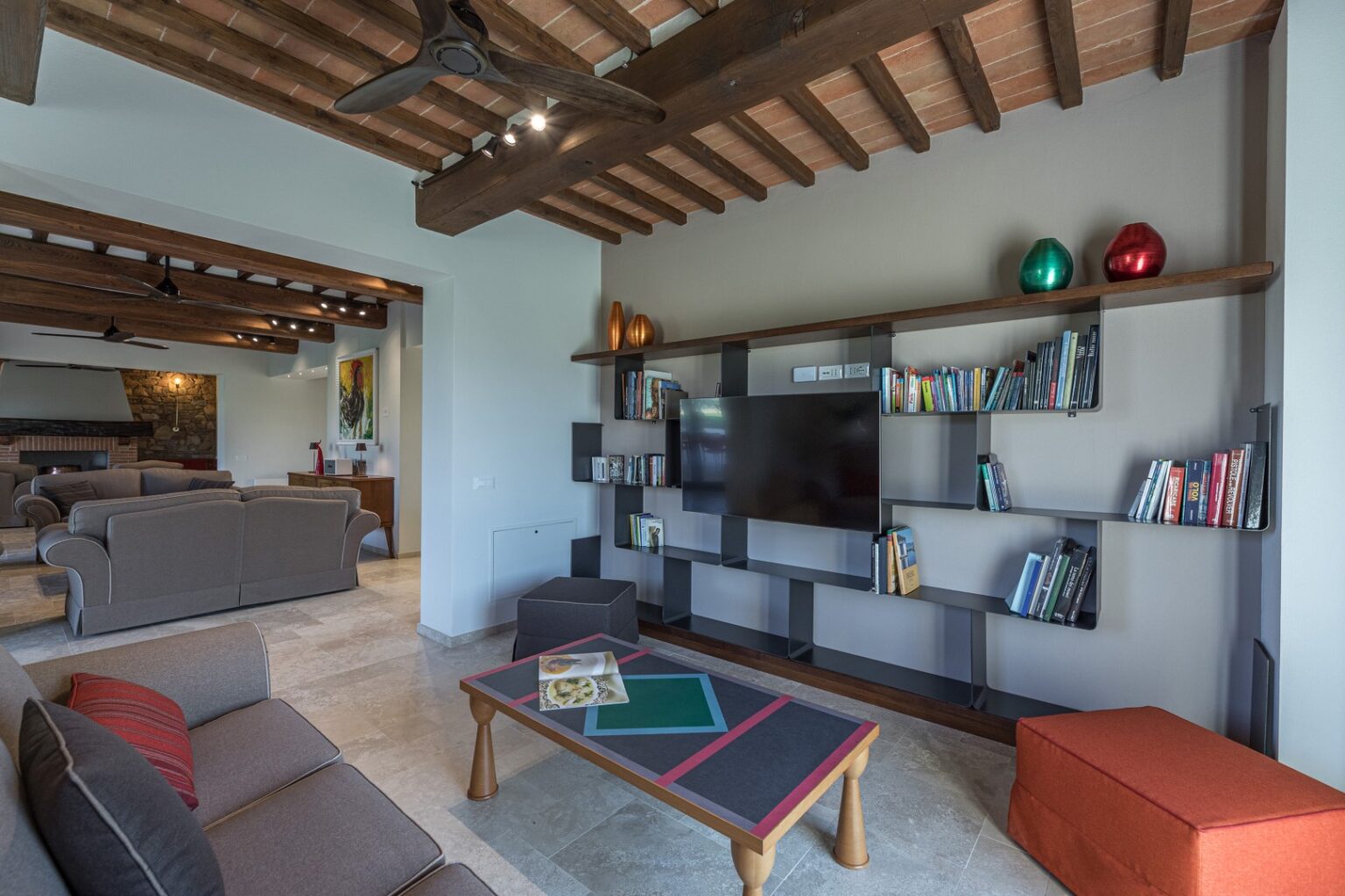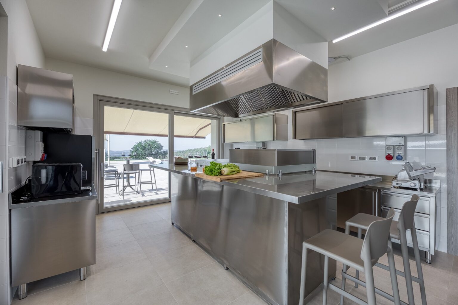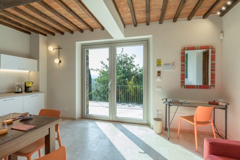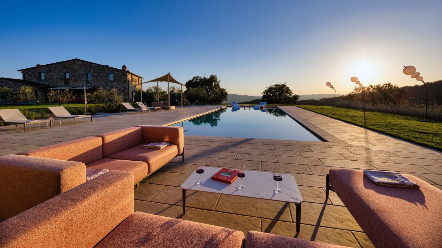 La Calcinaia is an authentic sanctuary of art, beauty and refinement in the heart of Tuscany. This sumptuous residence, entirely rebuilt in full respect of its original form, embodies the quintessence of the timeless charm of local tradition, exquisitely combined with modern comforts and a commitment to sustainability that has inspired its renovation. La Calcinaia is made up of the main building, a barn and an annex located near the swimming pool, with attention paid to the smallest detail in all the areas, from the prestigious travertine floors to the modern-style furniture and the state-of-the-art accessories to guarantee full and easy enjoyment of both the interior and exterior spaces that communicate with each other thanks to the many French windows. In the annex adjacent to the pool area is a gym and an area for practicing yoga as well as a massage room.