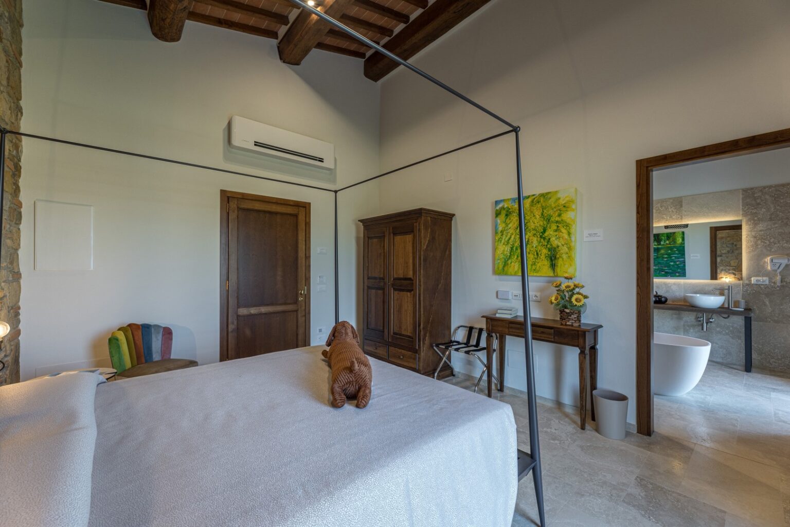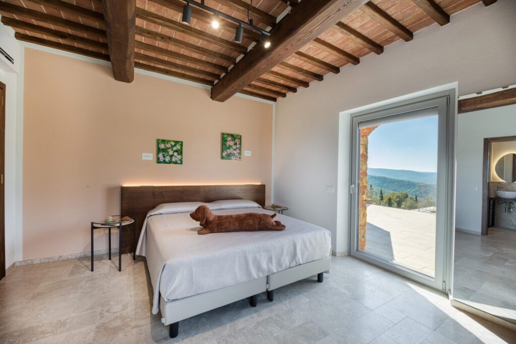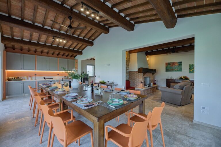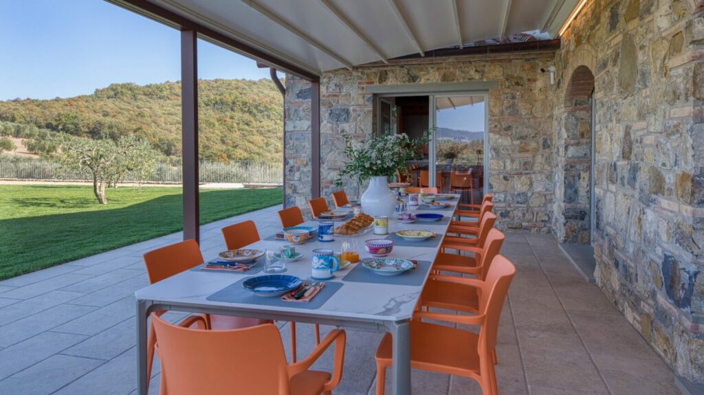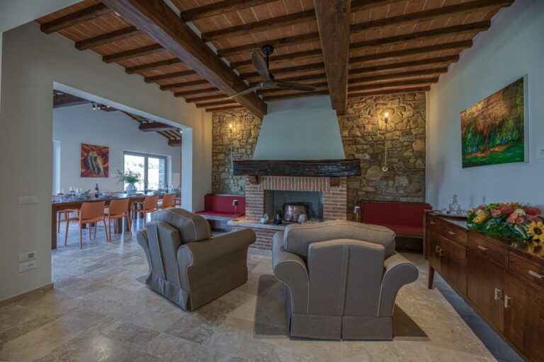Furthermore, upon request, it is possible to access a professional well-equipped kitchen for the exclusive use of a chef. Surrounded by a large, well-kept garden within a vast farm estate, with a rich assortment of plants that extends over the verdant hills framing it, and embellished by the beautiful panoramic swimming pool, the property enjoys a privileged position for exploring an area rich in food and wine proposals and in artistic and naturalistic itineraries, such as that of Chianti which winds along the wine route and which, passing through the splendid borghi of Gaiole, Radda, Panzano, and Greve, leads to Florence, but also for discovering the charm of the borghi of Montalcino or Pienza, immersed in the fantastic setting of the Val d’Orcia, and also Montepulciano and San Gimignano. To further enrich your experience in this property, ideal for events and celebrations, there is an attendant for the preparation of breakfast (shopping is excluded) and a housekeeper for the daily cleaning of the common areas: the living room, guest bathrooms and the annex in the pool area. NB. Within the property, 10 minutes away by car, lives the caretaker who operates with extreme discretion, taking care of the ordinary maintenance of the fields of the estate.