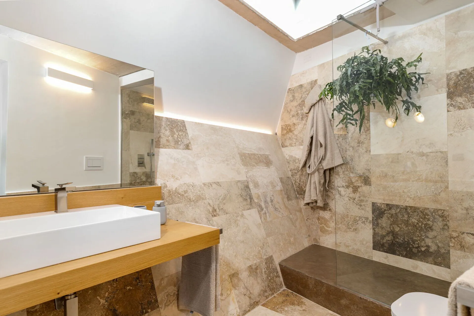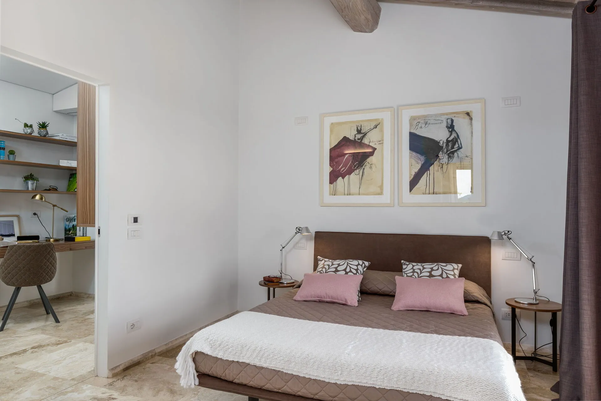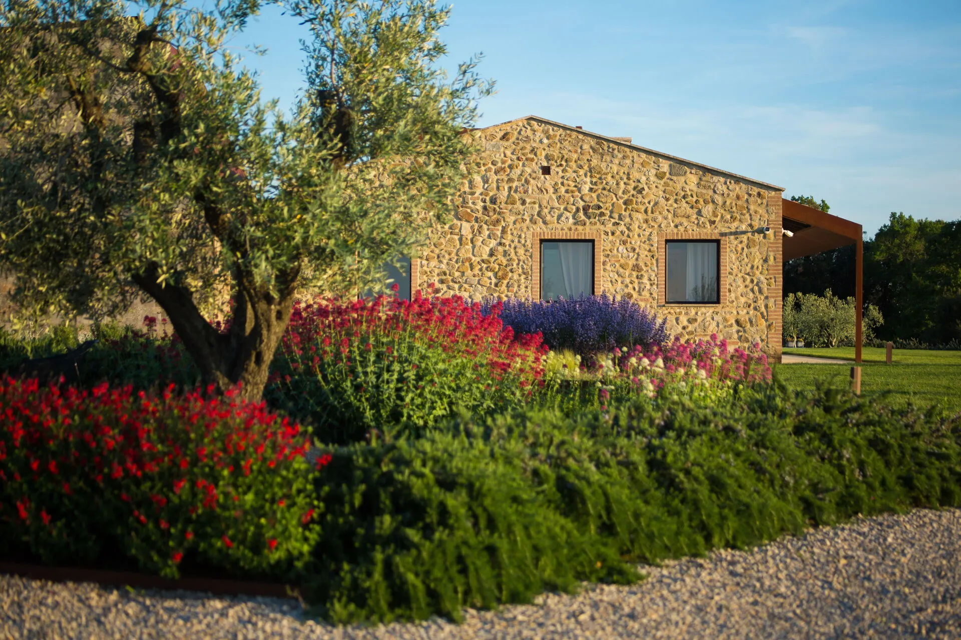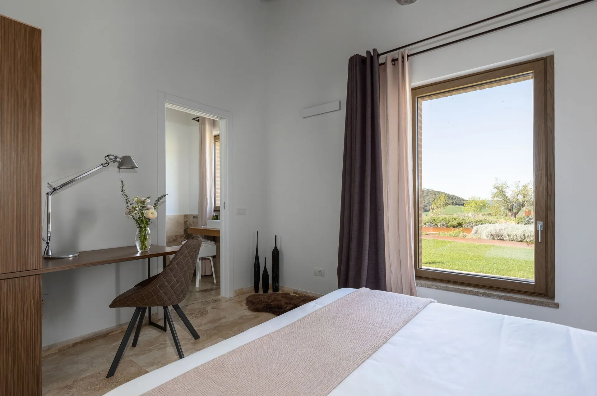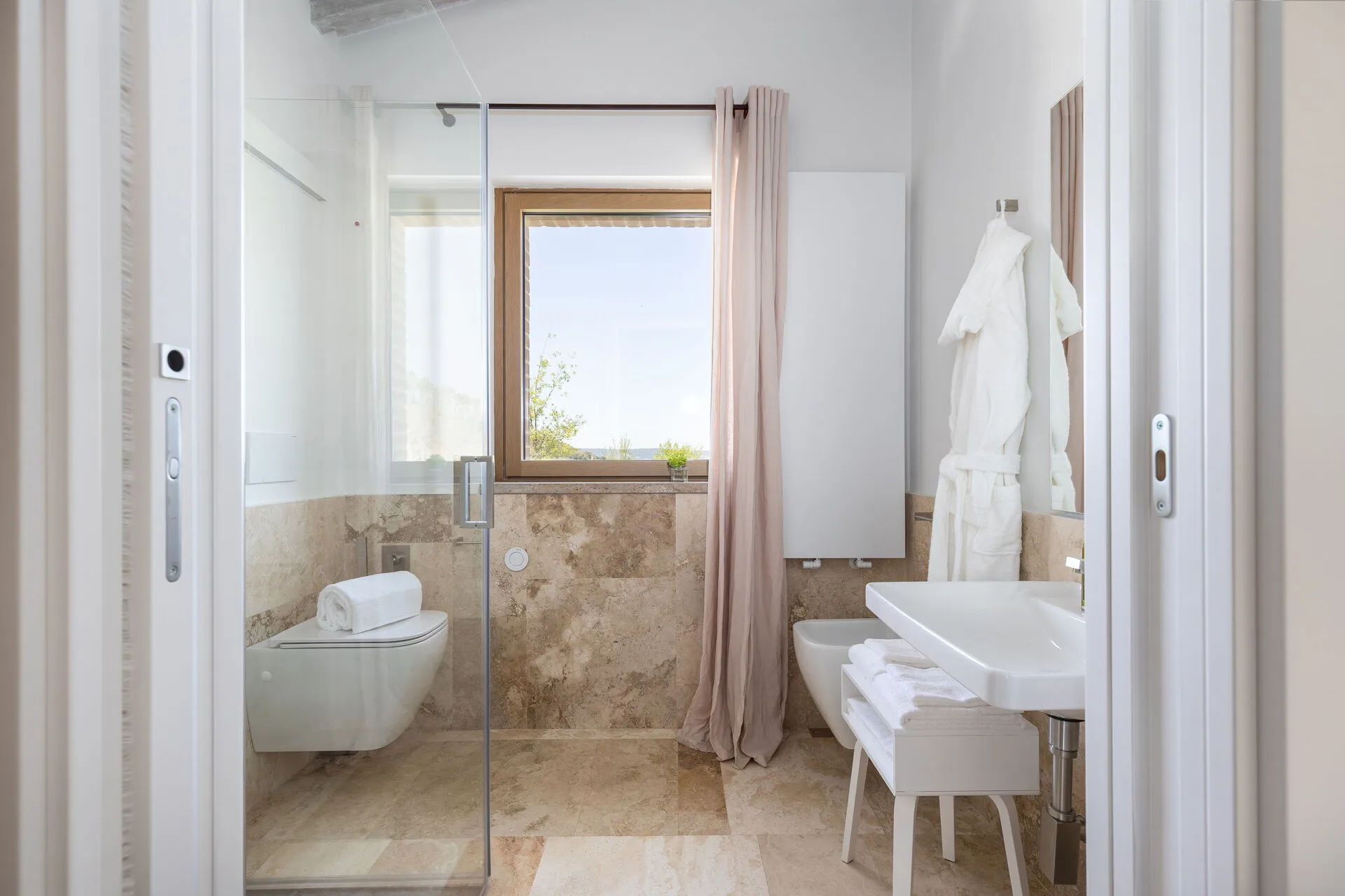 The sleeping area is characterised by 3 double bedrooms with en suite bathroom equipped with a glass shower: two of the rooms are on the ground floor, one of the rooms has a bathroom equipped to accommodate wheelchair users. These rooms have views of the beautiful garden. On the upper floor is The Suite with a view of the breathtaking panorama.