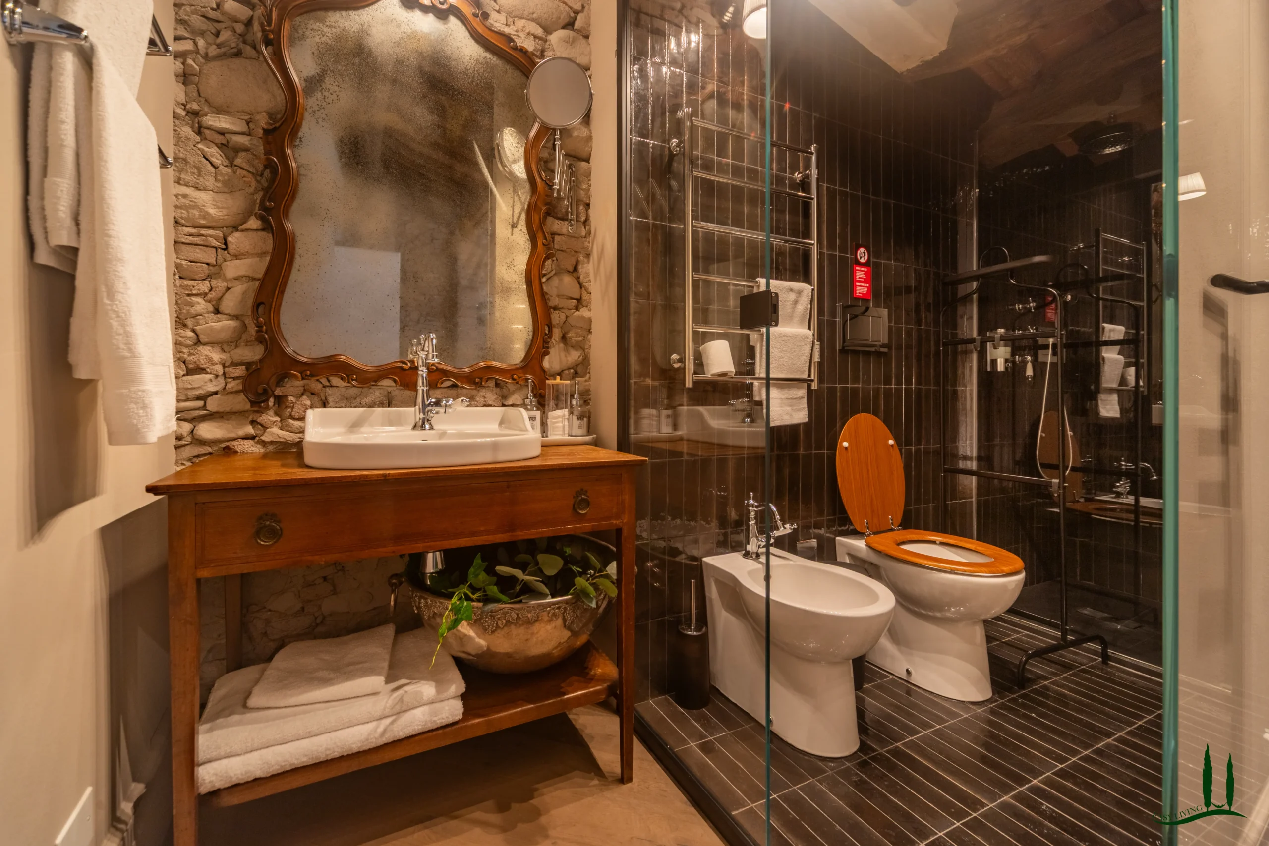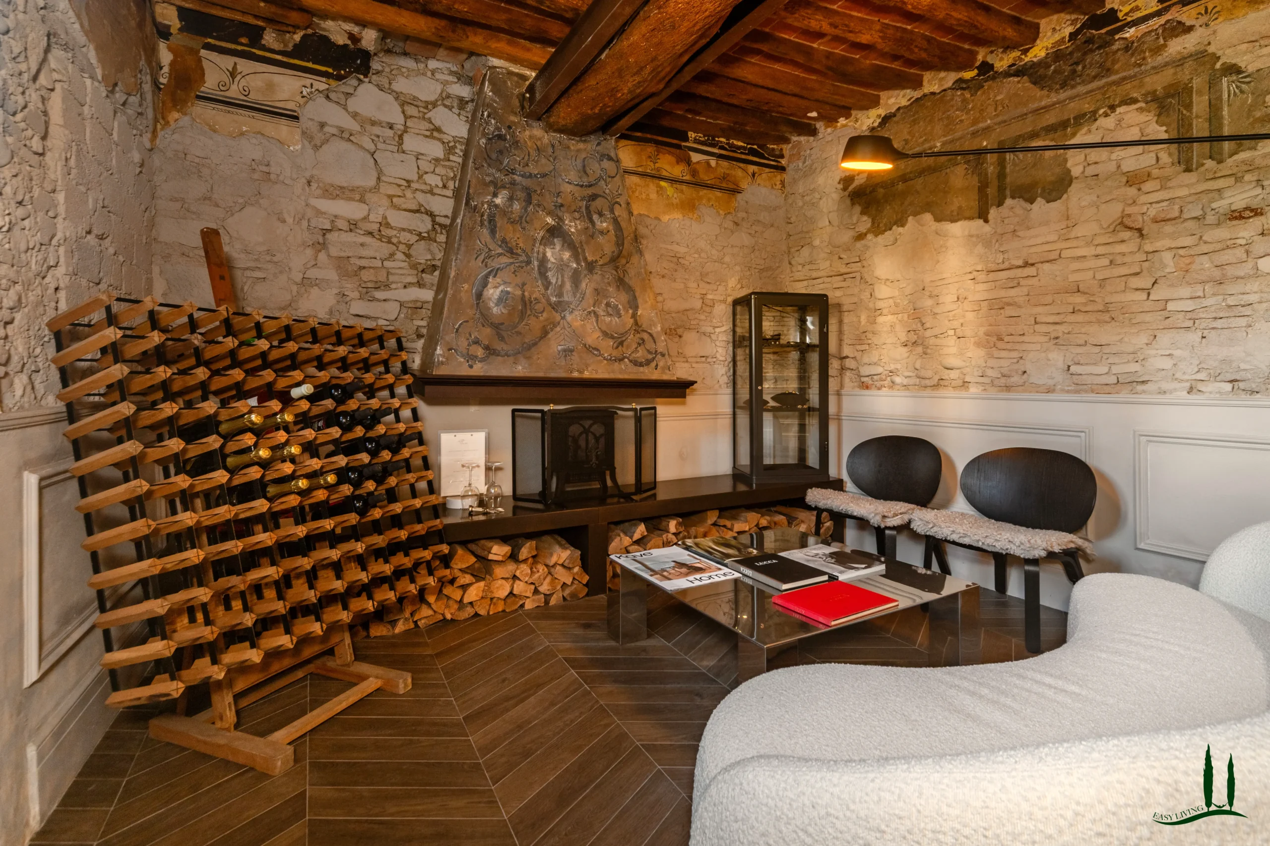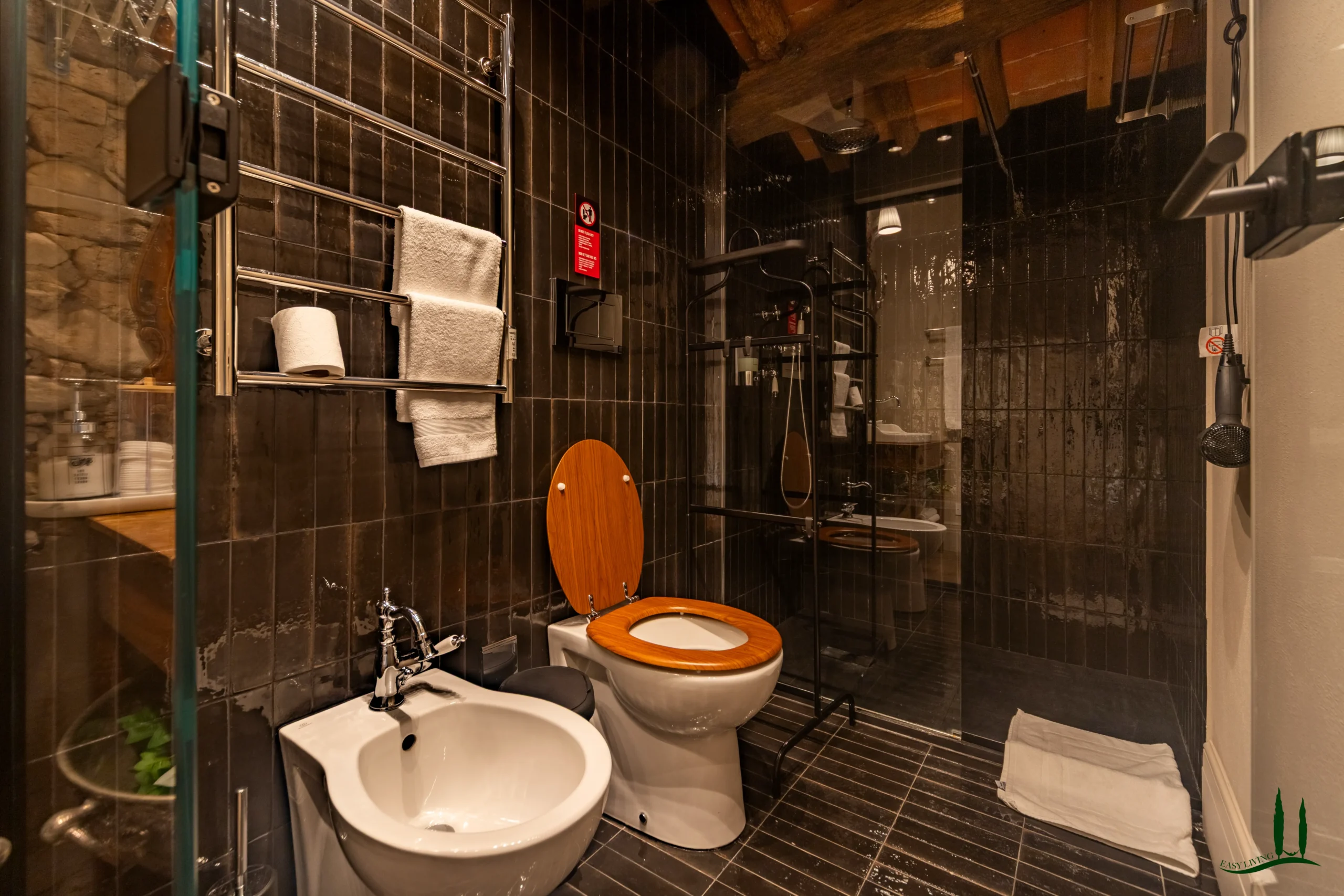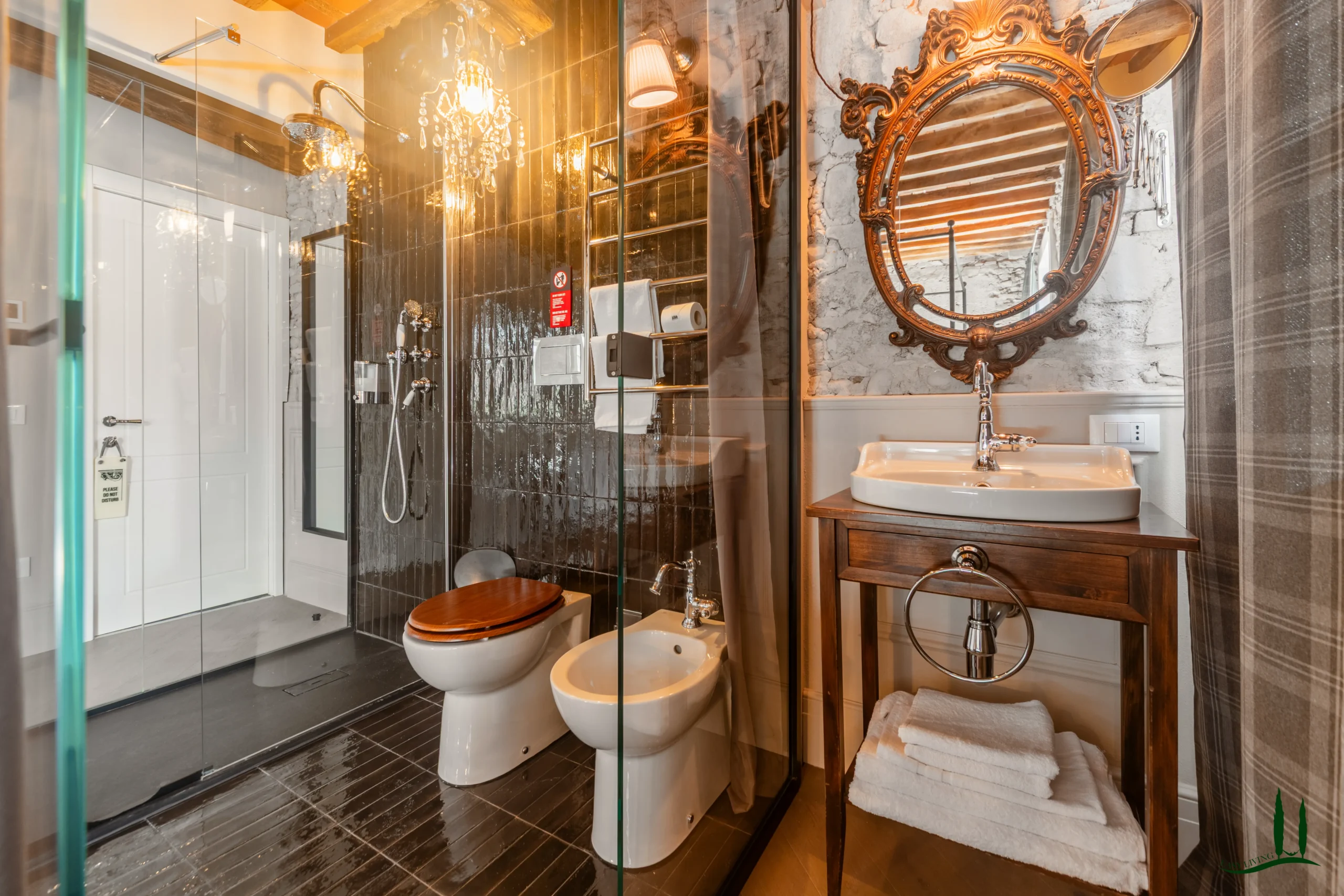 On the ground floor, a welcoming living room with a decorative frescoed fireplace creates a warm and atmospheric space. This level also includes a bedroom with en-suite bathroom and access to a private terrace, along with a technical room.