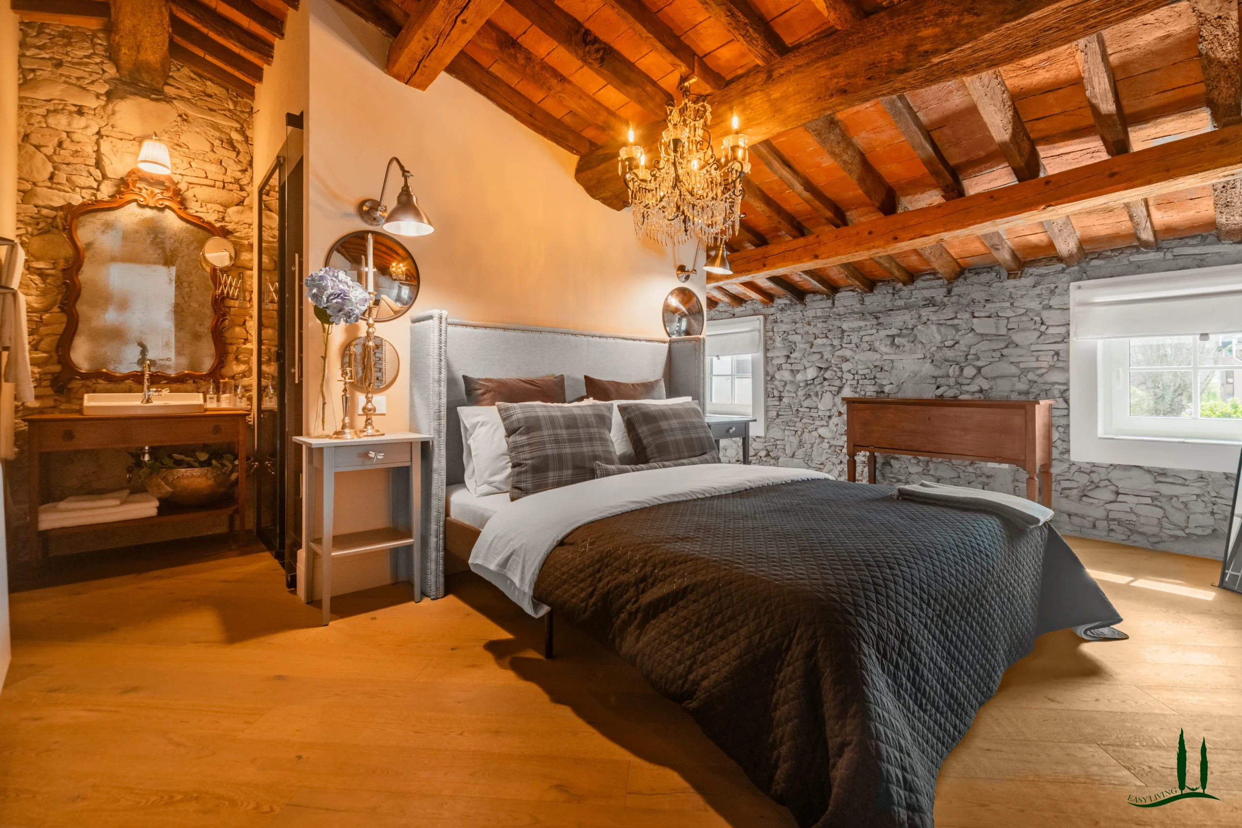 The second floor (attic level) offers a versatile layout with two distinct spaces: a bedroom with en-suite bathroom and a cozy living area with kitchenette, perfect as an independent guest suite or private retreat.