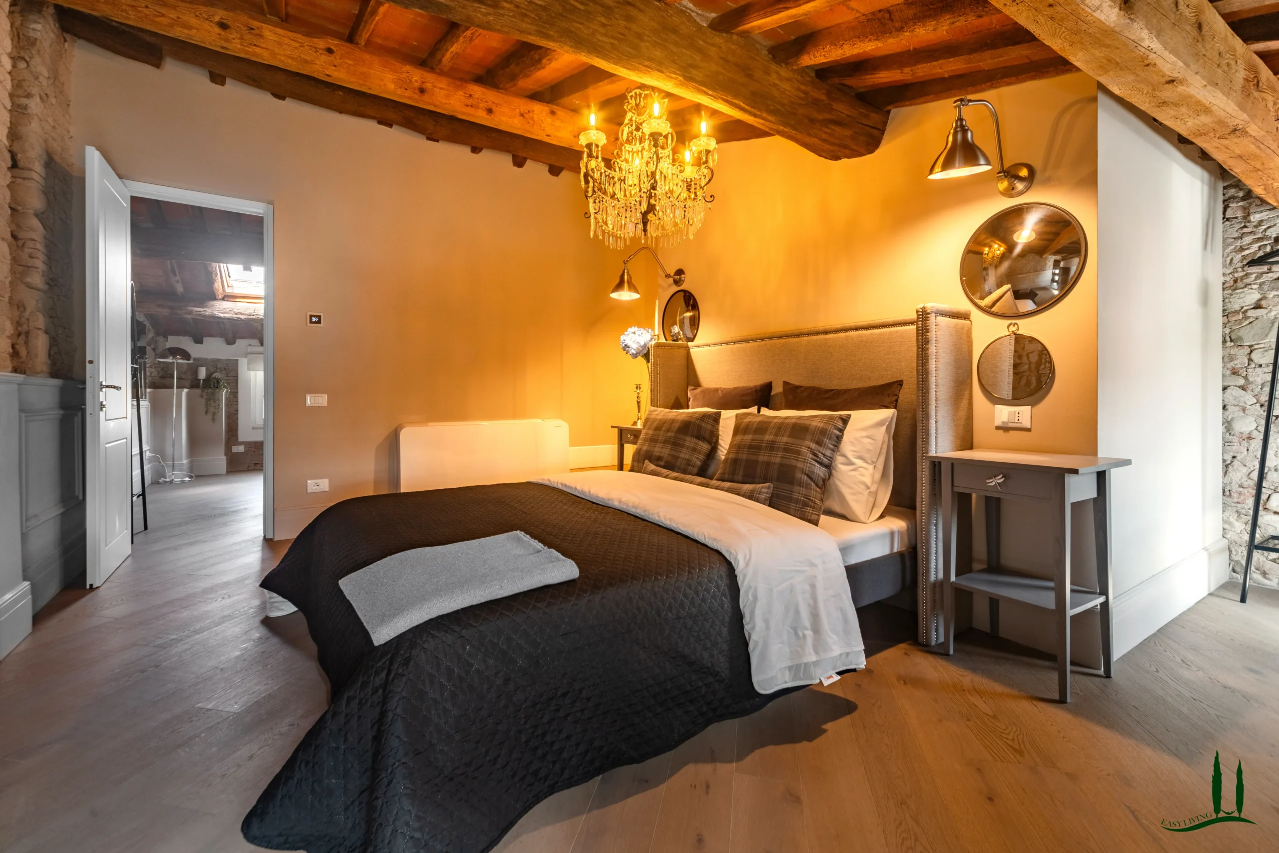 The property features an independent entrance and is arranged over three levels, showcasing original exposed wooden beams, decorative fresco details, and carefully selected high-quality materials throughout.