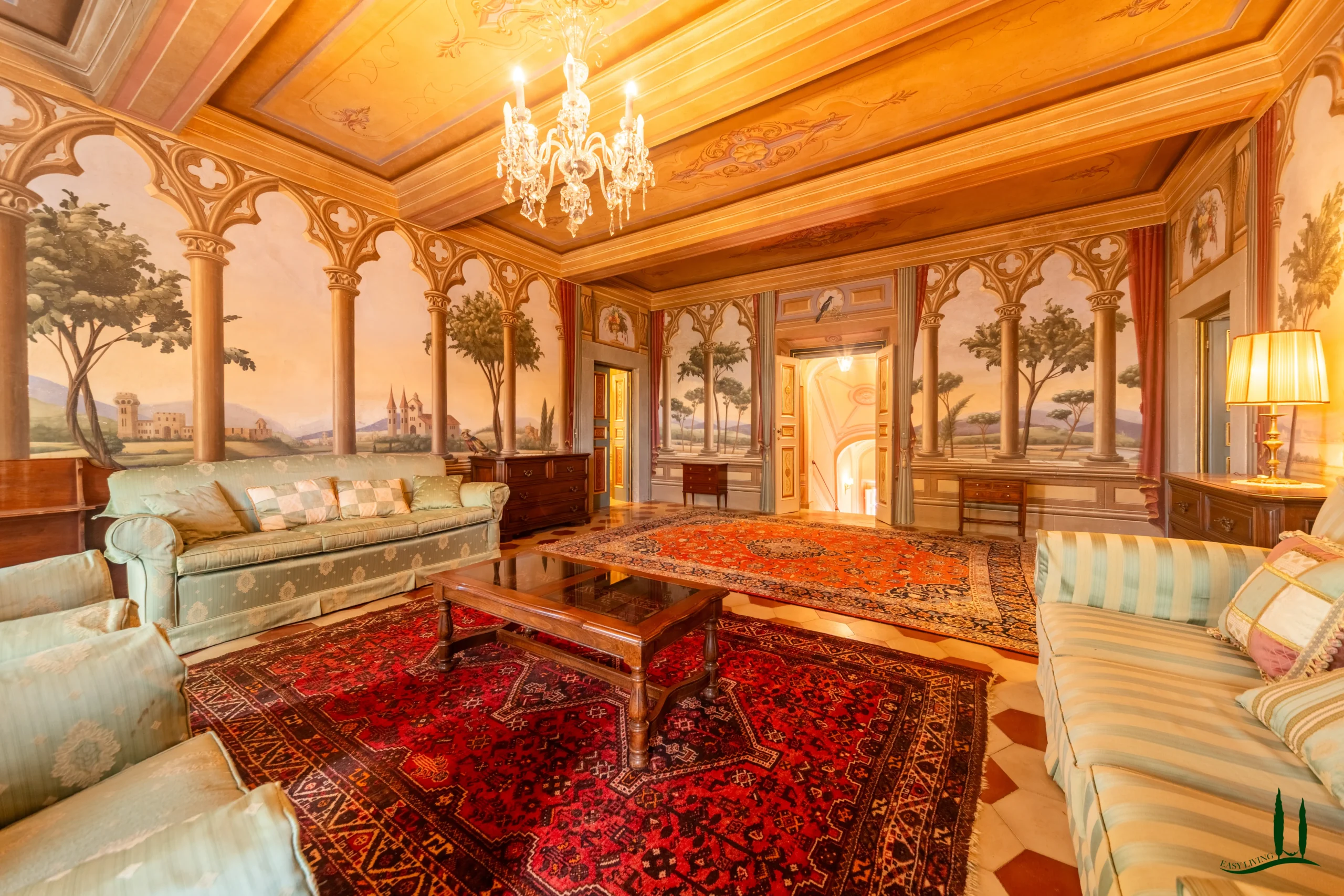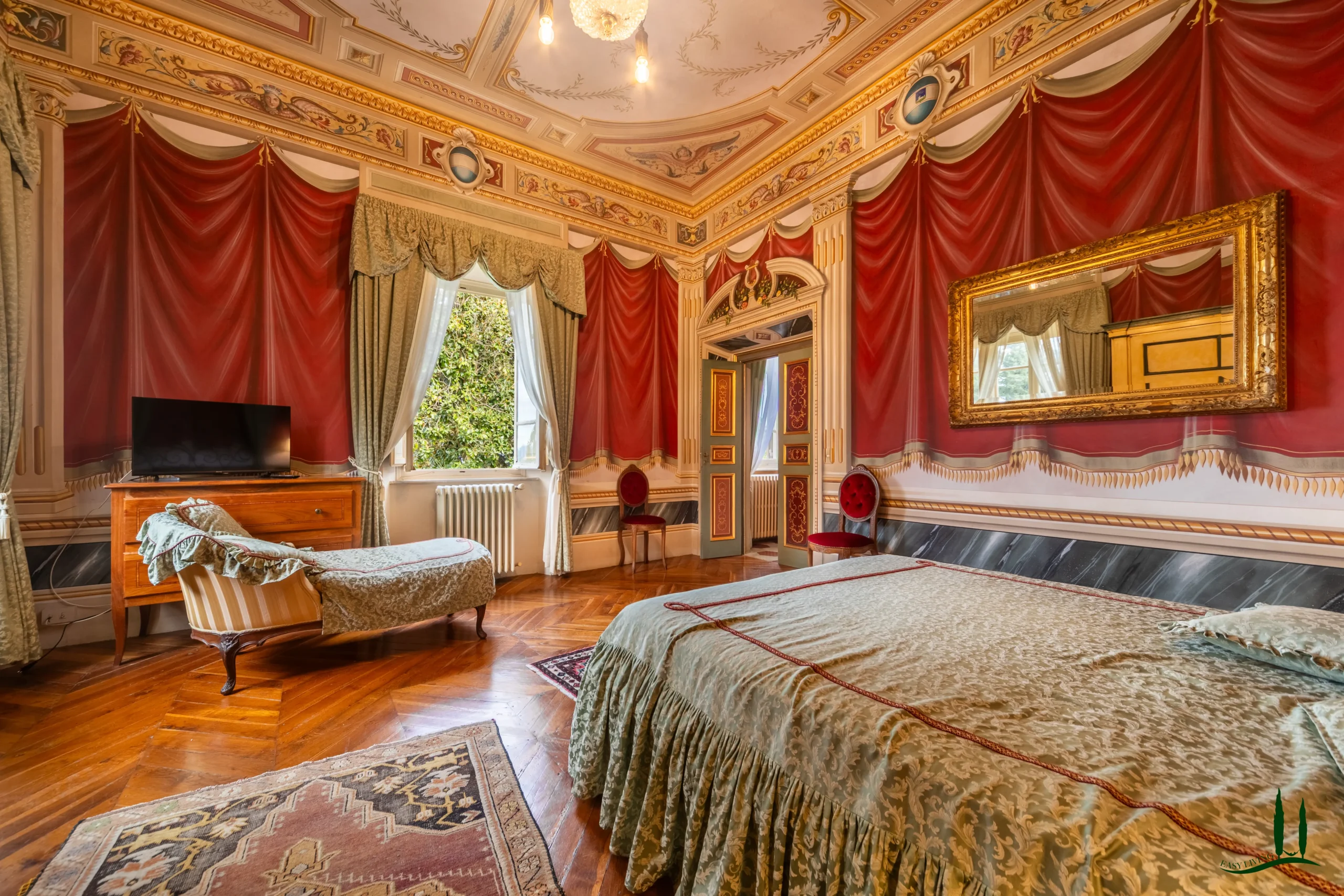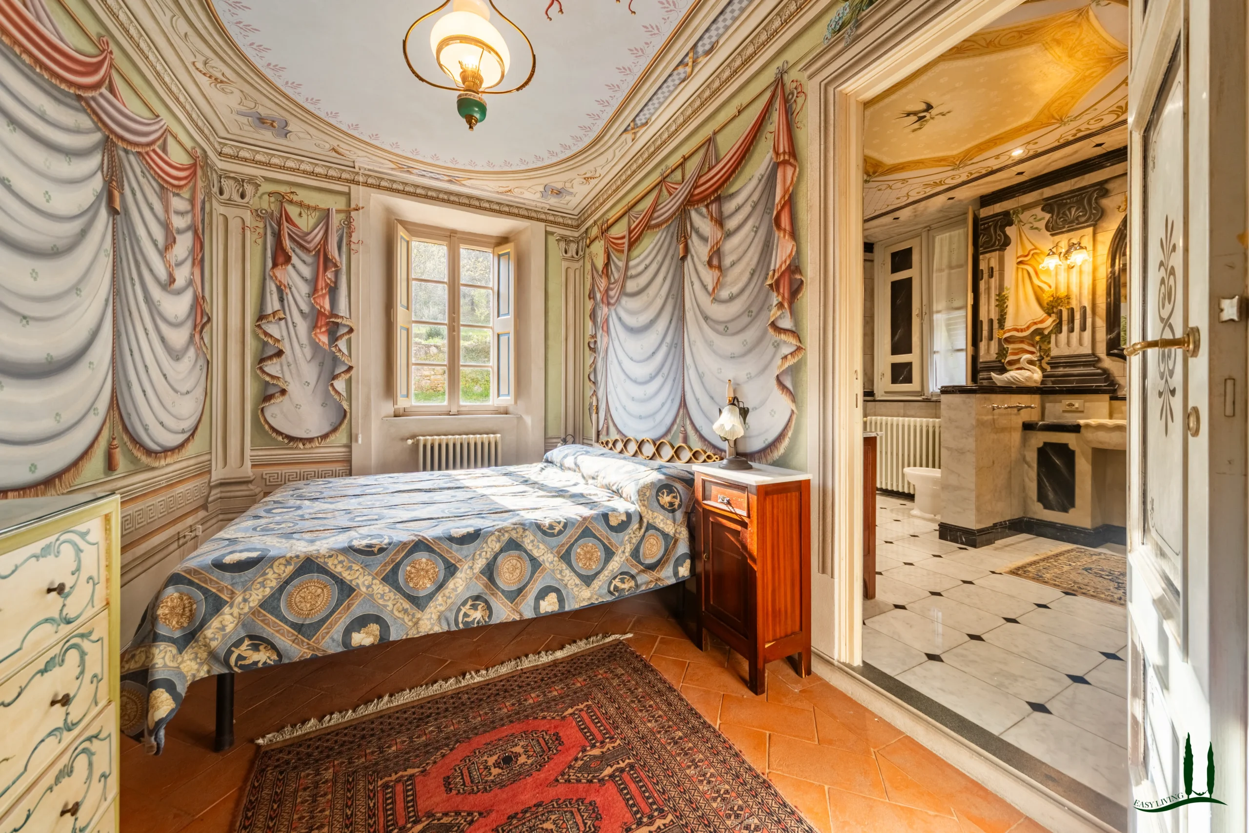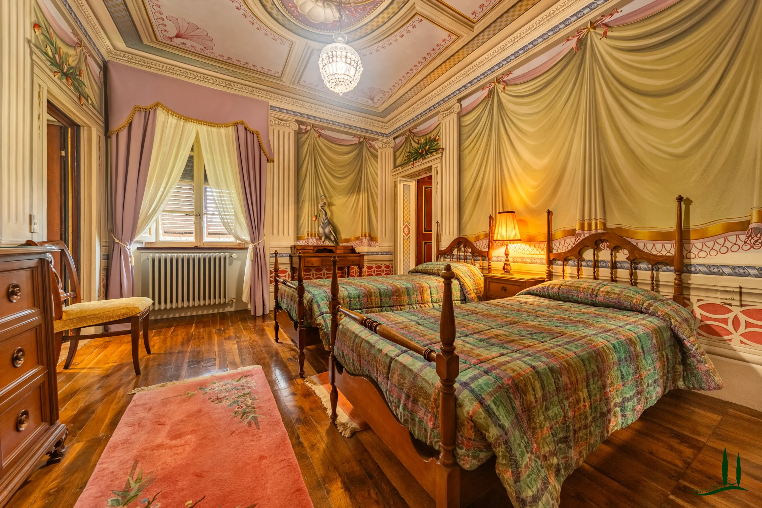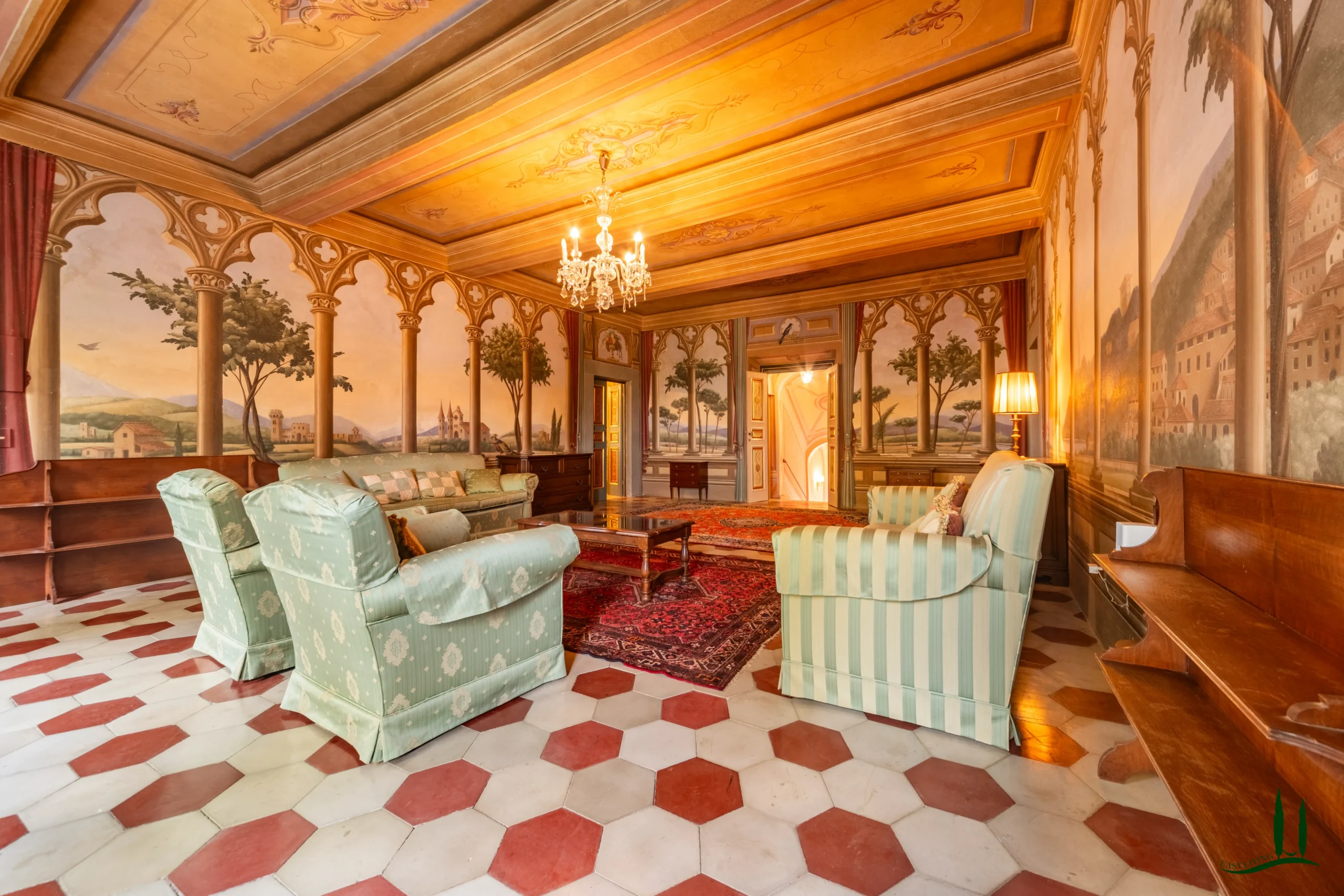 The villa dates back to the 16th century, with its present layout shaped by expansions carried out between the 18th and 19th centuries. Although it passed through the Liberty period in the early 20th century, the building has retained its predominantly 18th-century architectural character. Inside, the style is richly layered: the ground floor reception hall blends Renaissance and Liberty influences, with decorative works attributed to the Lucchese painter Vincenzo Barsotti. On the first floor, a grand salon features trompe-l’œil frescoes depicting the surrounding countryside, including a striking neo-Gothic colonnade inspired by architectural elements once present on the estate. The bedrooms are adorned with painted drapery motifs reminiscent of the Empire style, combined with 16th-century decorative schemes.