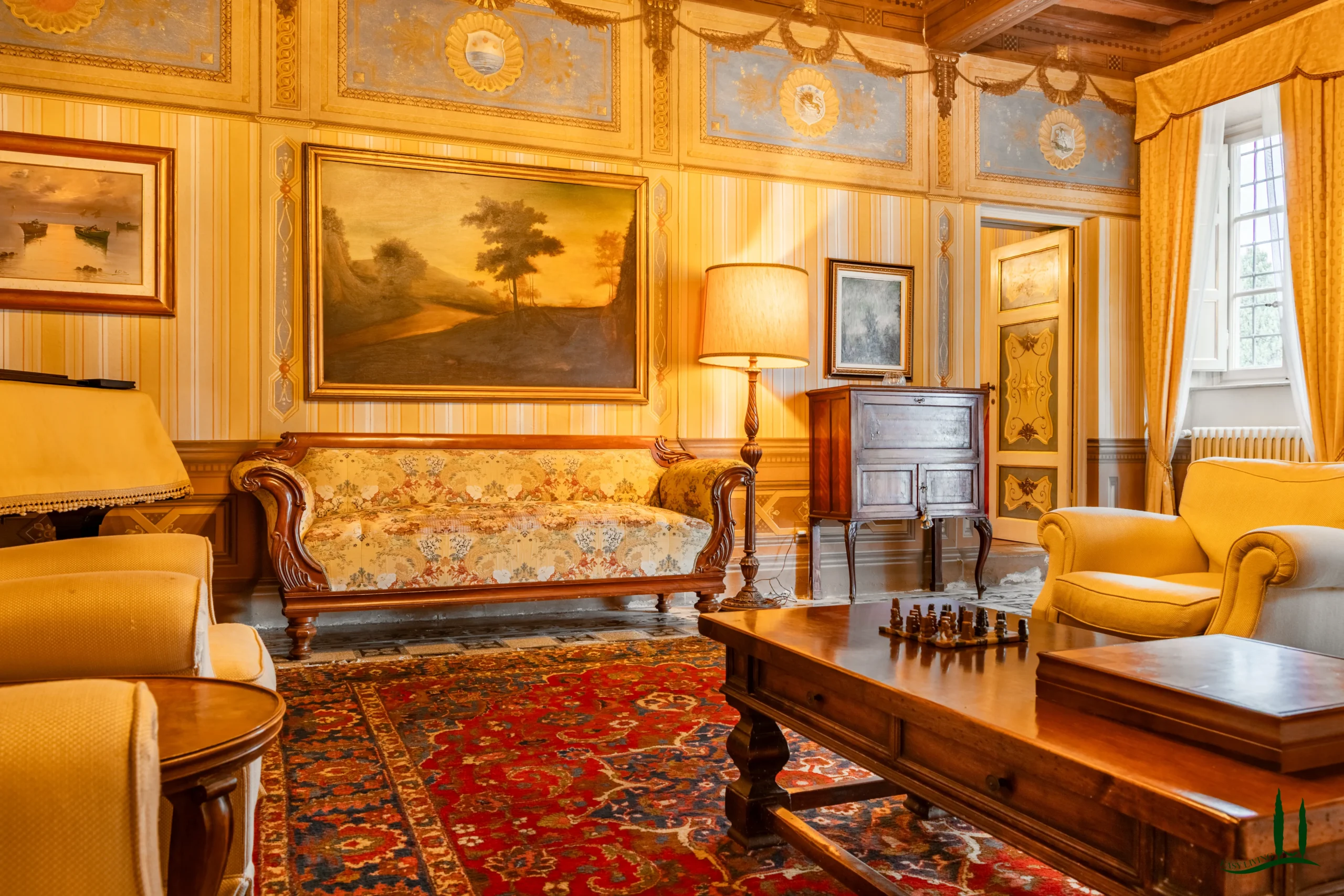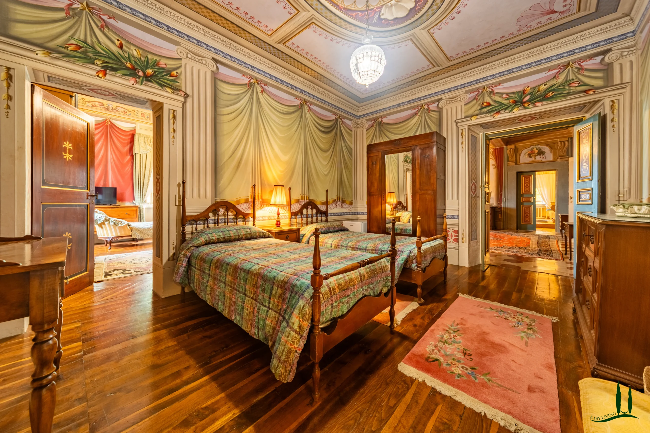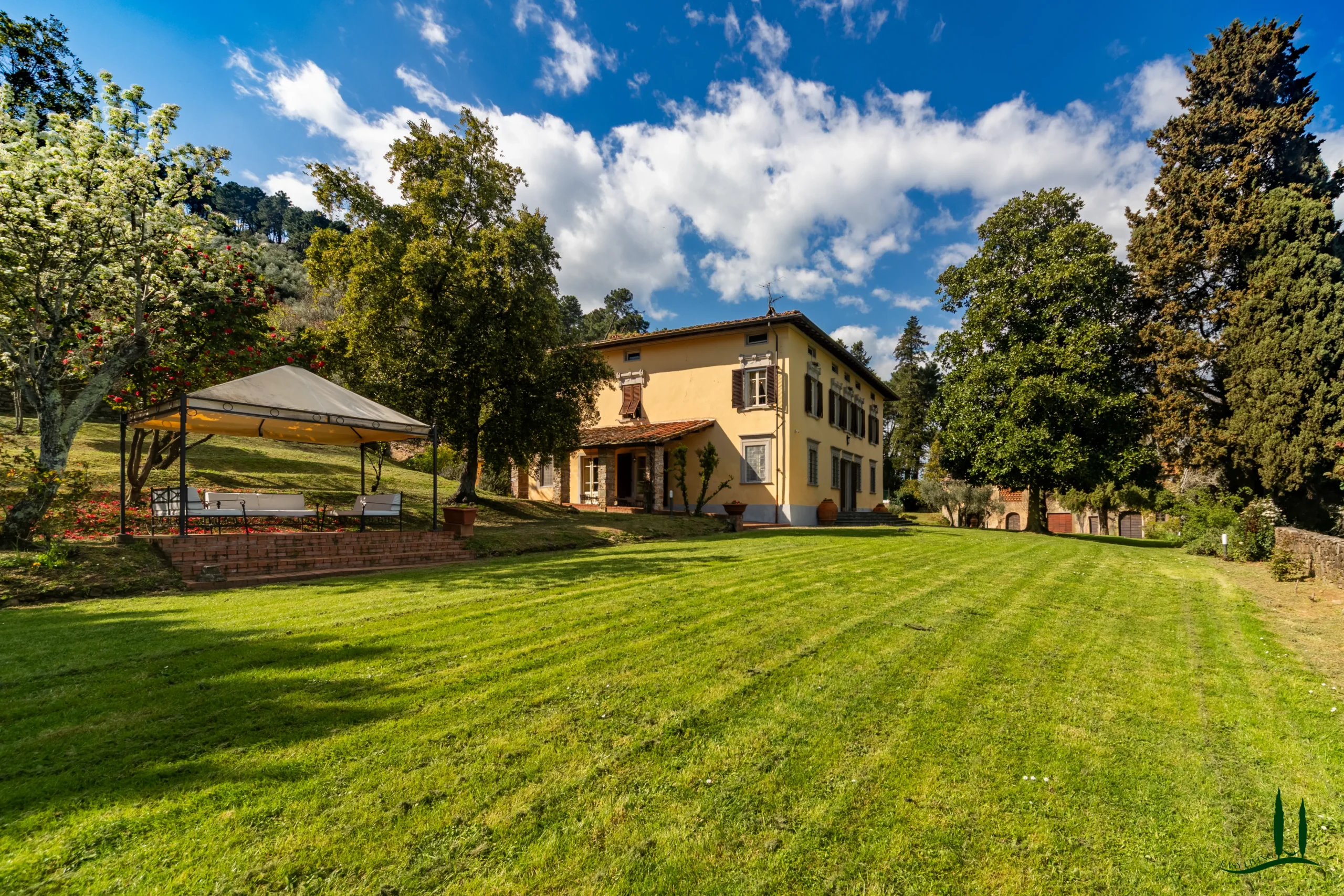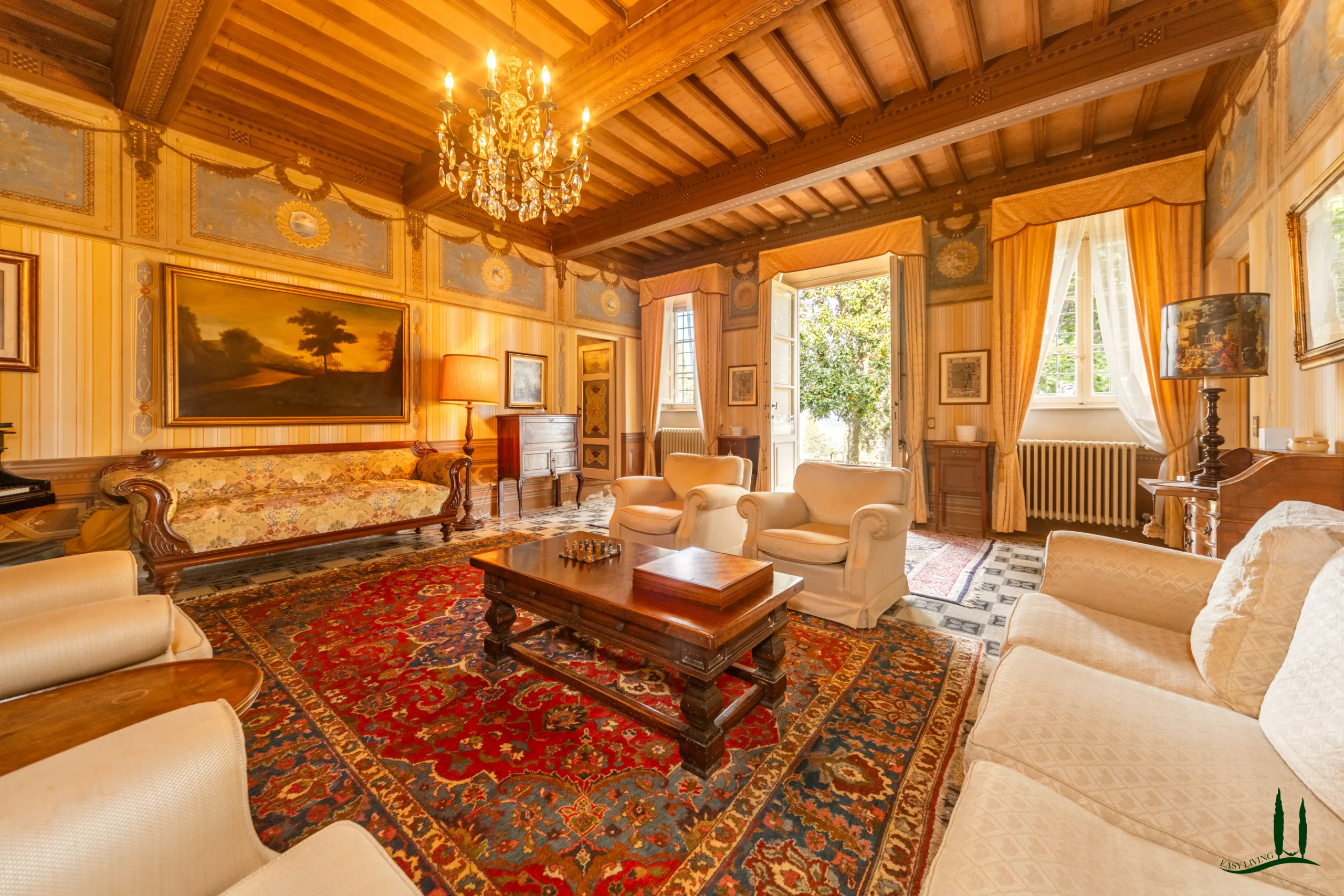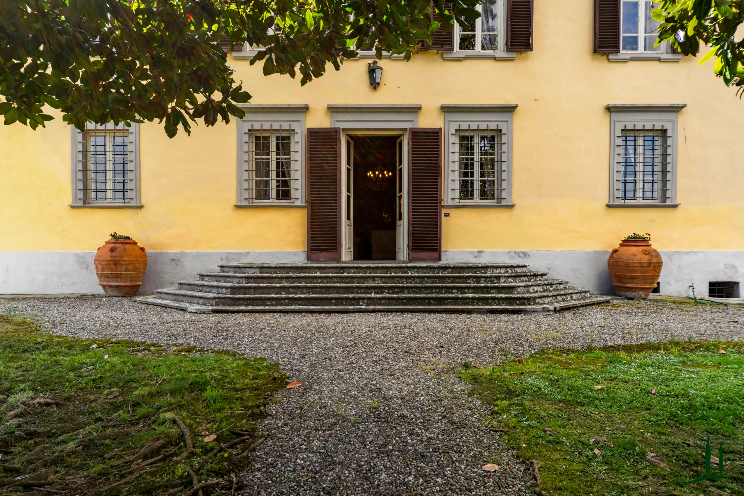 The villa dates back to the 16th century, with its present layout shaped by expansions carried out between the 18th and 19th centuries. Although it passed through the Liberty period in the early 20th century, the building has retained its predominantly 18th-century architectural character. Inside, the style is richly layered: the ground floor reception hall blends Renaissance and Liberty influences, with decorative works attributed to the Lucchese painter Vincenzo Barsotti. On the first floor, a grand salon features trompe-l’œil frescoes depicting the surrounding countryside, including a striking neo-Gothic colonnade inspired by architectural elements once present on the estate. The bedrooms are adorned with painted drapery motifs reminiscent of the Empire style, combined with 16th-century decorative schemes.