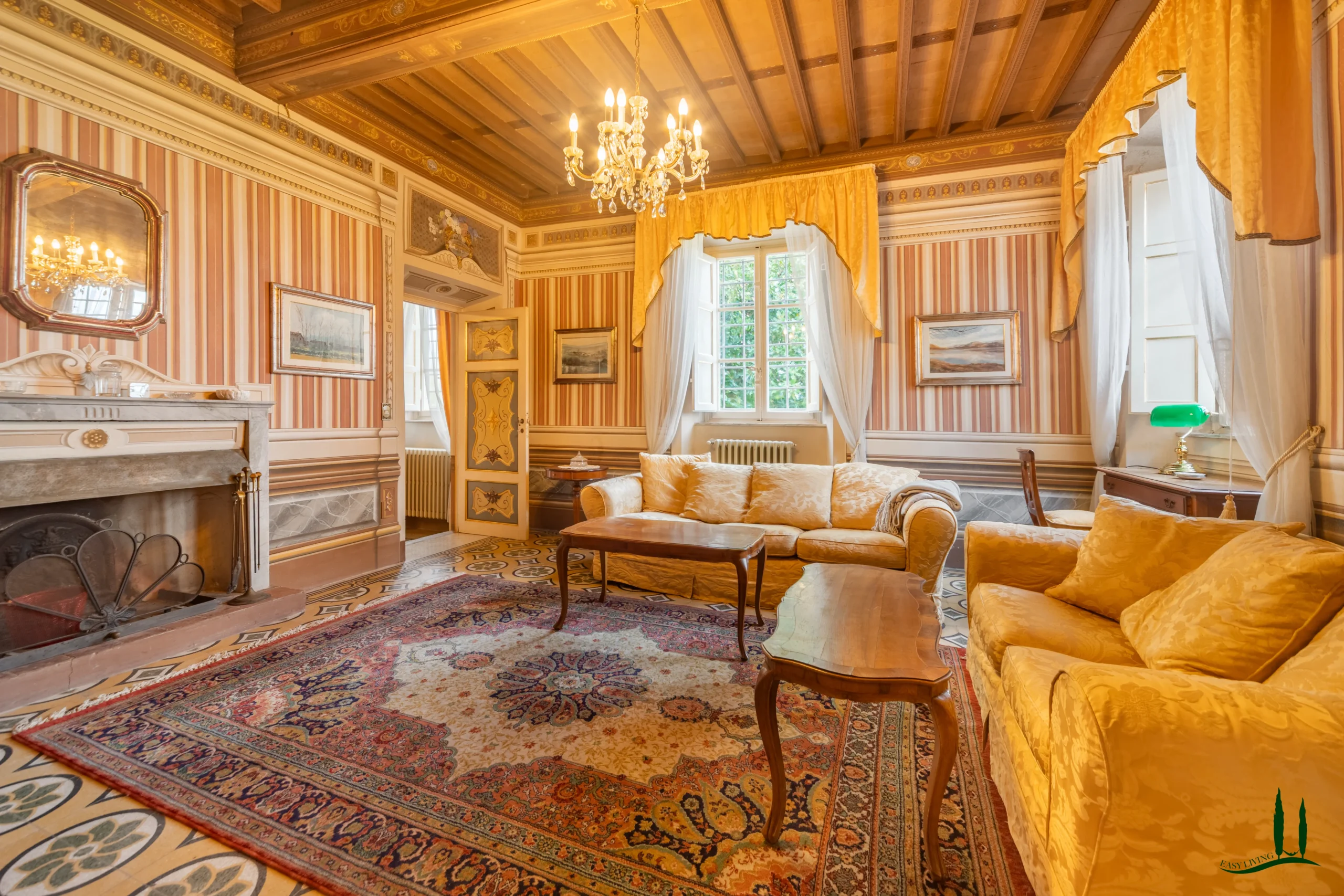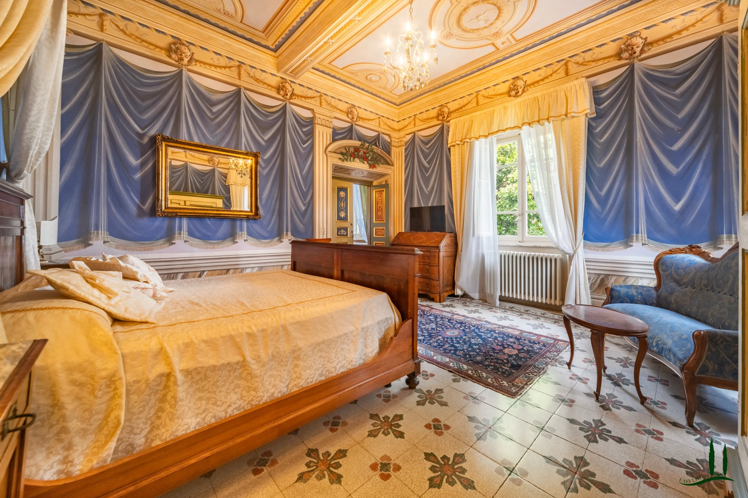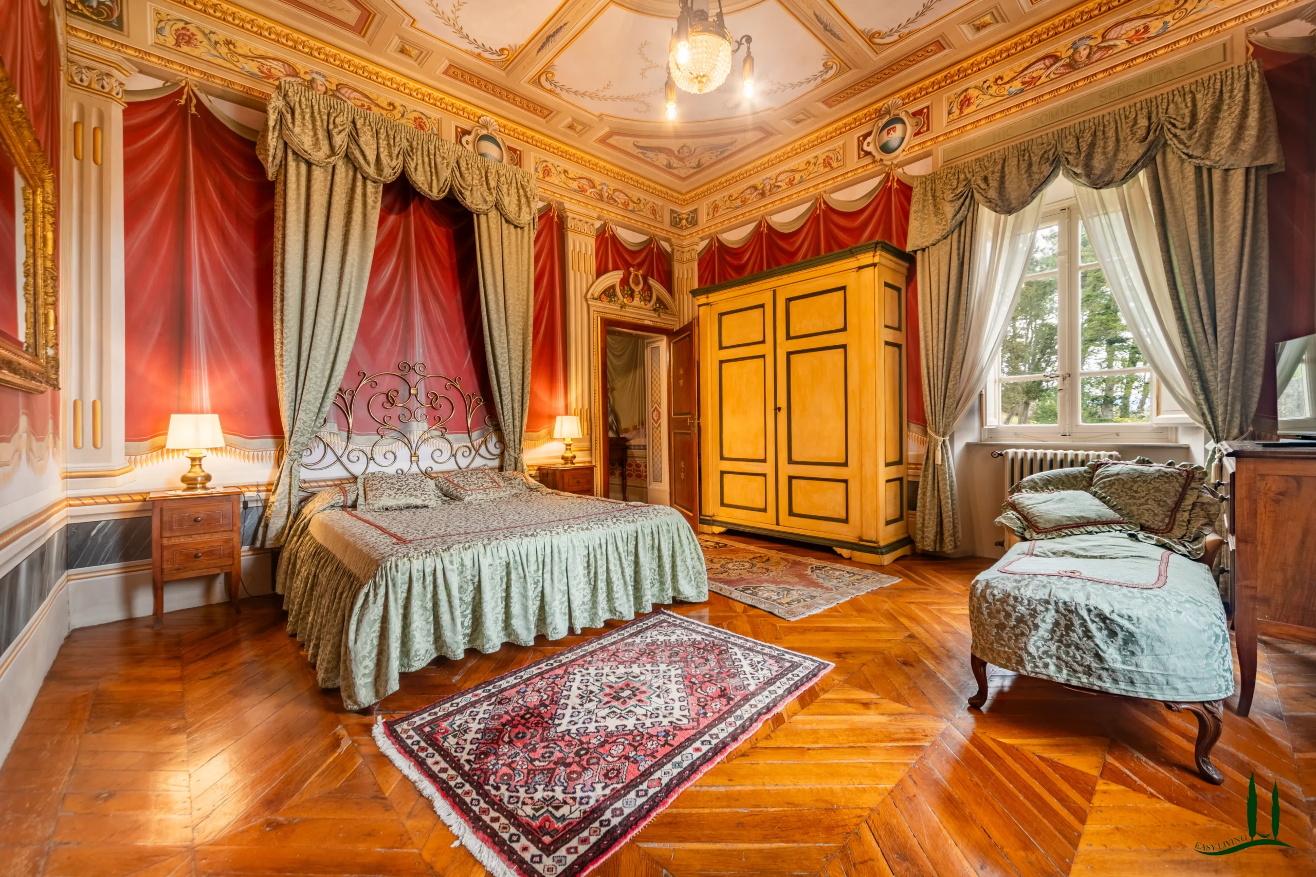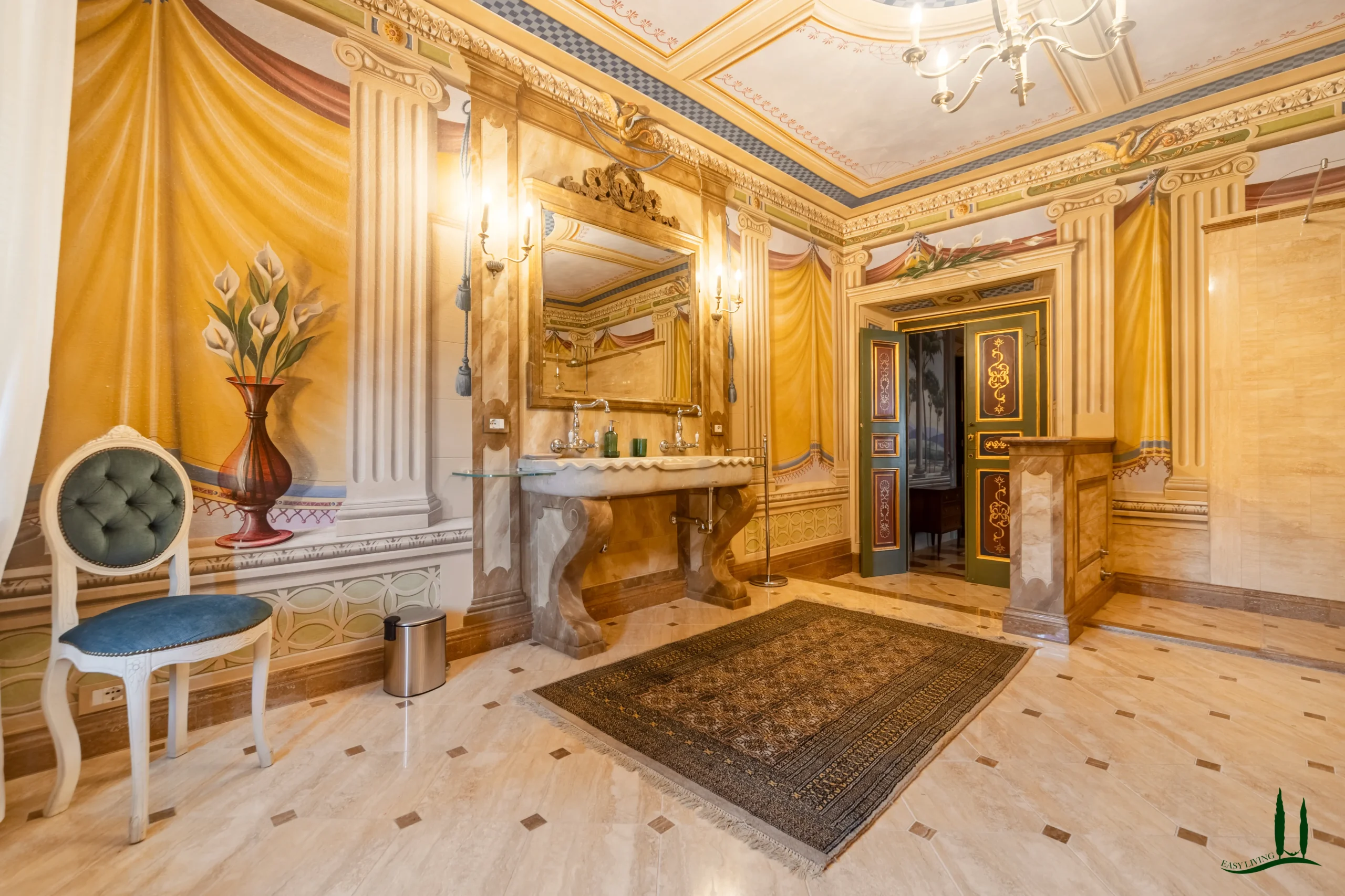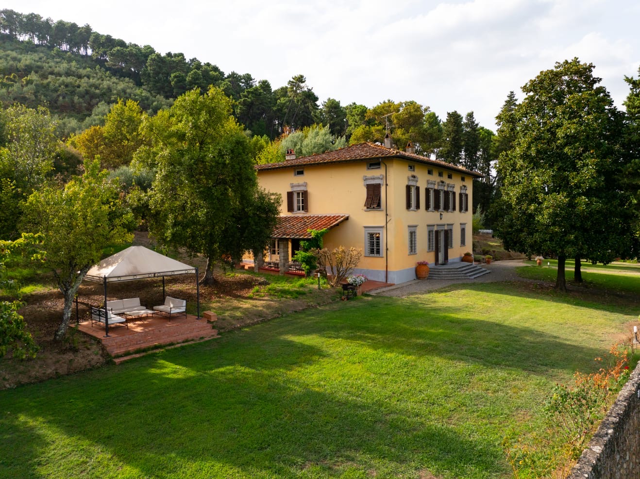 The villa dates back to the 16th century, with its present layout shaped by expansions carried out between the 18th and 19th centuries. Although it passed through the Liberty period in the early 20th century, the building has retained its predominantly 18th-century architectural character. Inside, the style is richly layered: the ground floor reception hall blends Renaissance and Liberty influences, with decorative works attributed to the Lucchese painter Vincenzo Barsotti. On the first floor, a grand salon features trompe-l’œil frescoes depicting the surrounding countryside, including a striking neo-Gothic colonnade inspired by architectural elements once present on the estate. The bedrooms are adorned with painted drapery motifs reminiscent of the Empire style, combined with 16th-century decorative schemes.