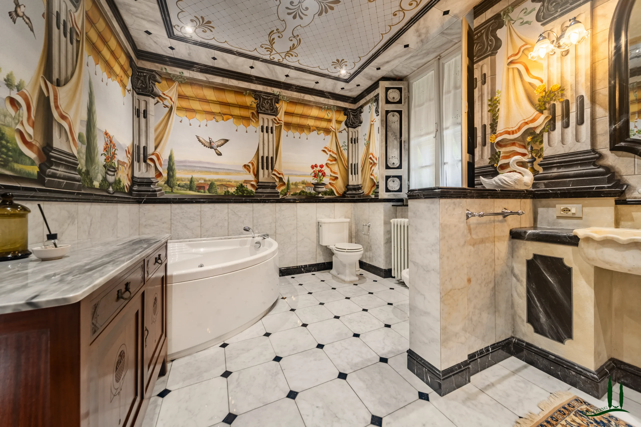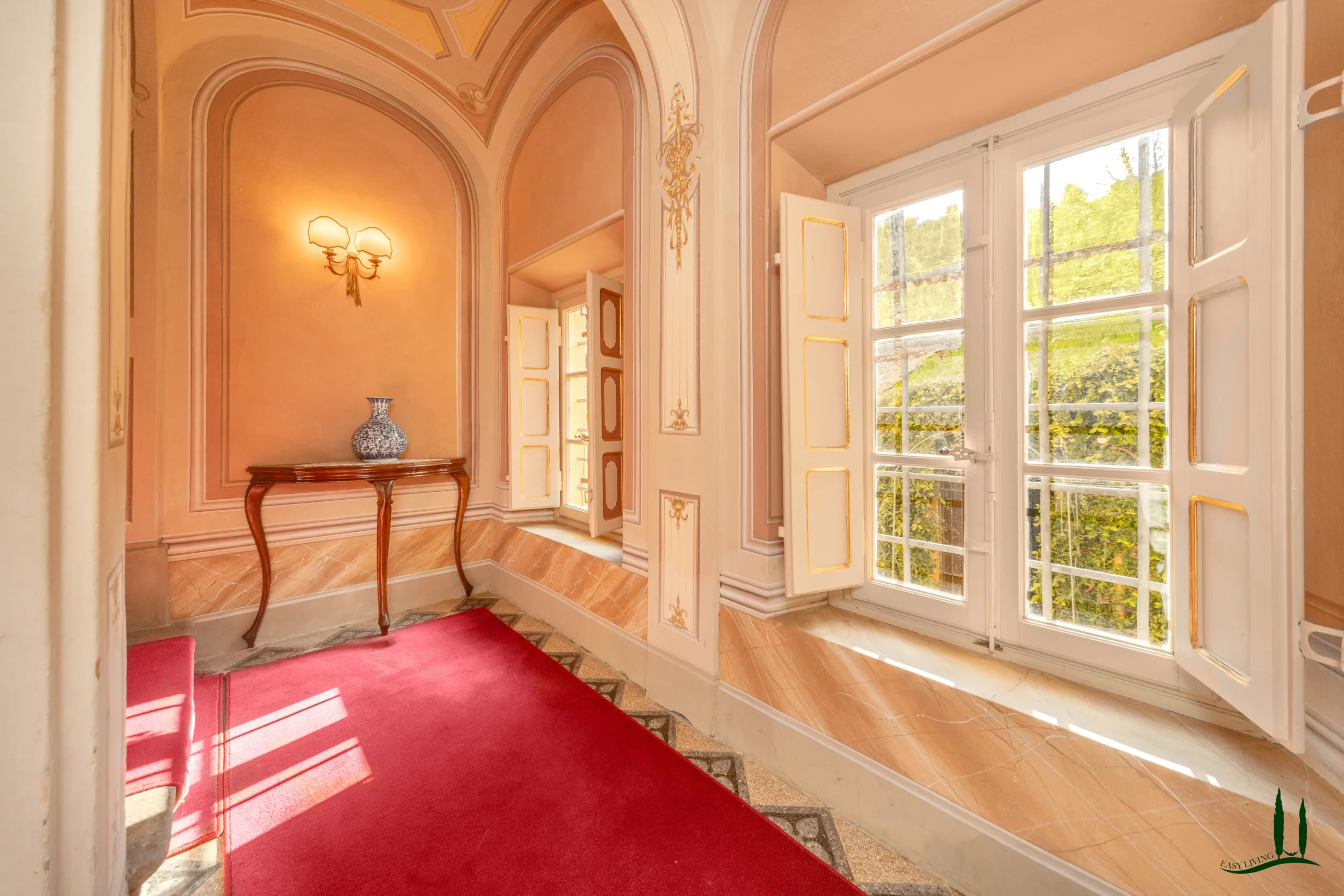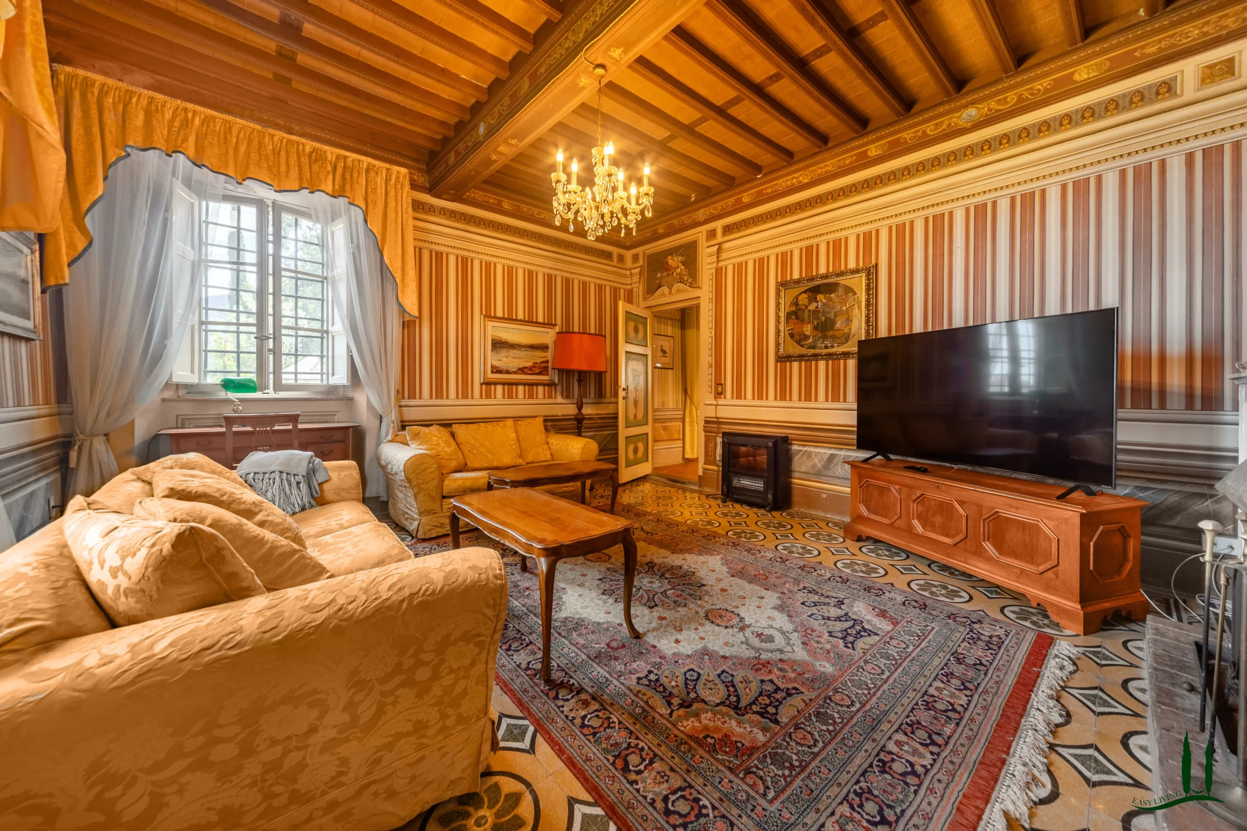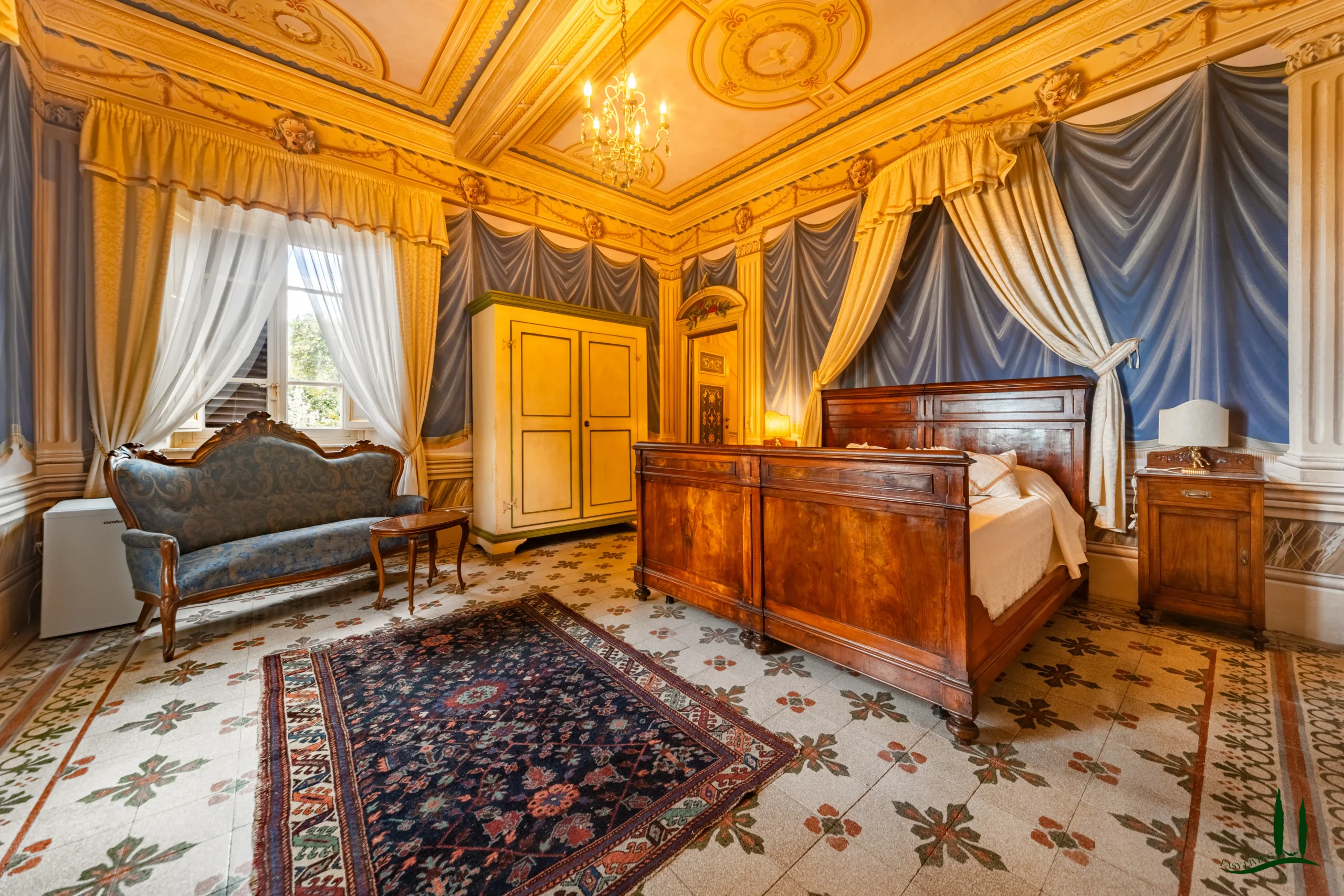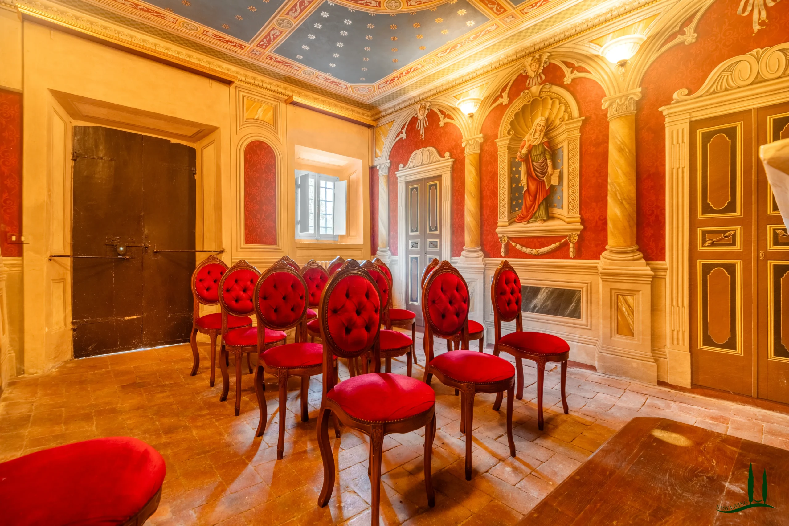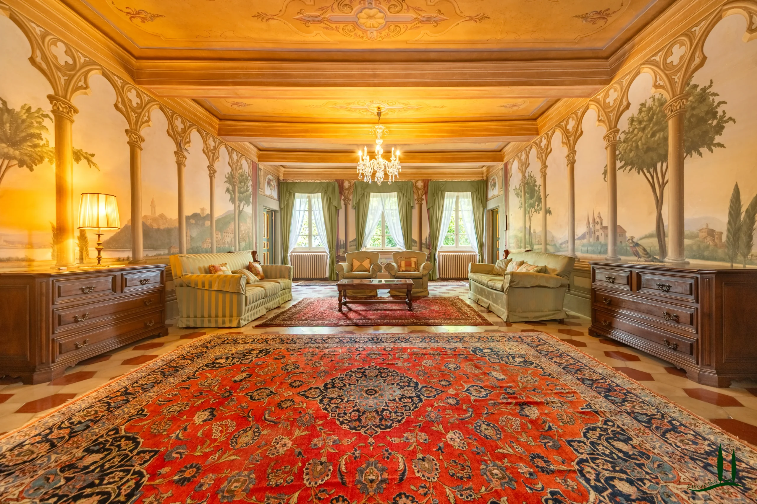 The villa dates back to the 16th century, with its present layout shaped by expansions carried out between the 18th and 19th centuries. Although it passed through the Liberty period in the early 20th century, the building has retained its predominantly 18th-century architectural character. Inside, the style is richly layered: the ground floor reception hall blends Renaissance and Liberty influences, with decorative works attributed to the Lucchese painter Vincenzo Barsotti. On the first floor, a grand salon features trompe-l’œil frescoes depicting the surrounding countryside, including a striking neo-Gothic colonnade inspired by architectural elements once present on the estate. The bedrooms are adorned with painted drapery motifs reminiscent of the Empire style, combined with 16th-century decorative schemes.