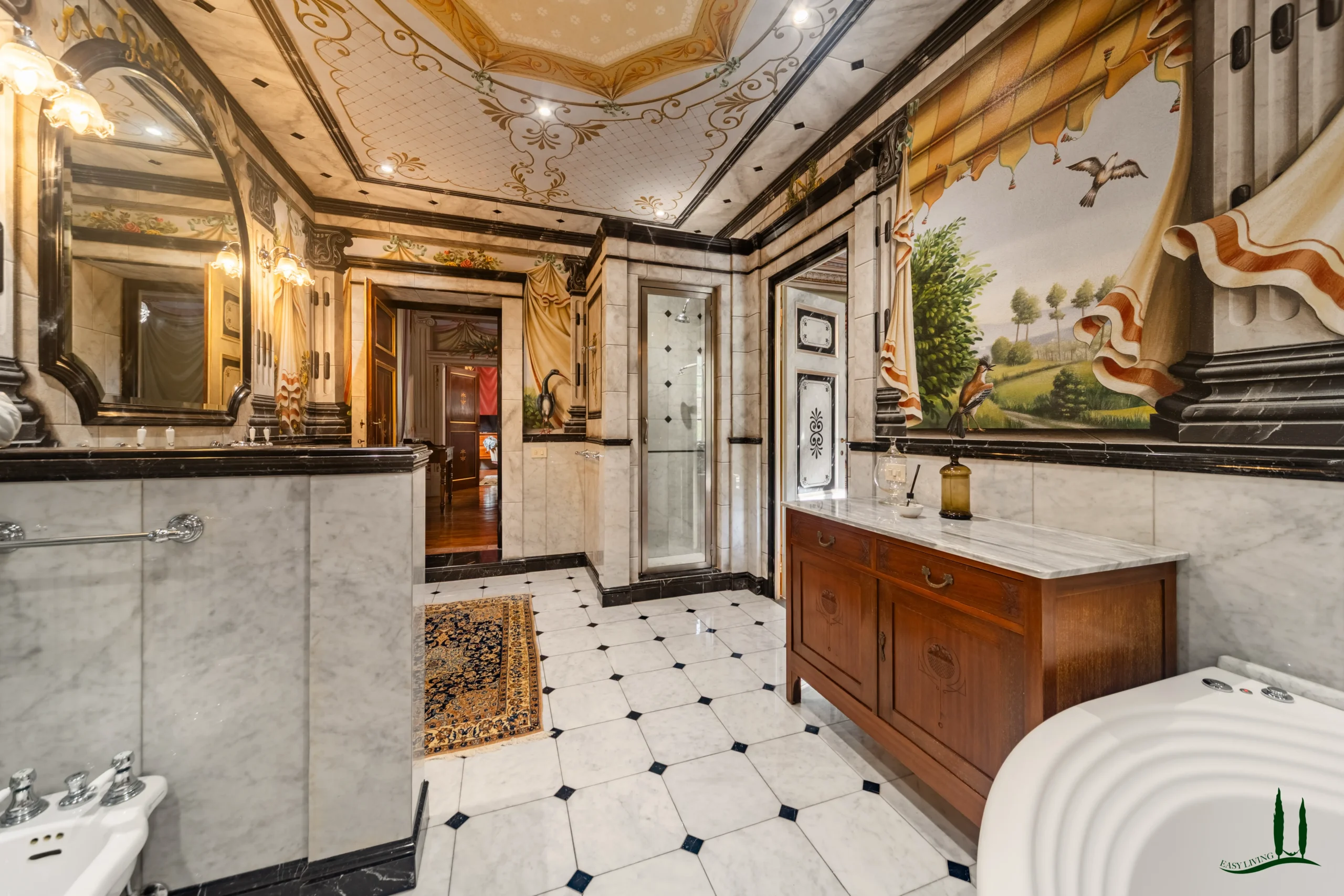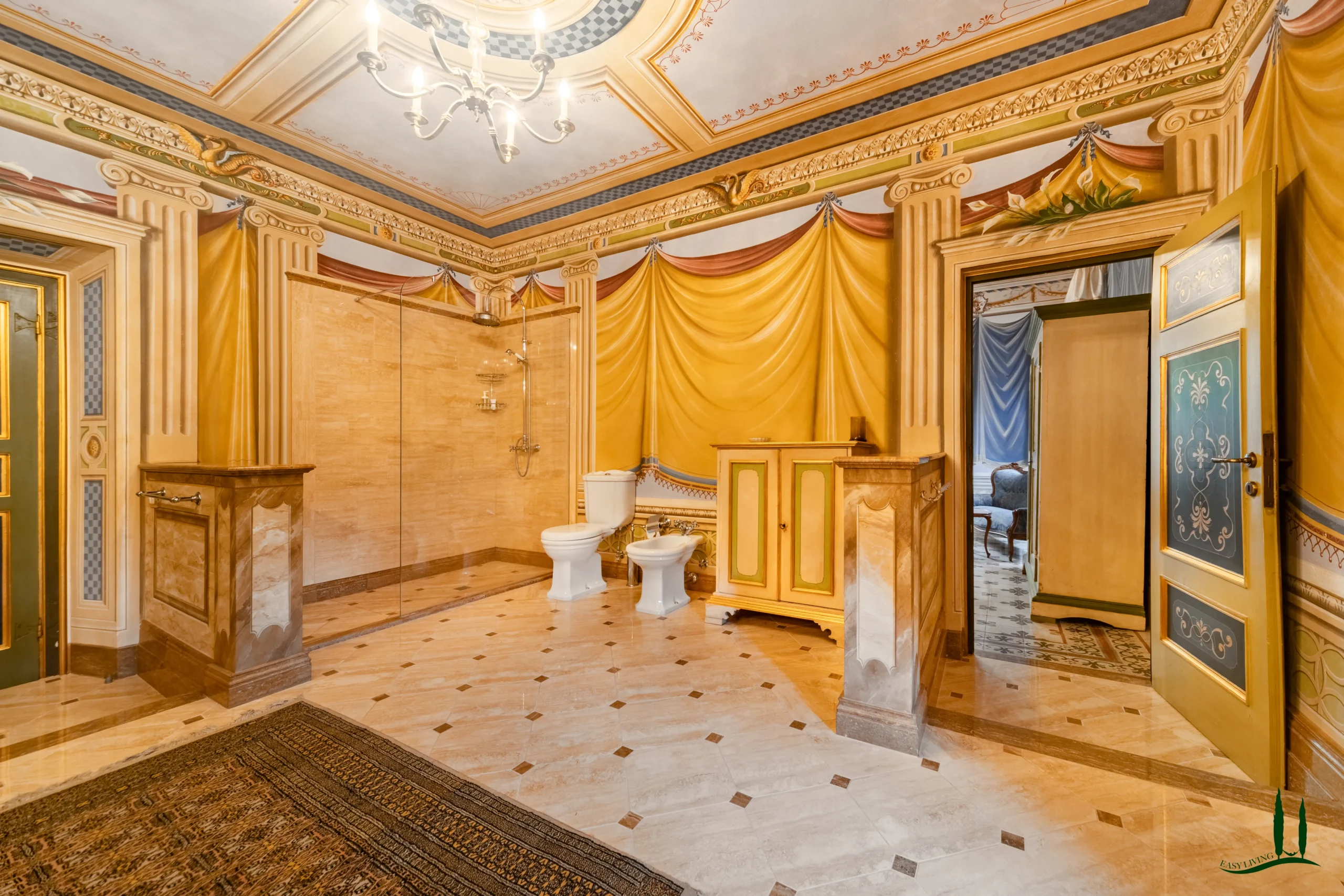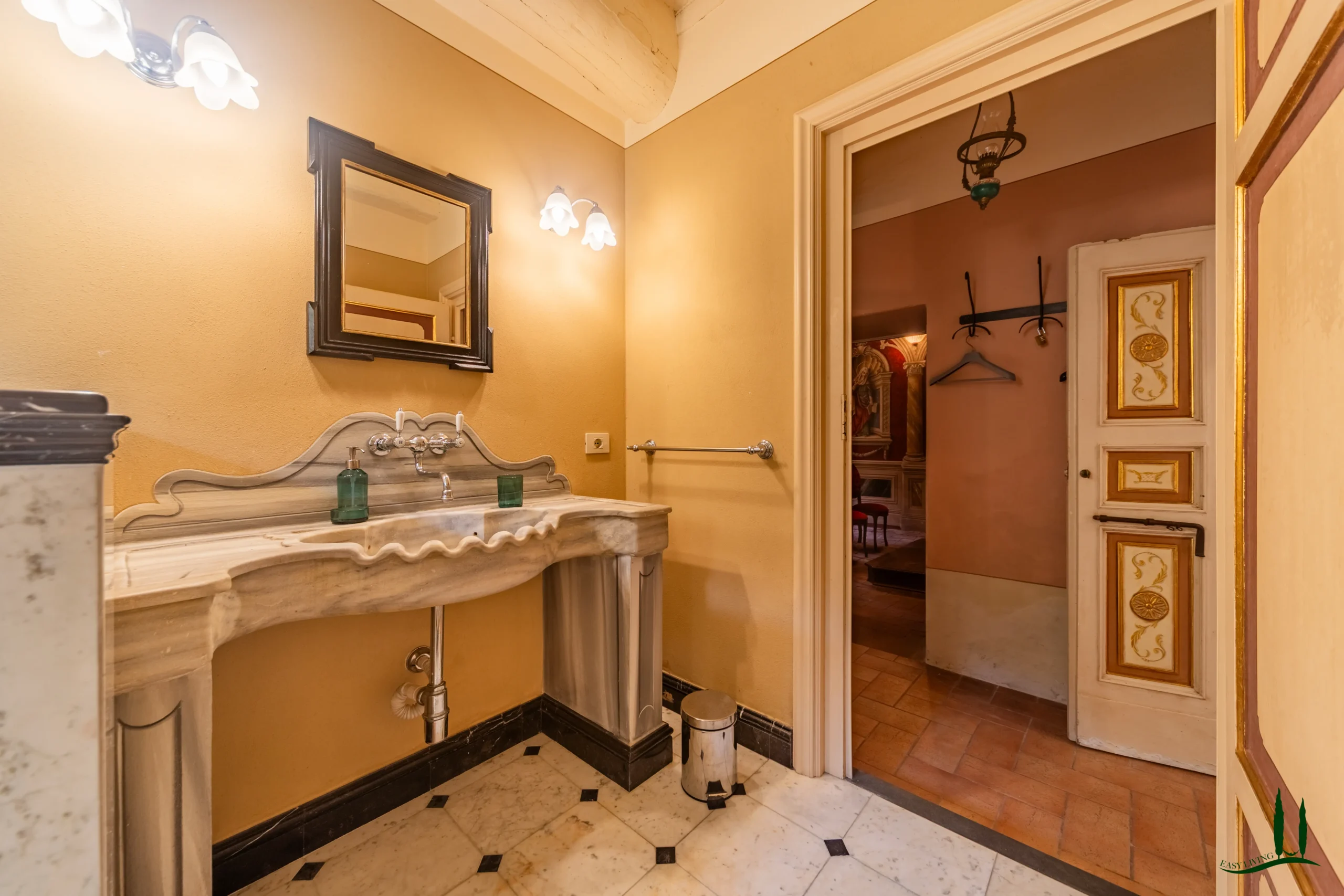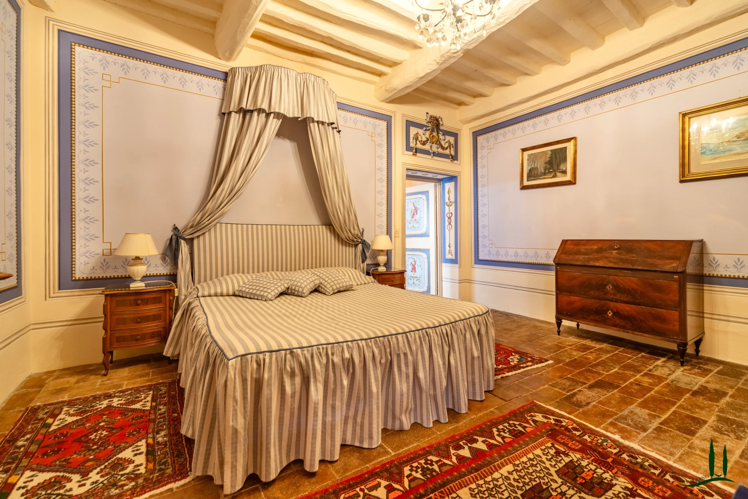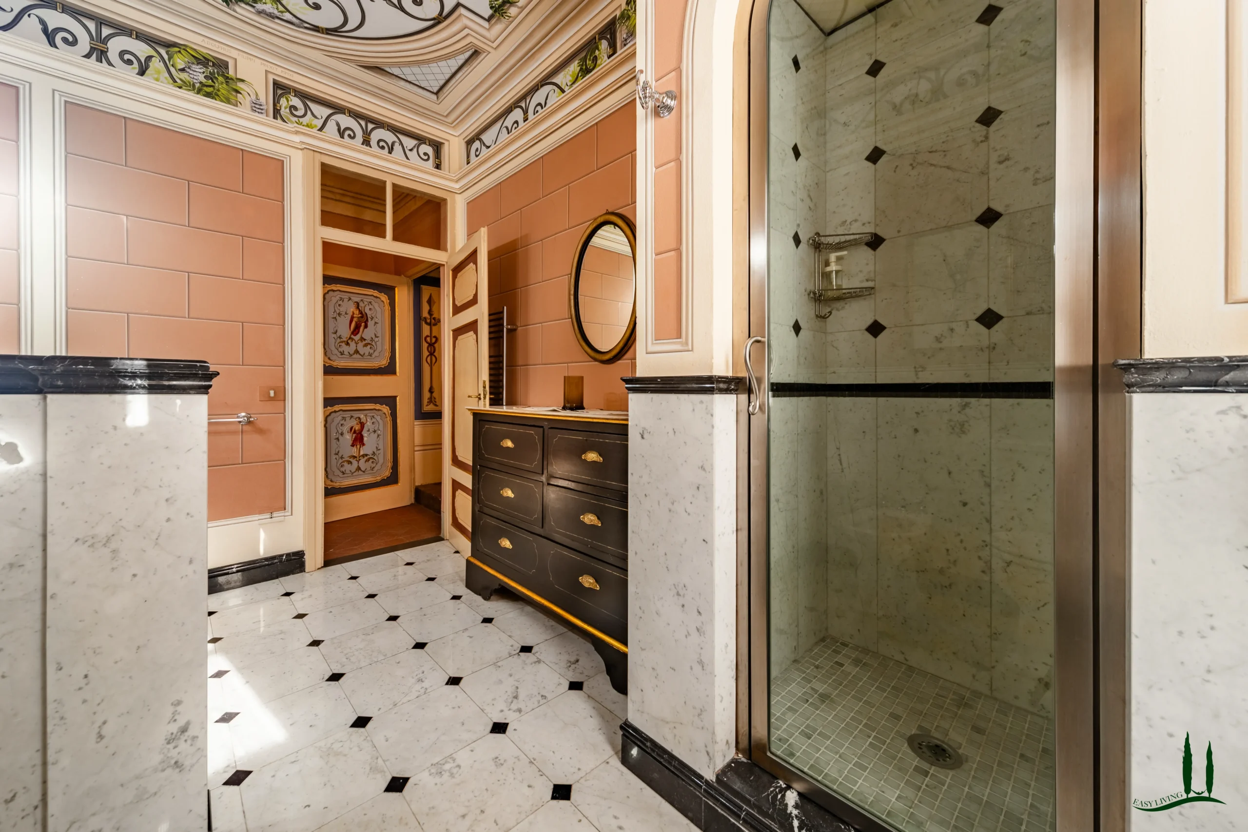 The villa dates back to the 16th century, with its present layout shaped by expansions carried out between the 18th and 19th centuries. Although it passed through the Liberty period in the early 20th century, the building has retained its predominantly 18th-century architectural character. Inside, the style is richly layered: the ground floor reception hall blends Renaissance and Liberty influences, with decorative works attributed to the Lucchese painter Vincenzo Barsotti. On the first floor, a grand salon features trompe-l’œil frescoes depicting the surrounding countryside, including a striking neo-Gothic colonnade inspired by architectural elements once present on the estate. The bedrooms are adorned with painted drapery motifs reminiscent of the Empire style, combined with 16th-century decorative schemes.
