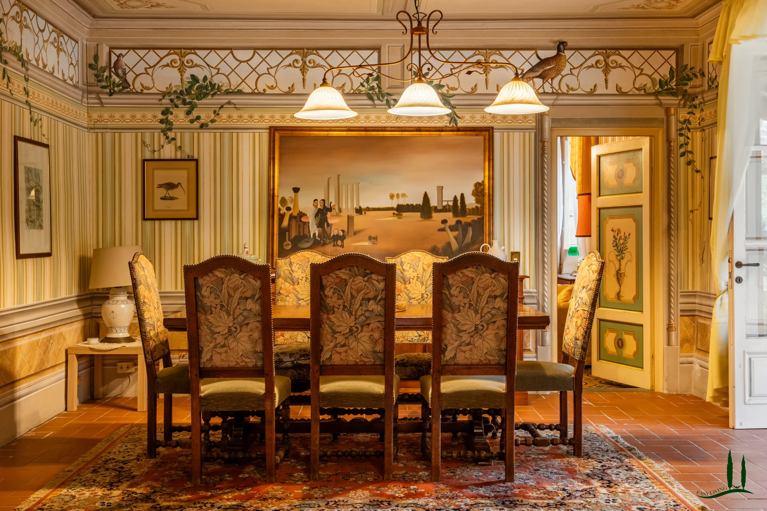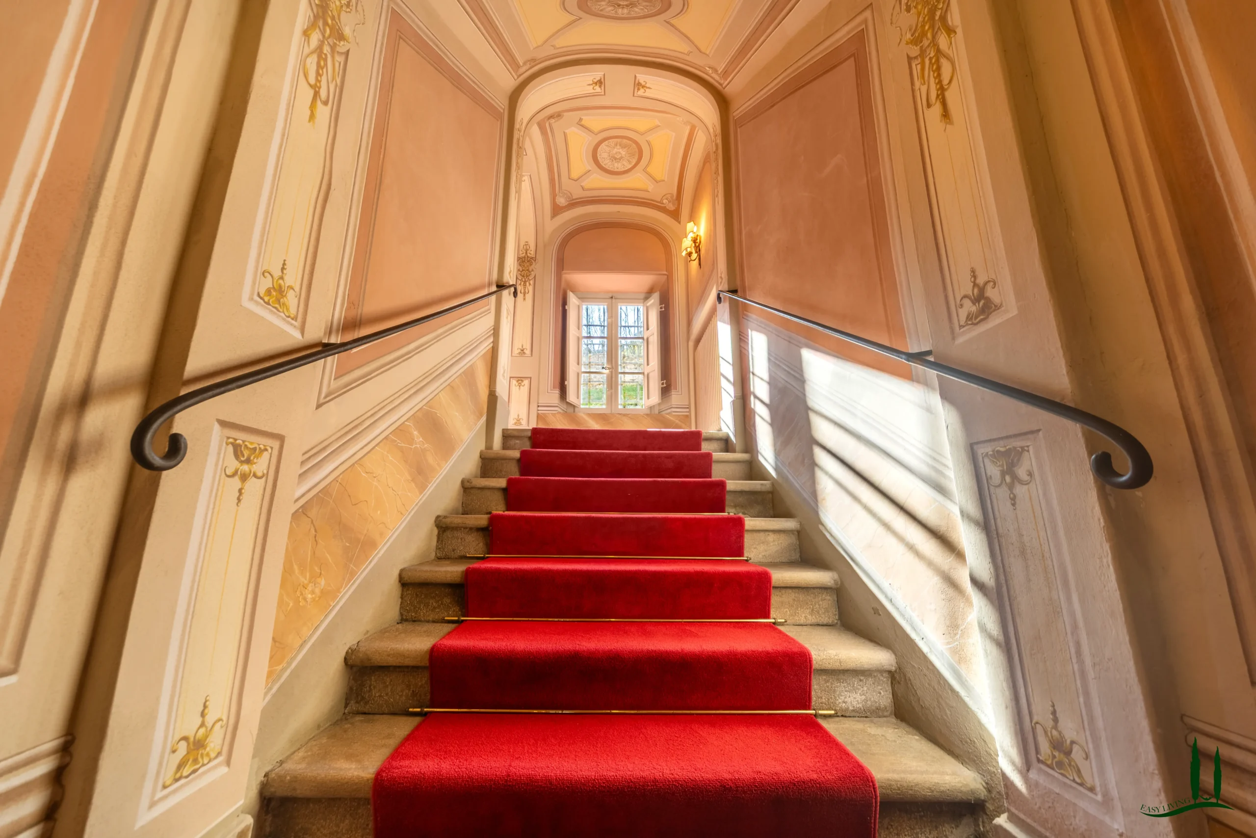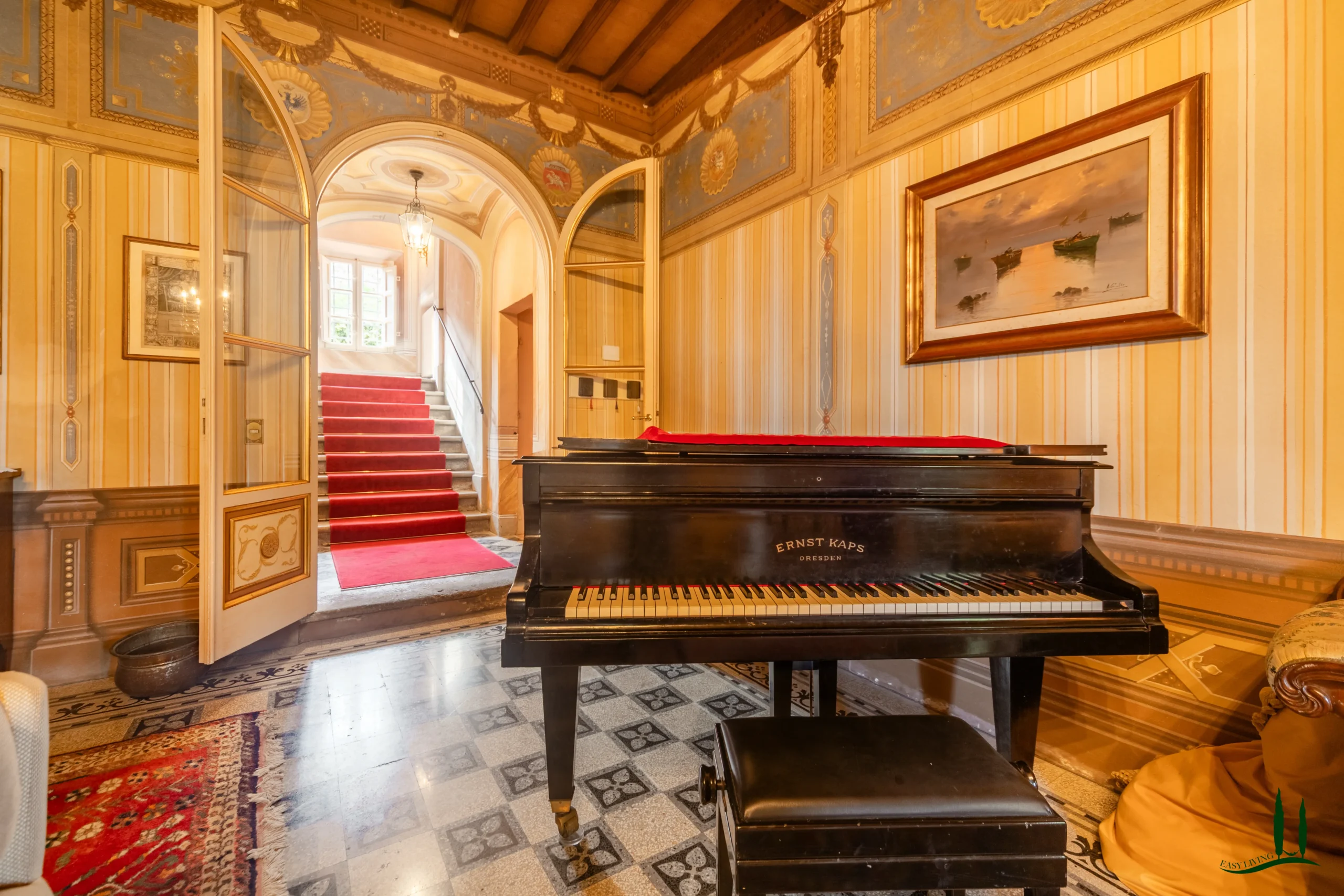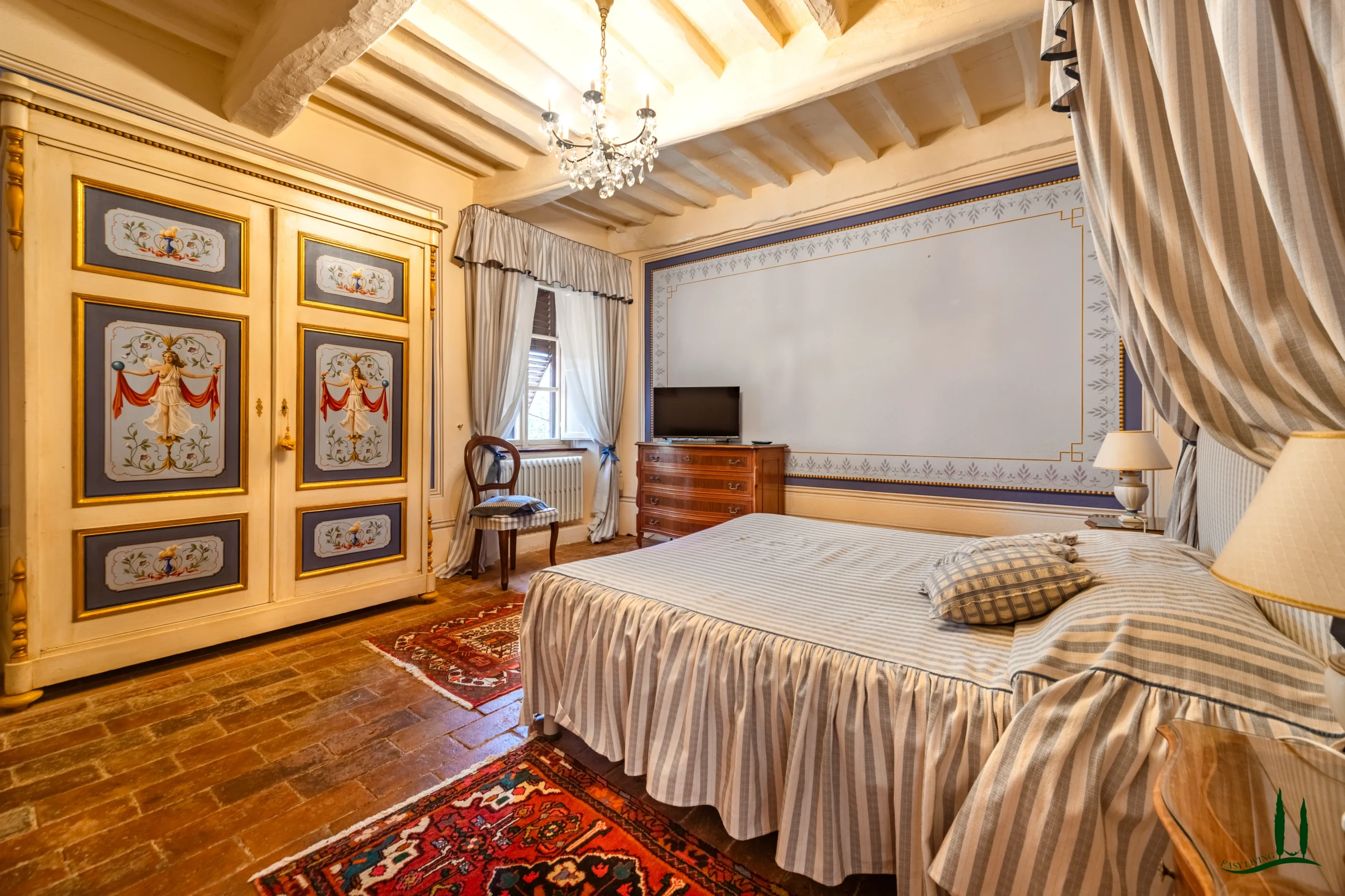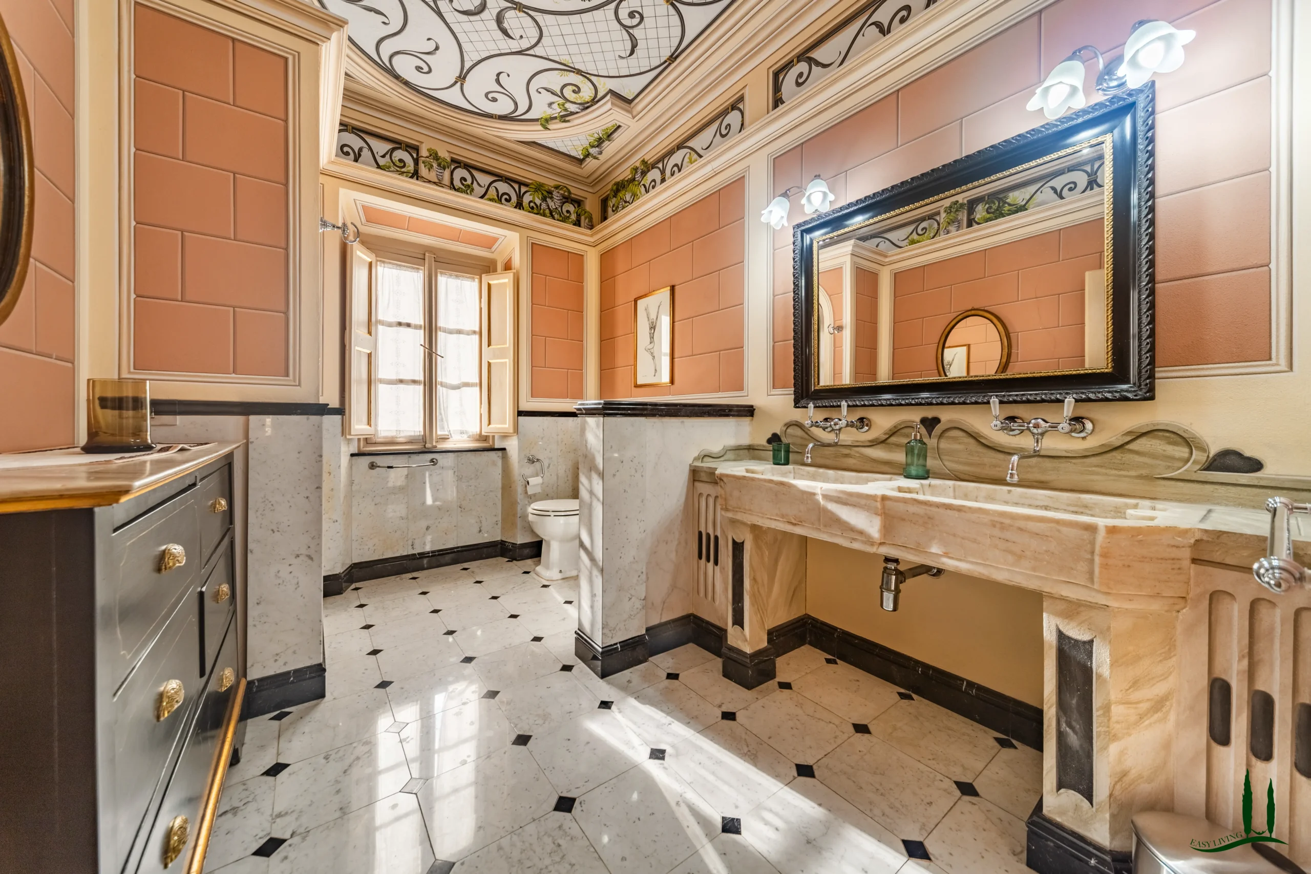 The villa dates back to the 16th century, with its present layout shaped by expansions carried out between the 18th and 19th centuries. Although it passed through the Liberty period in the early 20th century, the building has retained its predominantly 18th-century architectural character. Inside, the style is richly layered: the ground floor reception hall blends Renaissance and Liberty influences, with decorative works attributed to the Lucchese painter Vincenzo Barsotti. On the first floor, a grand salon features trompe-l’œil frescoes depicting the surrounding countryside, including a striking neo-Gothic colonnade inspired by architectural elements once present on the estate. The bedrooms are adorned with painted drapery motifs reminiscent of the Empire style, combined with 16th-century decorative schemes.