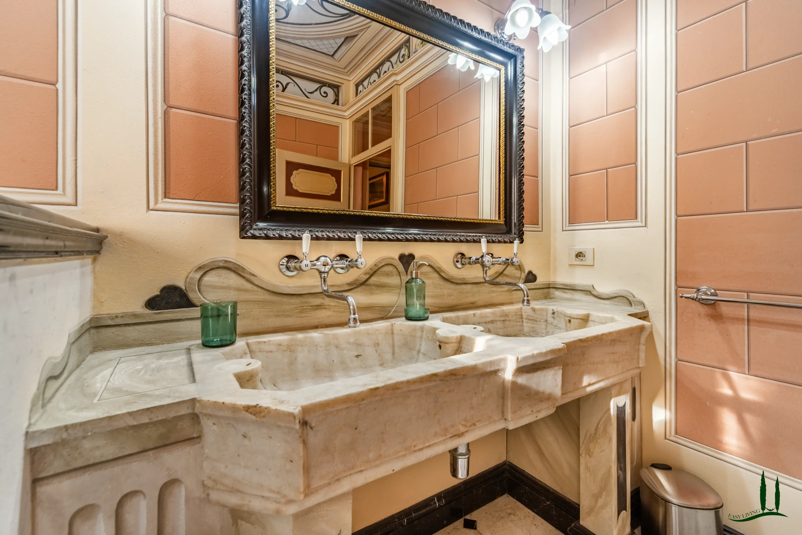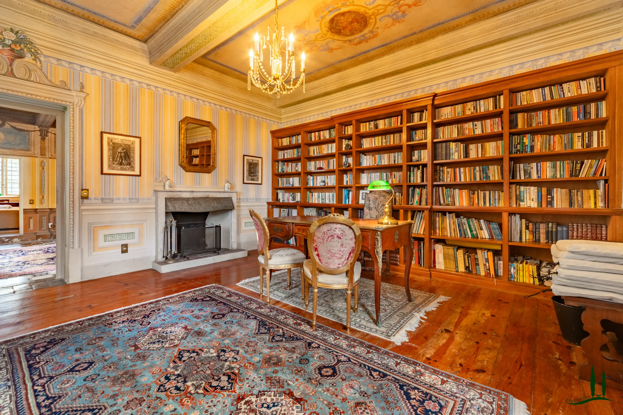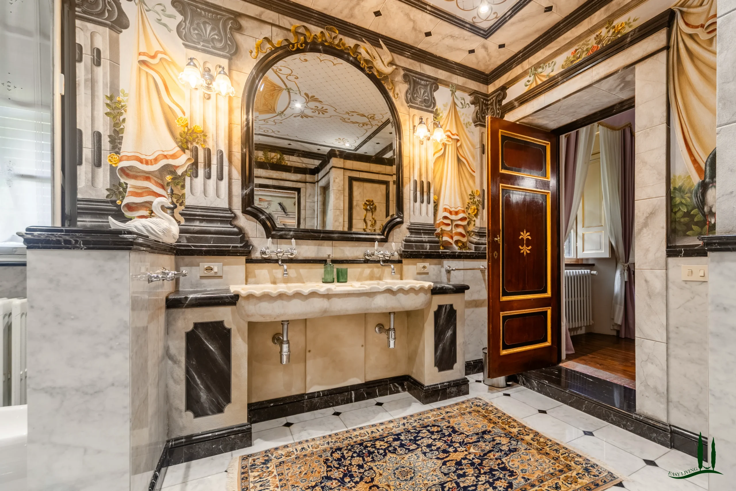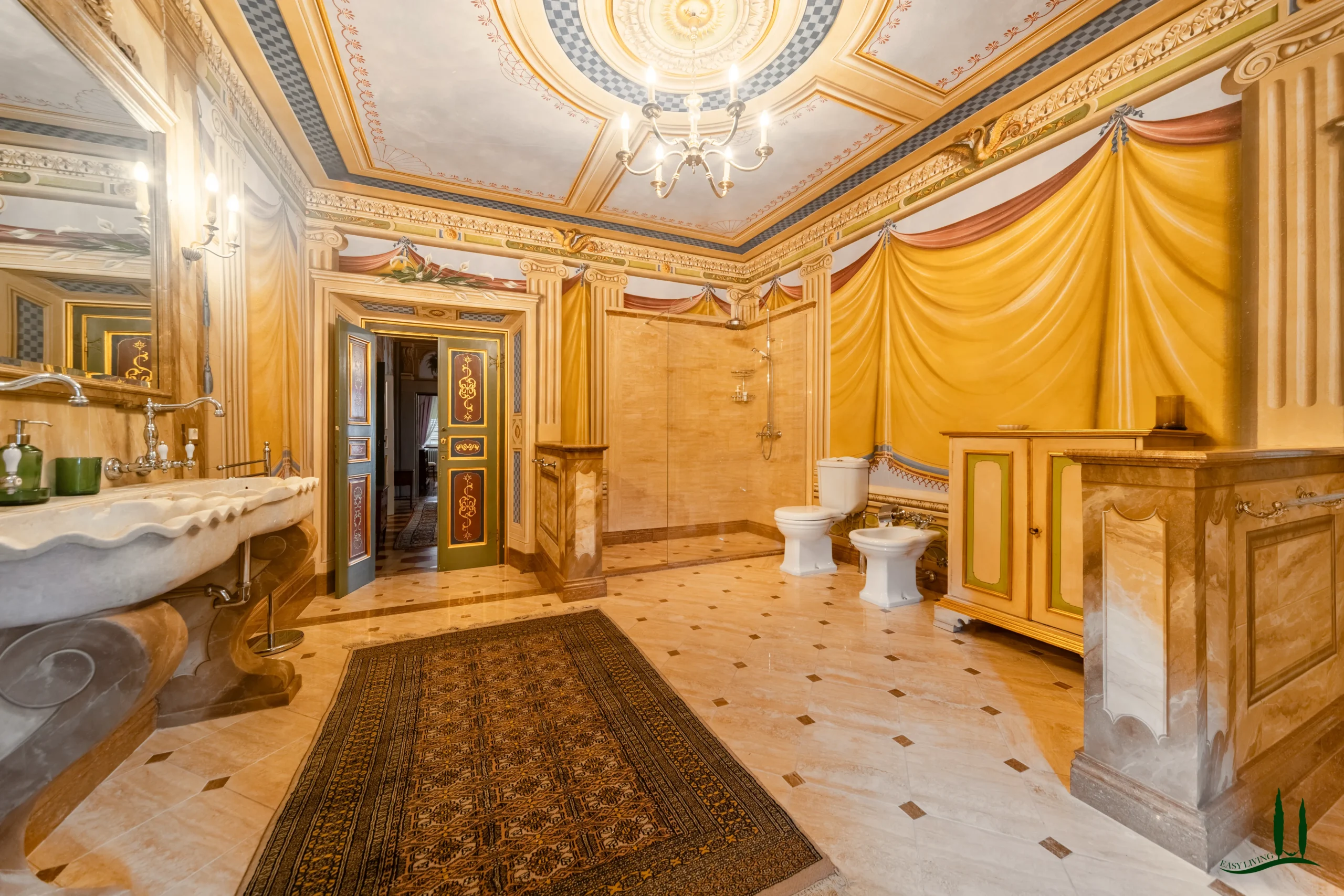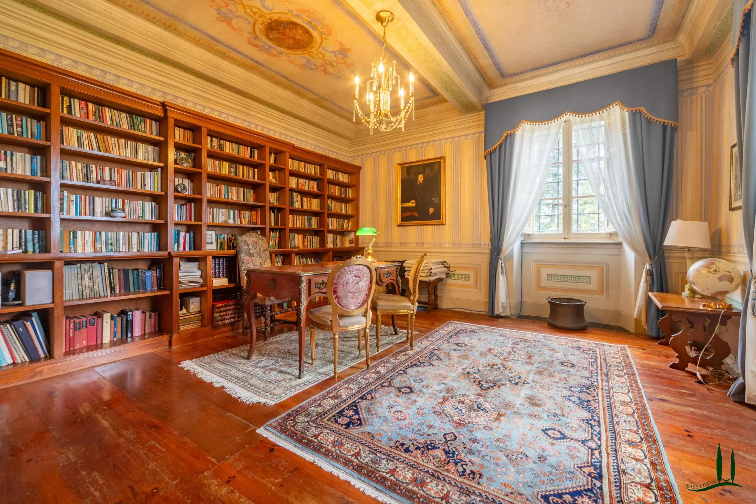 The villa dates back to the 16th century, with its present layout shaped by expansions carried out between the 18th and 19th centuries. Although it passed through the Liberty period in the early 20th century, the building has retained its predominantly 18th-century architectural character. Inside, the style is richly layered: the ground floor reception hall blends Renaissance and Liberty influences, with decorative works attributed to the Lucchese painter Vincenzo Barsotti. On the first floor, a grand salon features trompe-l’œil frescoes depicting the surrounding countryside, including a striking neo-Gothic colonnade inspired by architectural elements once present on the estate. The bedrooms are adorned with painted drapery motifs reminiscent of the Empire style, combined with 16th-century decorative schemes.