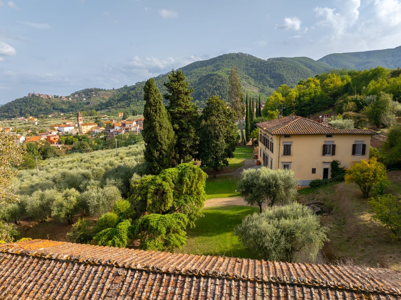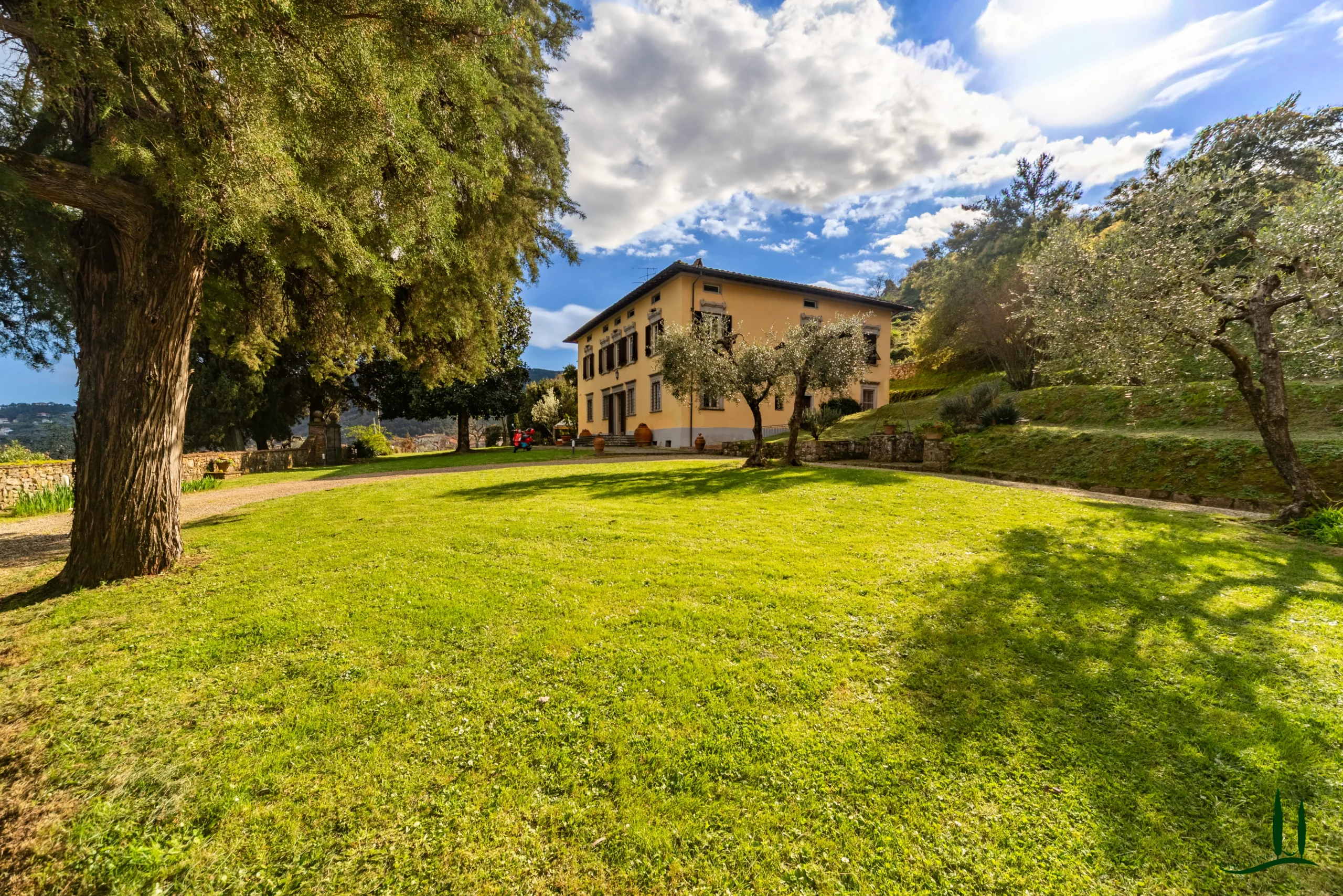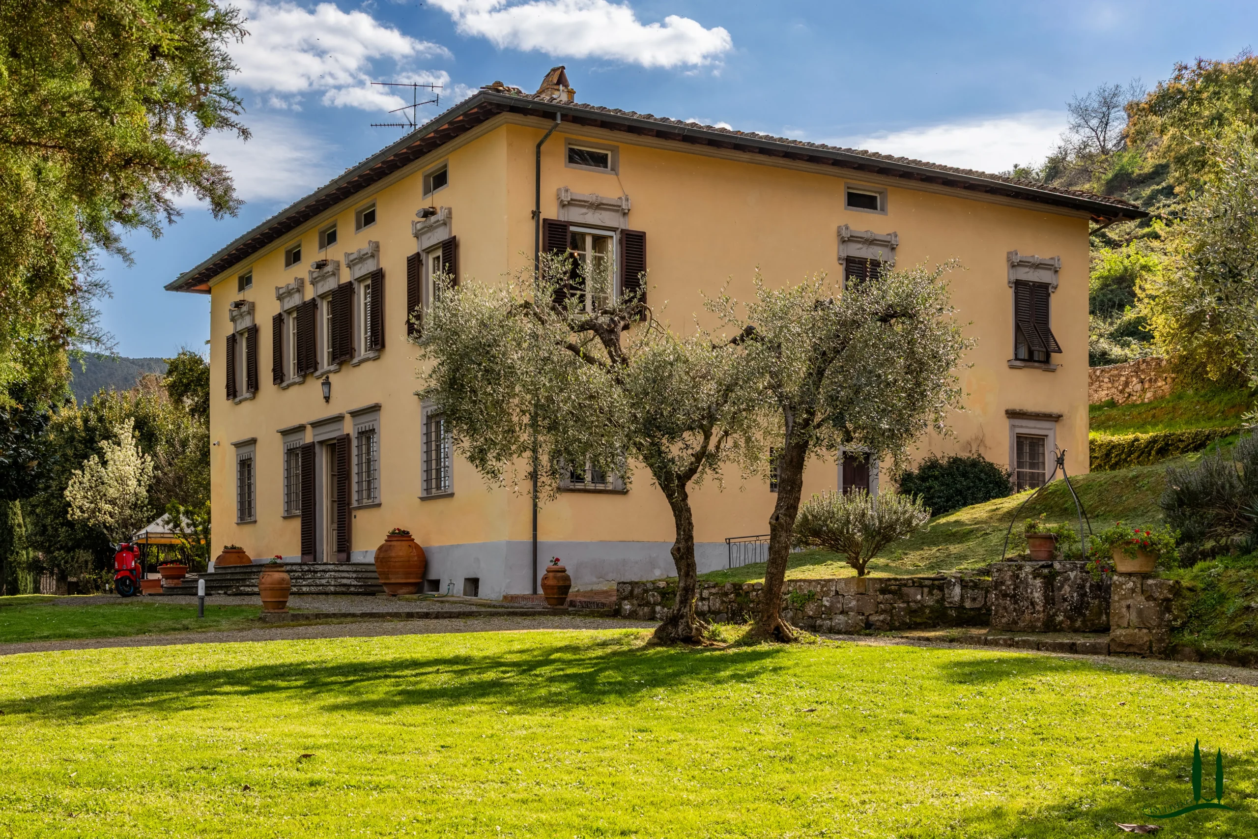 Nestled among the rolling hills south of Lucca, in a commanding panoramic position yet just a short distance from a charming village, this exquisite period villa embodies a rare blend of historic elegance and the tranquil beauty of the Tuscan countryside. Surrounded by a beautifully maintained park dotted with olive trees, the property offers enchanting views and an atmosphere of timeless charm.