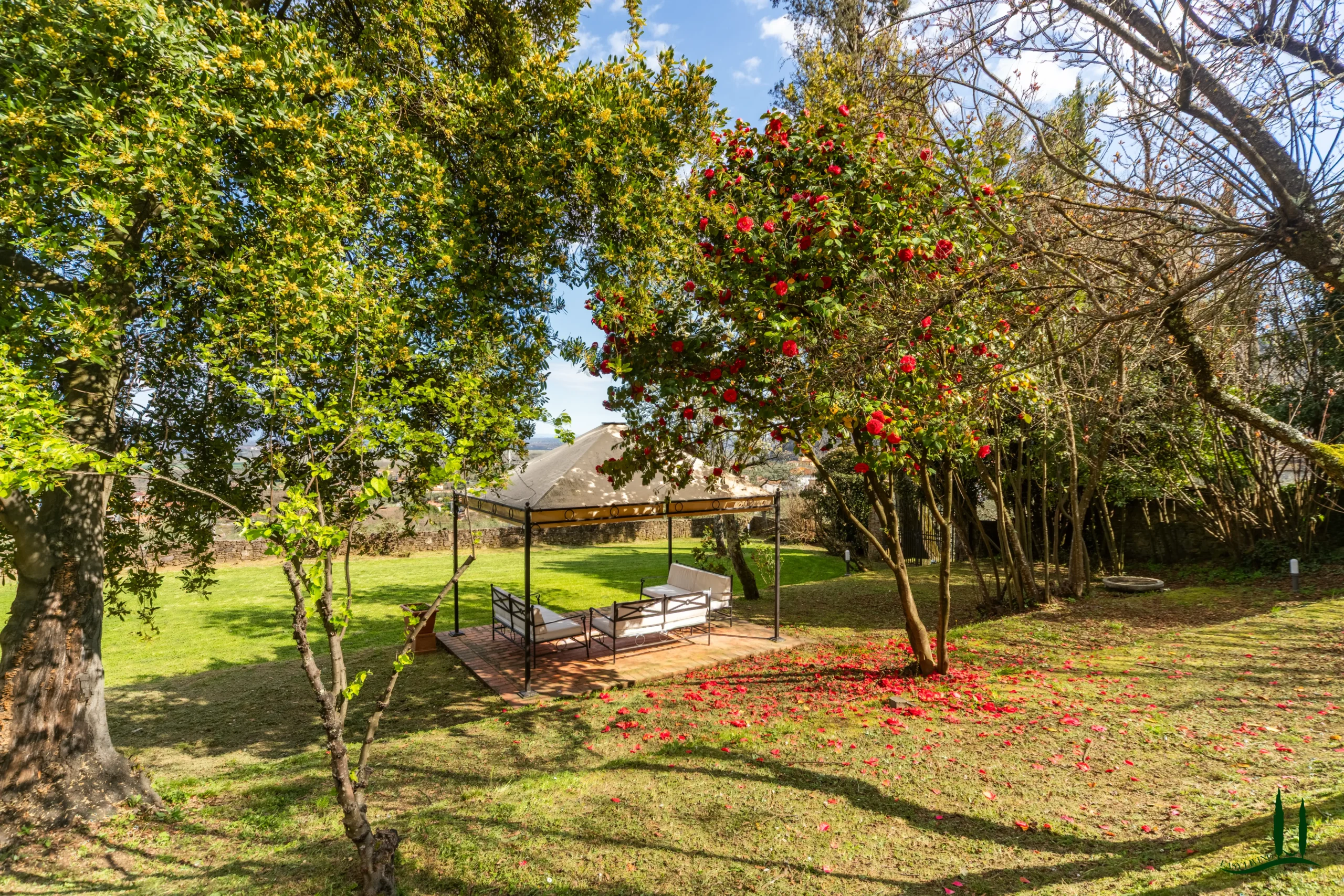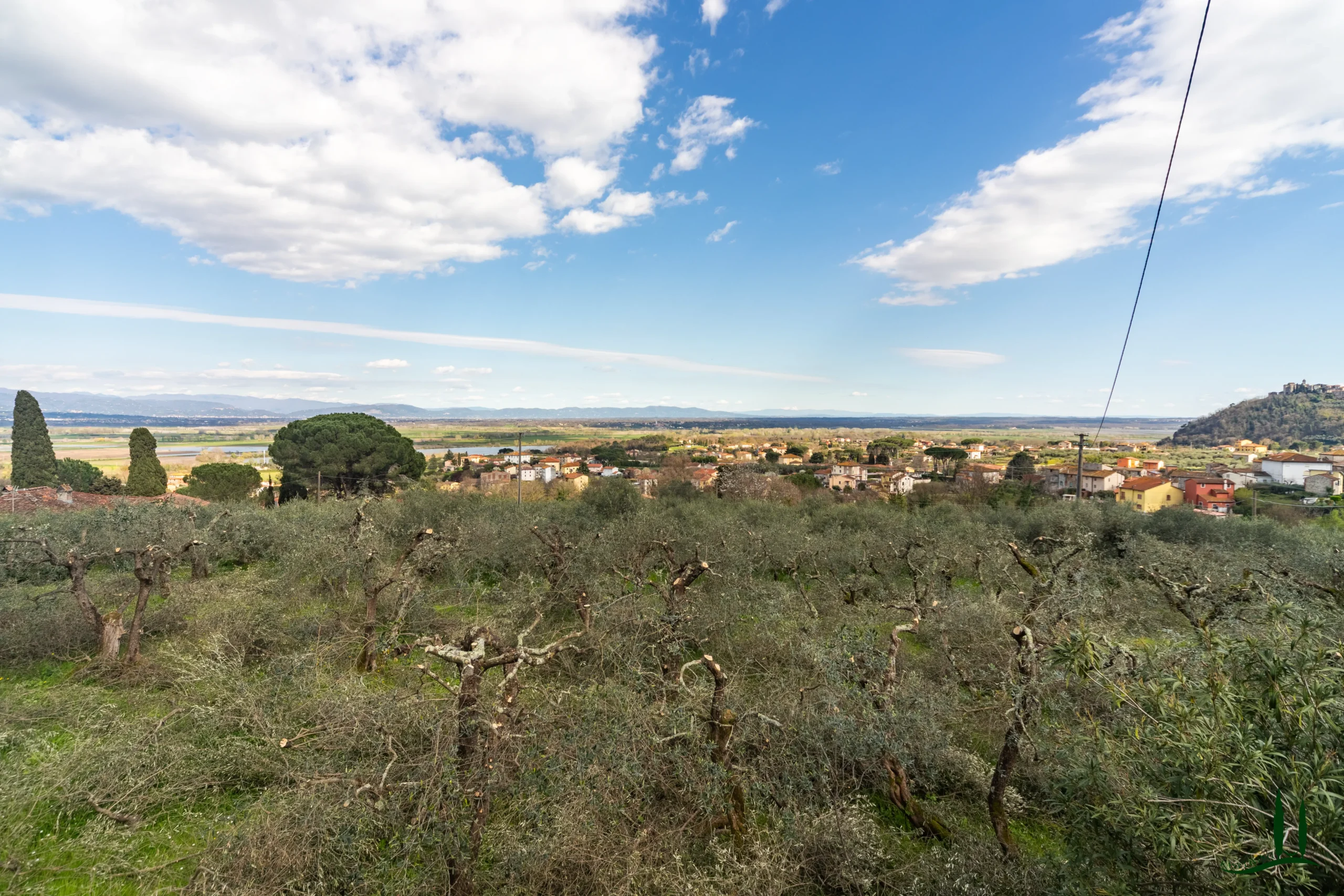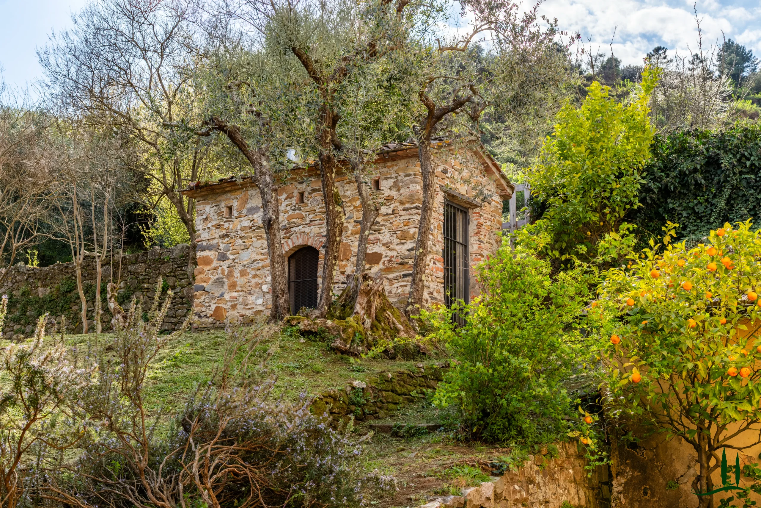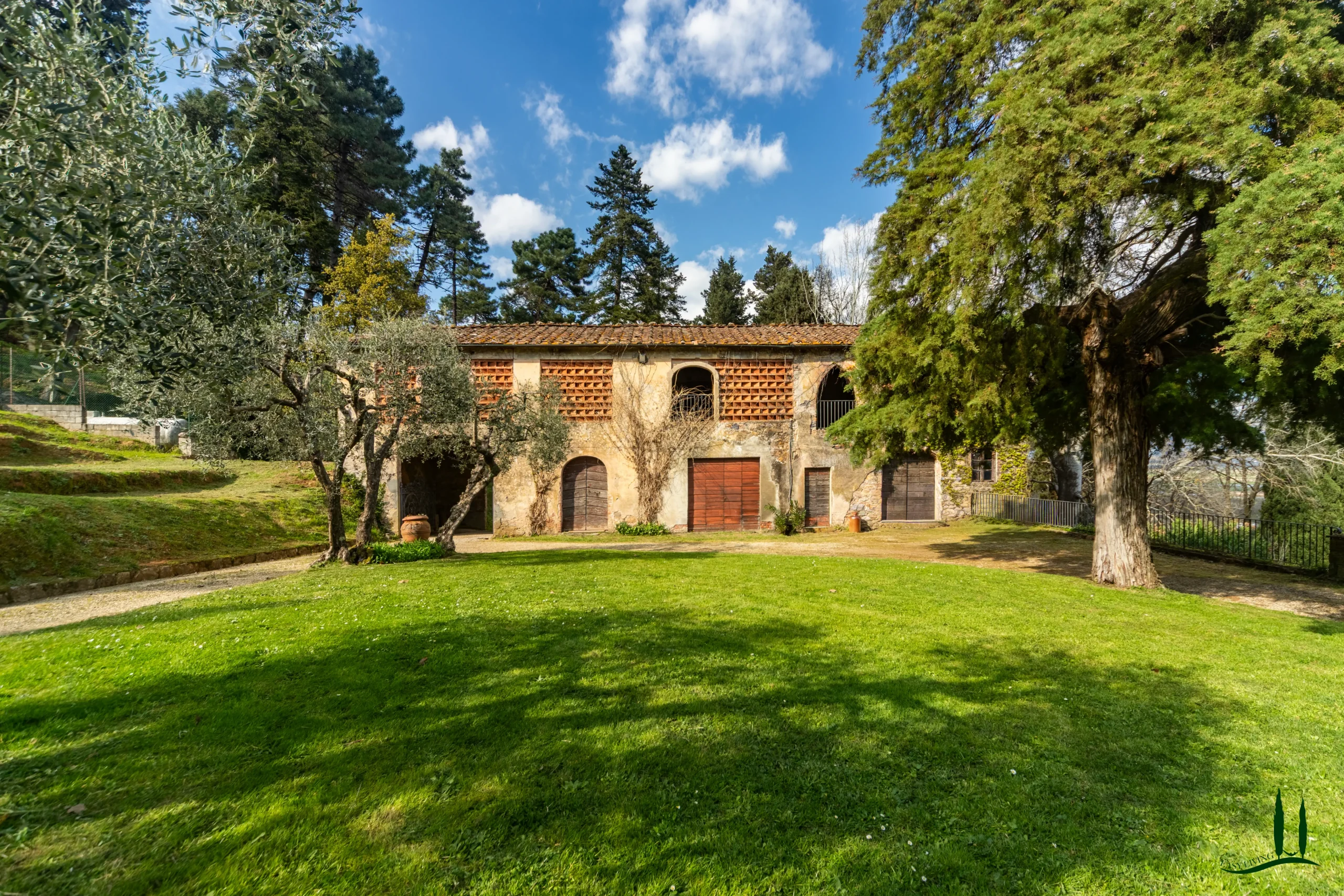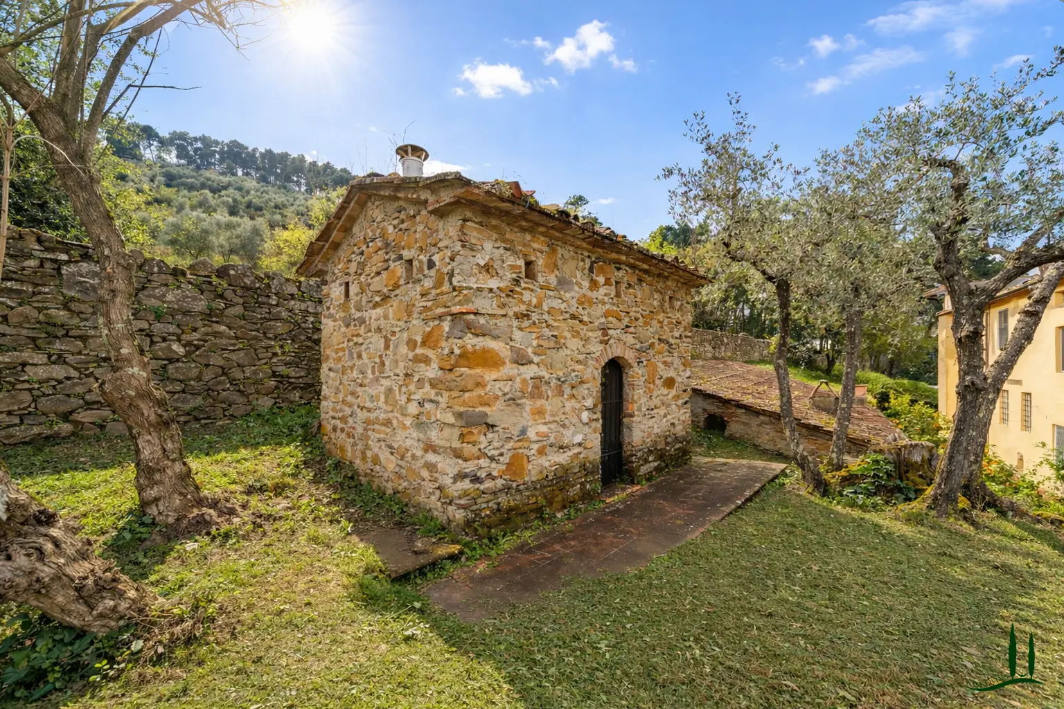 Behind the villa lies a small outbuilding (approx. 25 sqm) with a traditional oven, entirely in need of renovation but ideal as a summer kitchen. At the entrance to the estate, above the historic driveway that follows the line of the original carriage road, stands a large rustic building (approx. 245 sqm) constructed in stone and brick, also to be restored and perfectly suited for conversion into a guesthouse. Adjacent to it is a ruin of approximately 70 sqm, offering additional development potential.
