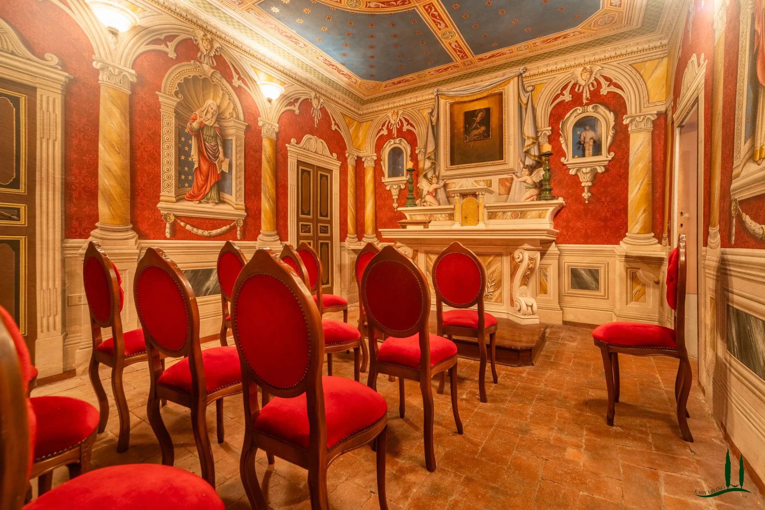 Every detail seen today is the result of a careful and scholarly restoration. Layers of plaster applied in the mid-20th century had concealed and damaged the original decorations; their removal revealed a hidden treasure. Despite the deterioration, the imagery was partially preserved and has been skillfully reintegrated through meticulous research into historical materials and pigments.