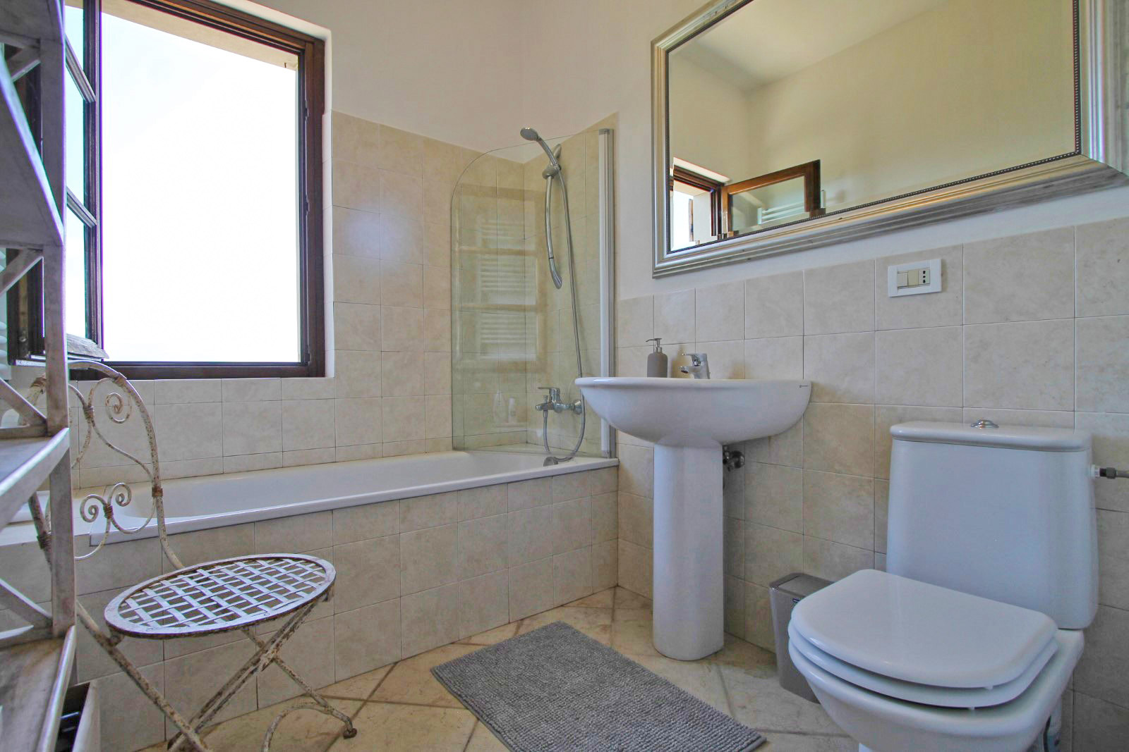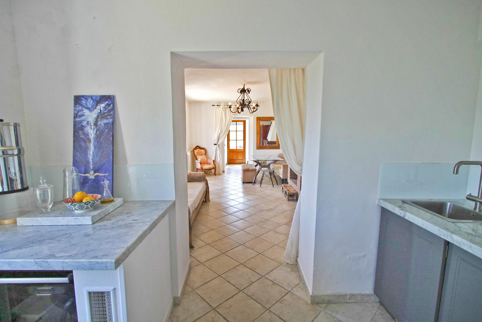 Inside, the home is designed with an open-plan main reception room featuring a cozy fireplace and dining area, all leading seamlessly through patio doors to the first of three large terraces. With stunning views from every angle, you’ll feel immersed in the beauty of Agnino as you unwind or entertain guests. The kitchen, complete with Bosch appliances and a Carrara marble countertop, is both stylish and functional, with a hot water tap, dishwasher, washing machine, and hob for added convenience.