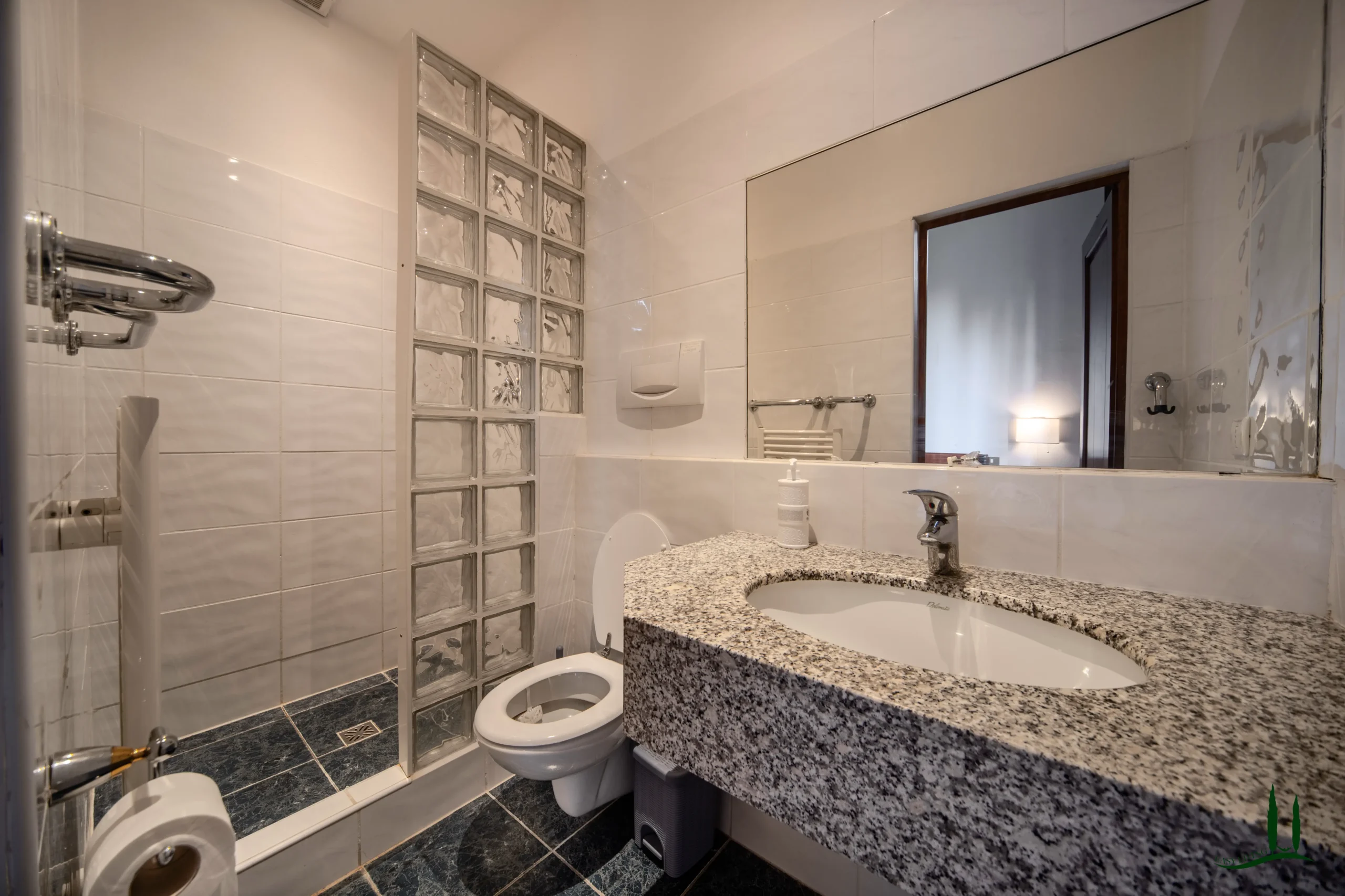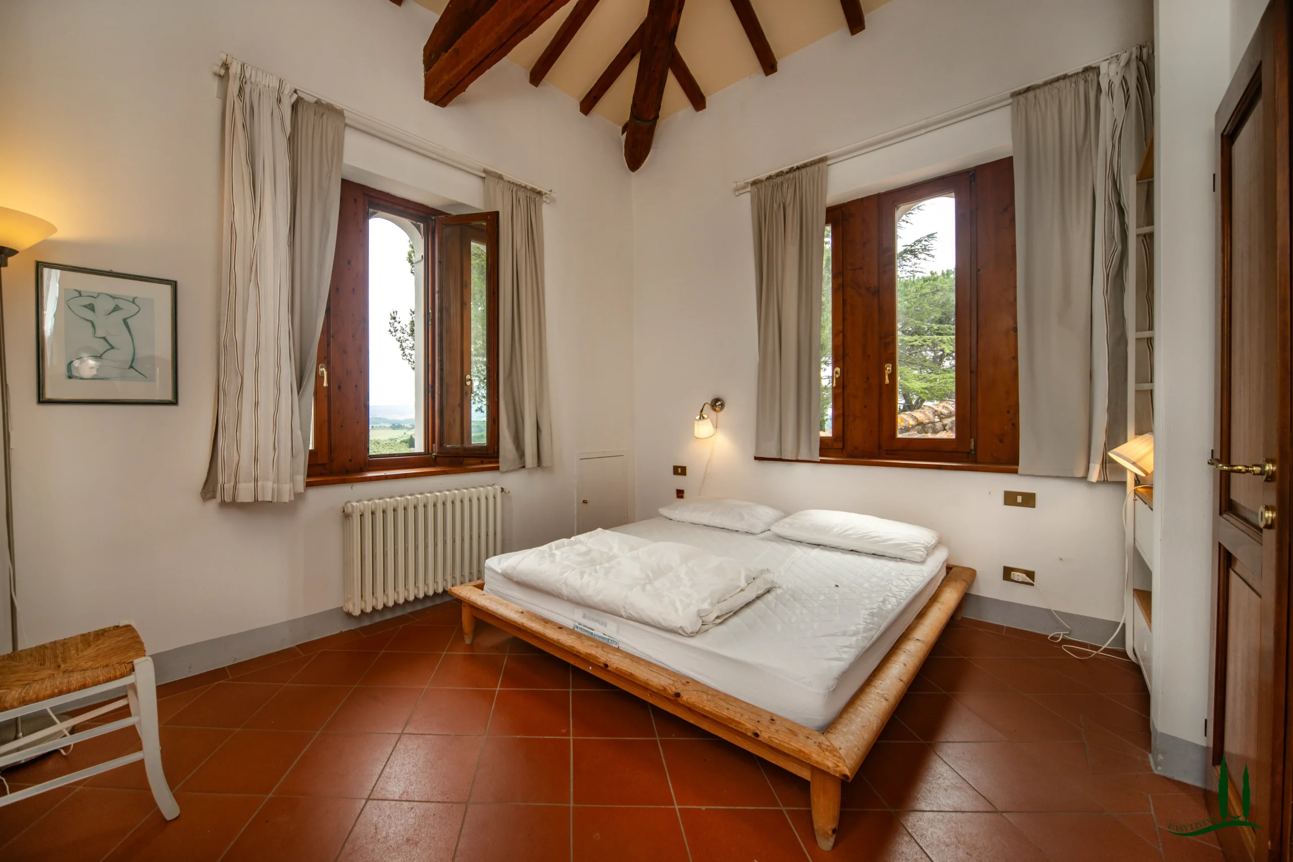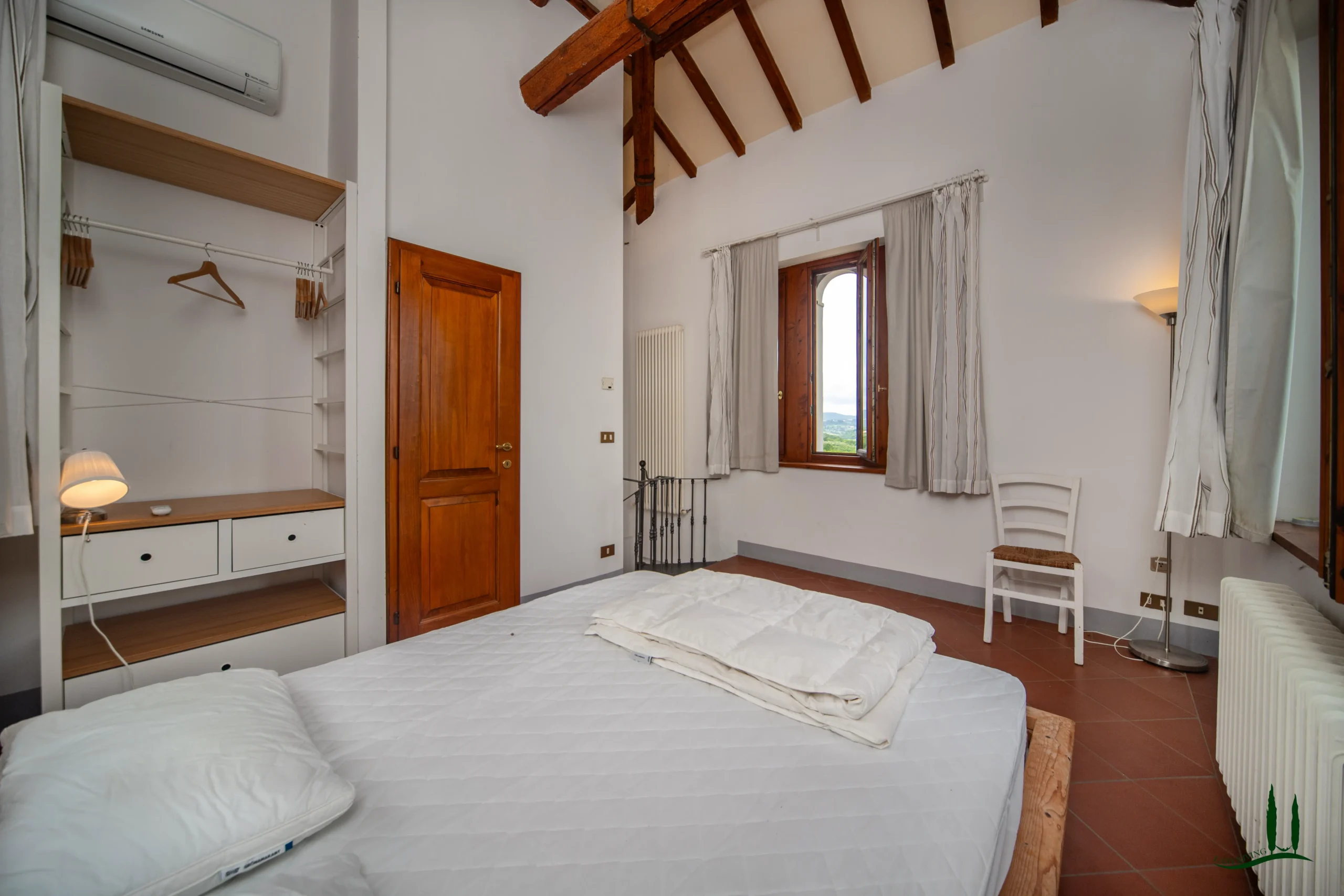 Upstairs, you’ll find eight beautifully appointed bedrooms, each with ensuite bathrooms. A long hallway leads to a spectacular terrace with sweeping views of San Gimignano and the surrounding countryside. From the terrace, access the unique tower suite, featuring a king-size bedroom, ensuite bathroom, and 360-degree panoramic views over Tuscany—your very own "princess tower" escape.