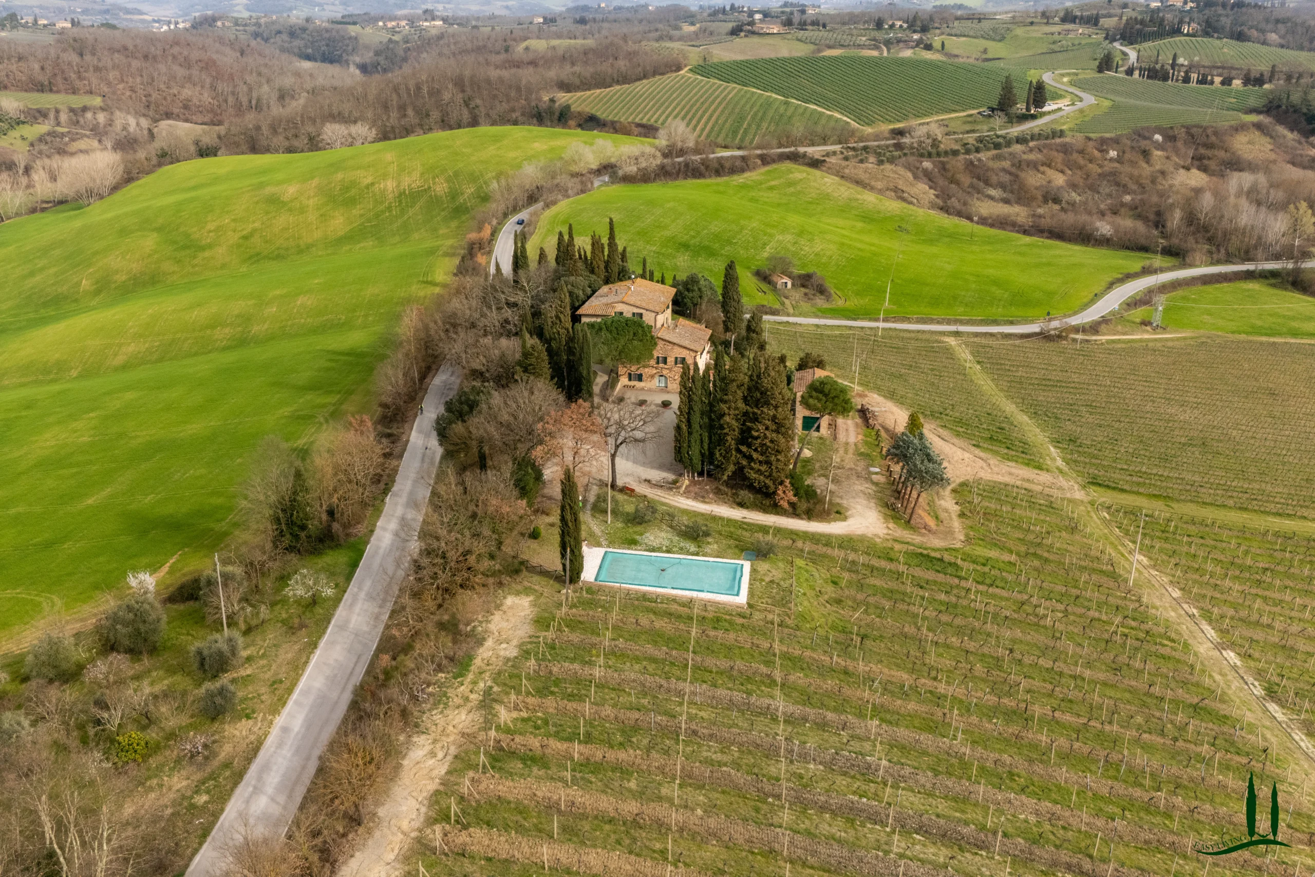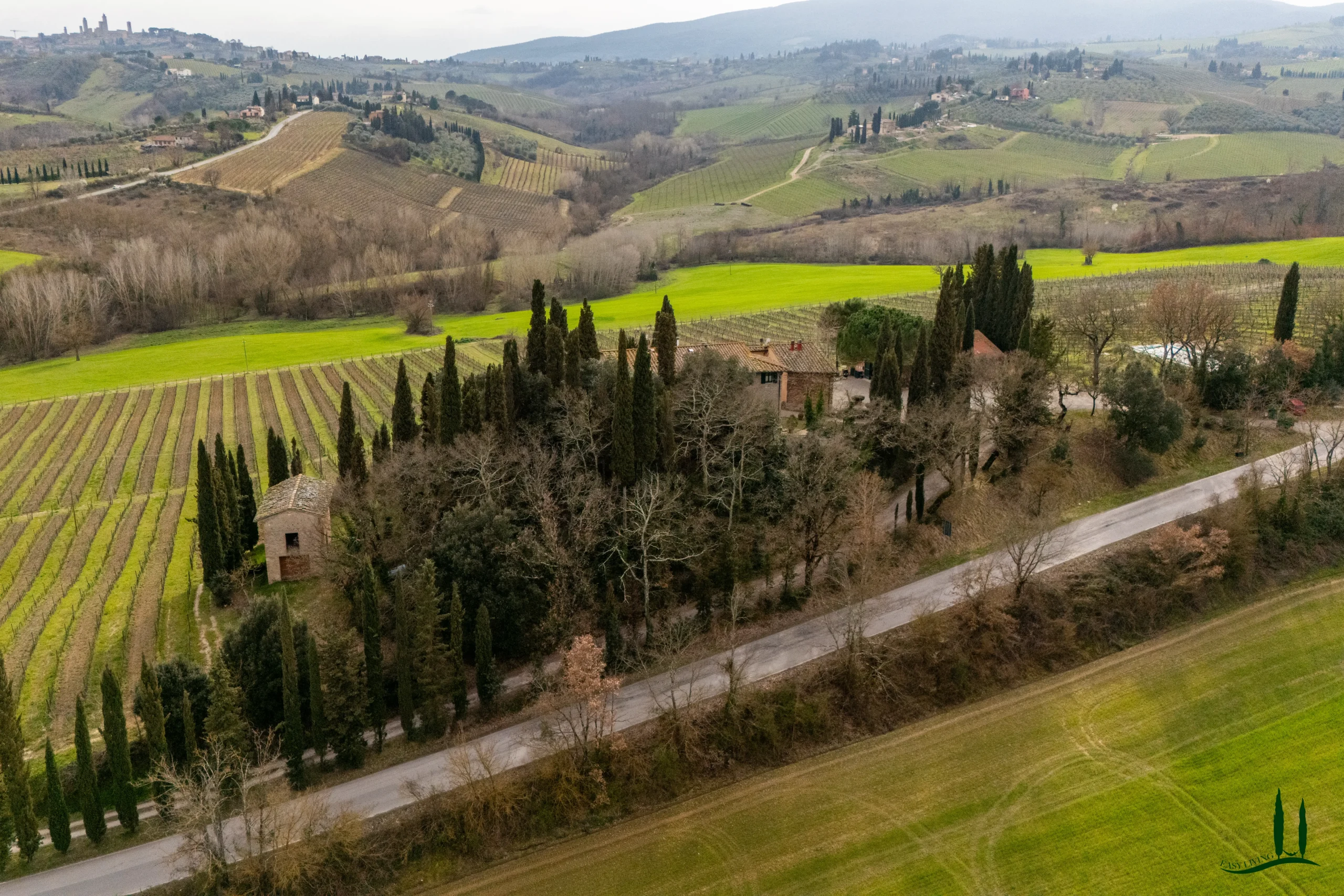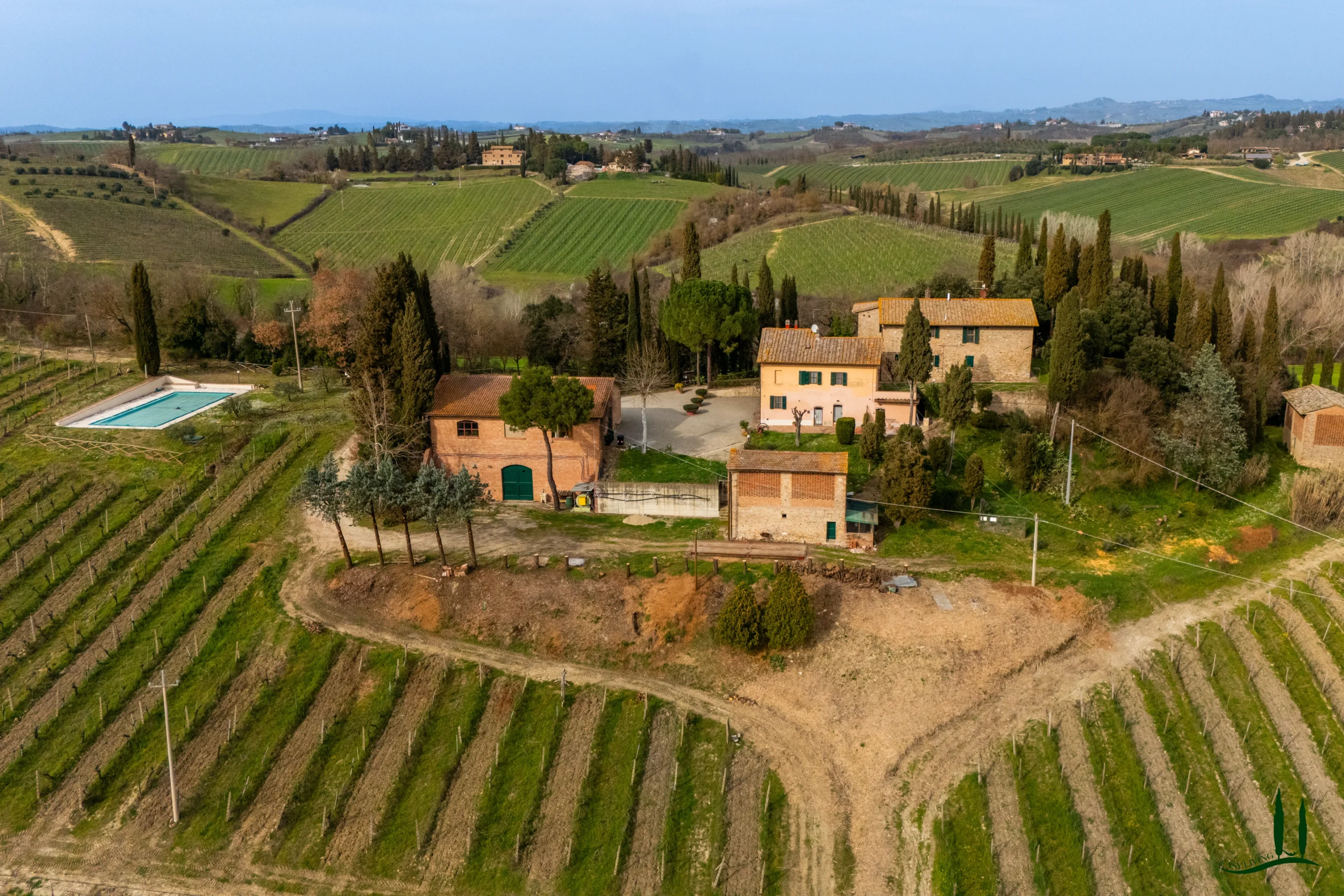 Set in the most authentic heart of Tuscany, just moments from the iconic towers of San Gimignano, this enchanting farm estate spans 51 hectares of unspoiled natural beauty. The landscape unfolds as a harmonious mosaic of vineyards, olive groves, golden fields, and woodland, creating an atmosphere of timeless peace and rural charm.