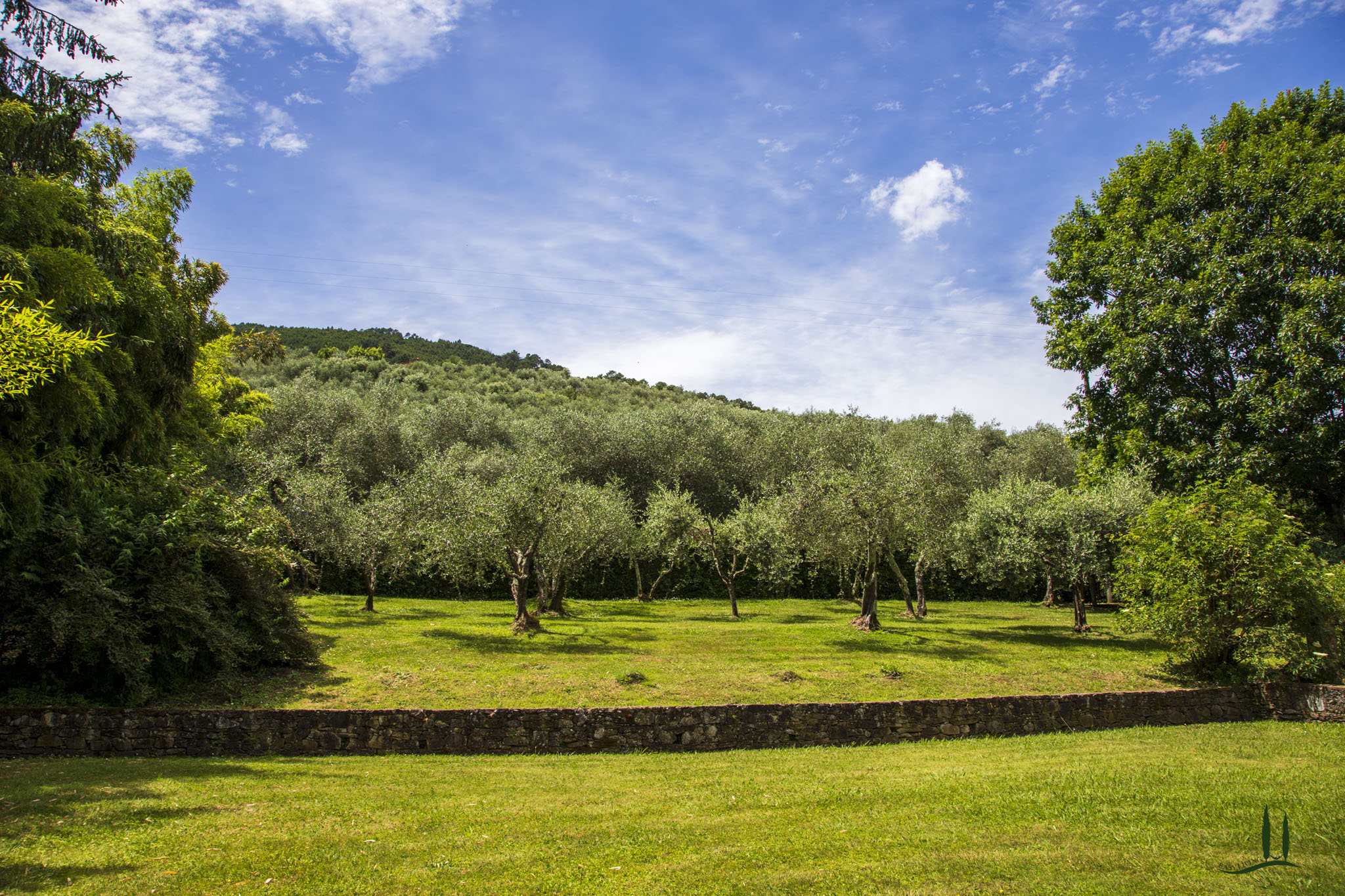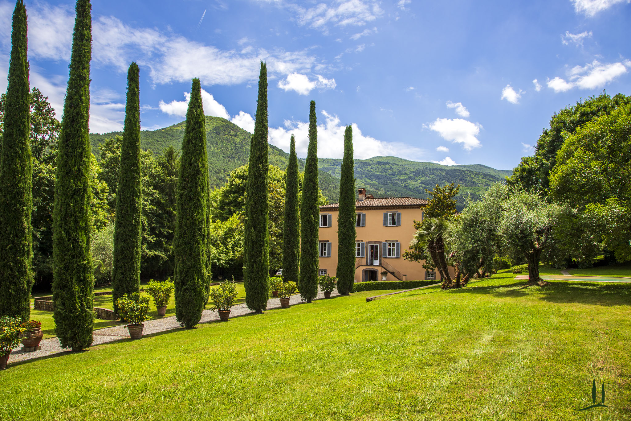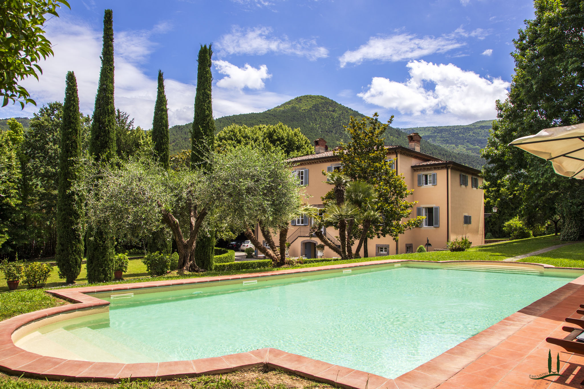 cipressi "puri". L'ampio parco della Villa con tigli, querce, ulivi, magnolie, grandi cespugli di piante aromatiche e rose è lo sfondo ideale per l'invitante piscina romanica.