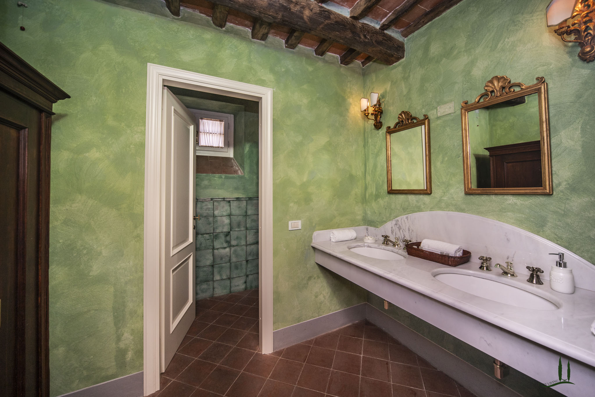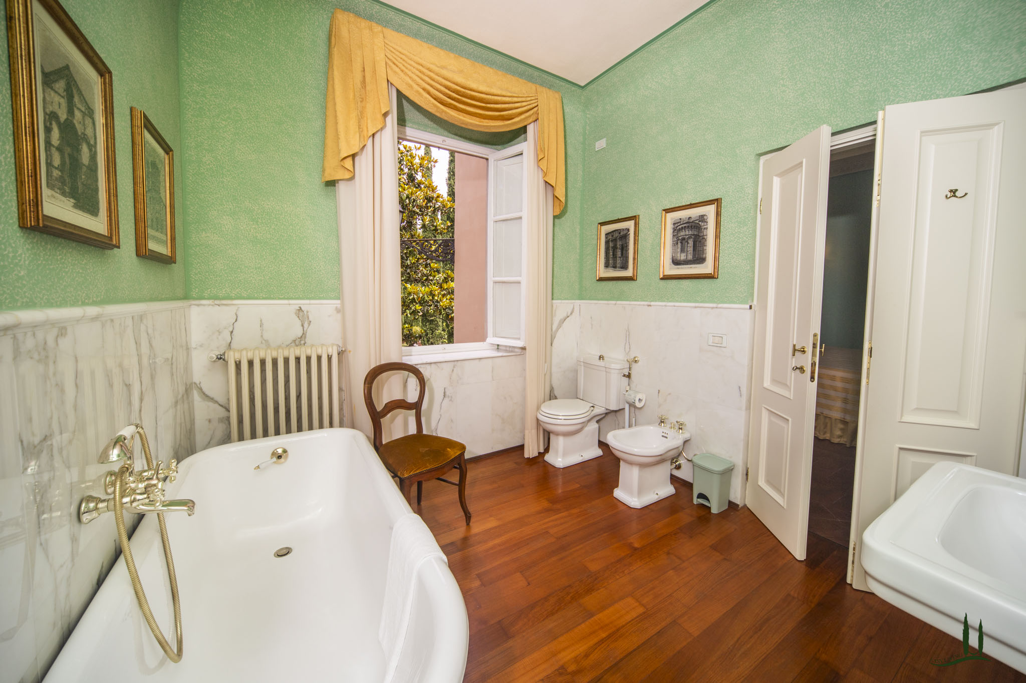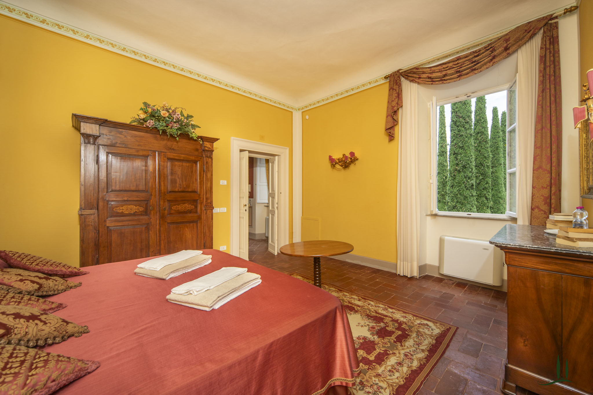 cipressi "puri". L'ampio parco della Villa con tigli, querce, ulivi, magnolie, grandi cespugli di piante aromatiche e rose è lo sfondo ideale per l'invitante piscina romanica.