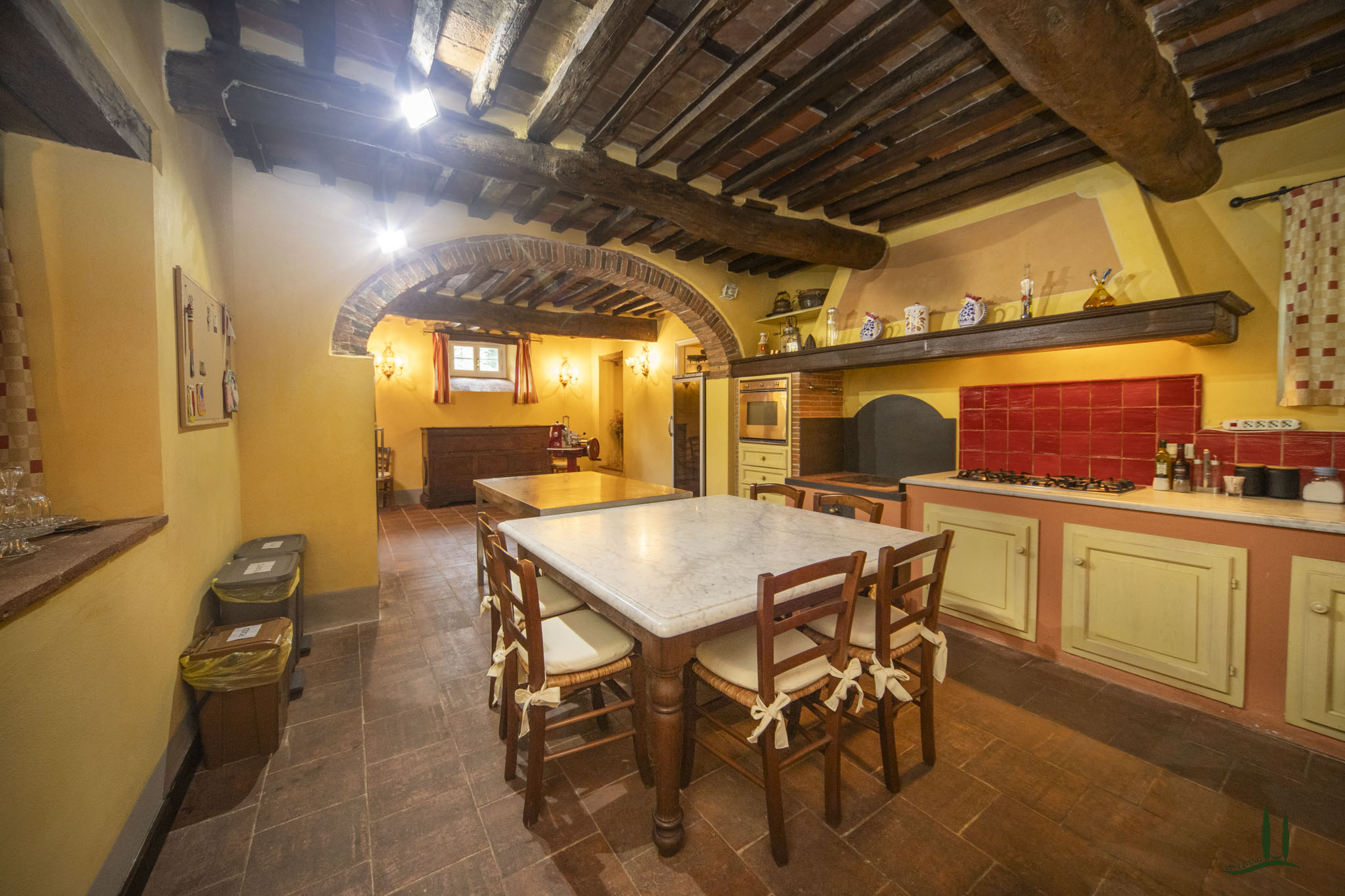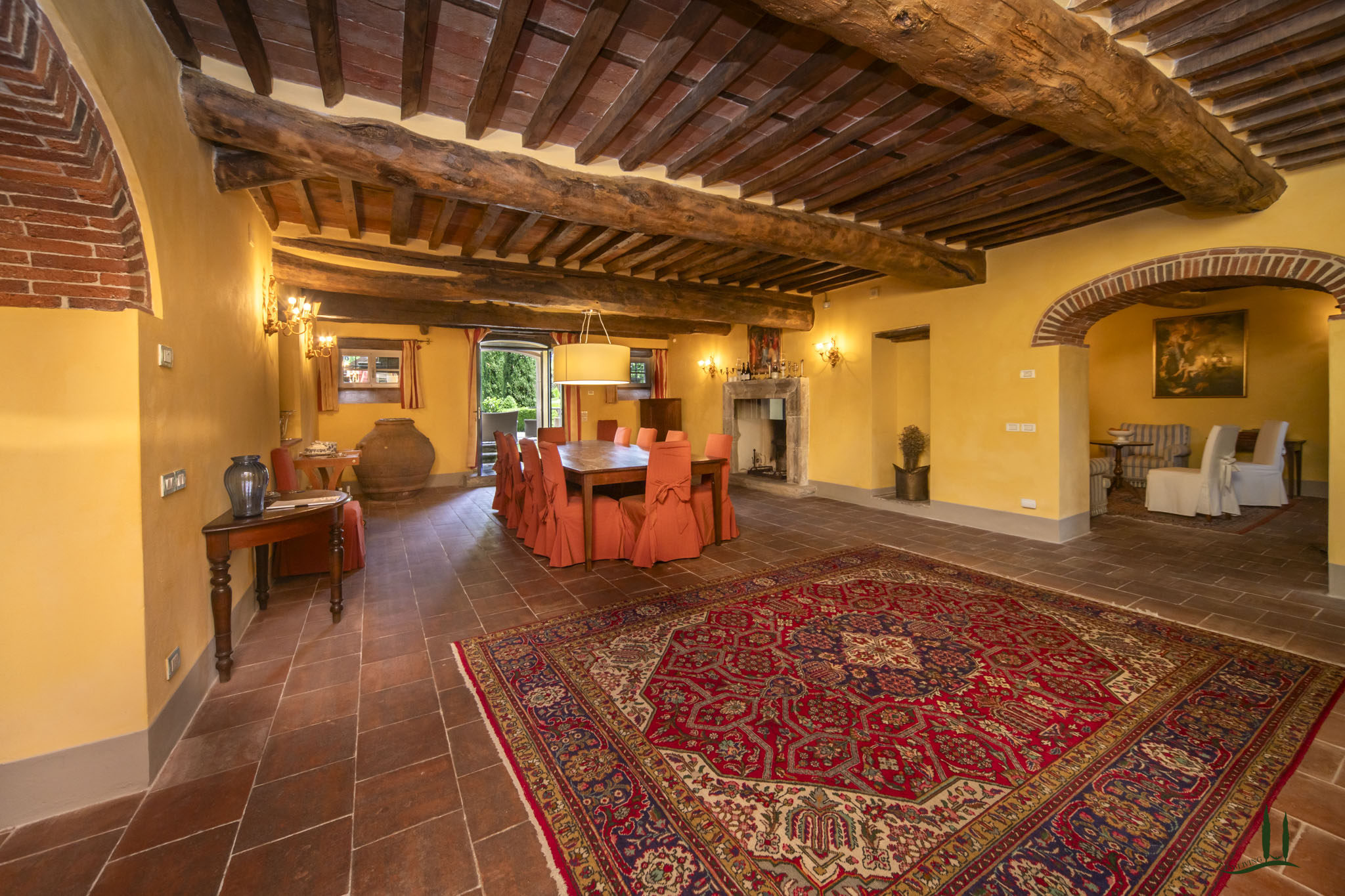 Si accede anche al piano terra, dove gli ospiti possono gustare deliziose cene davanti a un grande camino.