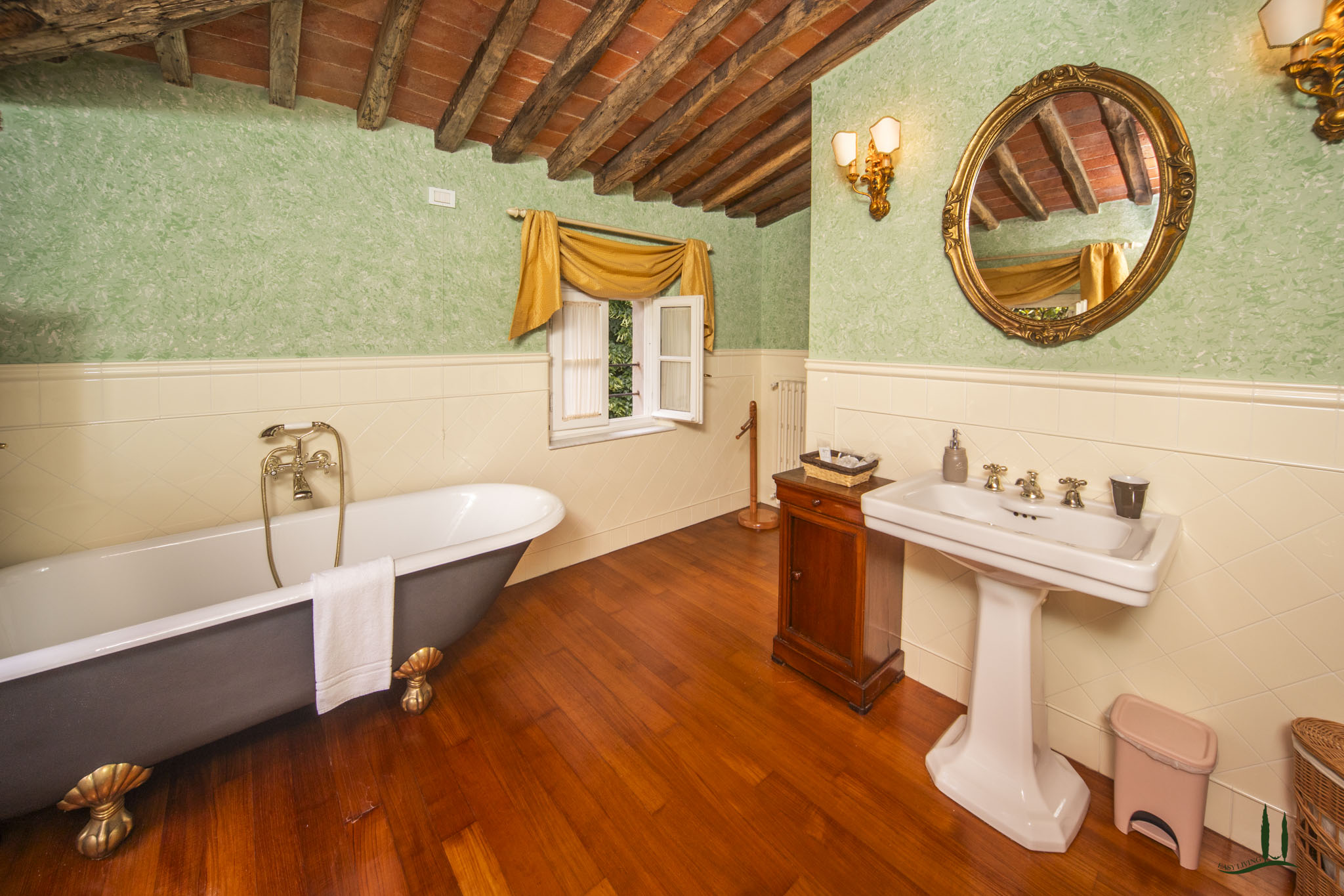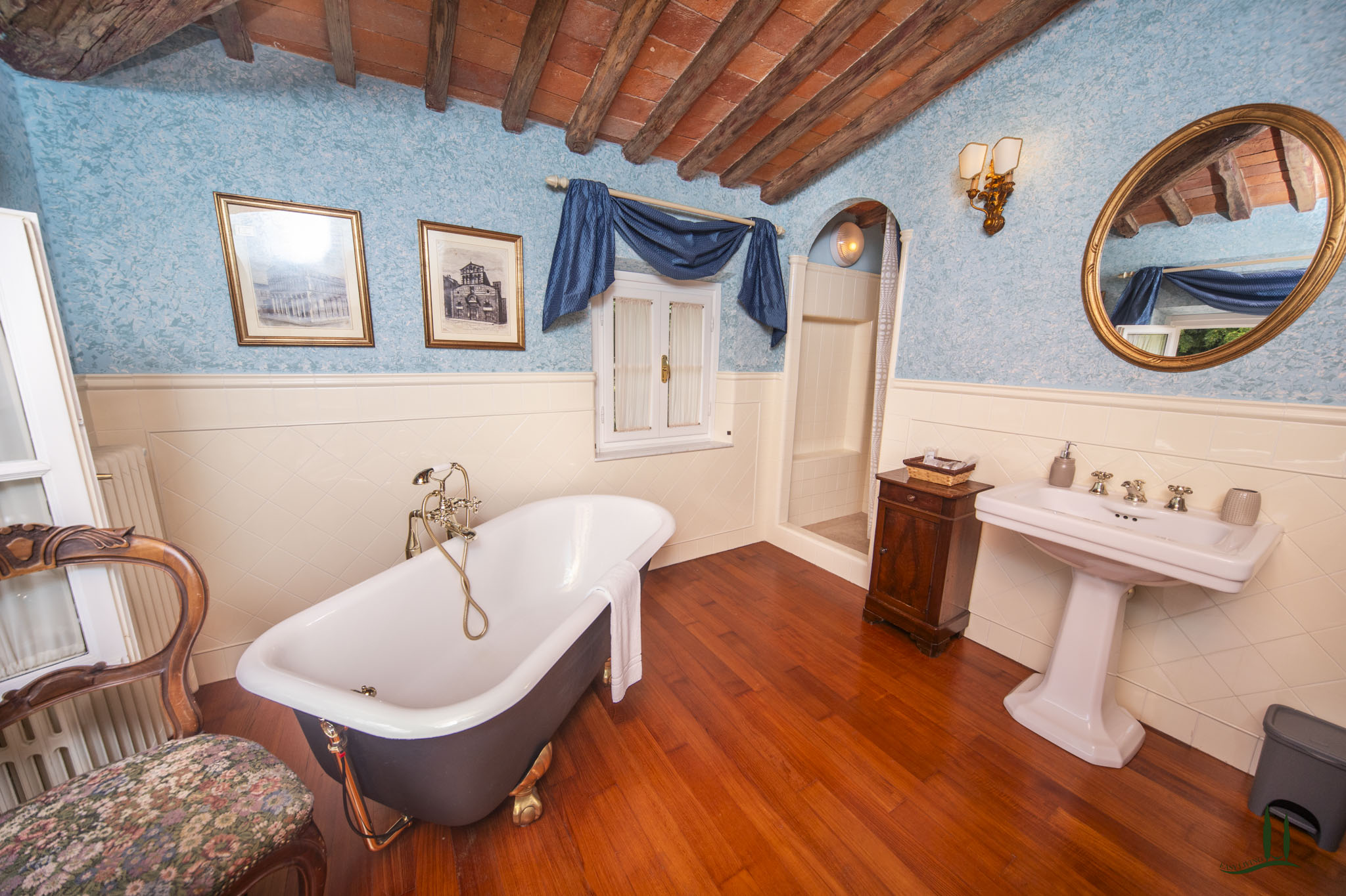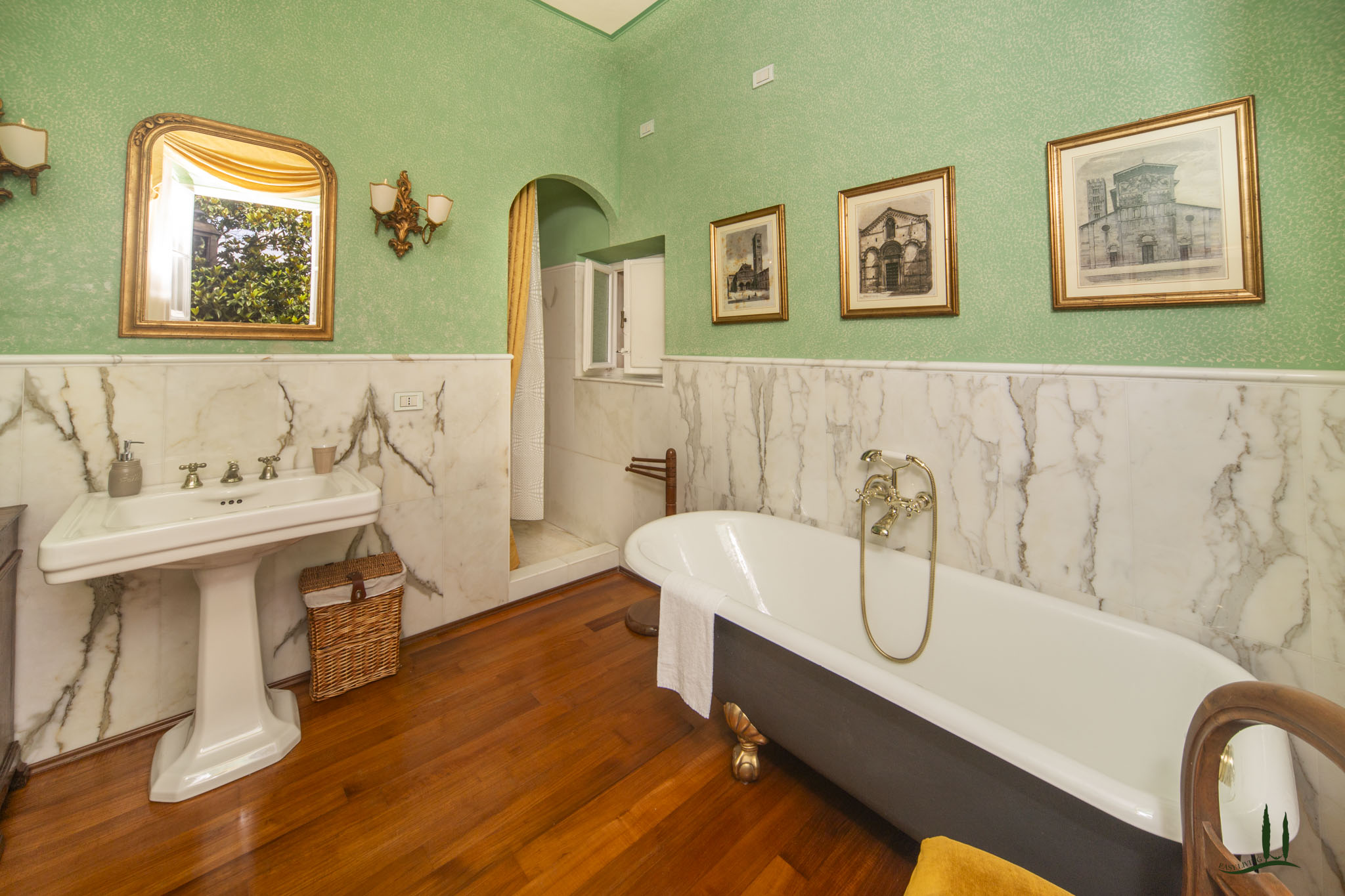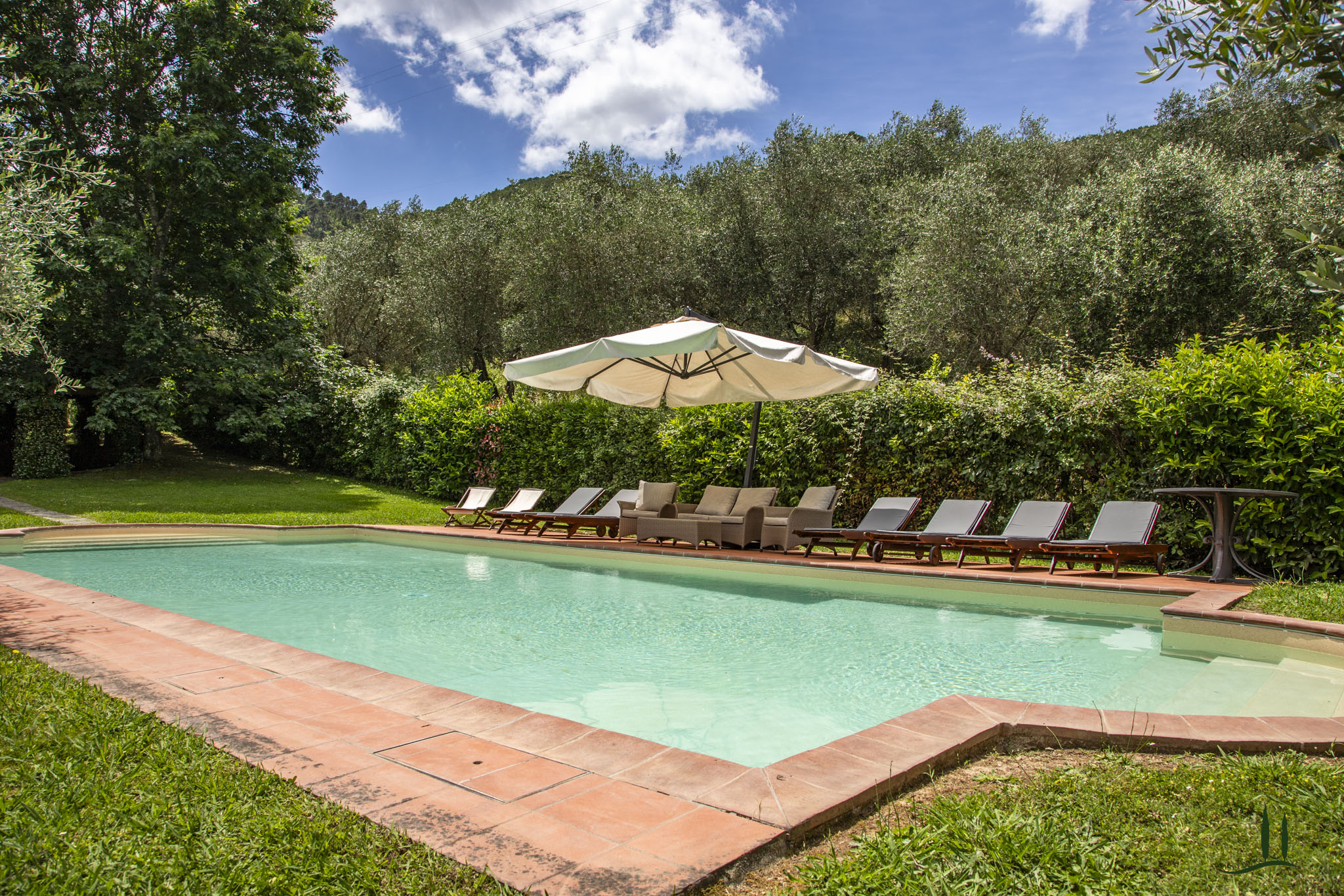 L'ampio parco della Villa con tigli, querce, ulivi, magnolie, grandi cespugli di piante aromatiche e rose è lo sfondo ideale per la piscina in stile romanico oggi avvolta da un romantico pergolato di Bouganvillas.