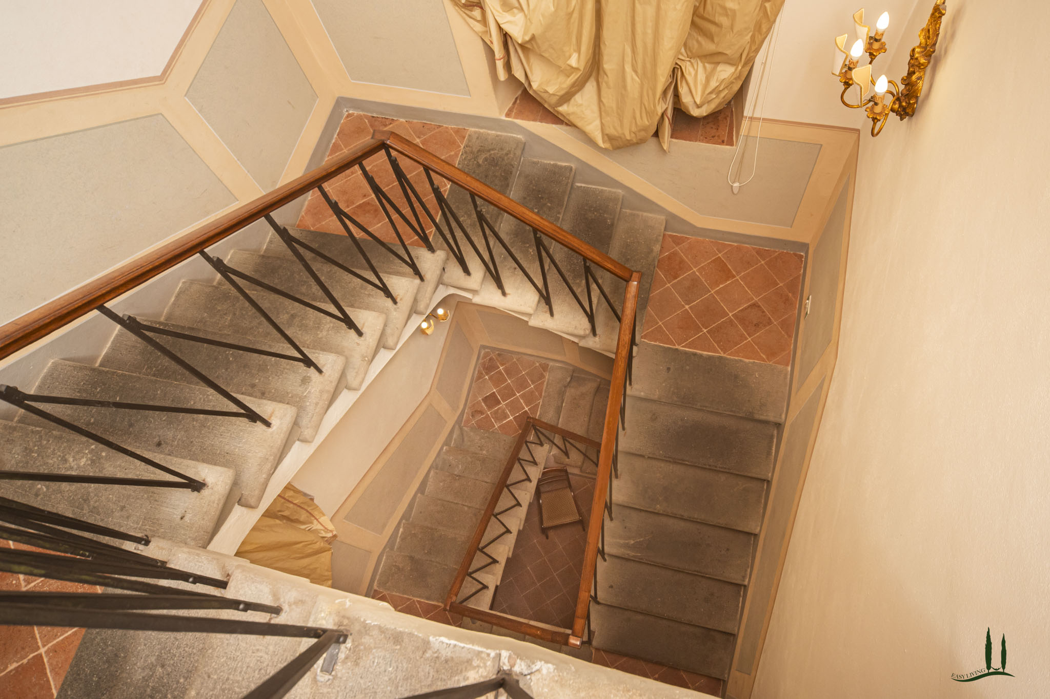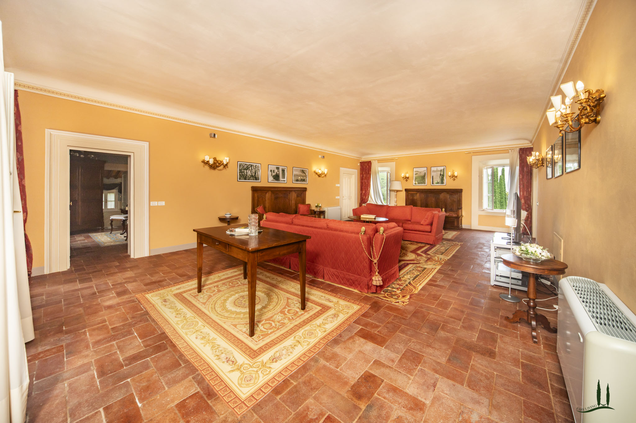 dal piano terra, e vi si accede attraverso un portale in cima alla scala esterna a doppia rampa, con una distribuzione simmetrica degli altri ambienti intorno al salone centrale.