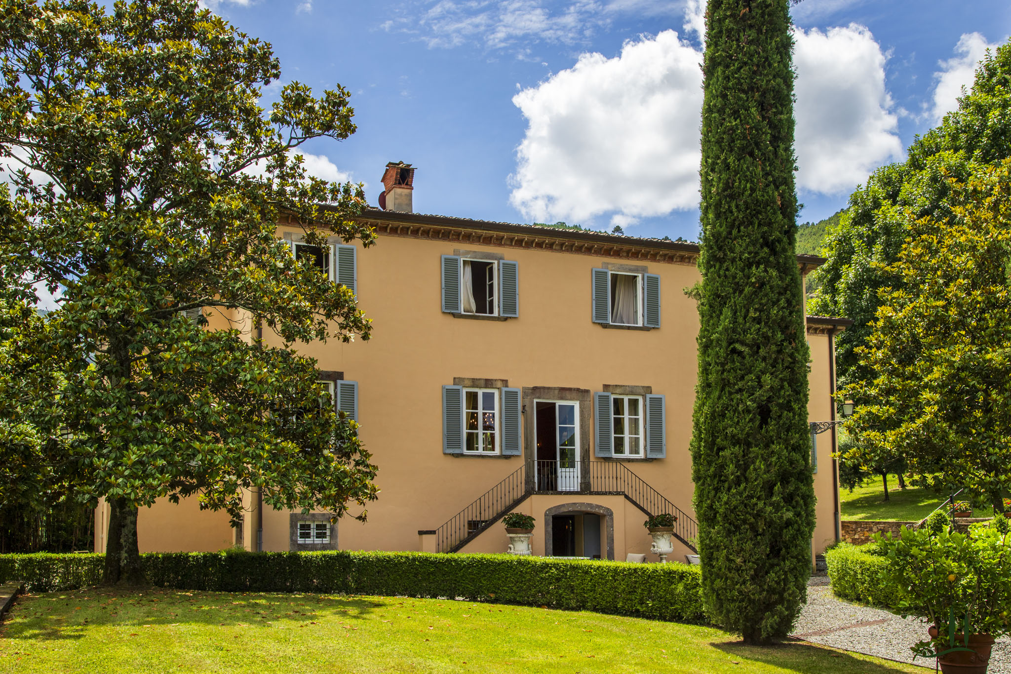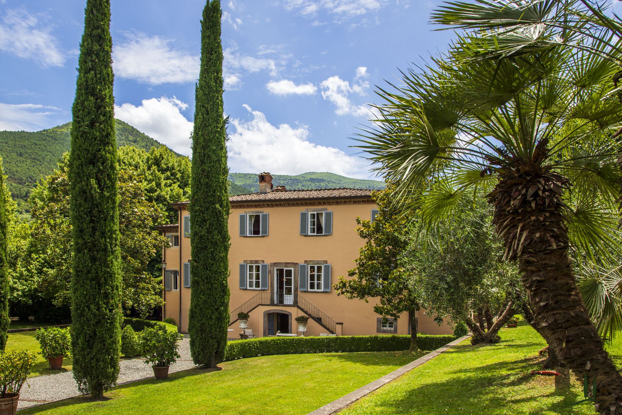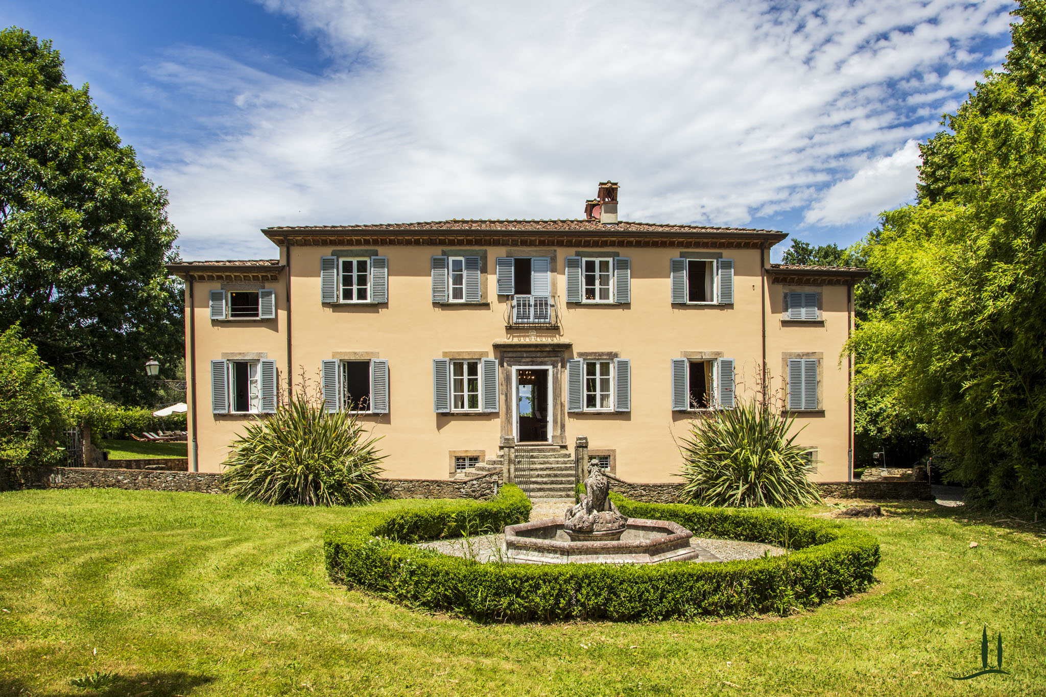 Protetta da un muro di cinta di pietre di avvistamento, la Villa è la vera espressione della sobria architettura lucchese.