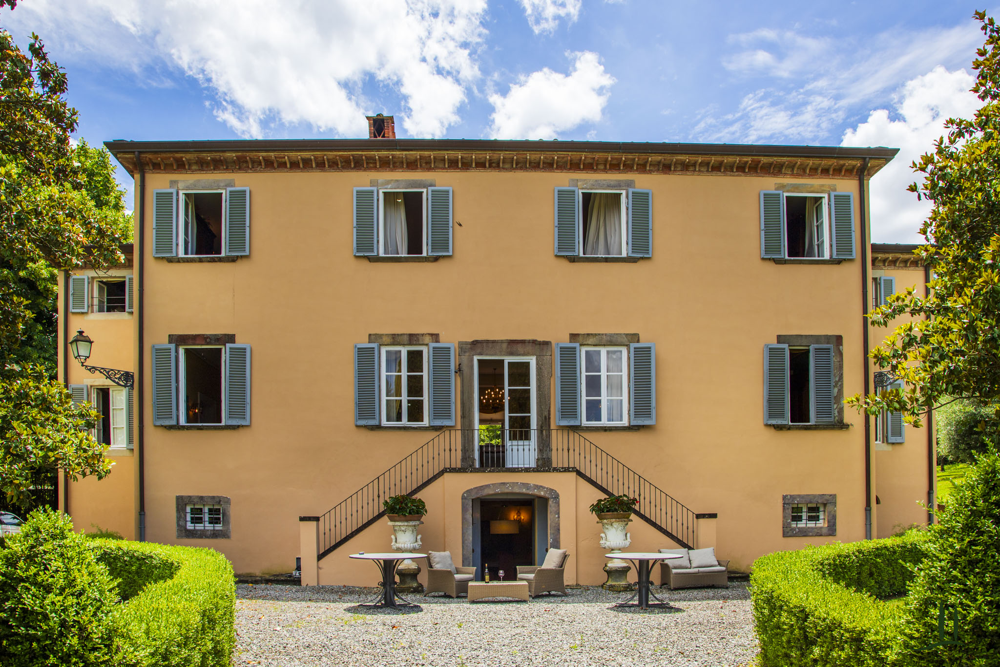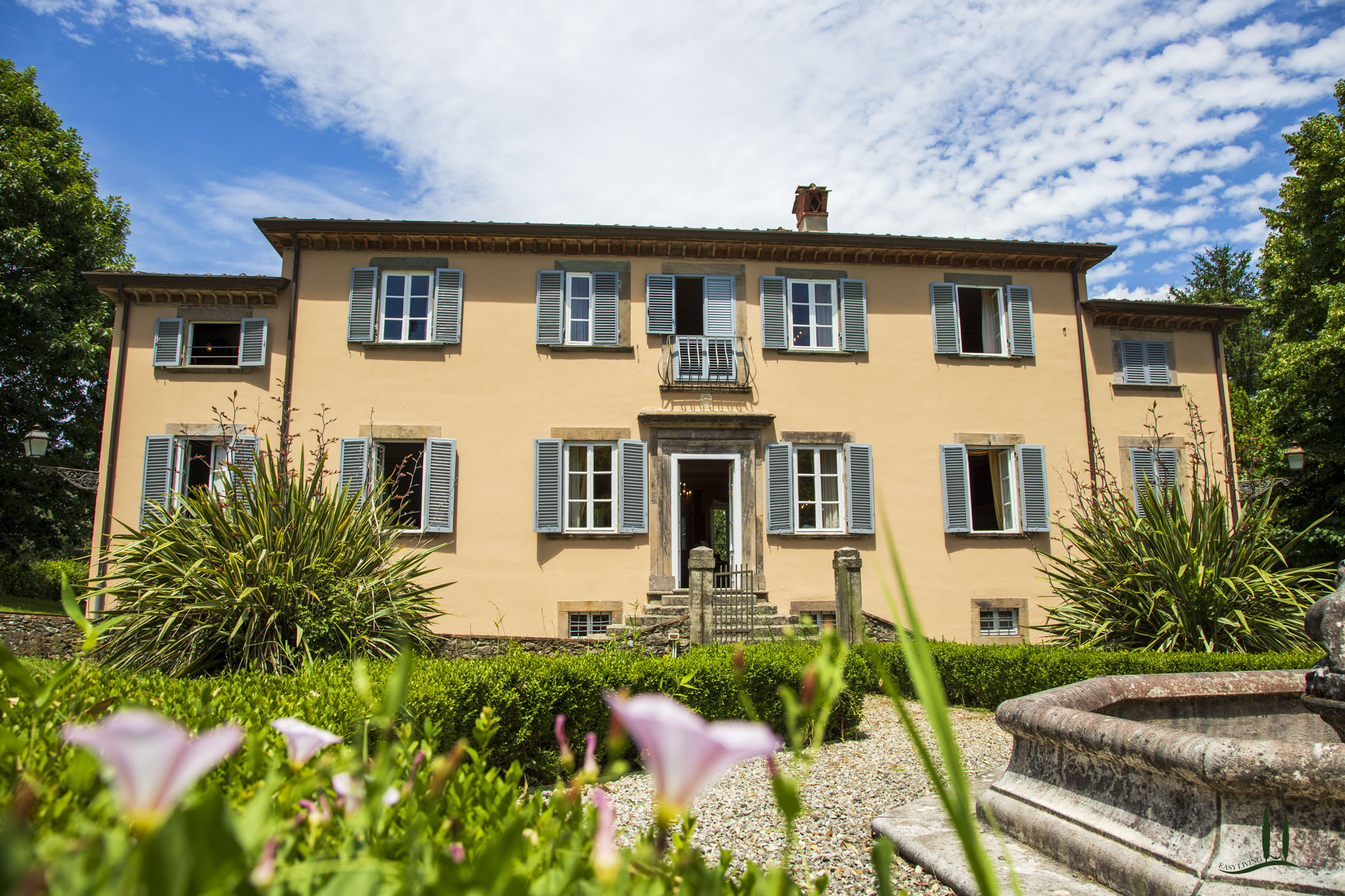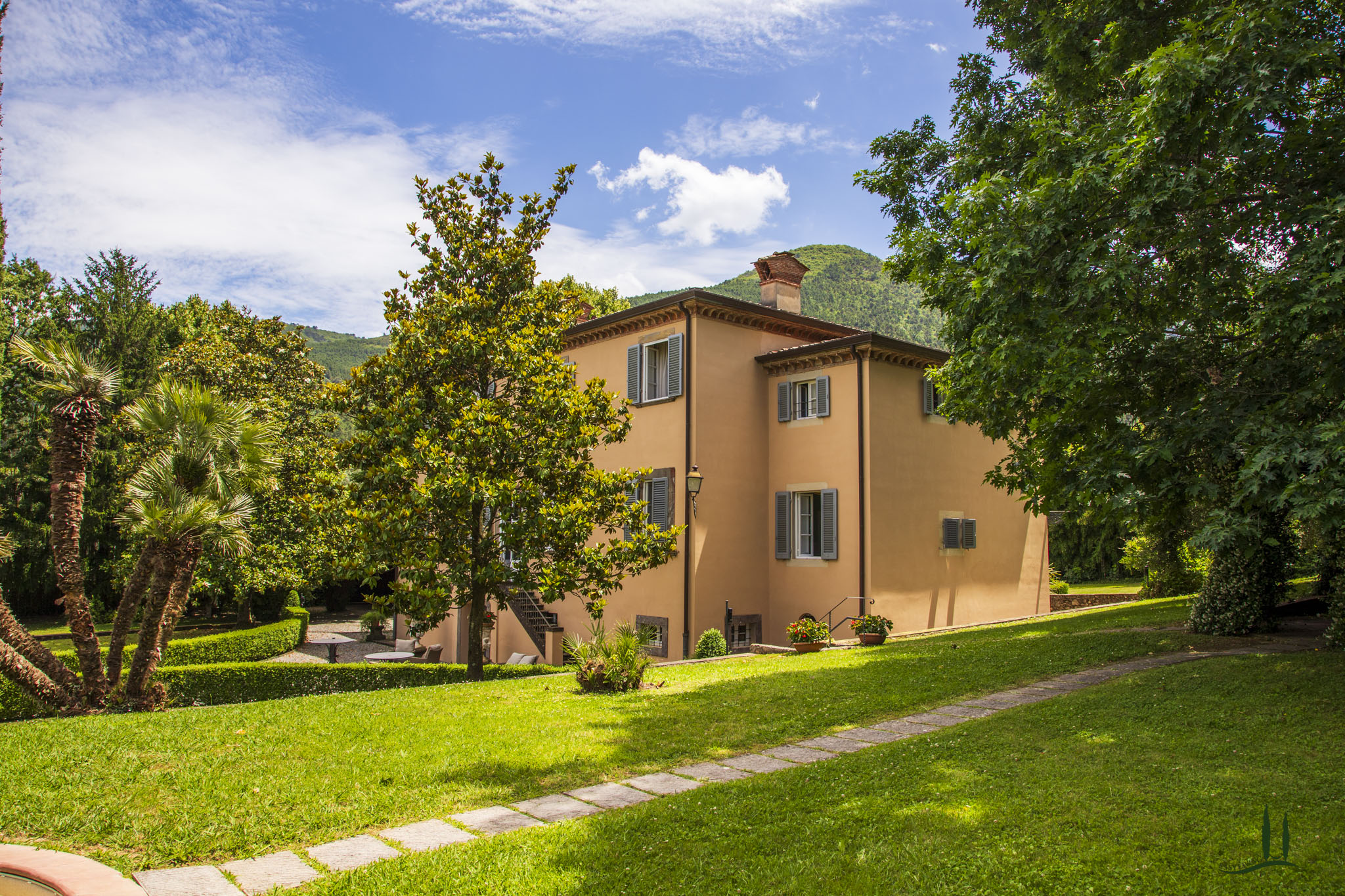 Protetta da un muro di cinta di pietre di avvistamento, la Villa è la vera espressione della sobria architettura lucchese.