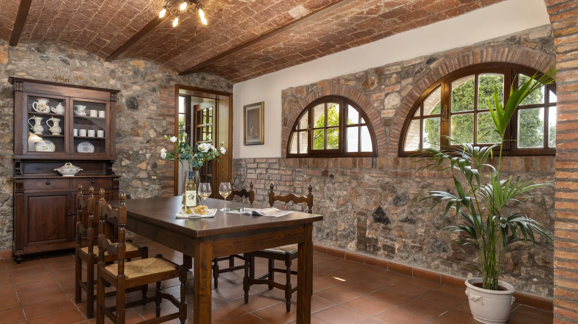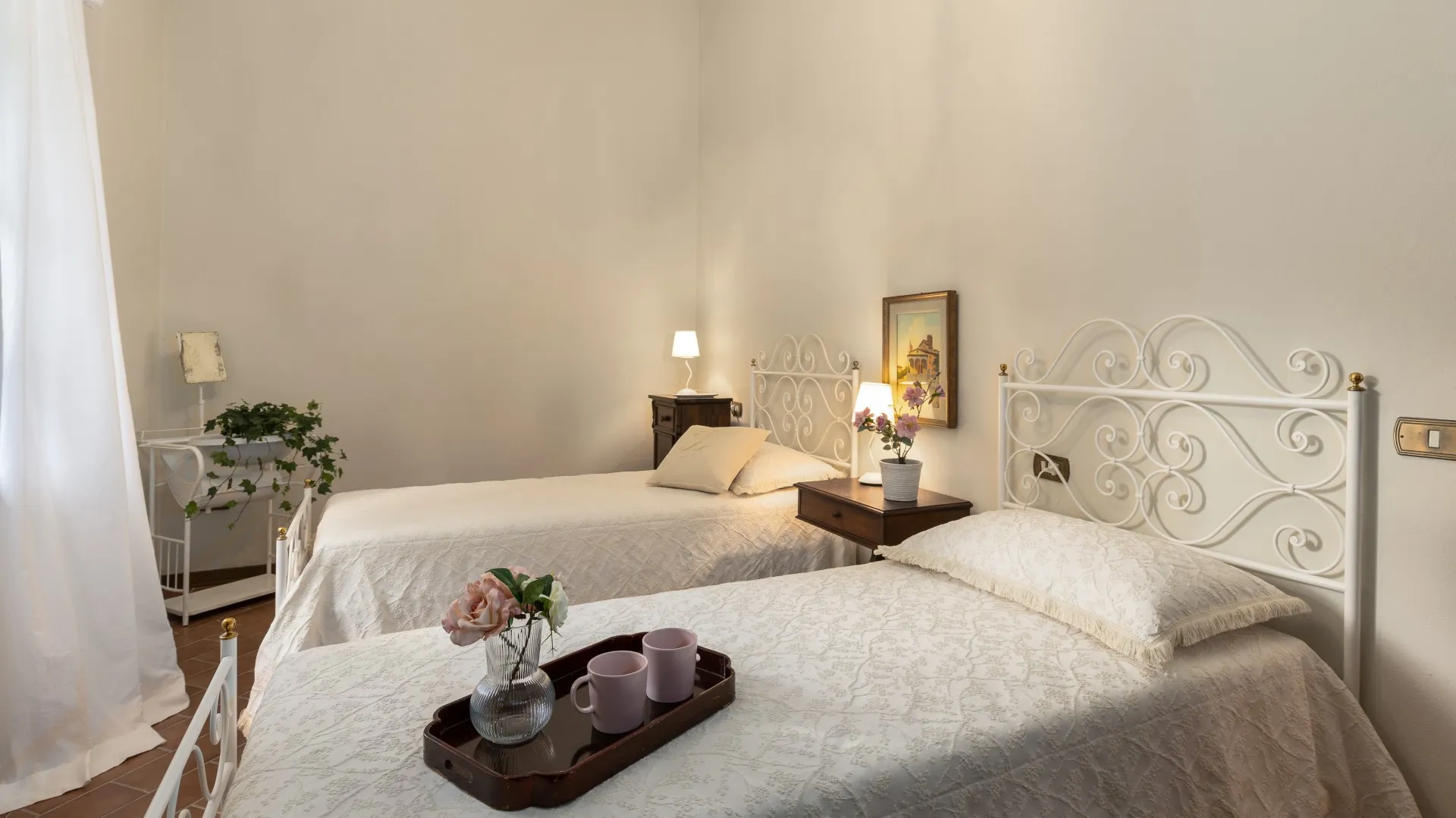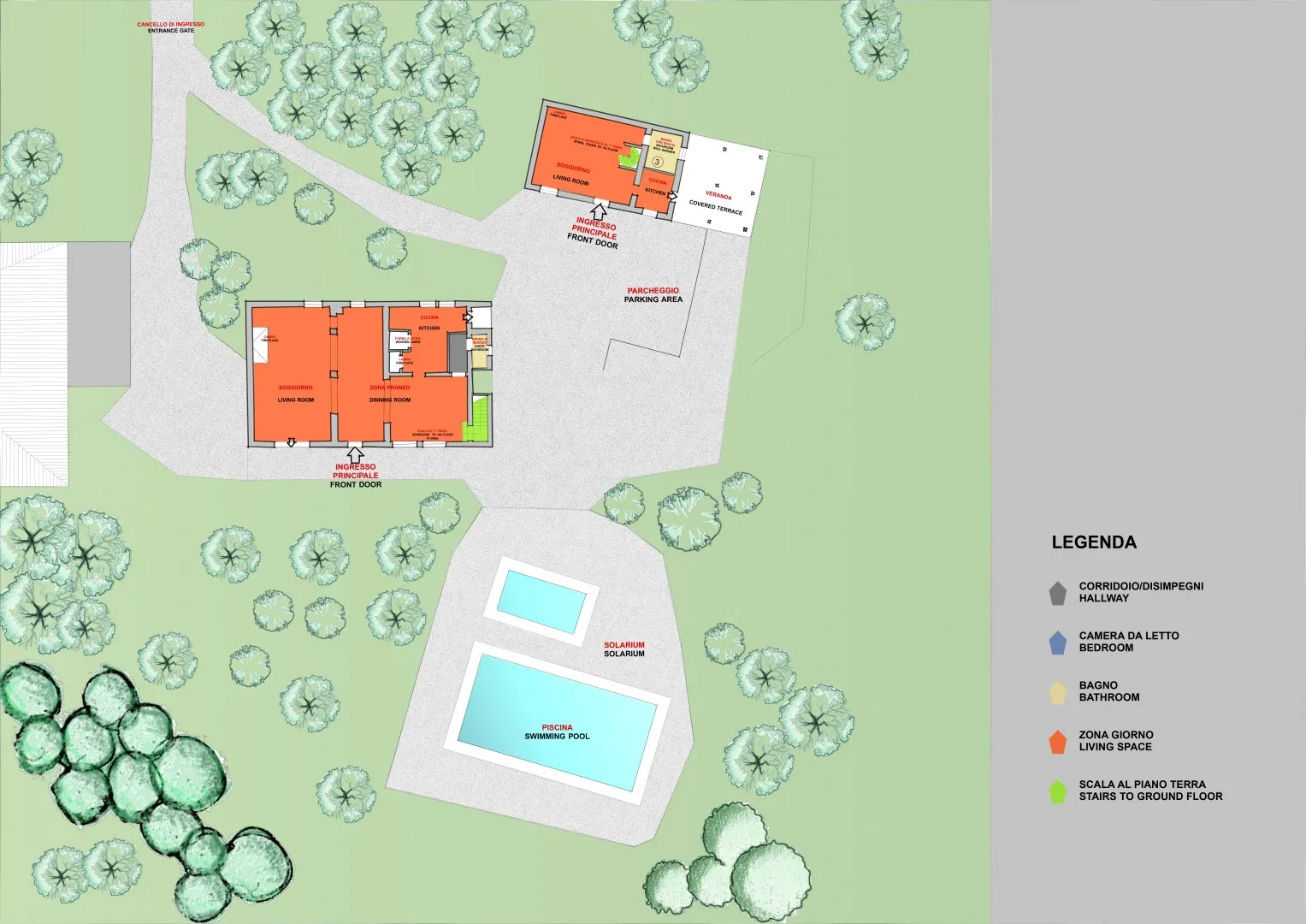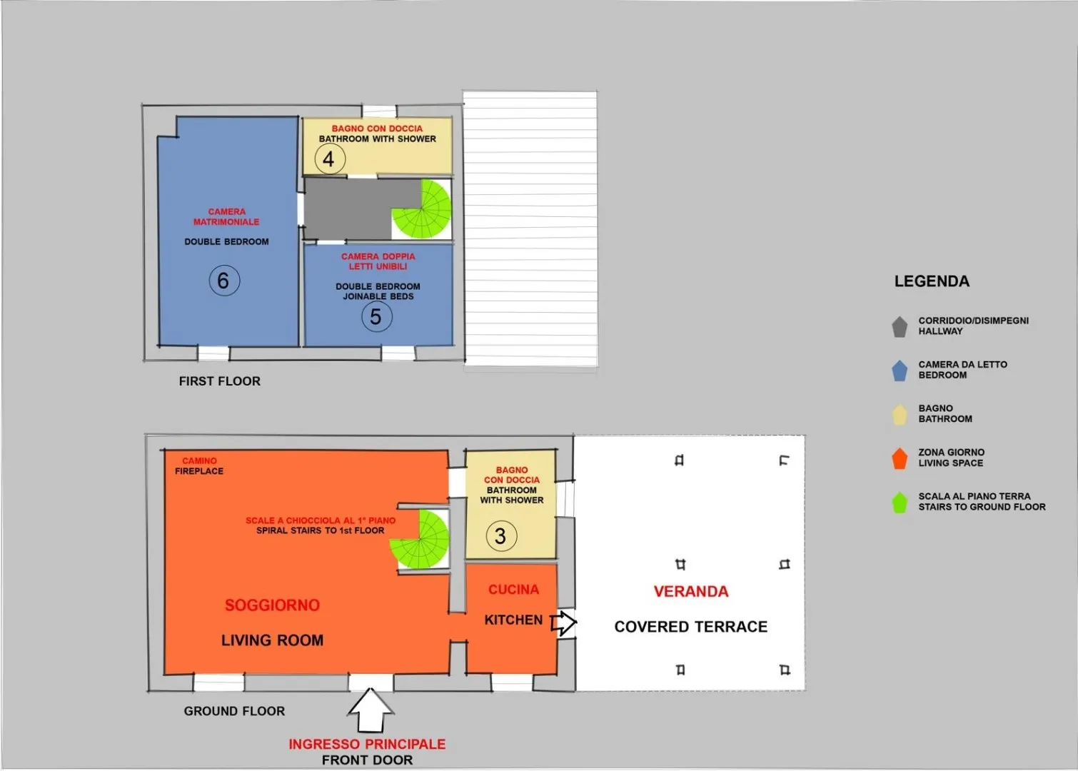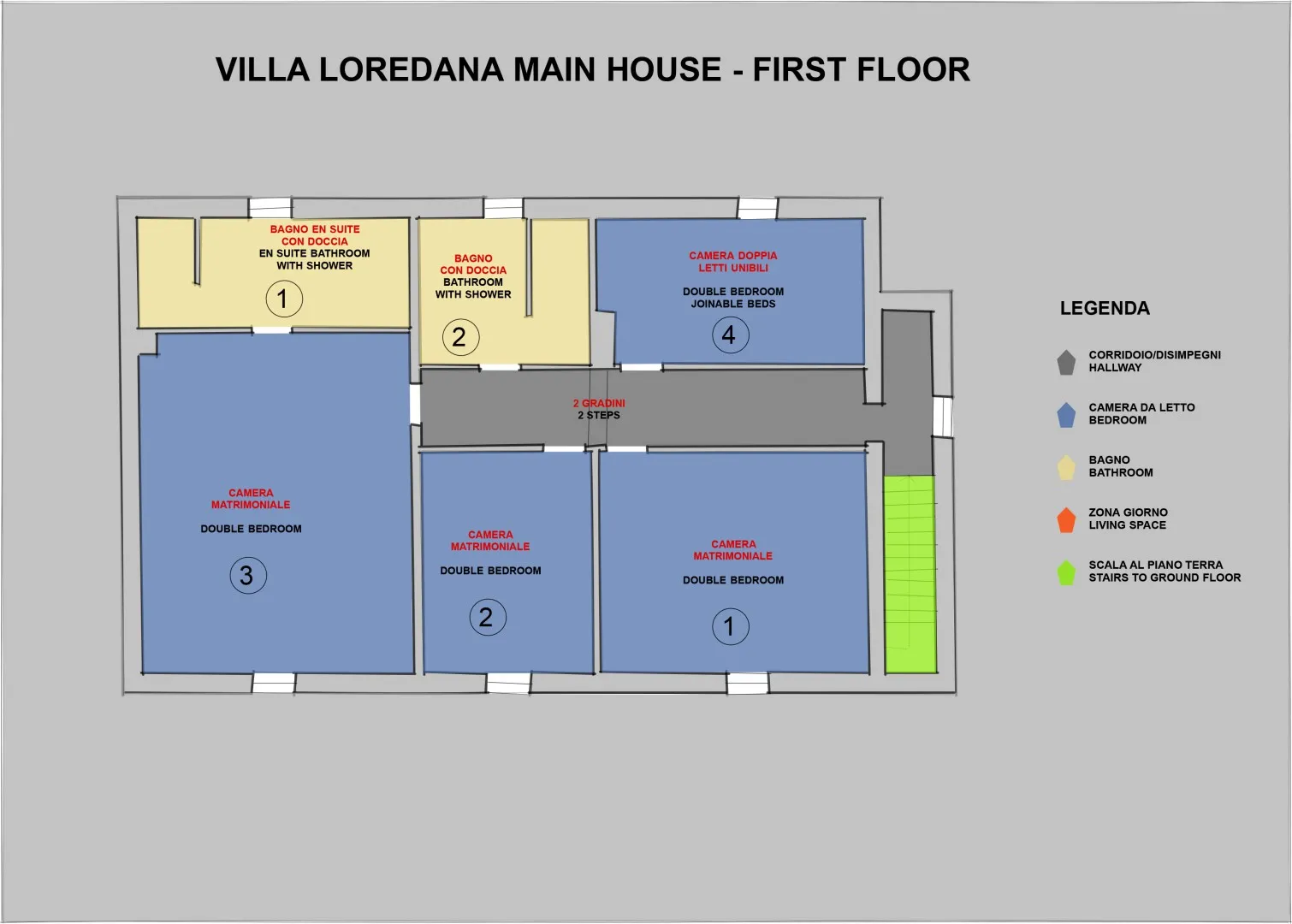 Villa Loredana è composta dalla casa principale e da un annesso. CASA. Su due piani con una superficie di circa 270 mq. L'ingresso principale conduce al soggiorno a pianta aperta, con camino e TV, e alla sala da pranzo. Collegata alla zona pranzo si trova la cucina con camino e forno a legna. Un bagno per gli ospiti completa il piano. Una scala in cotto conduce alla zona notte composta da due camere matrimoniali, una camera matrimoniale con bagno privato con doccia, una camera doppia con letti unibili e un bagno con doccia. ALLEGATO. A pochi metri dalla casa principale, l'annesso si sviluppa su due piani per una superficie di circa 100 mq. Al piano terra si trova il soggiorno con camino e TV, un bagno con doccia e una cucina di servizio, dove è disponibile una lavatrice. La cucina di servizio ha accesso a una terrazza in cotto con copertura in legno. Una scala a chiocciola conduce alla zona notte composta da una camera doppia con letti unibili, una camera matrimoniale e un bagno con doccia (senza bidet ma dotato di doccetta).