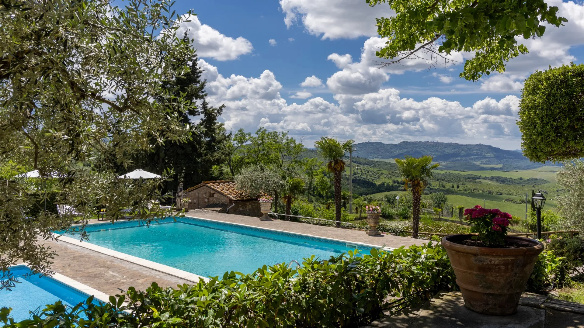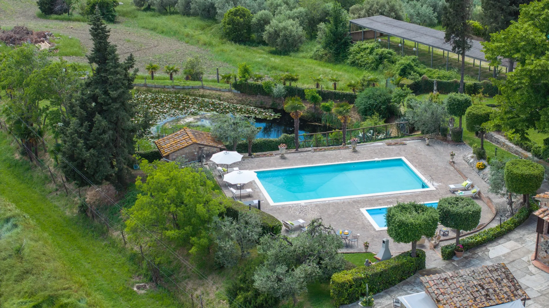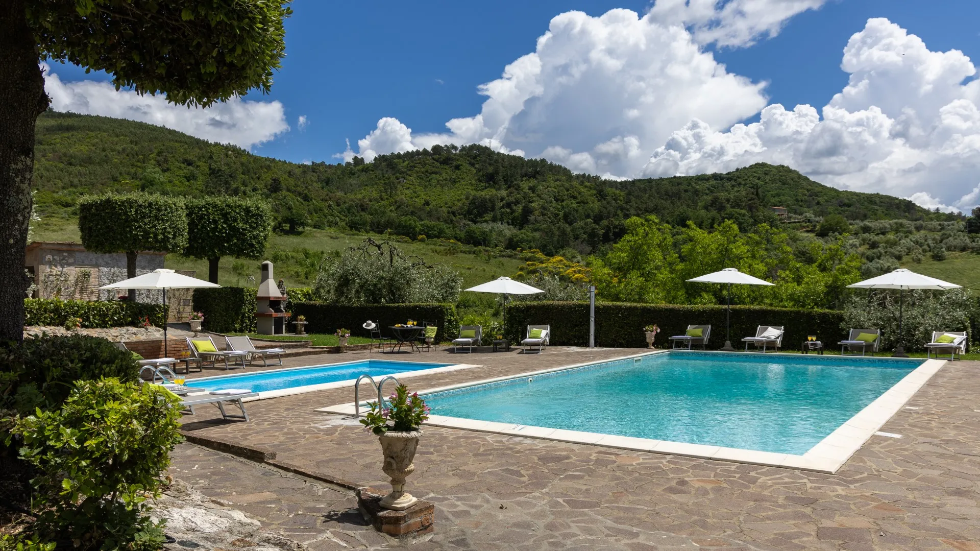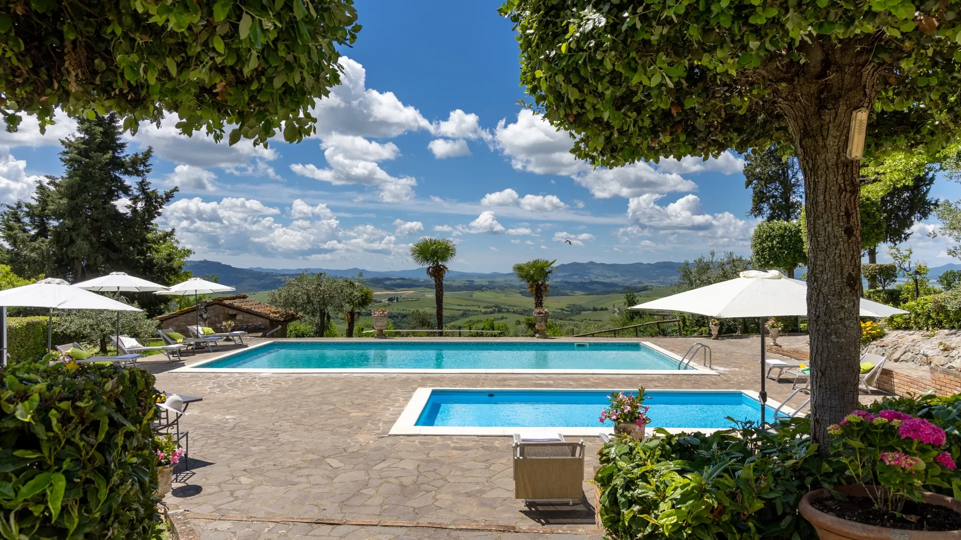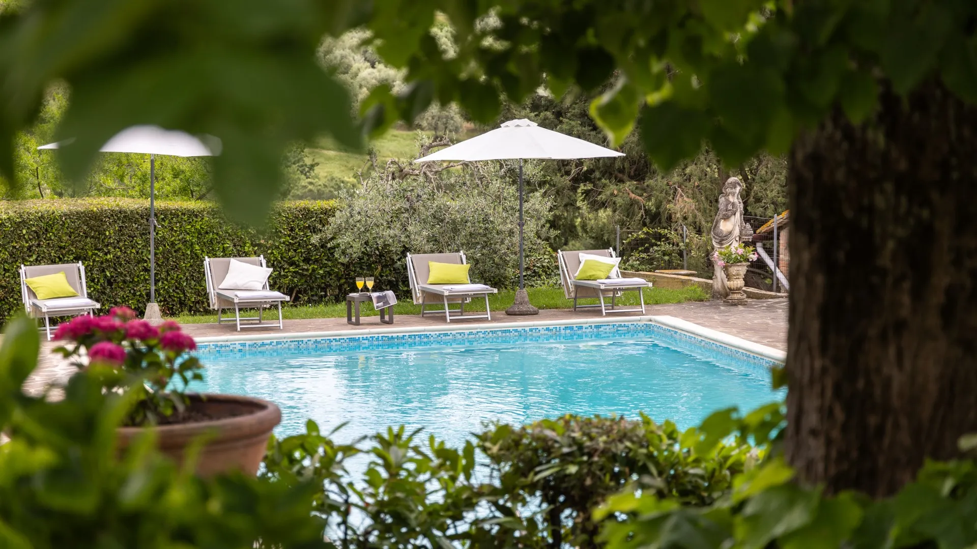 L'area della piscina si trova a pochi metri dalla casa principale, a un livello leggermente più basso e circondata su tre lati da un muretto, da siepi e da vari alberi ad alto fusto per garantire la privacy, e si raggiunge percorrendo la parte piastrellata del giardino di fronte all'ingresso principale. Le piscine sono due: la più grande, di 12 x 6 m, con una profondità variabile da 1,20 a 1,40 m, ha una scaletta di accesso ed è dotata di illuminazione interna, mentre la più piccola, adatta ai bambini, misura 6 x 3 m con una profondità costante di 50 cm. Entrambe le piscine, rettangolari e con depurazione a cloro, sono rivestite in PVC con il bordo in pietra chiara. Tutto intorno si trova l'area solarium in pietra, attrezzata con lettini, tavoli e ombrelloni per offrire agli ospiti il massimo comfort. L'area solarium è ornata da statue in pietra e vasi con fiori, con una bella vista sulle colline circostanti. Nell'area della piscina è presente una doccia. La piscina rimarrà aperta dall'ultimo sabato di aprile al primo sabato di ottobre.