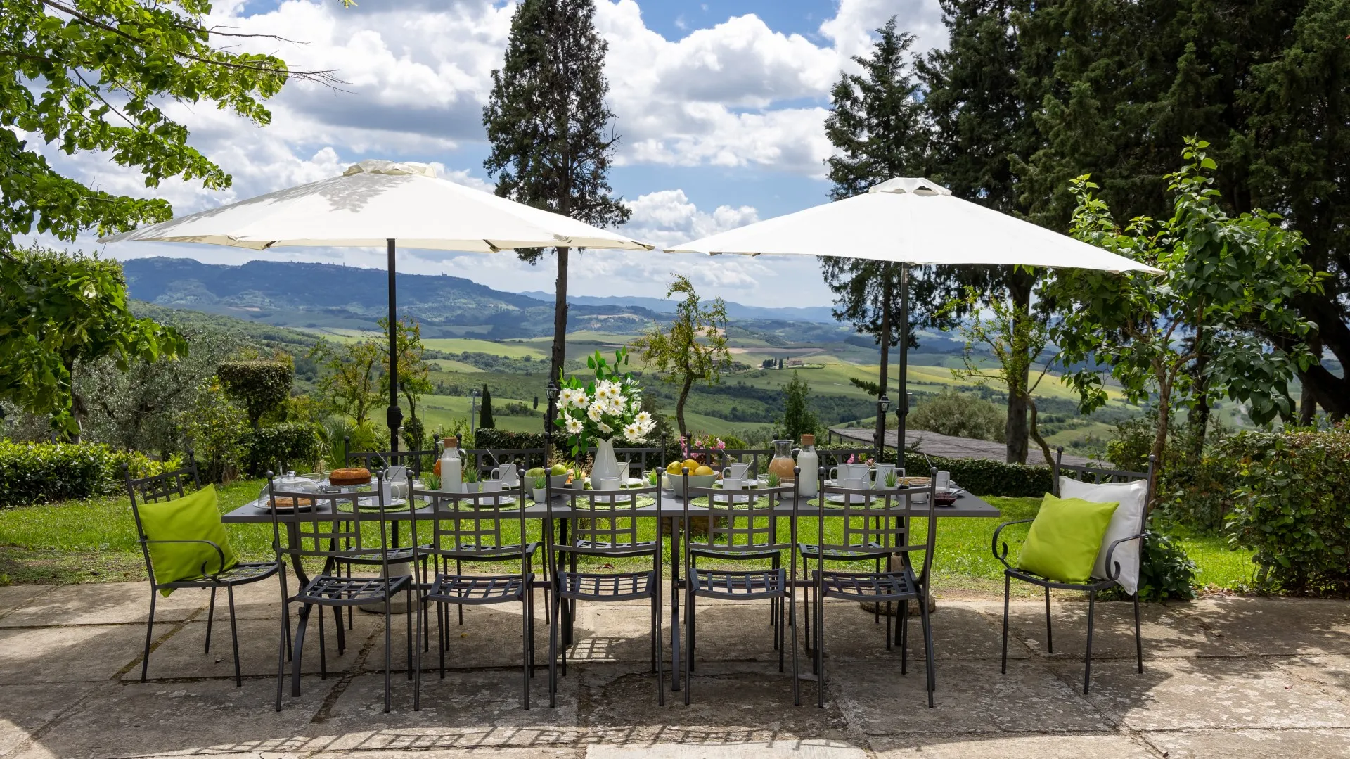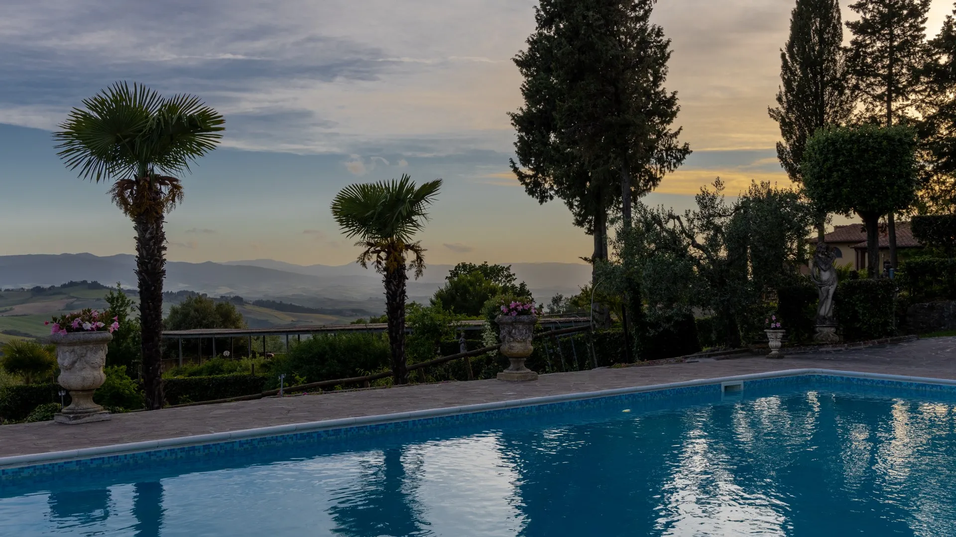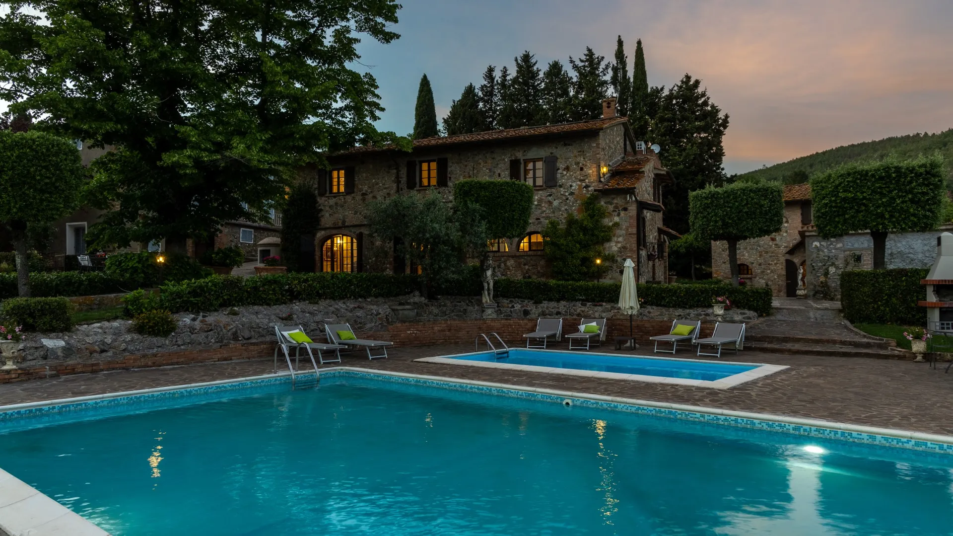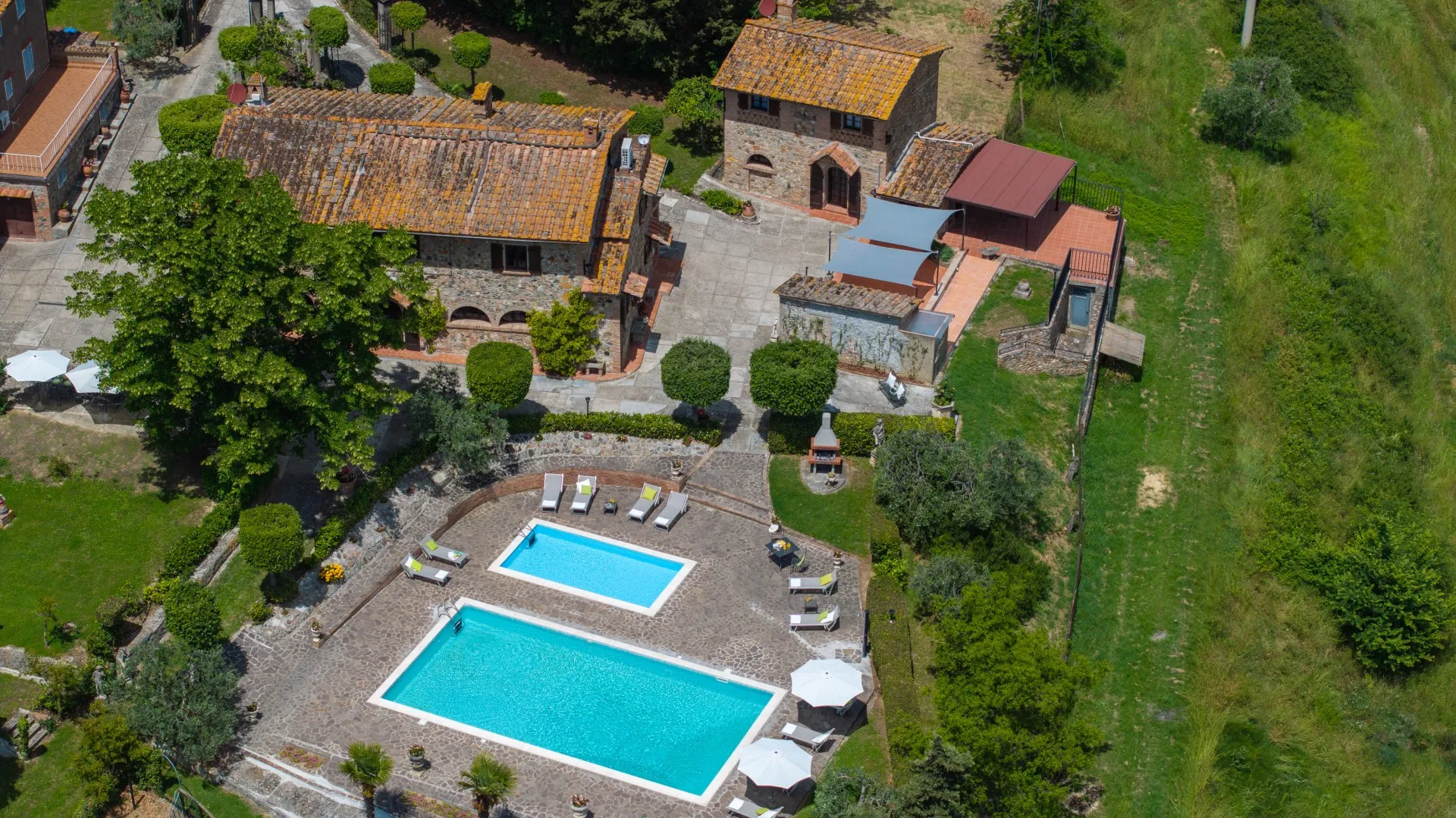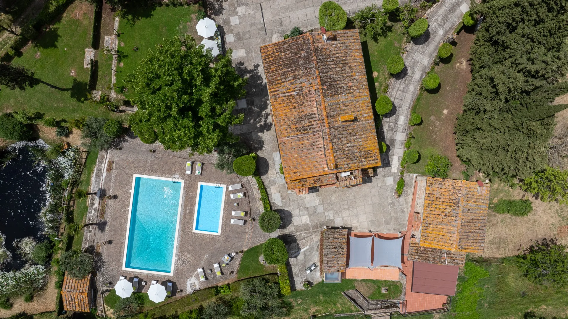 L'area della piscina si trova a pochi metri dalla casa principale, a un livello leggermente più basso e circondata su tre lati da un muretto, da siepi e da vari alberi ad alto fusto per garantire la privacy, e si raggiunge percorrendo la parte piastrellata del giardino di fronte all'ingresso principale. Le piscine sono due: la più grande, di 12 x 6 m, con una profondità variabile da 1,20 a 1,40 m, ha una scaletta di accesso ed è dotata di illuminazione interna, mentre la più piccola, adatta ai bambini, misura 6 x 3 m con una profondità costante di 50 cm. Entrambe le piscine, rettangolari e con depurazione a cloro, sono rivestite in PVC con il bordo in pietra chiara. Tutto intorno si trova l'area solarium in pietra, attrezzata con lettini, tavoli e ombrelloni per offrire agli ospiti il massimo comfort. L'area solarium è ornata da statue in pietra e vasi con fiori, con una bella vista sulle colline circostanti. Nell'area della piscina è presente una doccia. La piscina rimarrà aperta dall'ultimo sabato di aprile al primo sabato di ottobre.