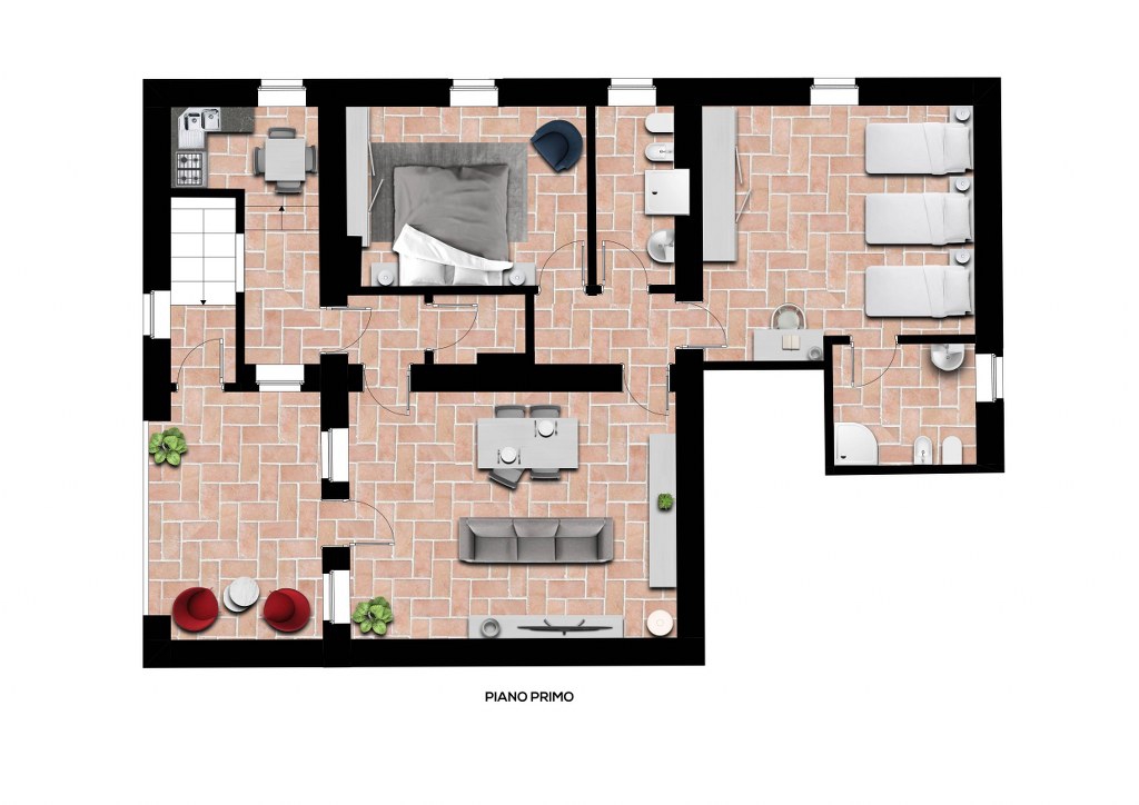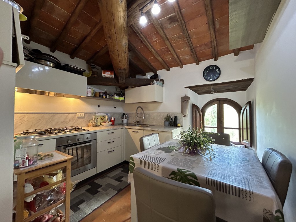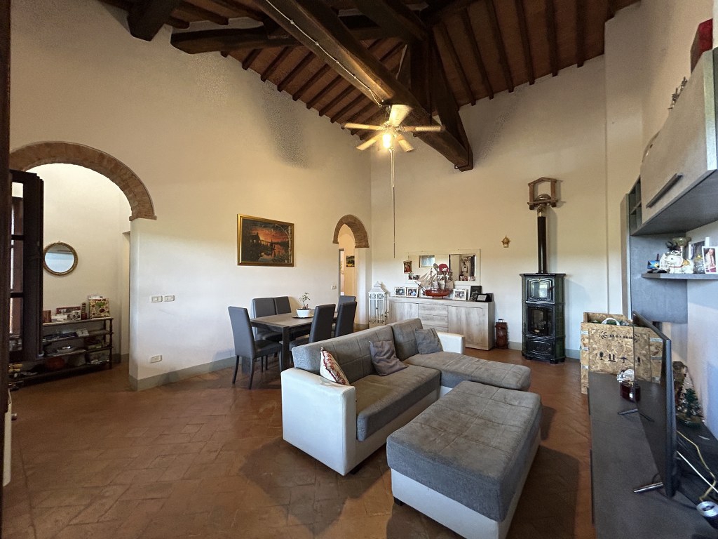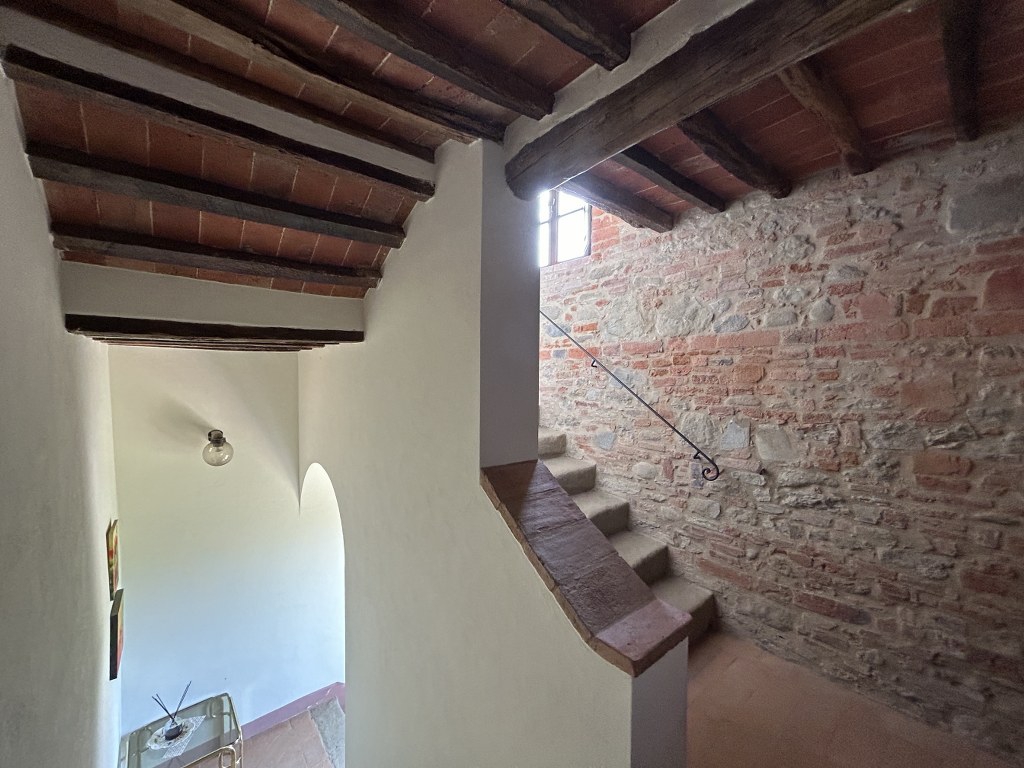 Una volta entrati, l'appartamento rivela un soggiorno/sala da pranzo spazioso e arioso con un soffitto a doppia altezza, dove la luce naturale entra dalla loggia. Una stufa a legna garantisce il comfort nei mesi più freddi, mentre un ventilatore a soffitto offre una fresca brezza in estate. L'attenta disposizione prosegue con un ampio bagno di famiglia e due invitanti camere da letto, una matrimoniale accogliente e l'altra tripla spaziosa, con bagno privato con doccia. Un piccolo corridoio conduce a un ripostiglio/caldaia e a una scala che porta alla cucina completamente attrezzata, uno spazio ideale per preparare i pasti godendo della pace della campagna.