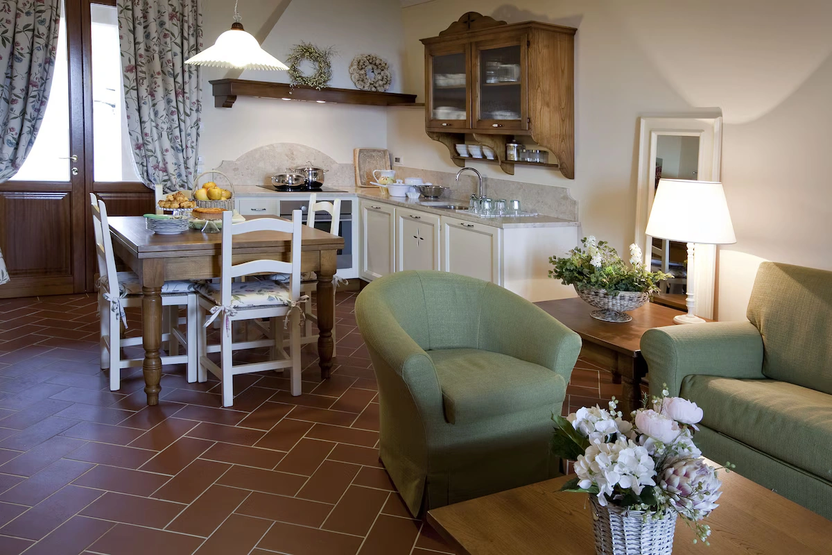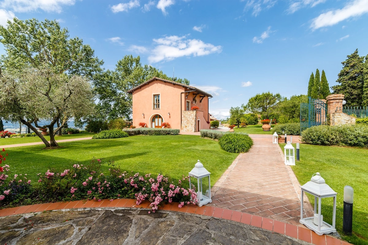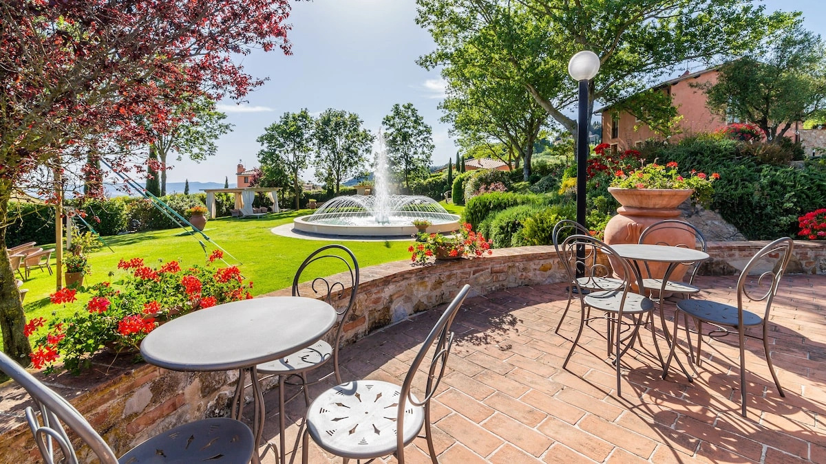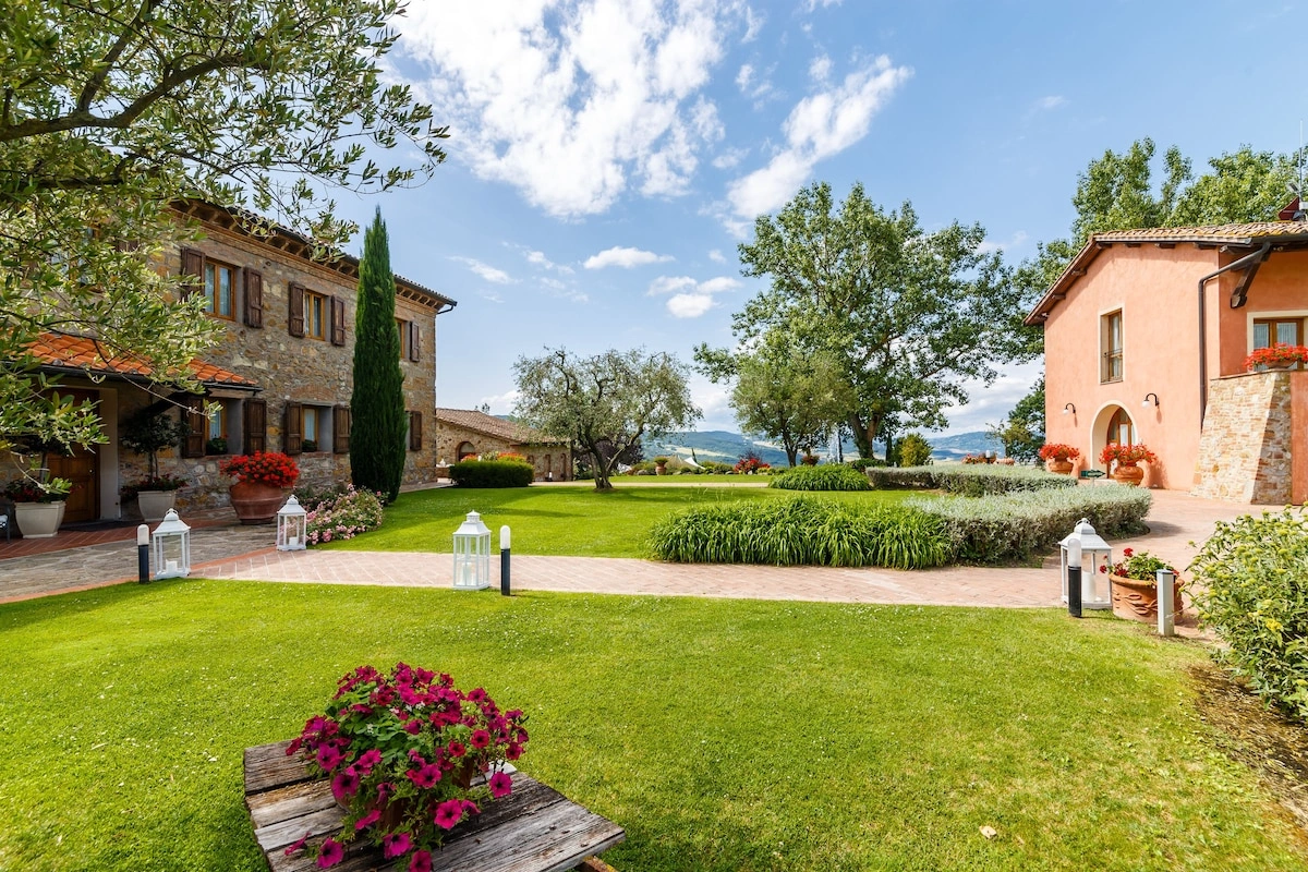 Gli edifici sono circondati da un giardino splendidamente curato, curati con attenzione e attraversati da siepi e tradizionali vialetti in terracotta realizzati nello stile dell'Impruneta.