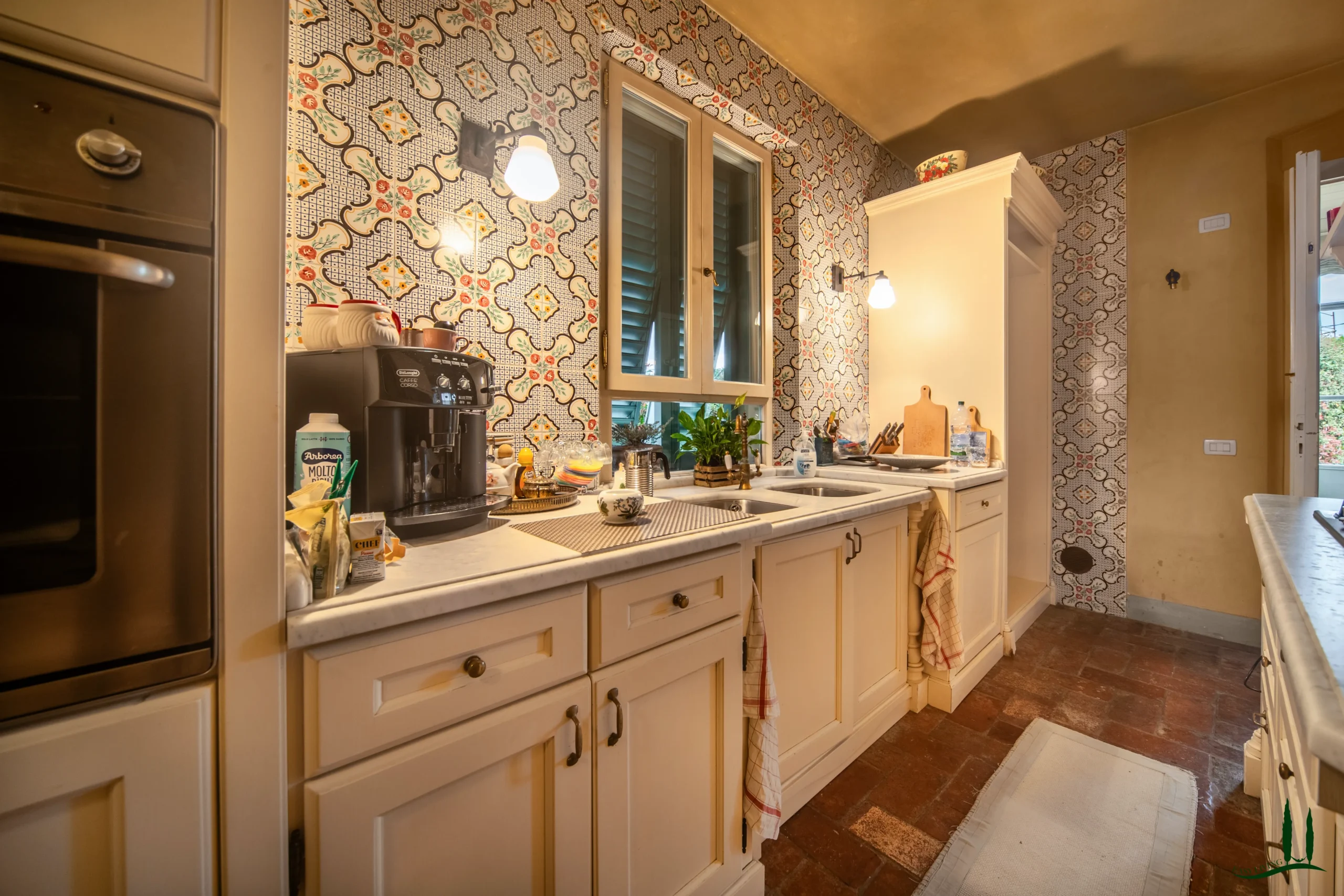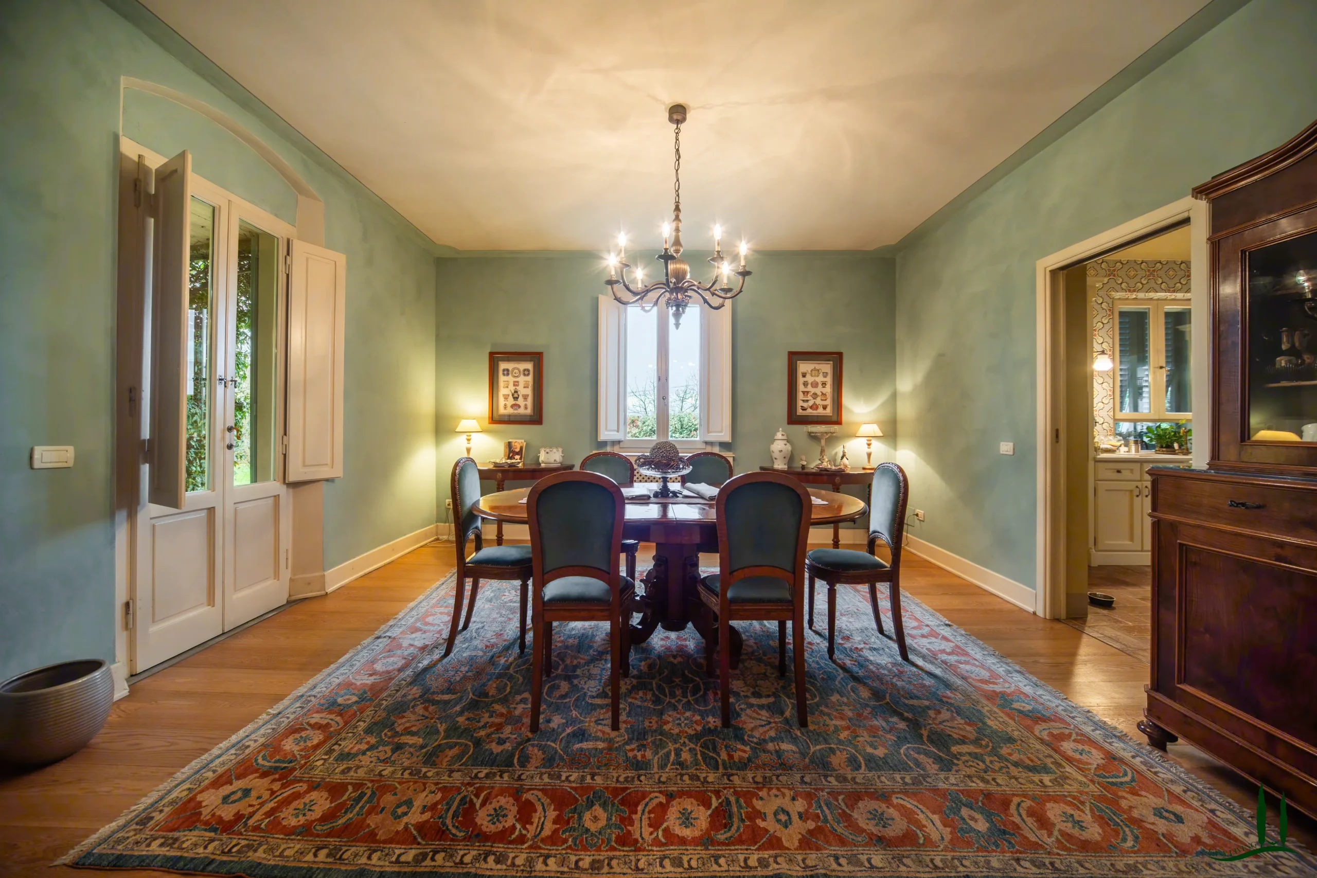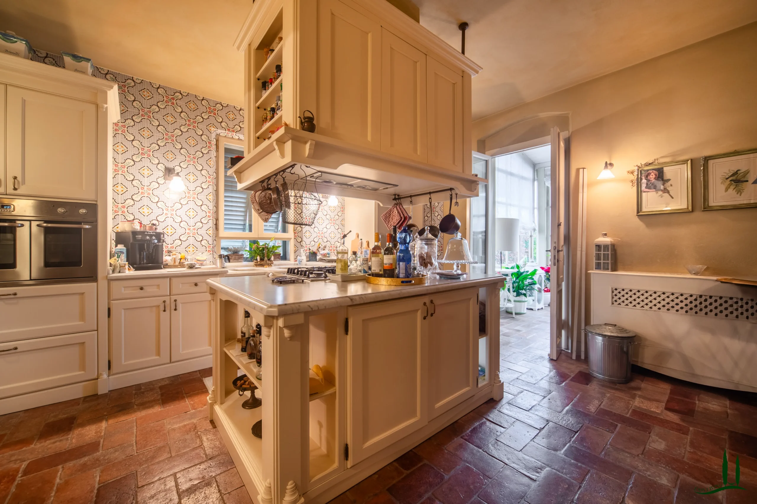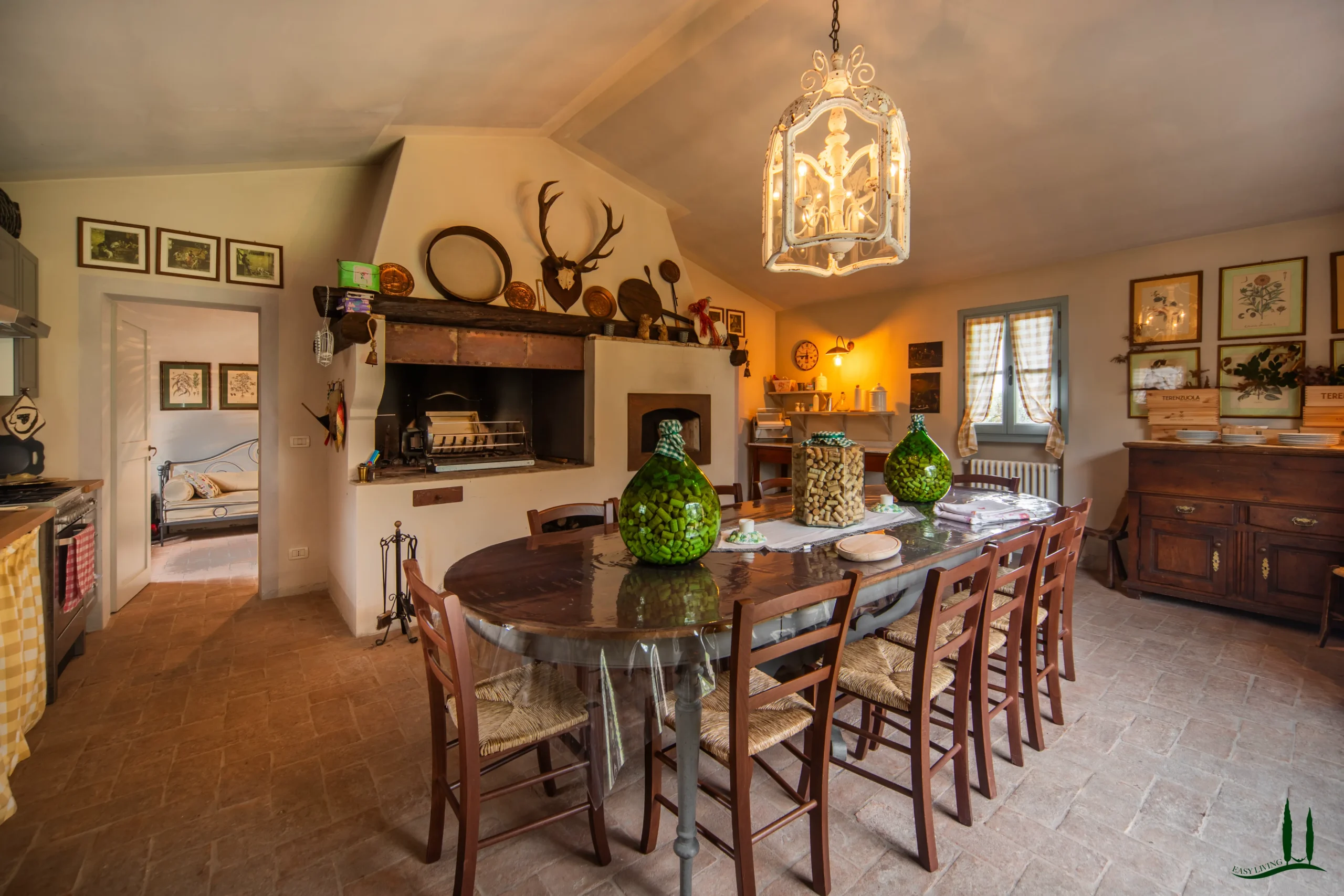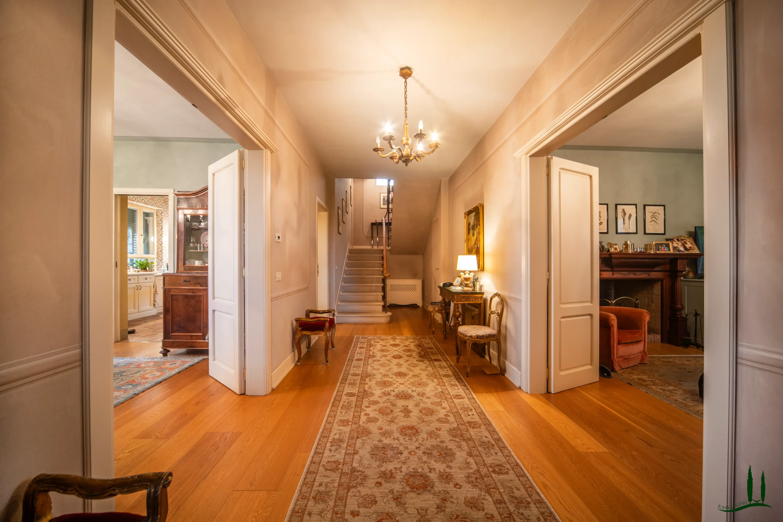 Entrando al piano terra, si viene accolti da un ampio soggiorno con un accogliente camino, perfetto per le riunioni di famiglia o per intrattenere gli ospiti. Adiacente si trova una spaziosa sala da pranzo, ideale per ospitare cene, e una grande cucina completamente attrezzata che integra perfettamente materiali classici italiani come marmo, terracotta e legno di provenienza locale per i mobili. La cucina si apre su un incantevole giardino d'inverno, che offre uno spazio invitante per il relax durante tutto l'anno. Inoltre, questo piano comprende un bagno per gli ospiti, un ufficio privato e una lavanderia per una maggiore comodità.