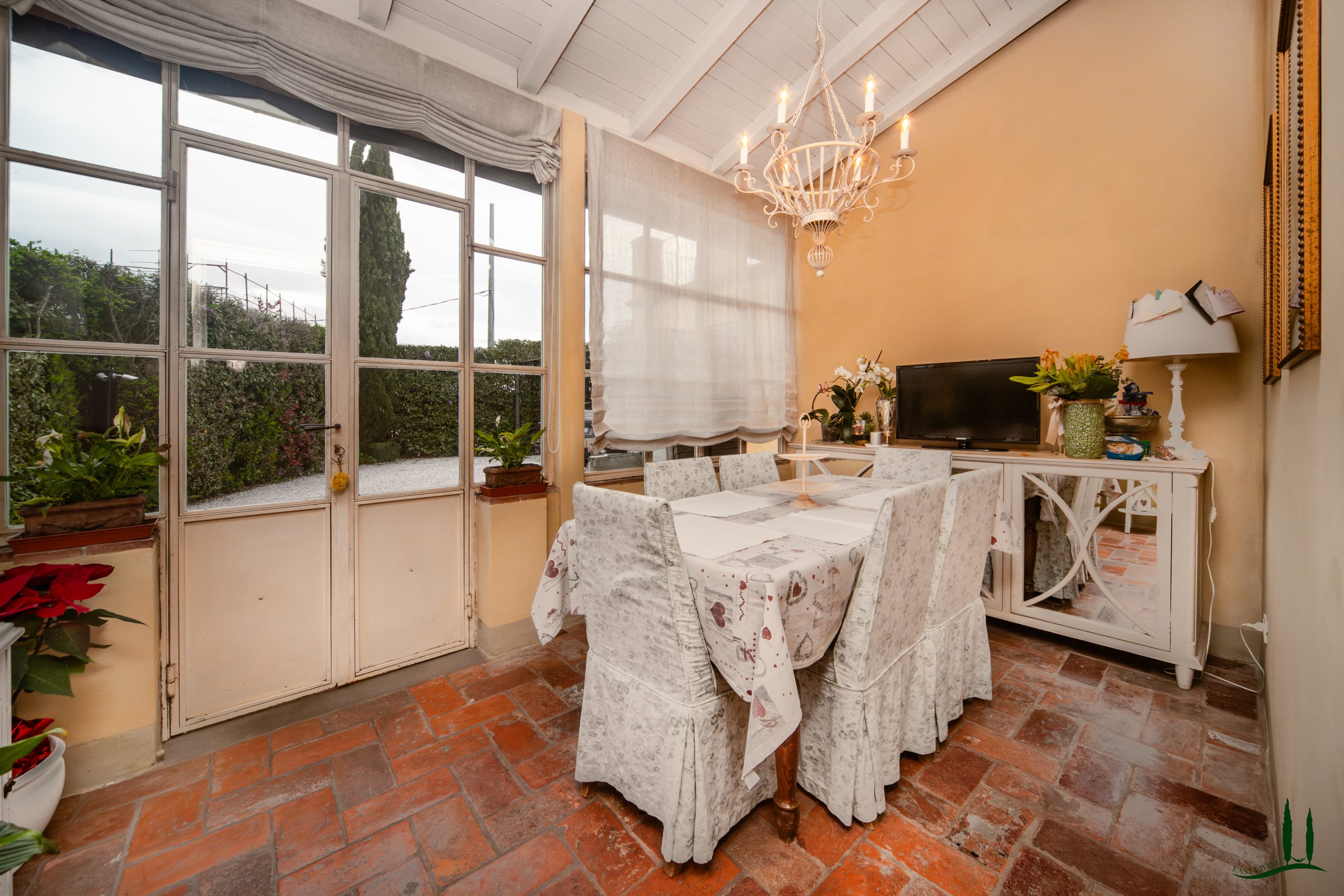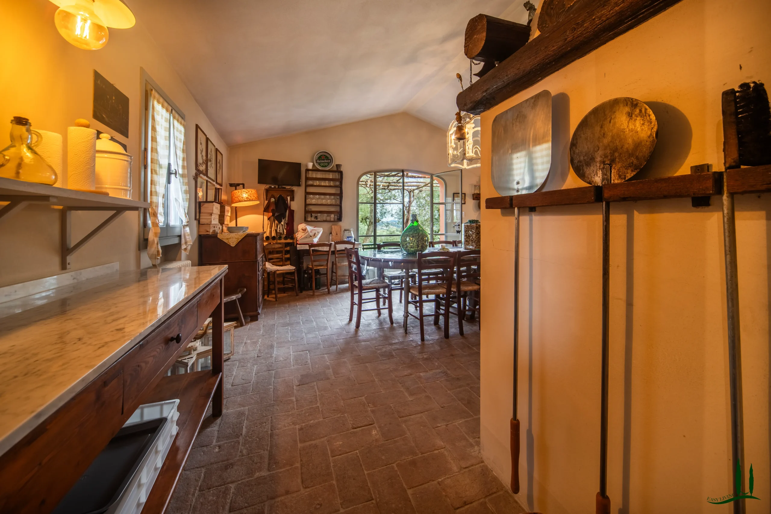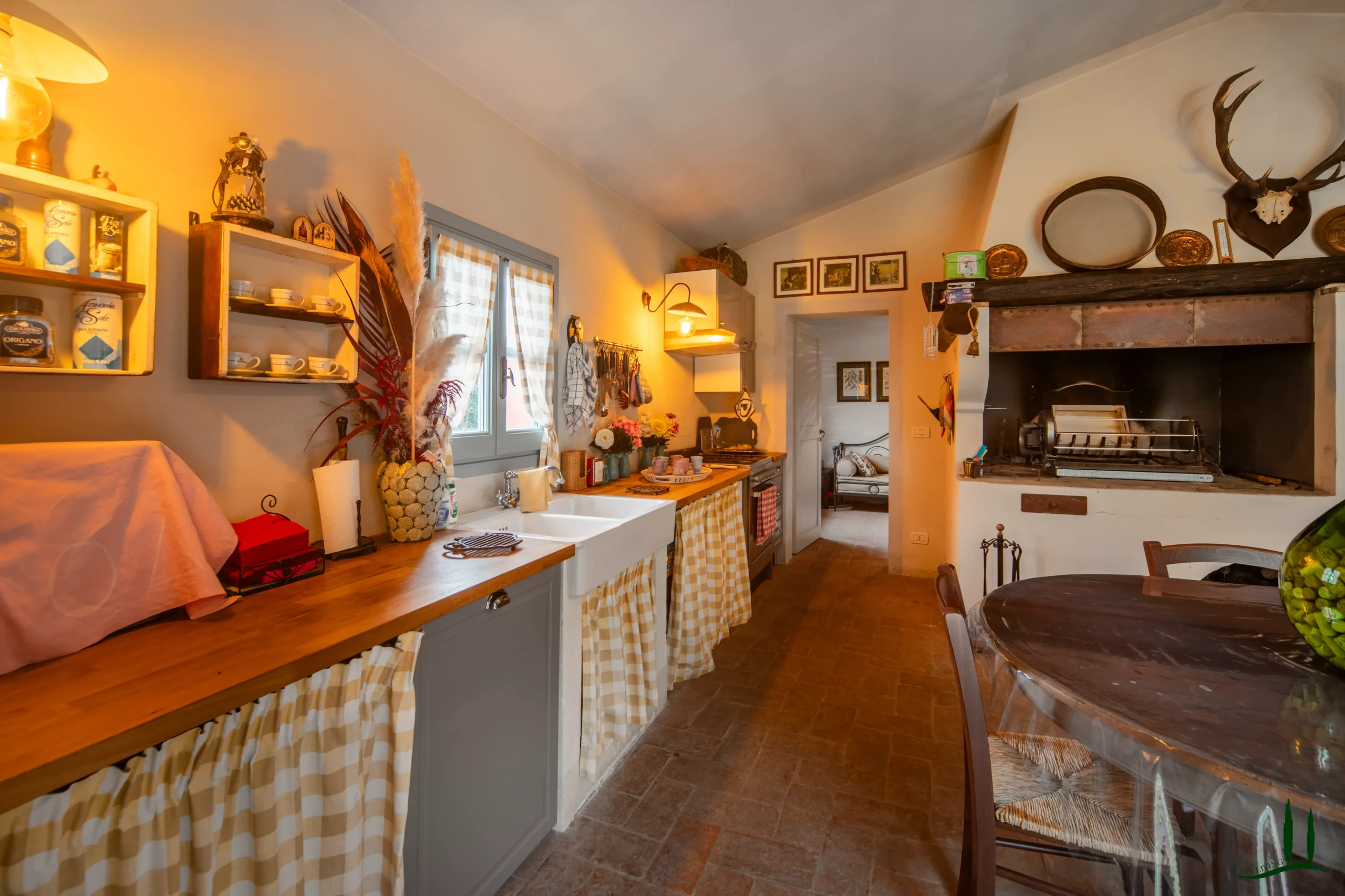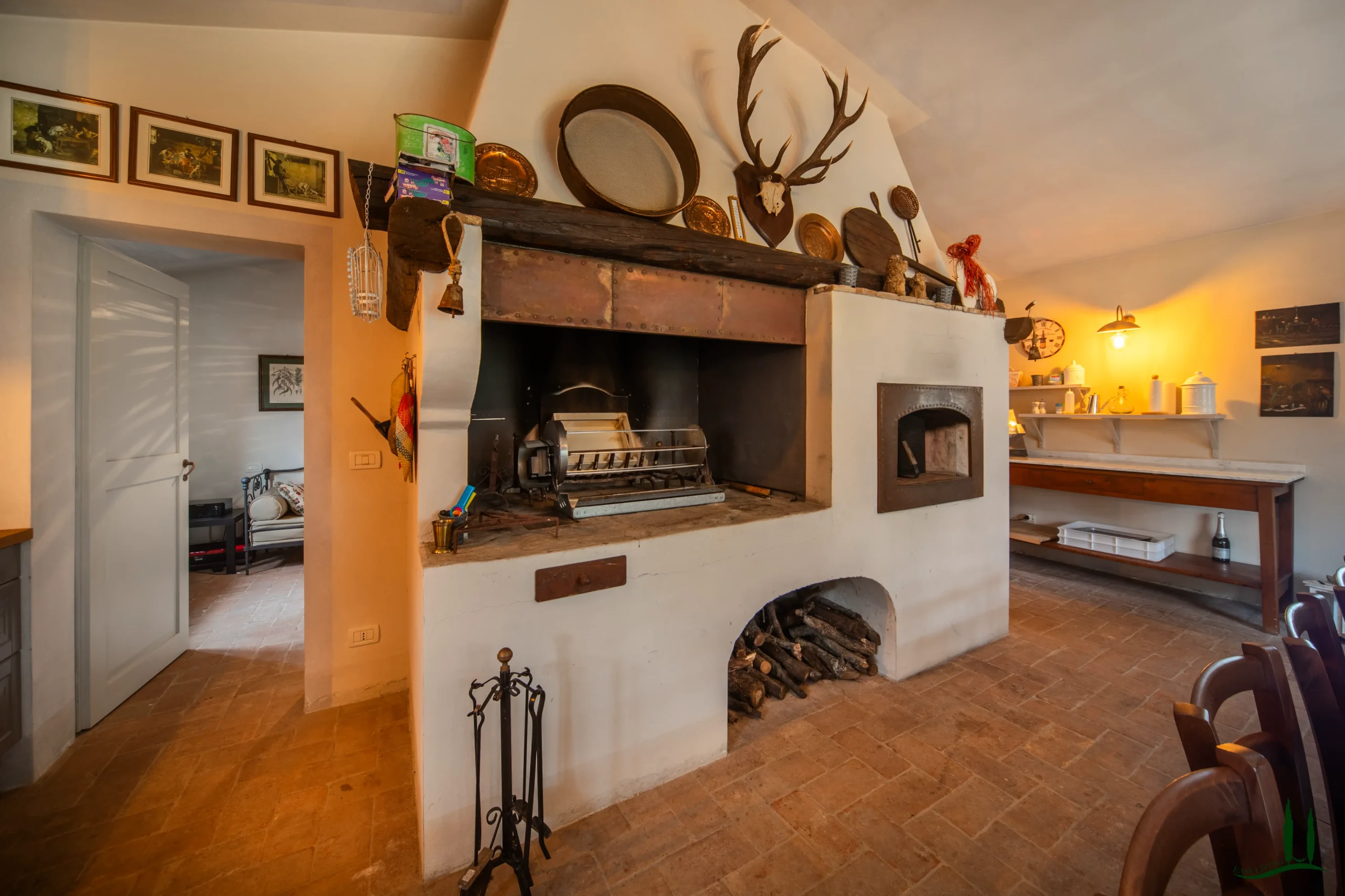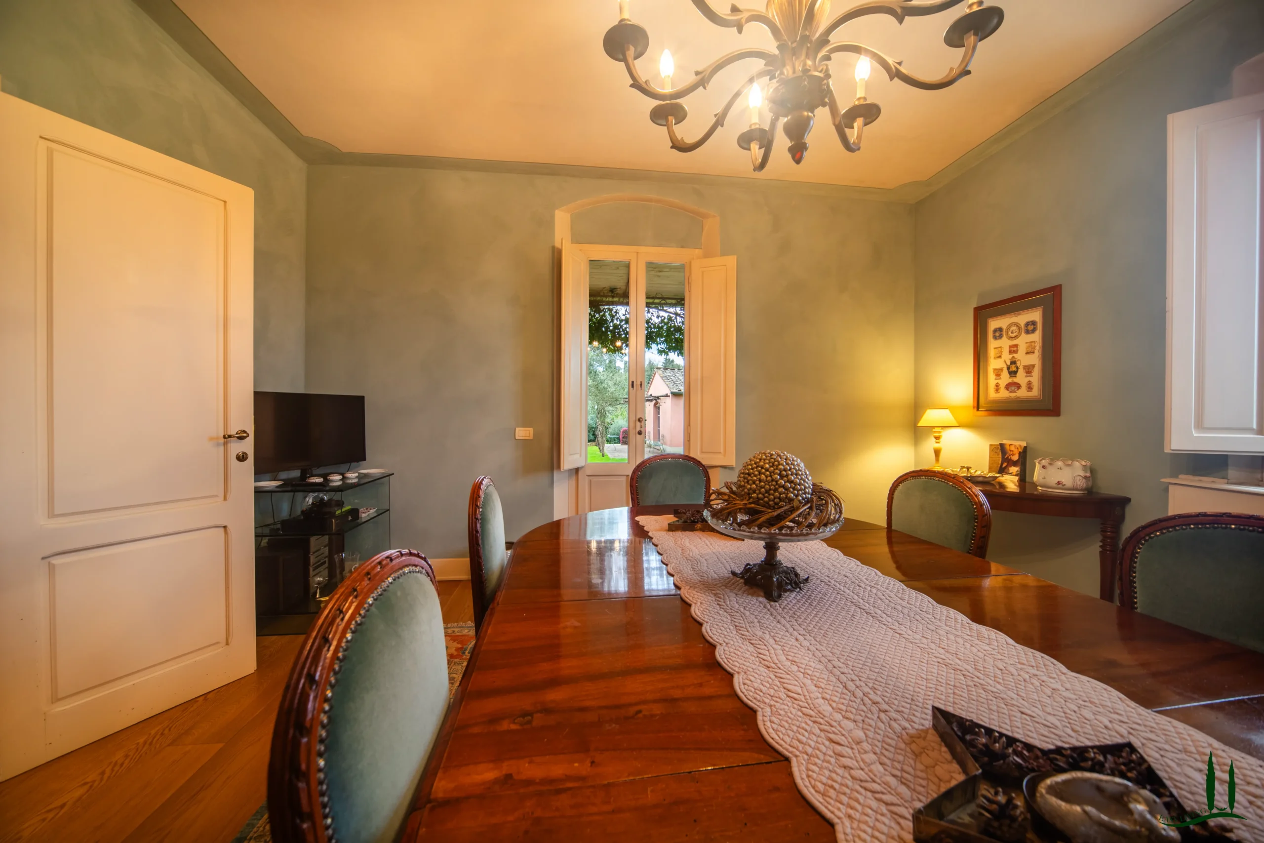 Entrando al piano terra, si viene accolti da un ampio soggiorno con un accogliente camino, perfetto per le riunioni di famiglia o per intrattenere gli ospiti. Adiacente si trova una spaziosa sala da pranzo, ideale per ospitare cene, e una grande cucina completamente attrezzata che integra perfettamente materiali classici italiani come marmo, terracotta e legno di provenienza locale per i mobili. La cucina si apre su un incantevole giardino d'inverno, che offre uno spazio invitante per il relax durante tutto l'anno. Inoltre, questo piano comprende un bagno per gli ospiti, un ufficio privato e una lavanderia per una maggiore comodità.