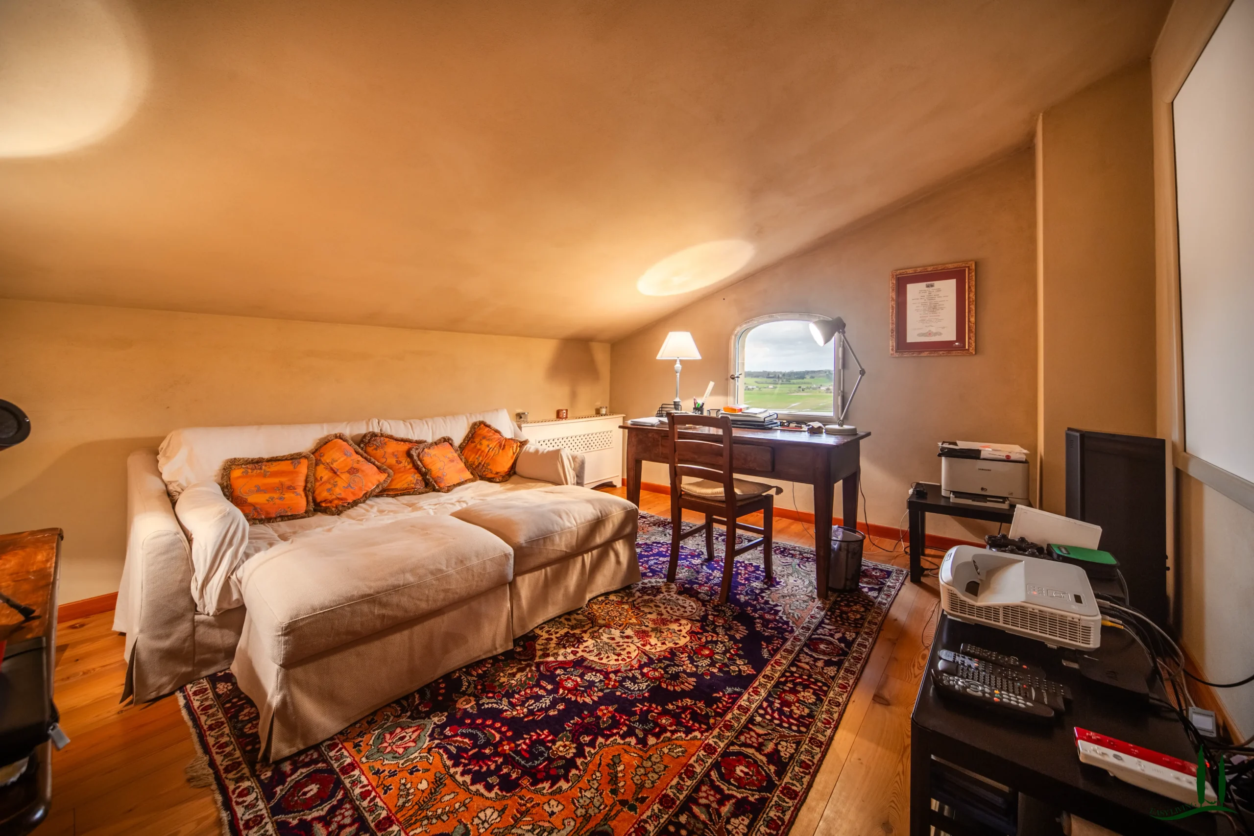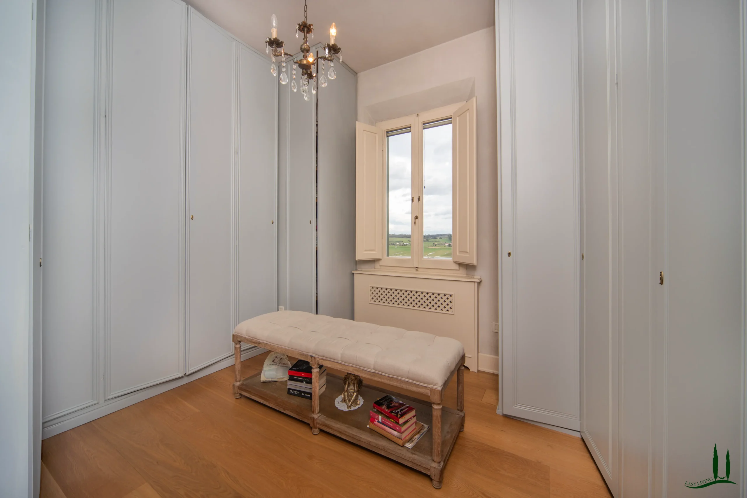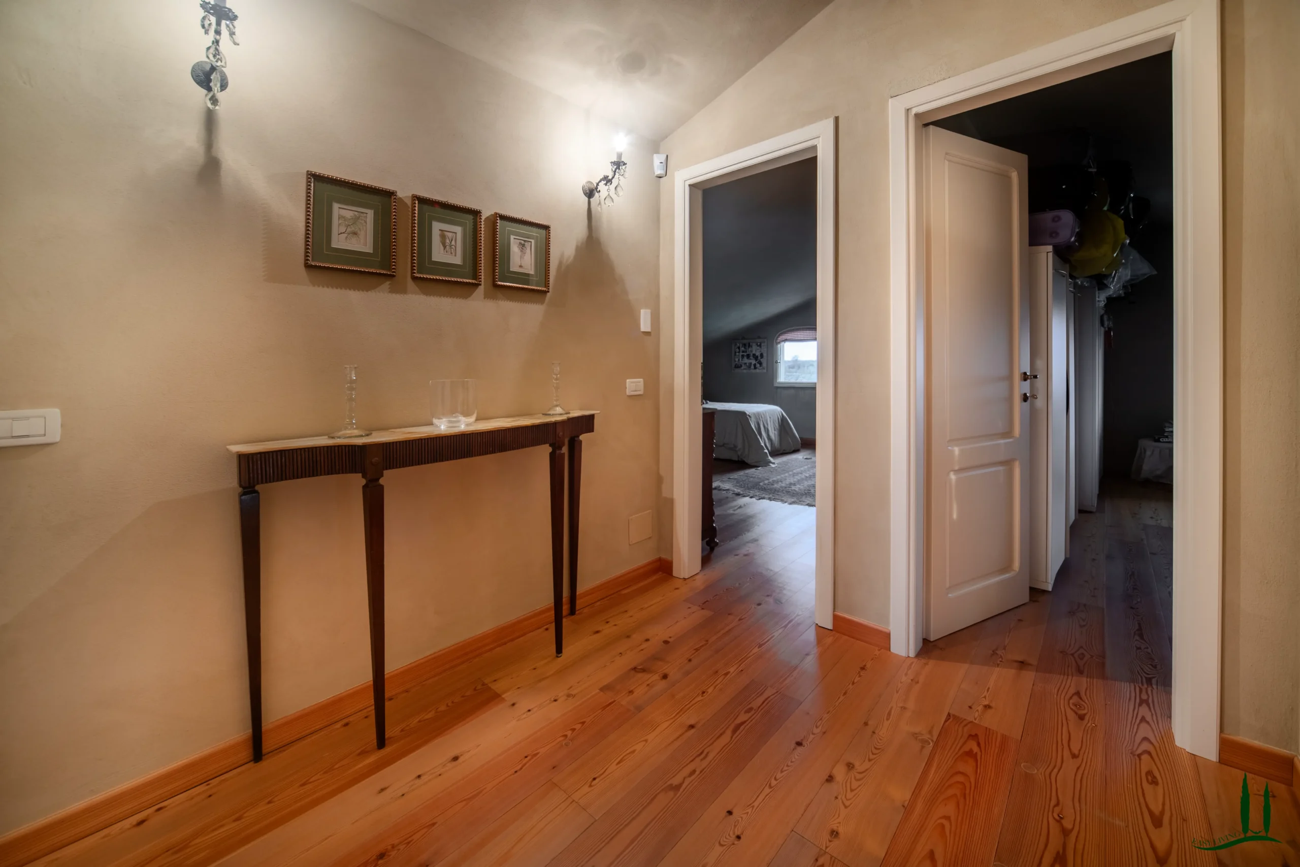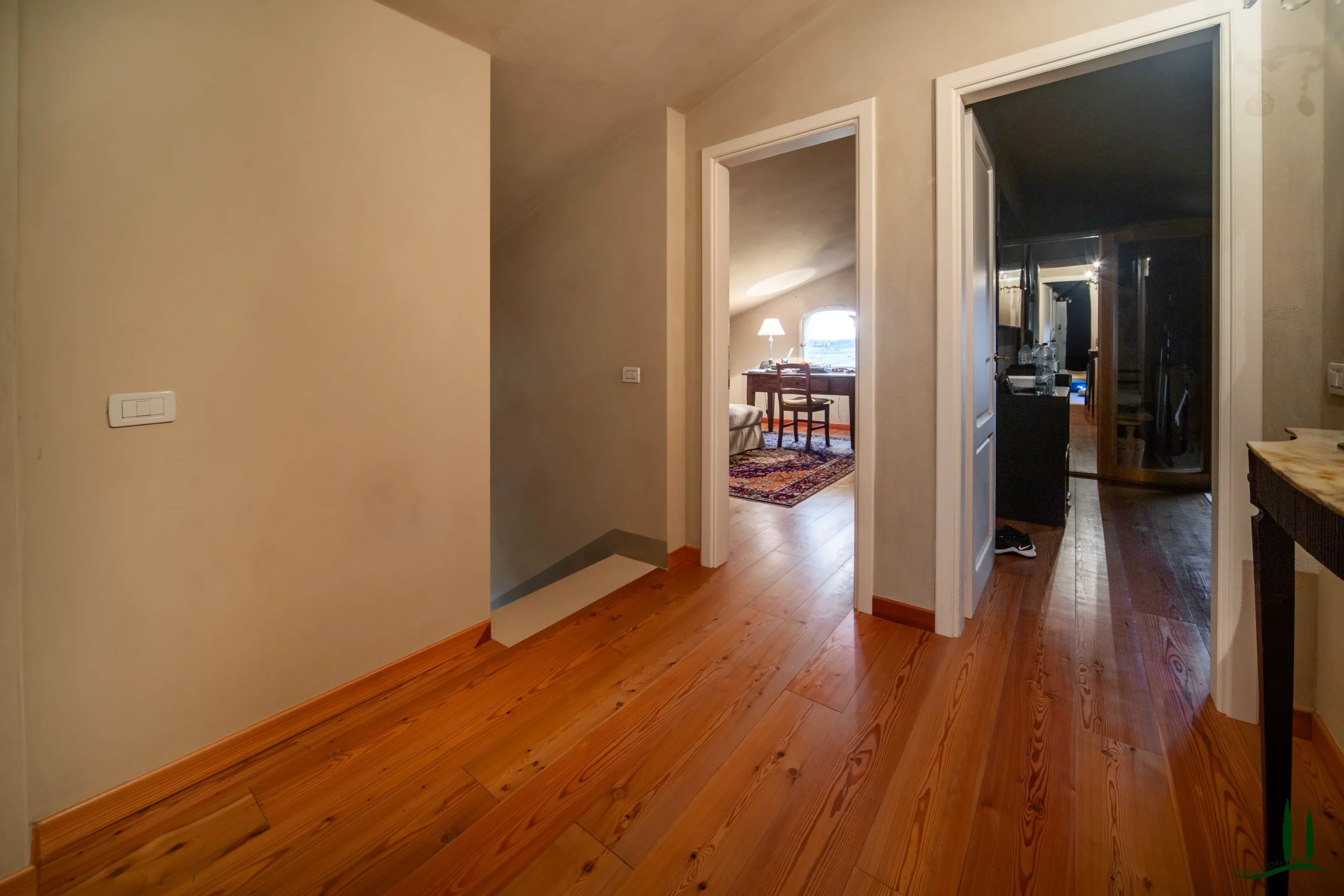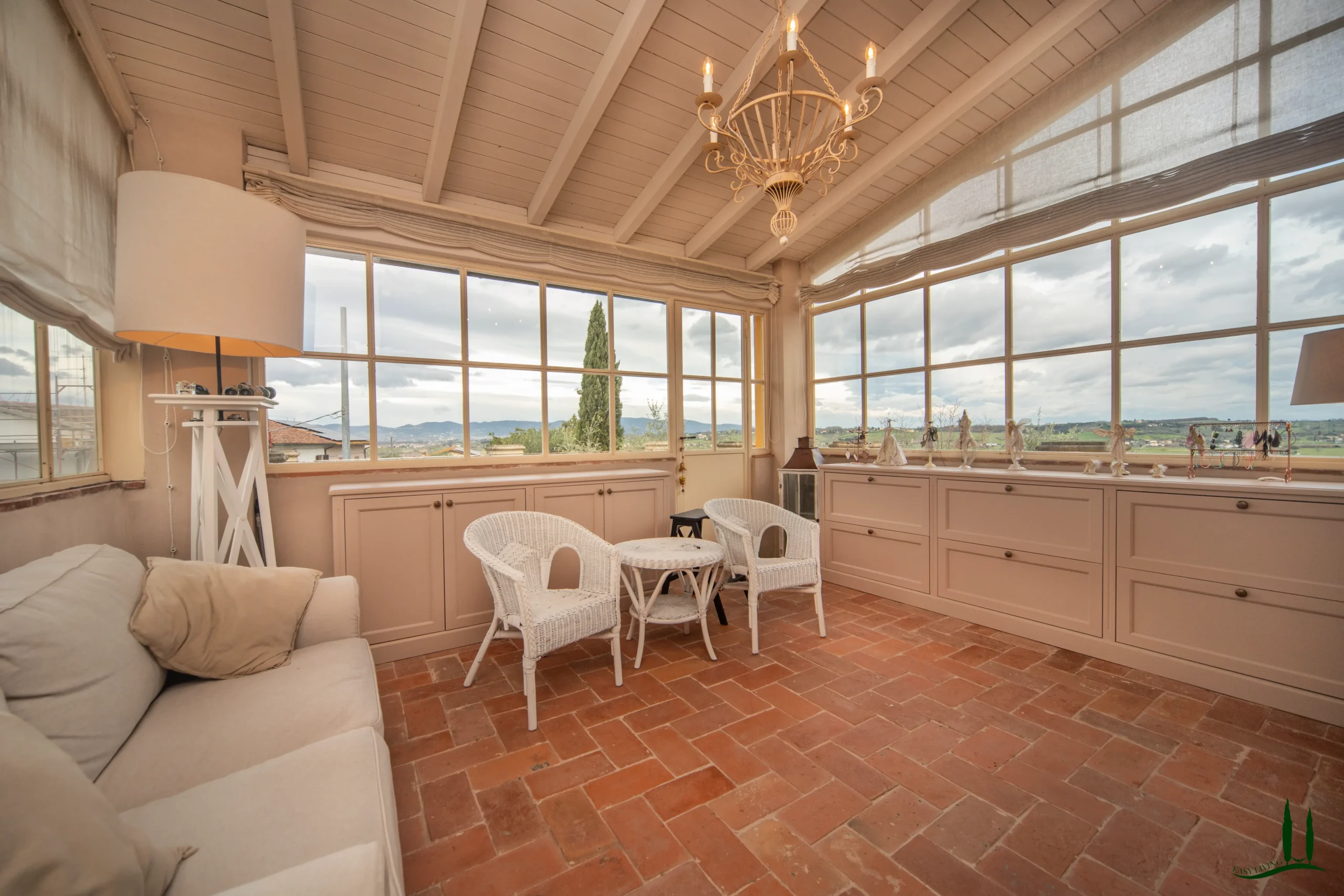 Una grande scala conduce al primo piano, dove si trovano tre camere da letto di dimensioni generose, ognuna con il proprio bagno privato. Su questo livello si trovano anche una cabina armadio dedicata e una chicca nascosta: una veranda in vetro di 15 mq che si immerge nella luce naturale, perfetta per leggere, gustare un caffè mattutino o semplicemente per rilassarsi. La veranda conduce a un'ampia terrazza con una splendida vista sulla campagna circostante.