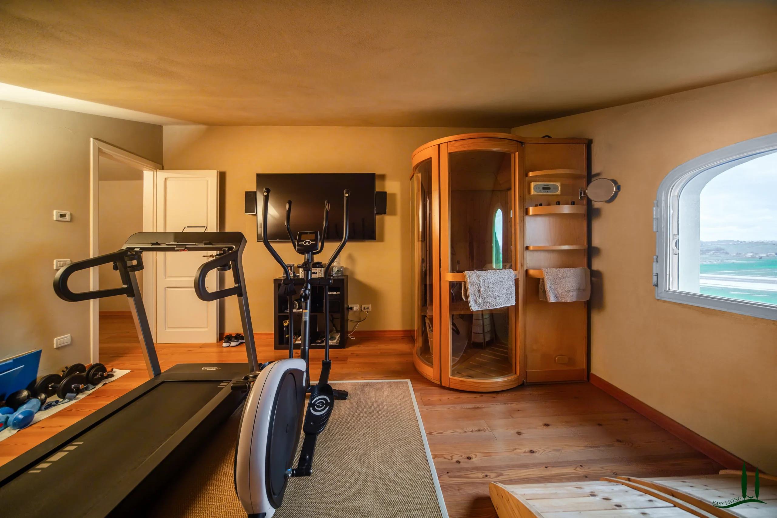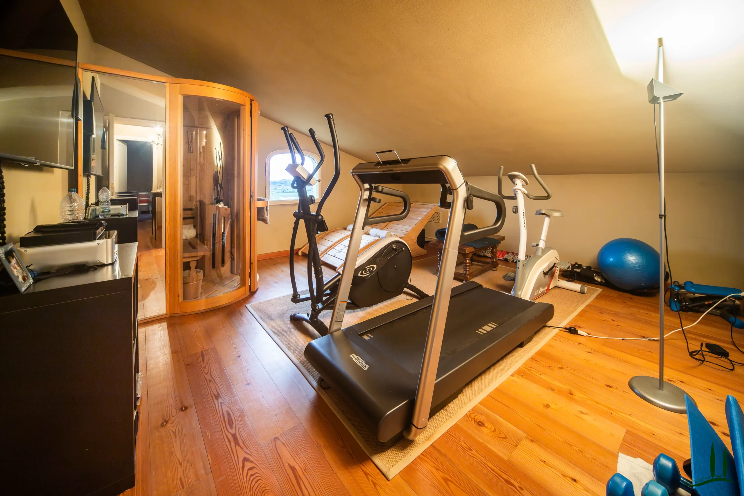 Il terzo piano è dedicato al tempo libero e al relax, con due ulteriori camere da letto, un bagno, un accogliente home theater e una palestra completamente attrezzata con sauna, ideale per rilassarsi dopo una lunga giornata. Per comodità, la villa comprende anche un parcheggio coperto per due auto sul retro.
