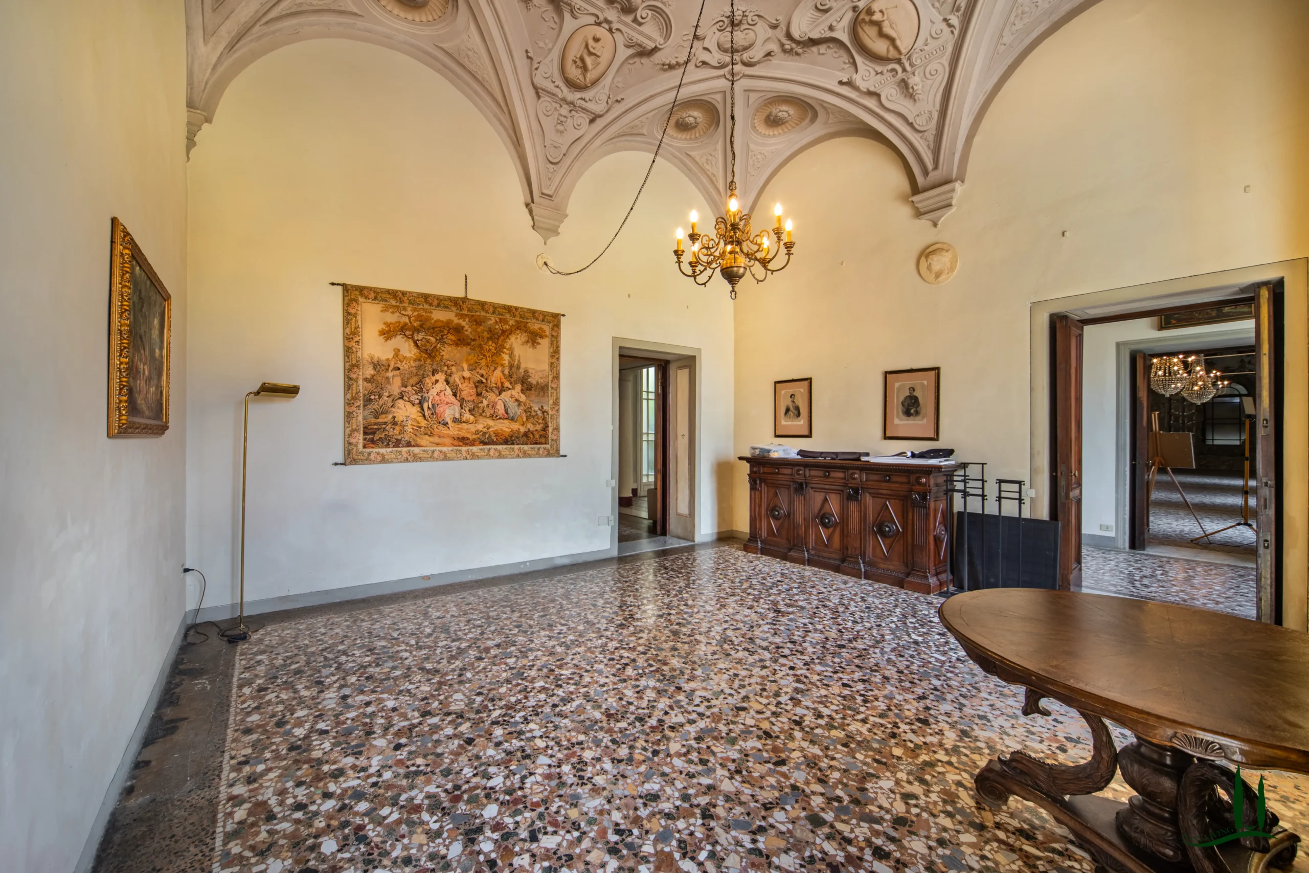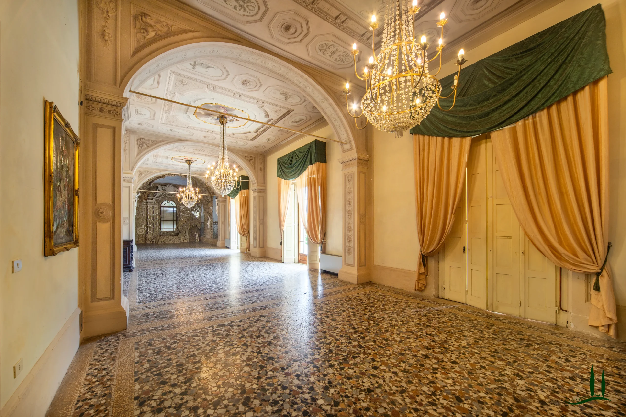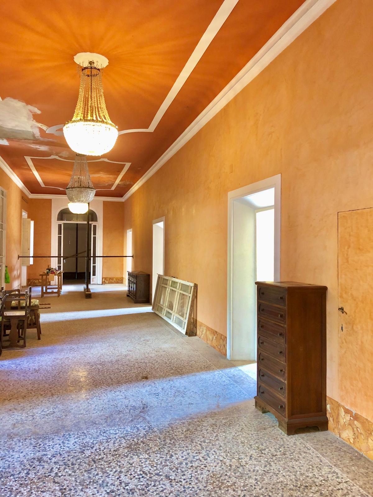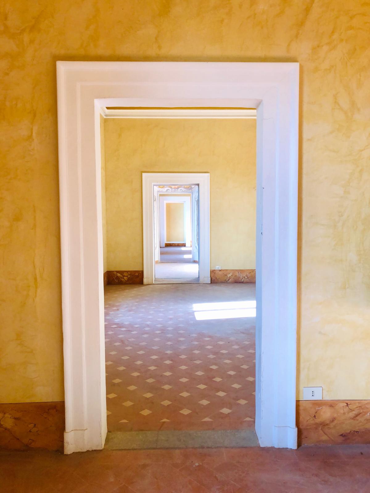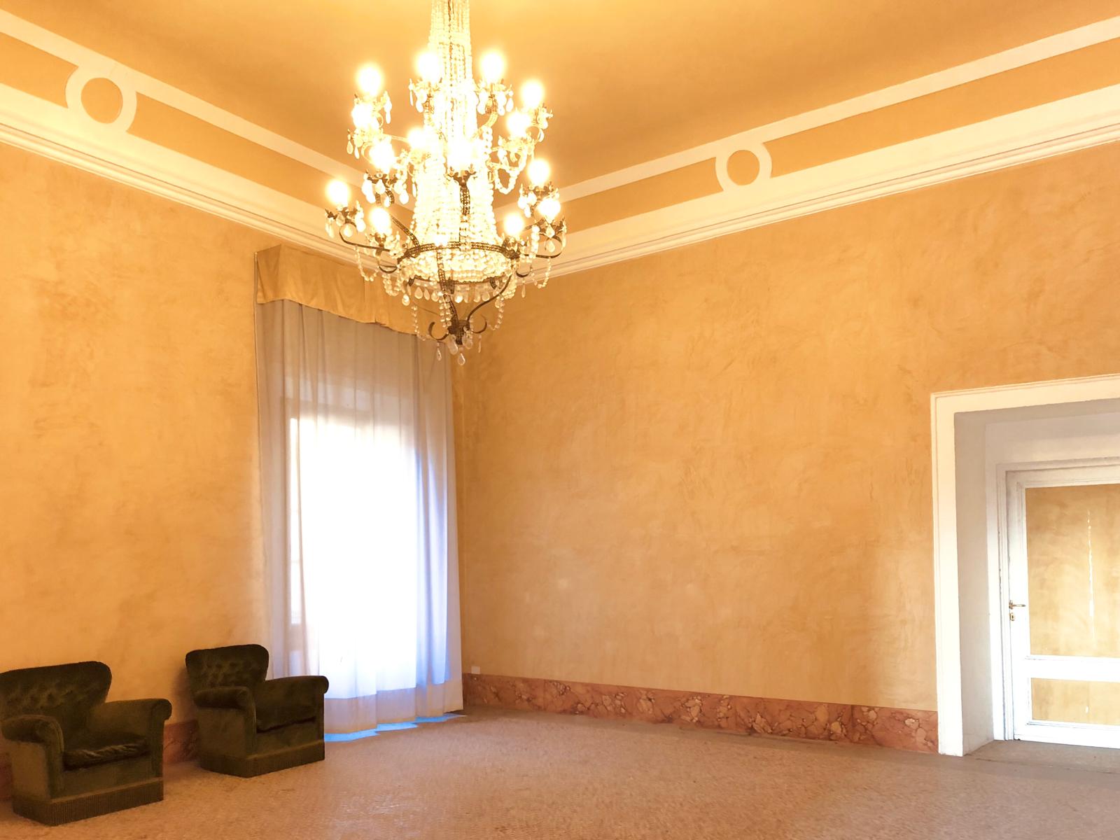 La villa si apre su un'impressionante ingresso monumentale, che conduce a una serie di grandi sale di ricevimento progettate per garantire eleganza e comfort. Il cuore della struttura è la magnifica sala da ballo di 170 metri quadrati, con soffitti alti e proporzioni generose: un ambiente ideale per incontri formali, concerti o eventi privati. Le sale circostanti conservano stucchi originali, affreschi, e pavimenti decorativi che evocano lo splendore dei secoli passati.