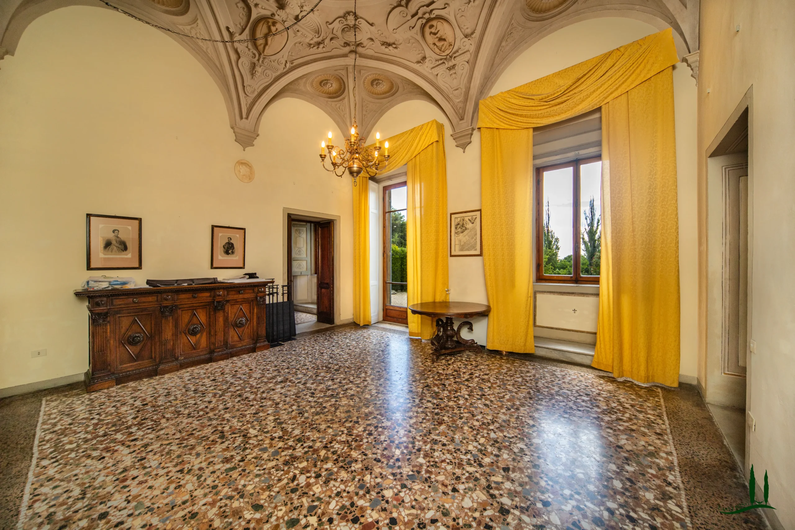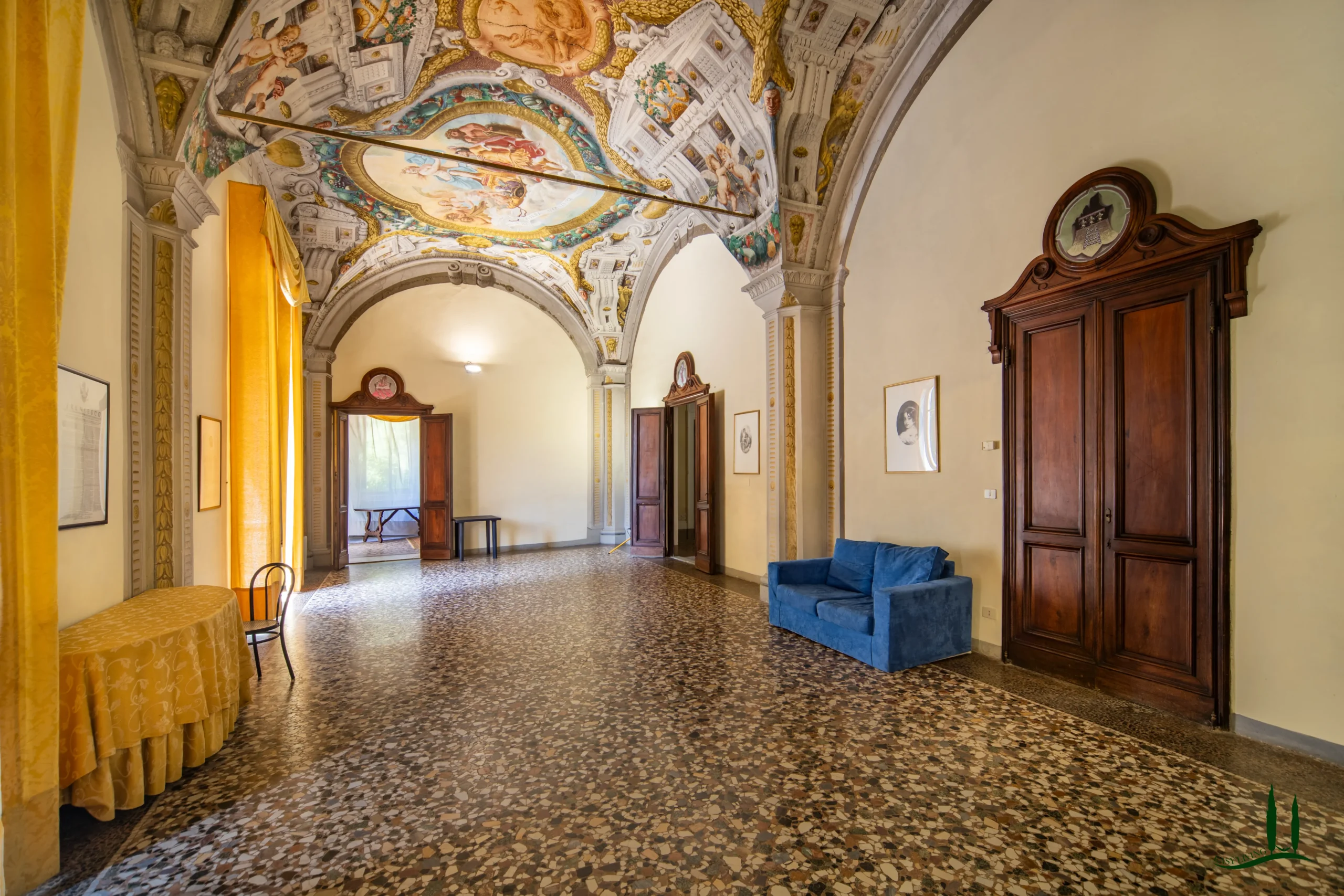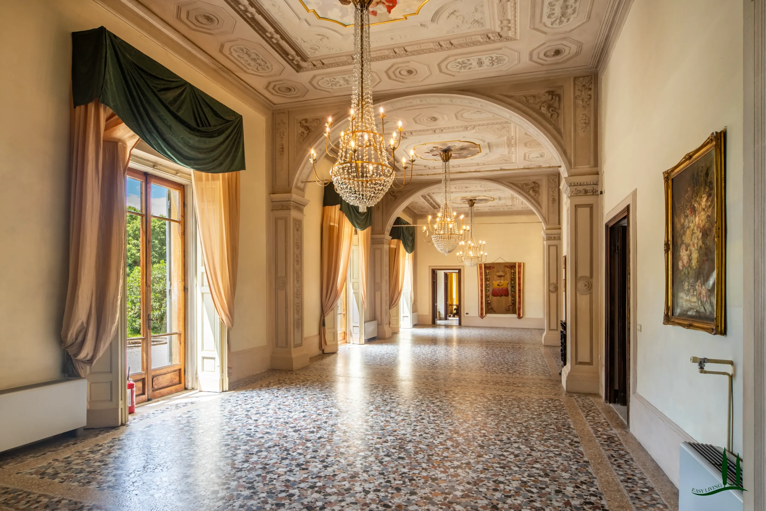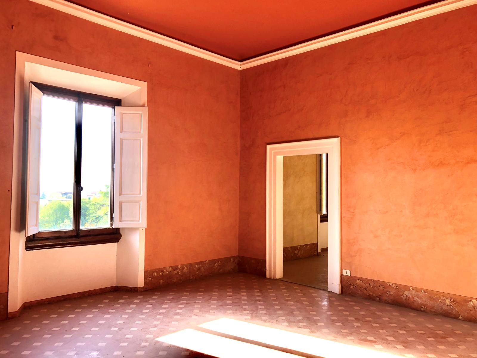 La villa si apre su un'impressionante ingresso monumentale, che conduce a una serie di grandi sale di ricevimento progettate per garantire eleganza e comfort. Il cuore della struttura è la magnifica sala da ballo di 170 metri quadrati, con soffitti alti e proporzioni generose: un ambiente ideale per incontri formali, concerti o eventi privati. Le sale circostanti conservano stucchi originali, affreschi, e pavimenti decorativi che evocano lo splendore dei secoli passati.