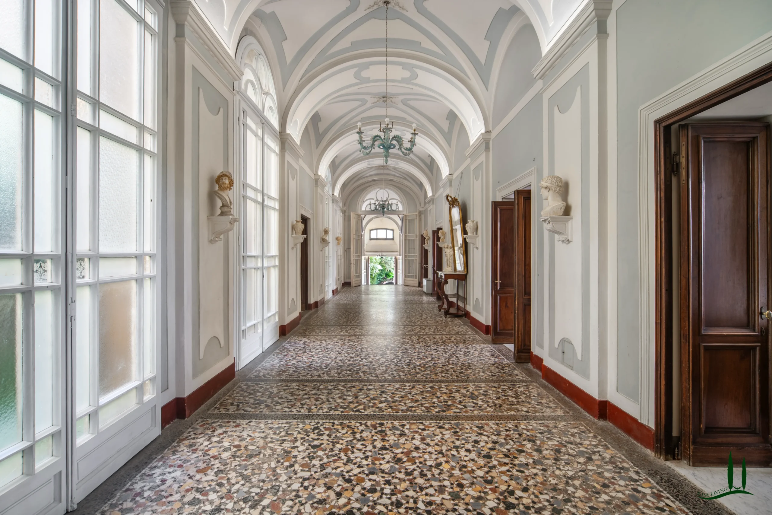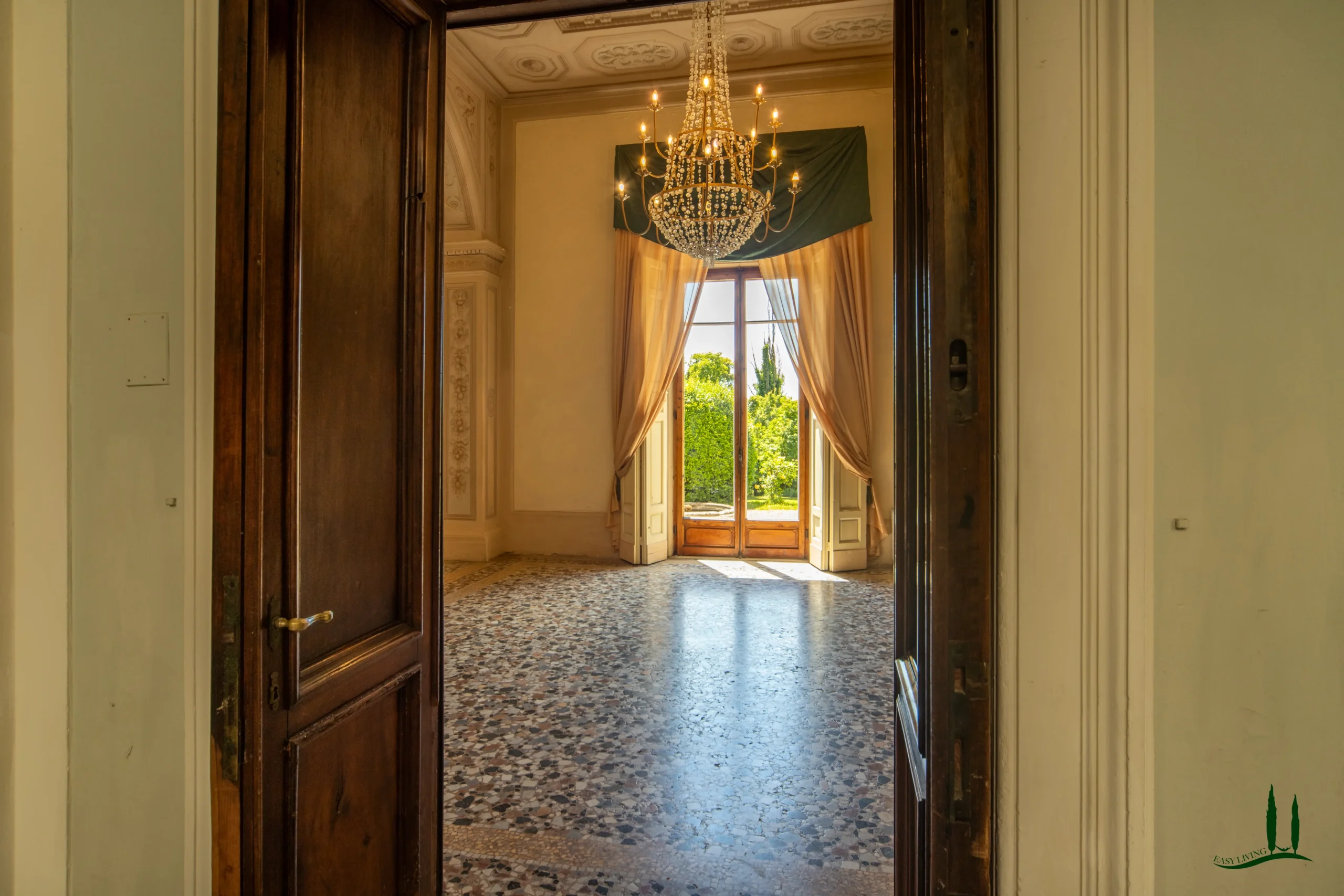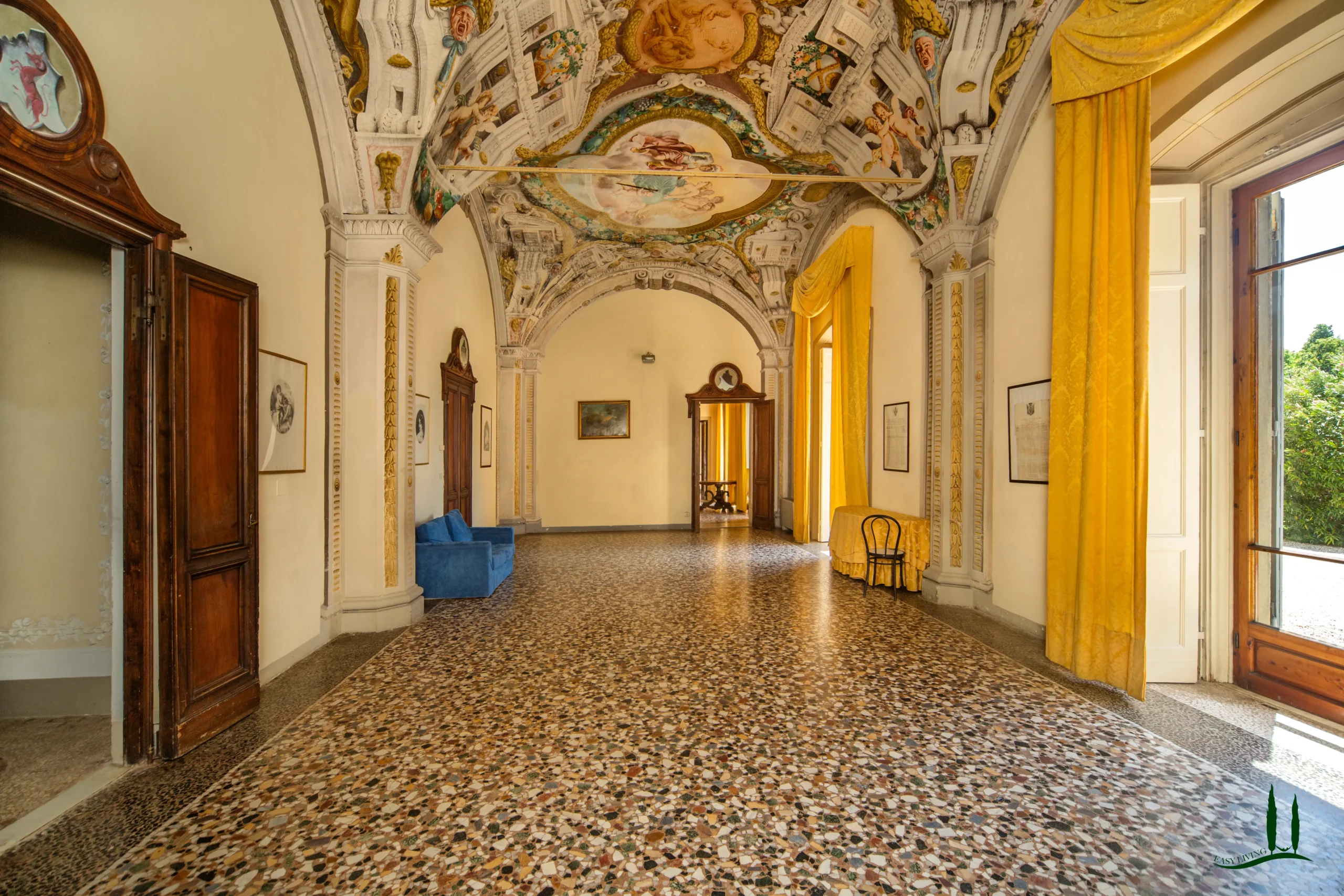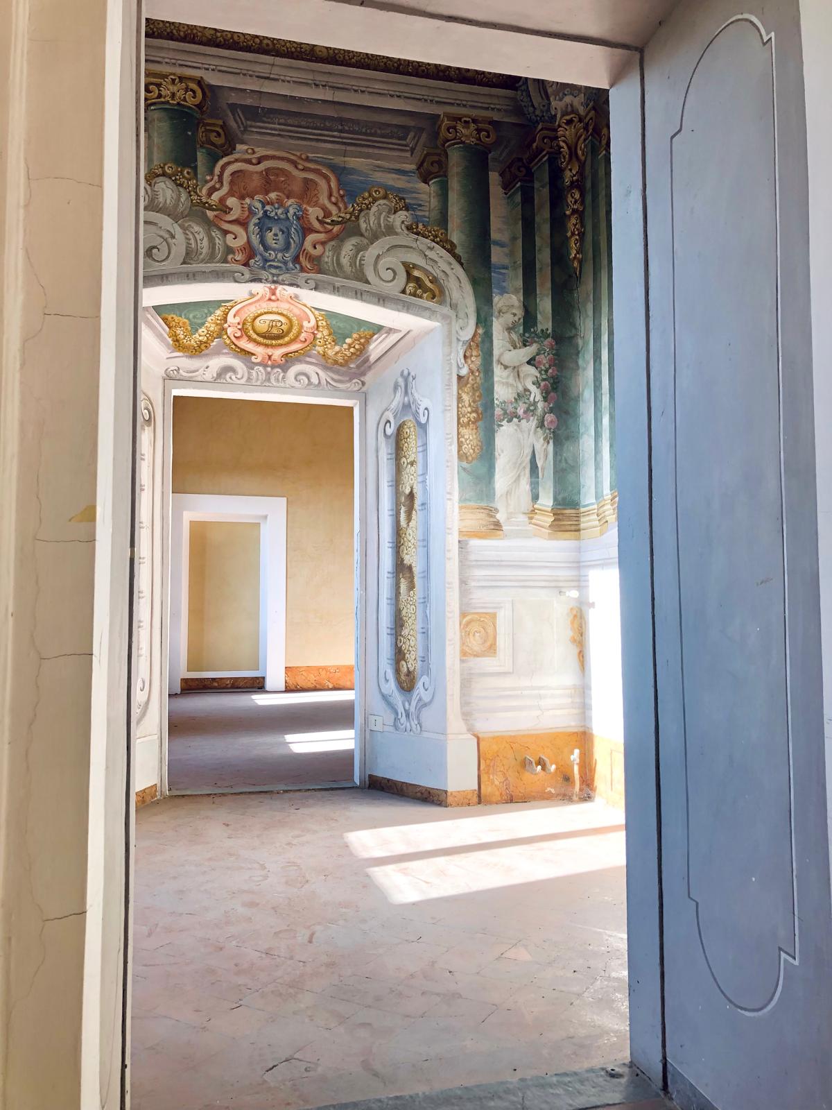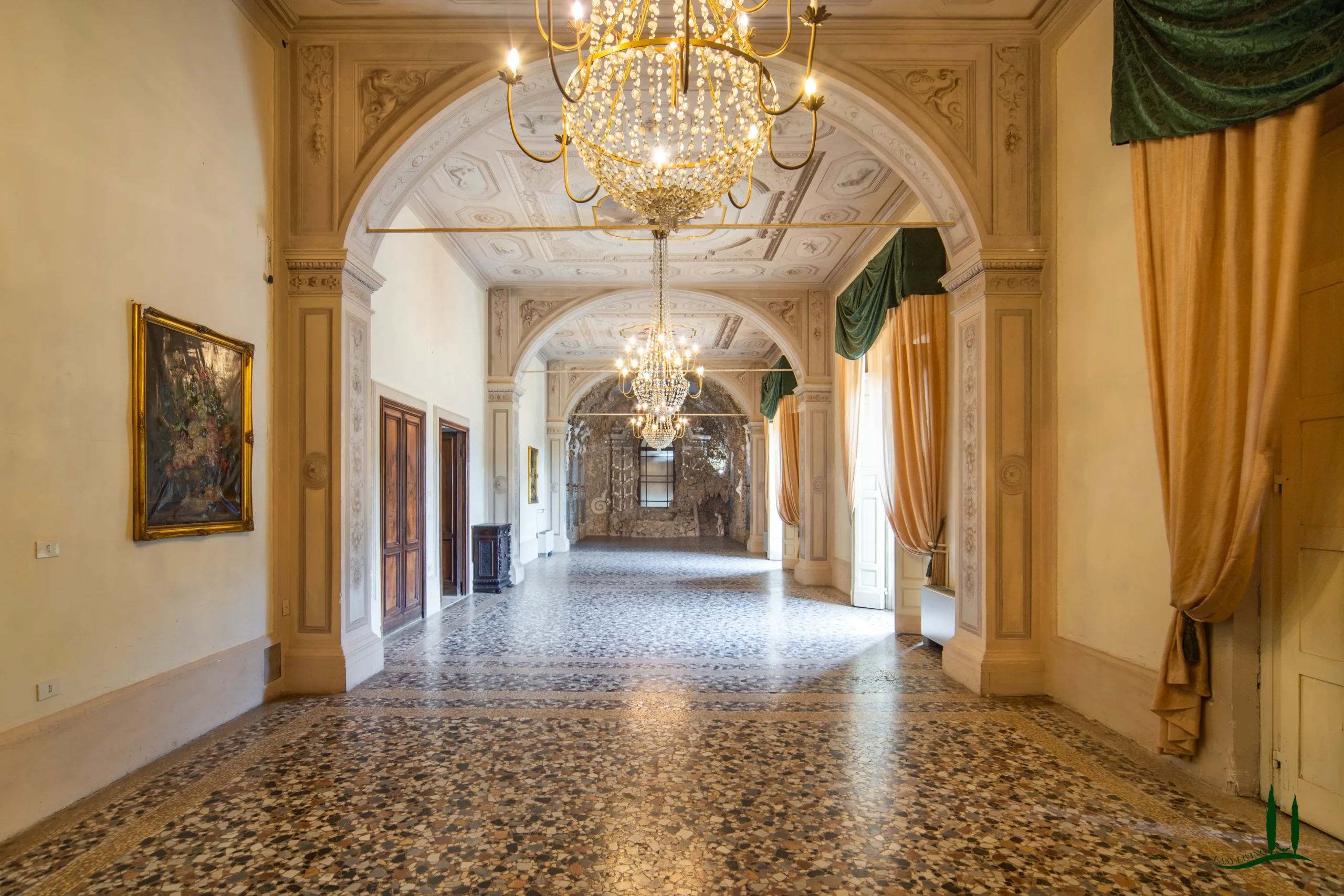 La villa si apre su un'impressionante ingresso monumentale, che conduce a una serie di grandi sale di ricevimento progettate per garantire eleganza e comfort. Il cuore della struttura è la magnifica sala da ballo di 170 metri quadrati, con soffitti alti e proporzioni generose: un ambiente ideale per incontri formali, concerti o eventi privati. Le sale circostanti conservano stucchi originali, affreschi, e pavimenti decorativi che evocano lo splendore dei secoli passati.