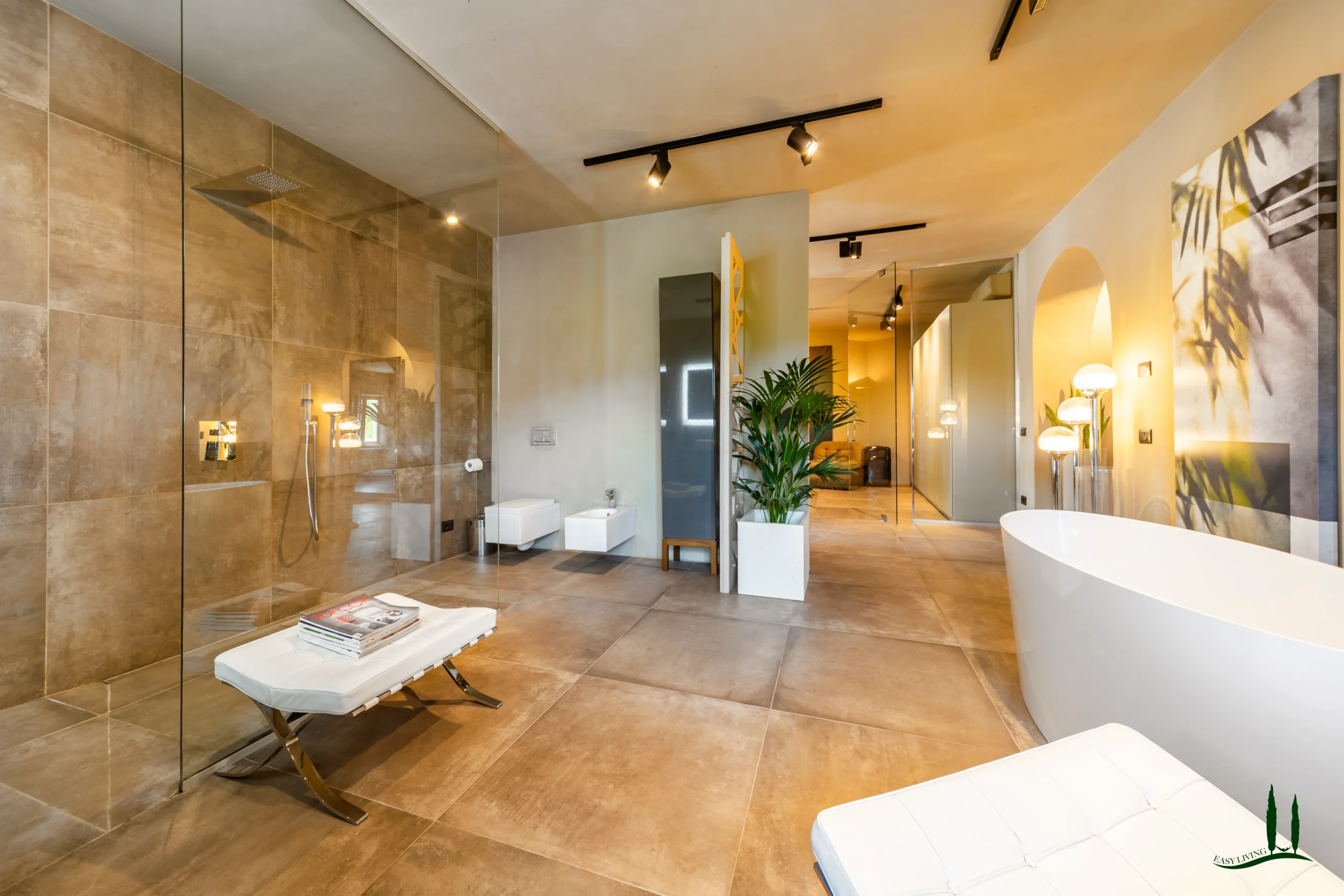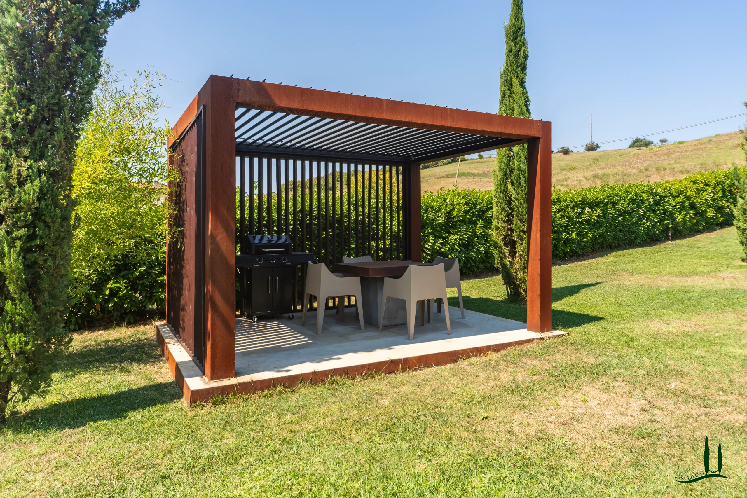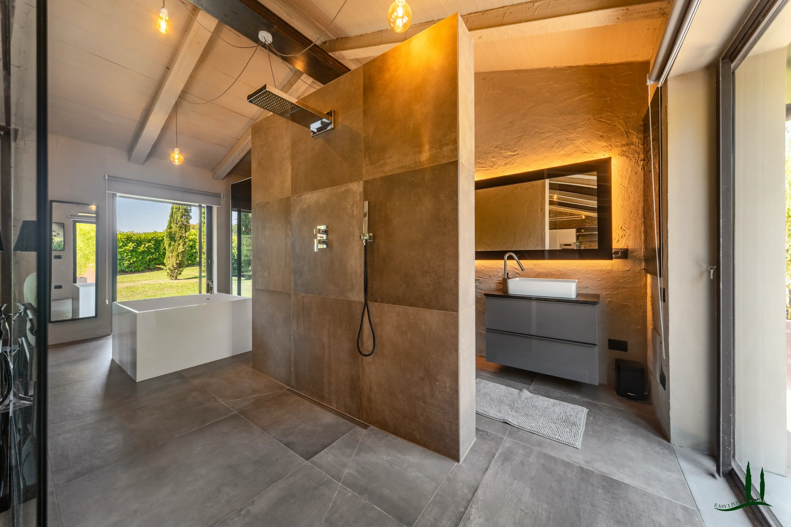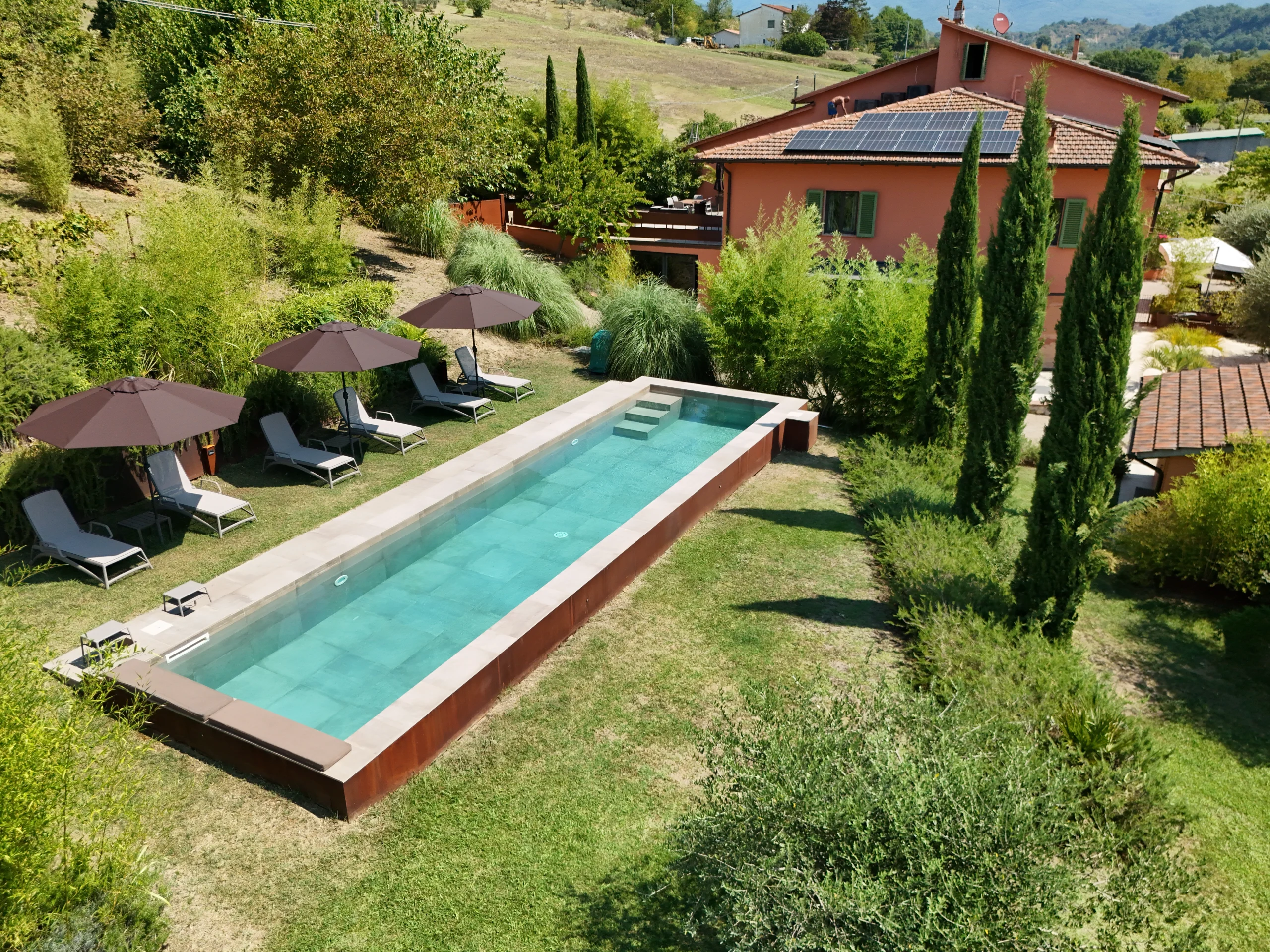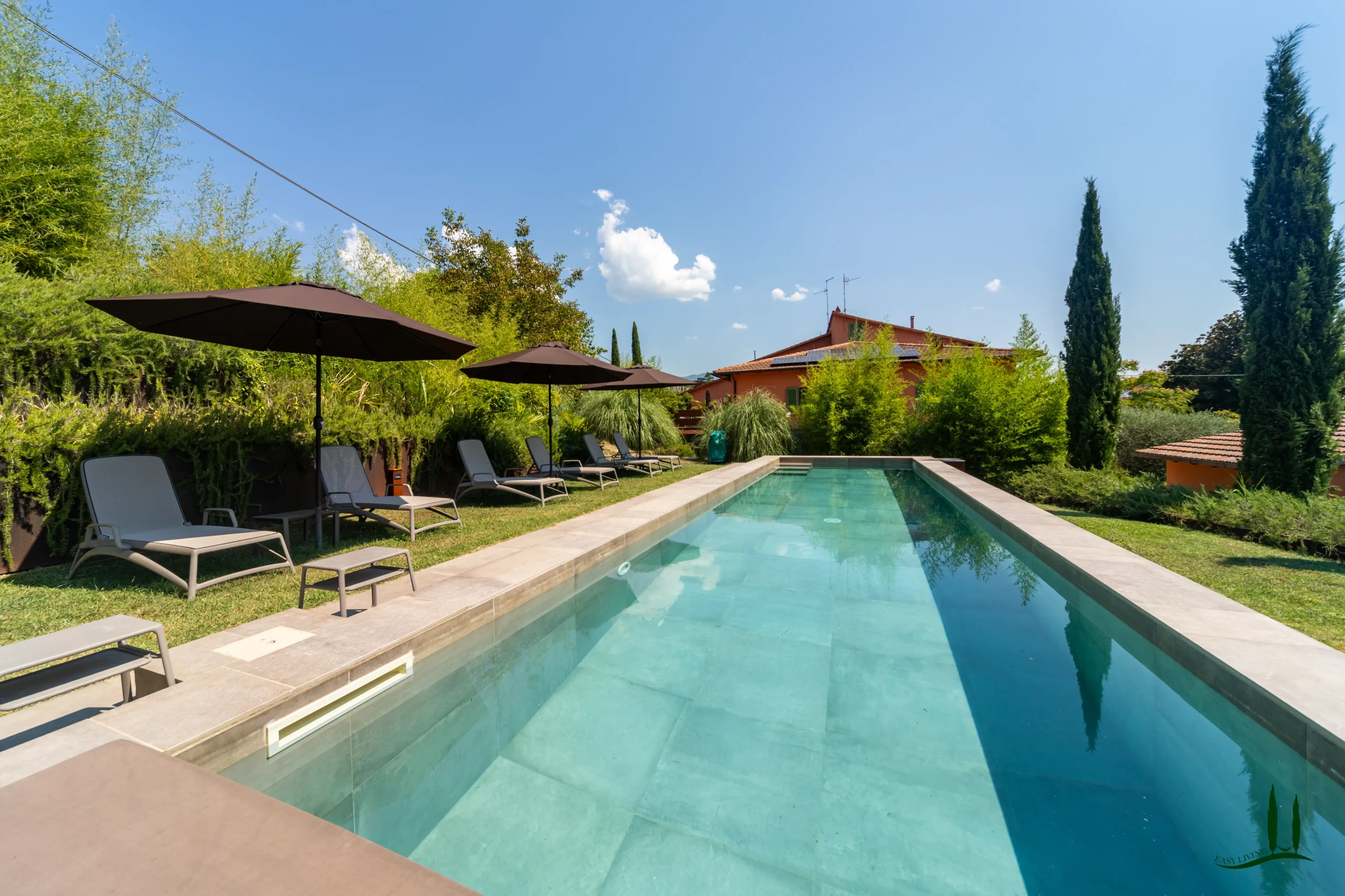 - Piscina di design in pietra: Realizzata interamente in moderna pietra grigia, la piscina minimalista invita a rilassarsi sotto il sole della Toscana, un luogo ideale dopo una sessione di palestra o un trattamento termale.