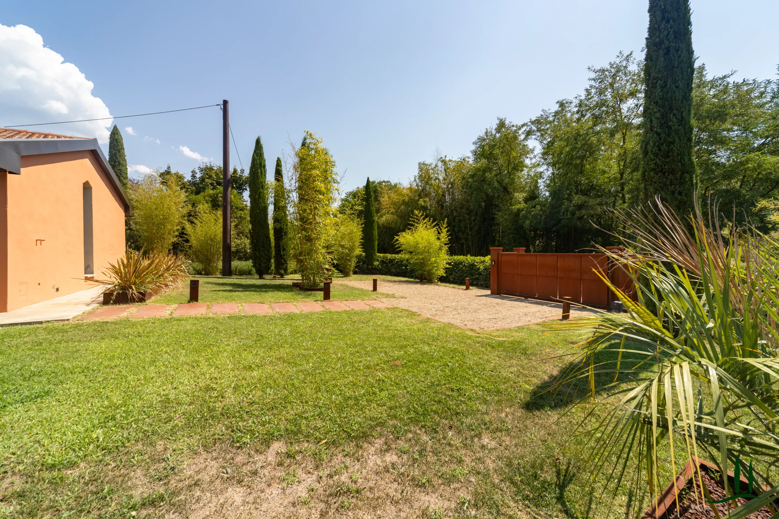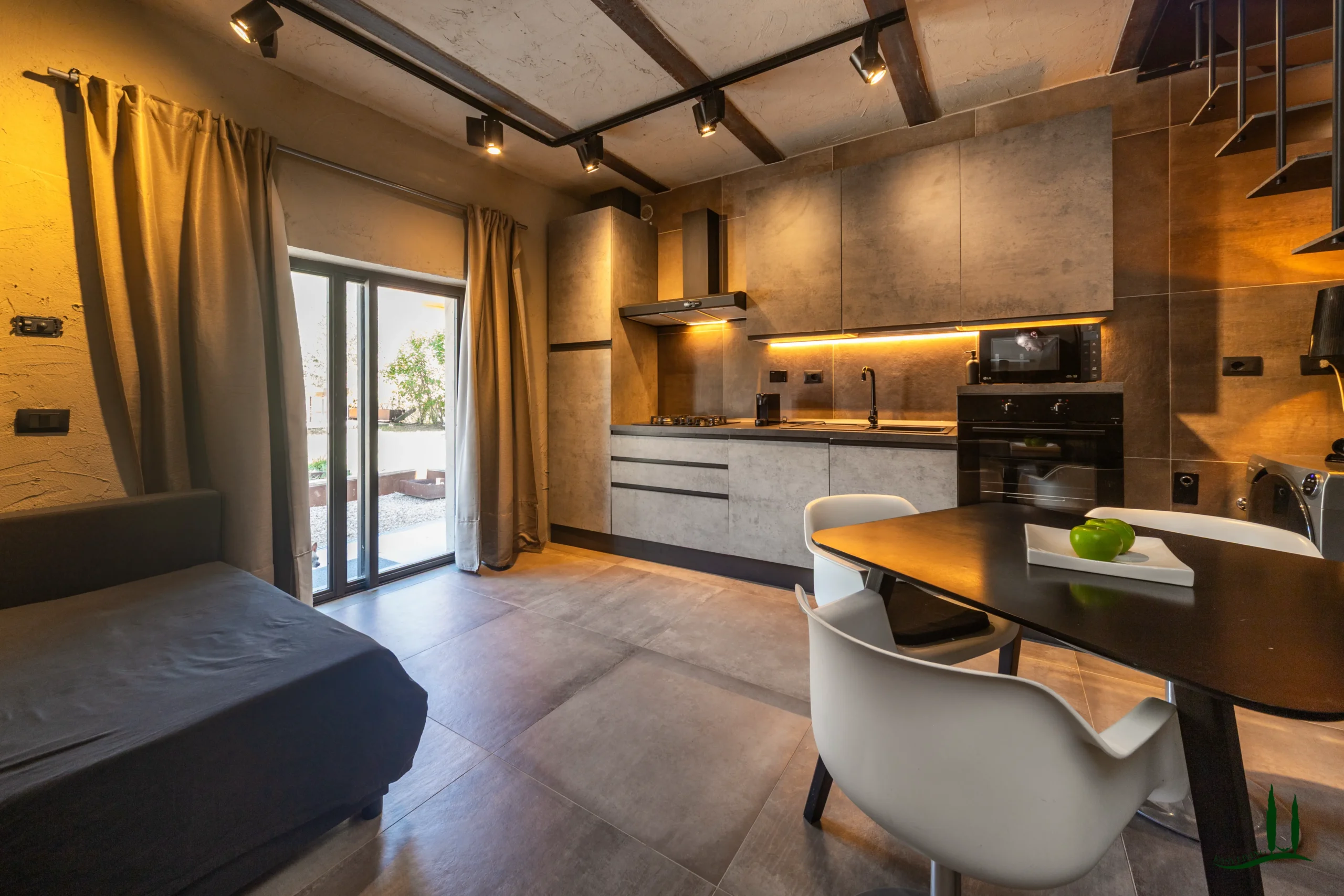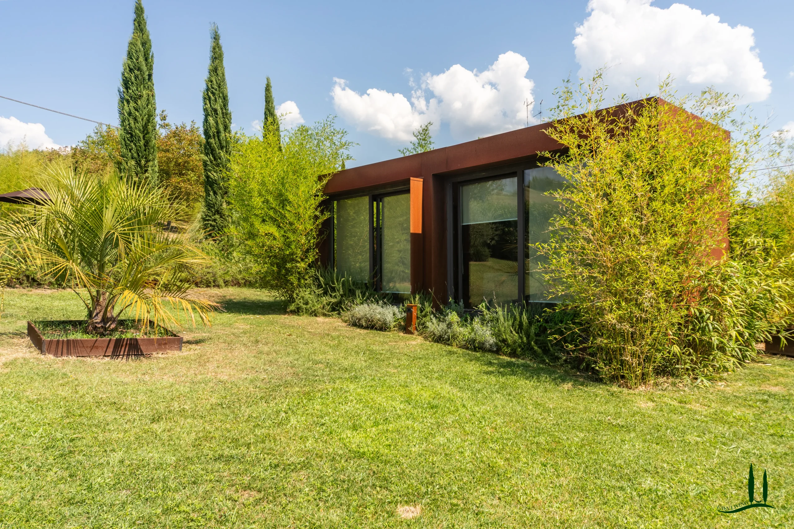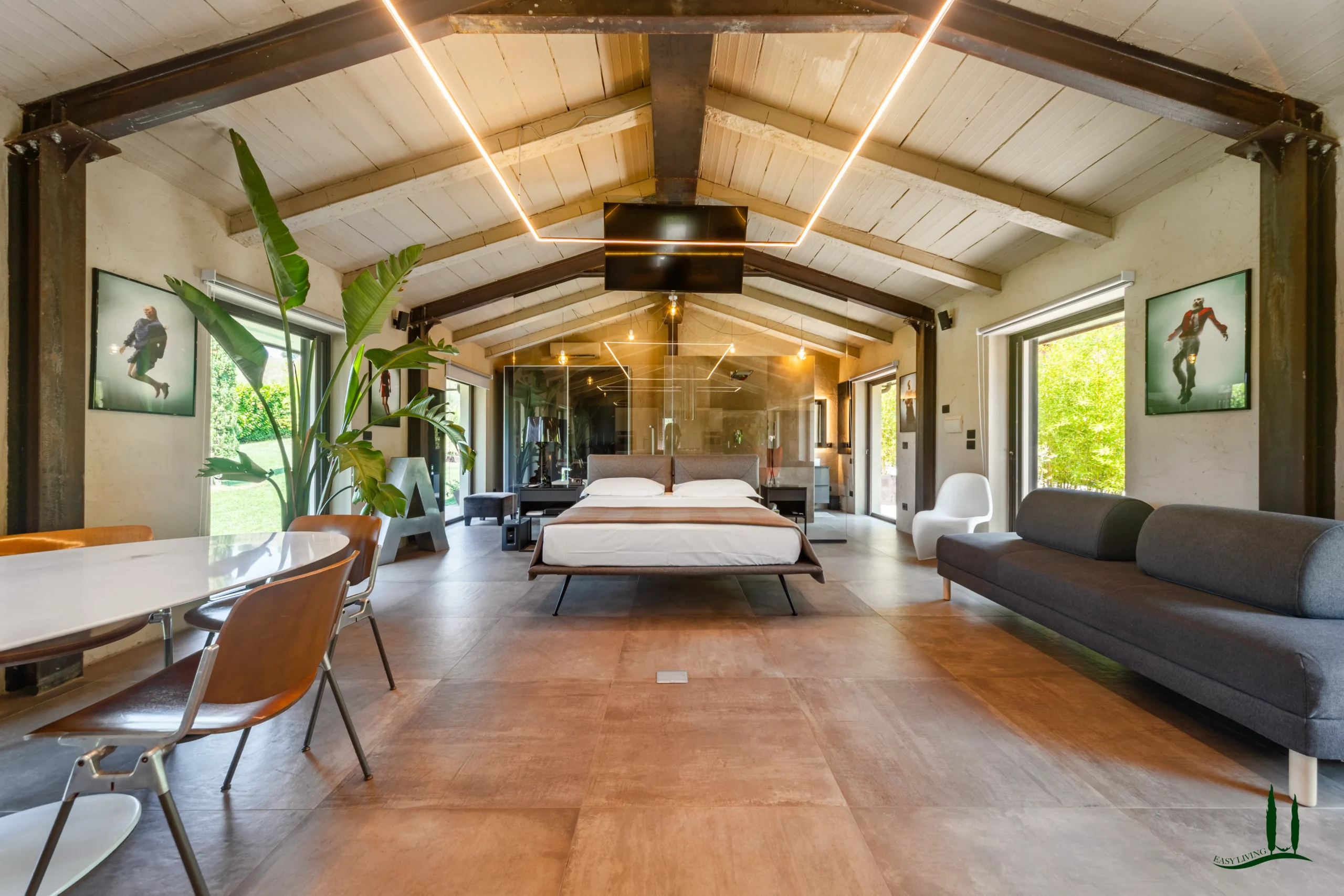 - Pensione moderna: Entrando nella tenuta, si viene accolti da un'elegante guesthouse open-space con cancello privato, cucina, zona pranzo e soggiorno e bagno. Le finestre a tutta altezza e le finiture raffinate creano un'atmosfera elegante e confortevole. All'esterno, un giardino privato con un patio ombreggiato è la cornice perfetta per cene all'aperto e barbecue.